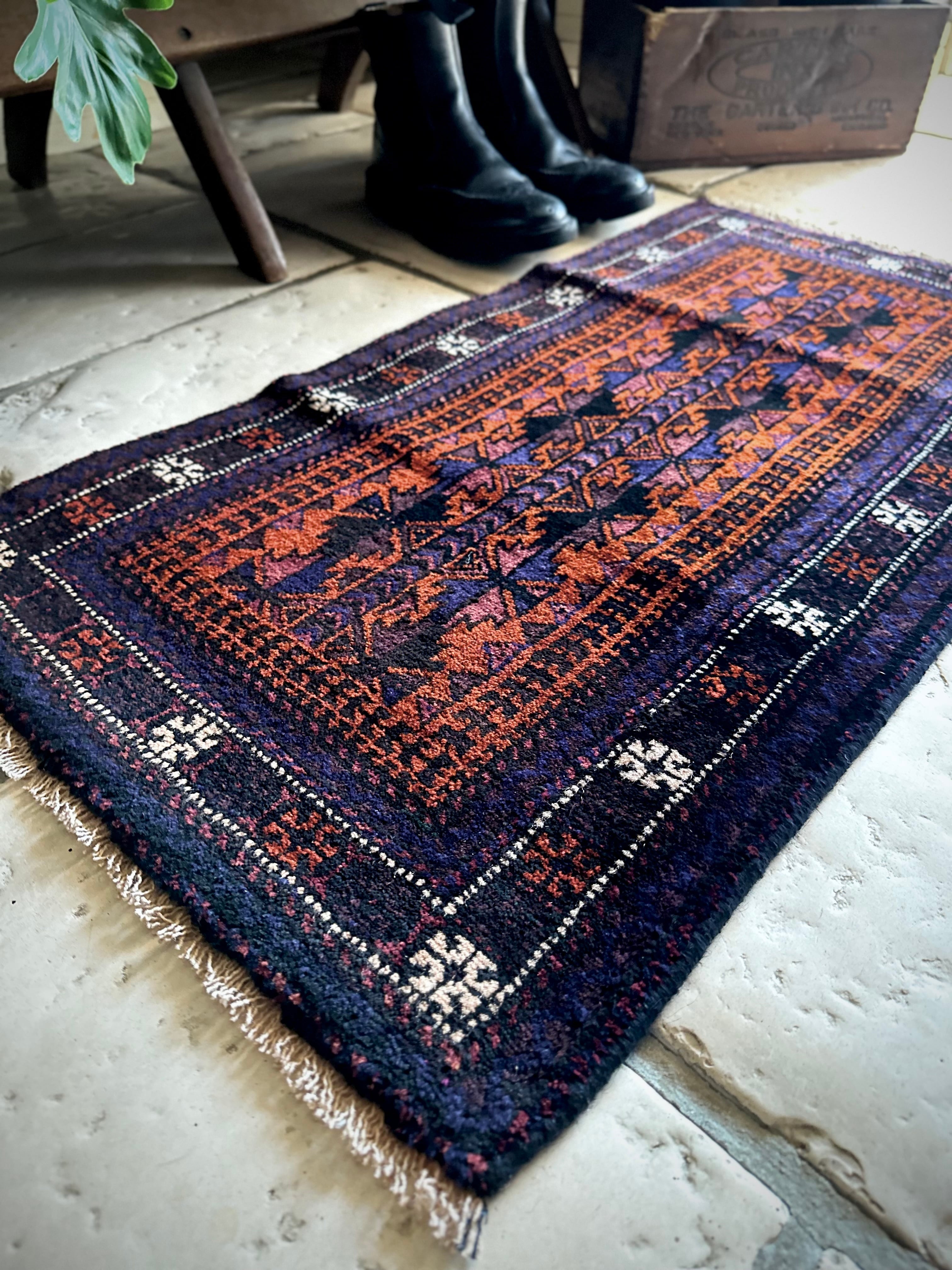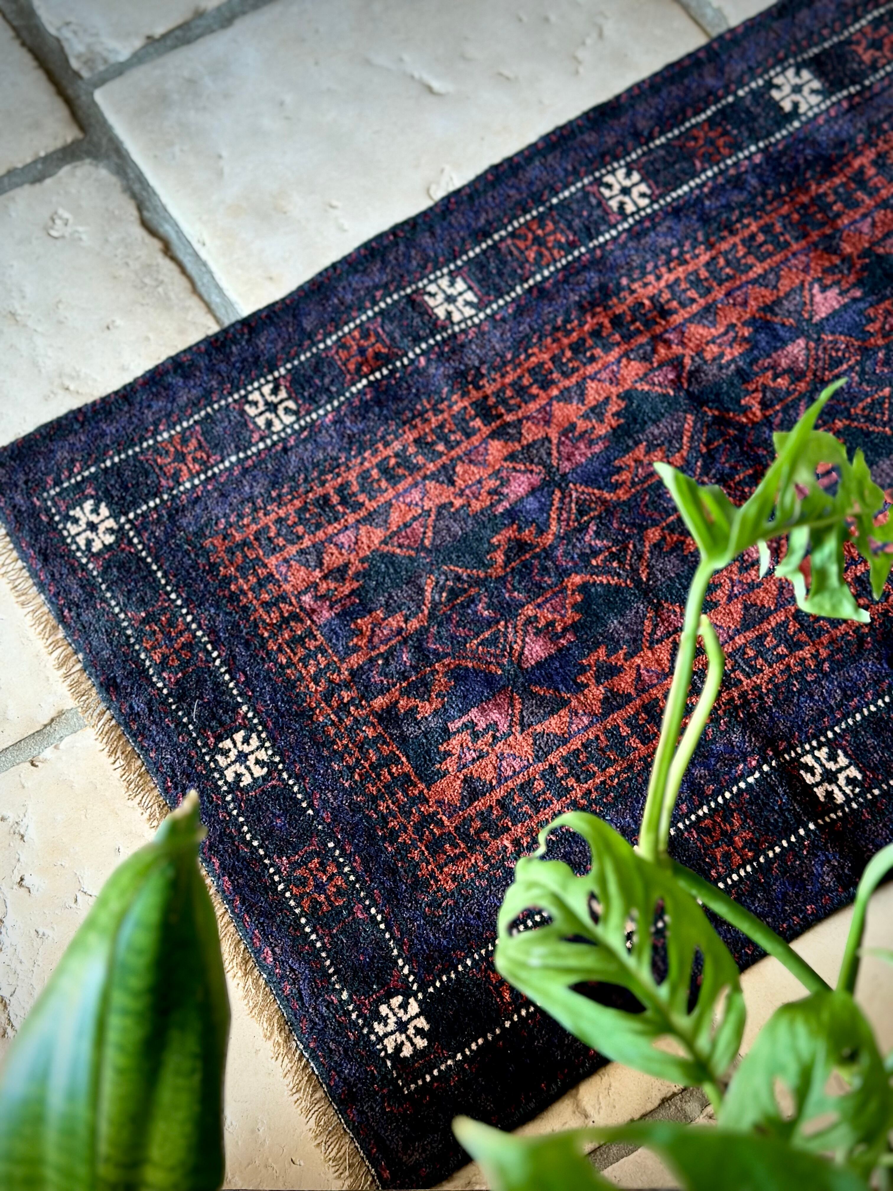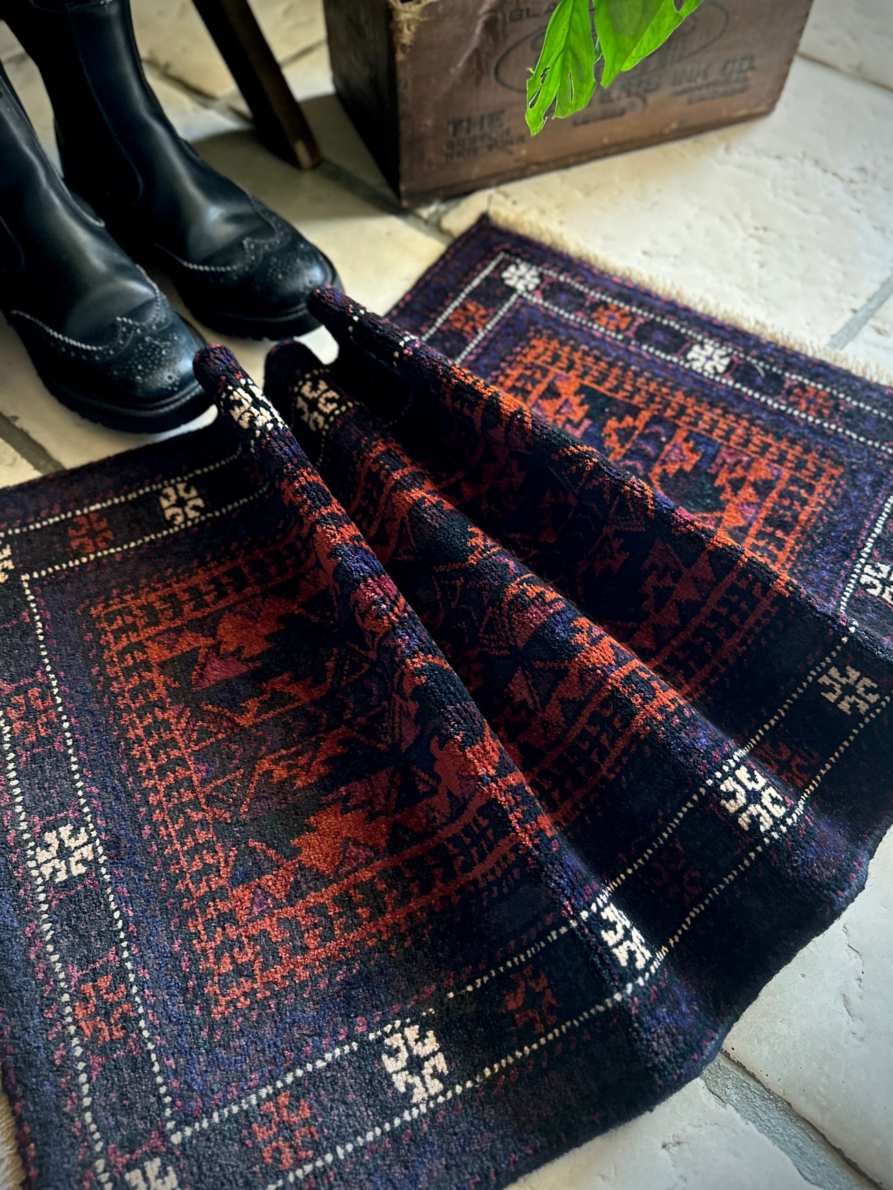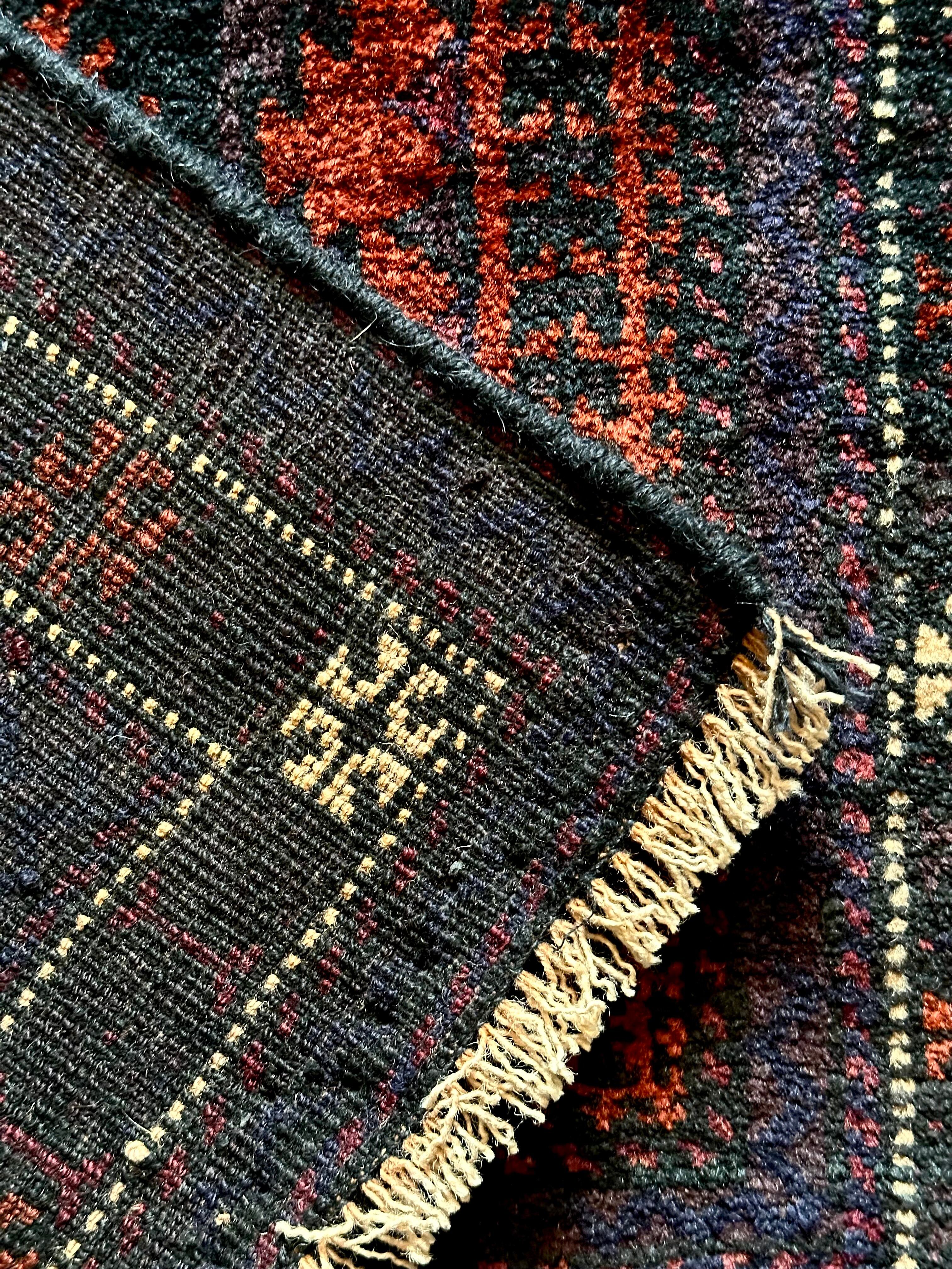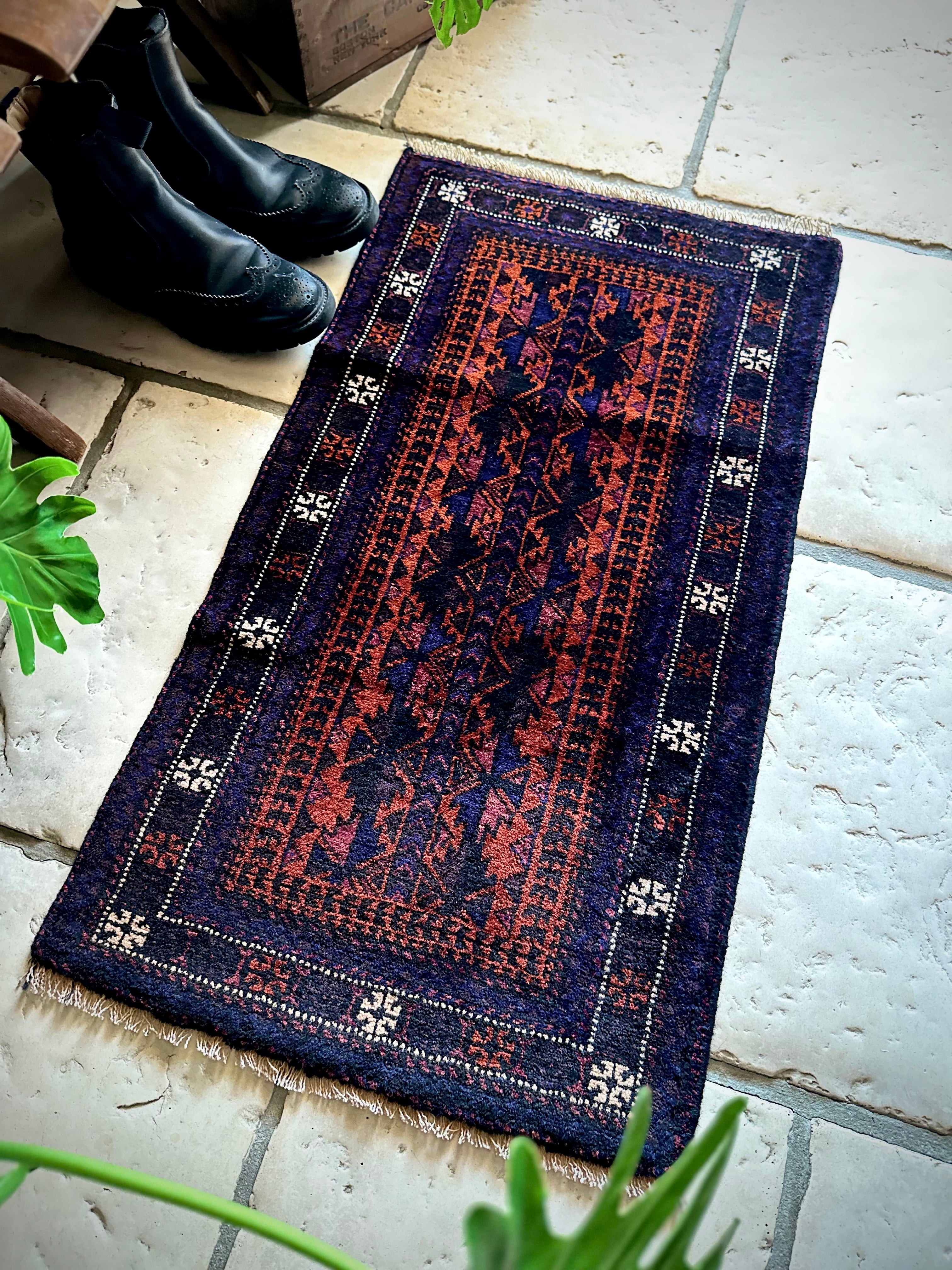 ダークな印象のテラコッタとブラックにキラリと光るネイビーブルーの特殊な色合いが目を引くこちらは、イラン南東部はシスターン地方のザボールに居住するシスターン・バルーチのトライバルラグで、バルーチ族の中でも一目置かれる産地のラグになります。