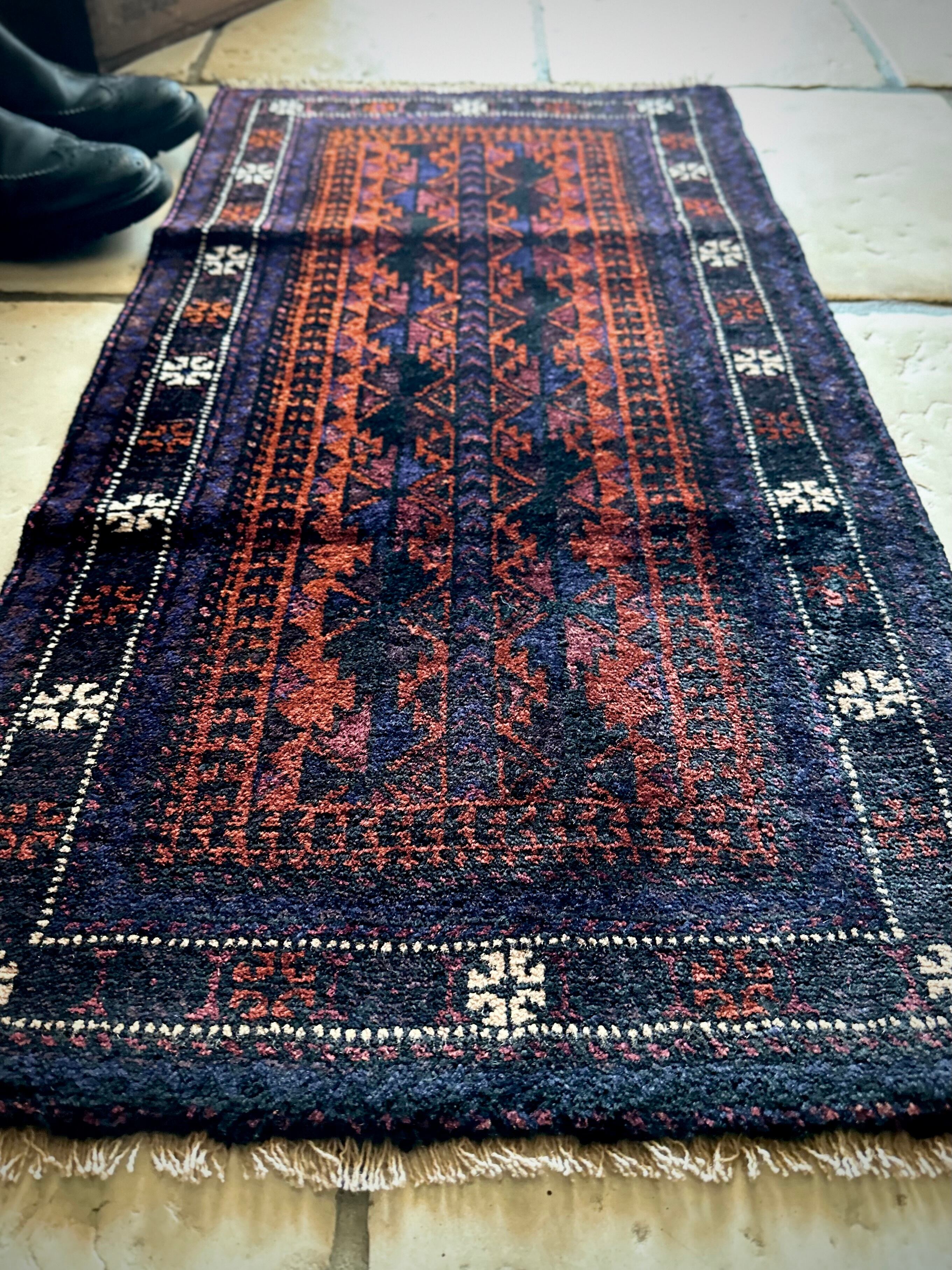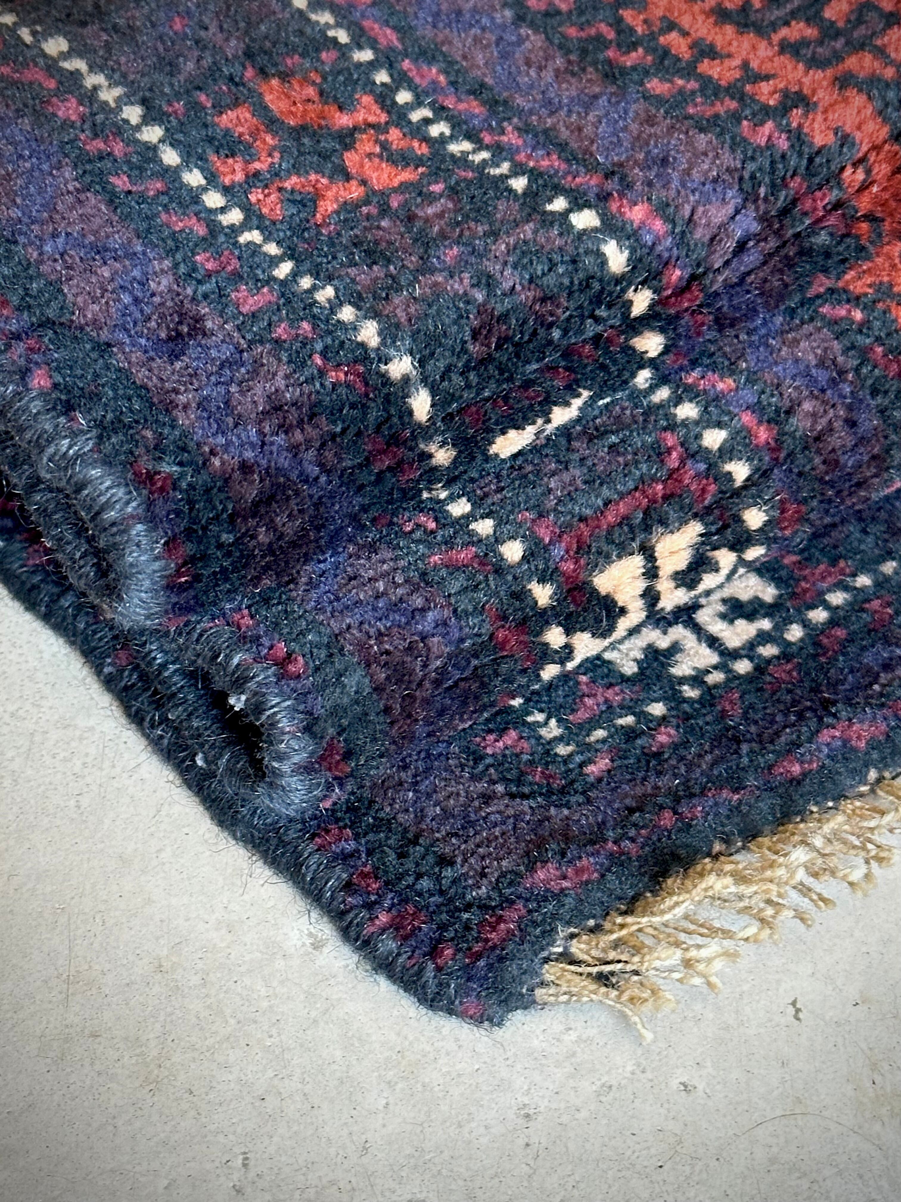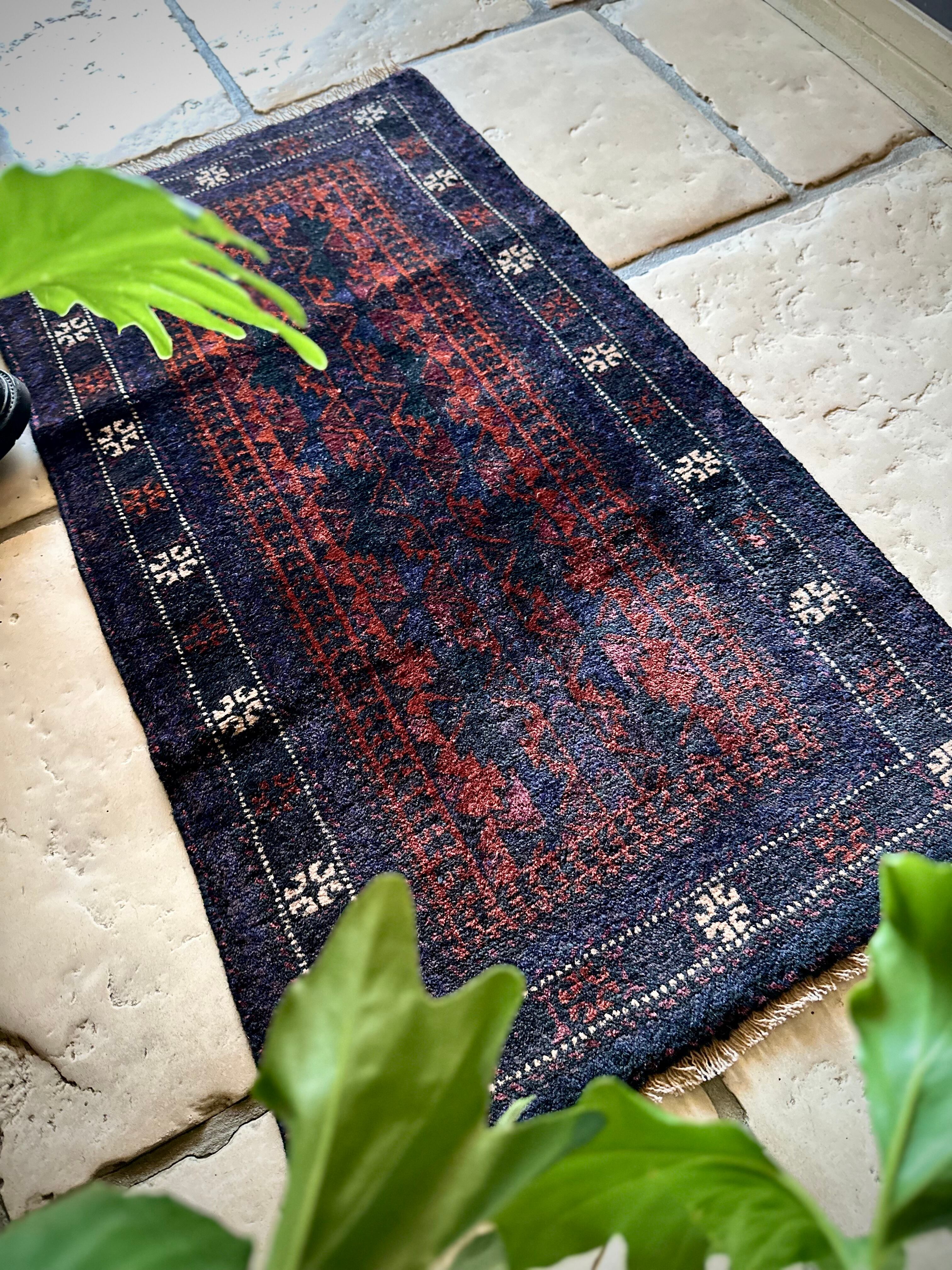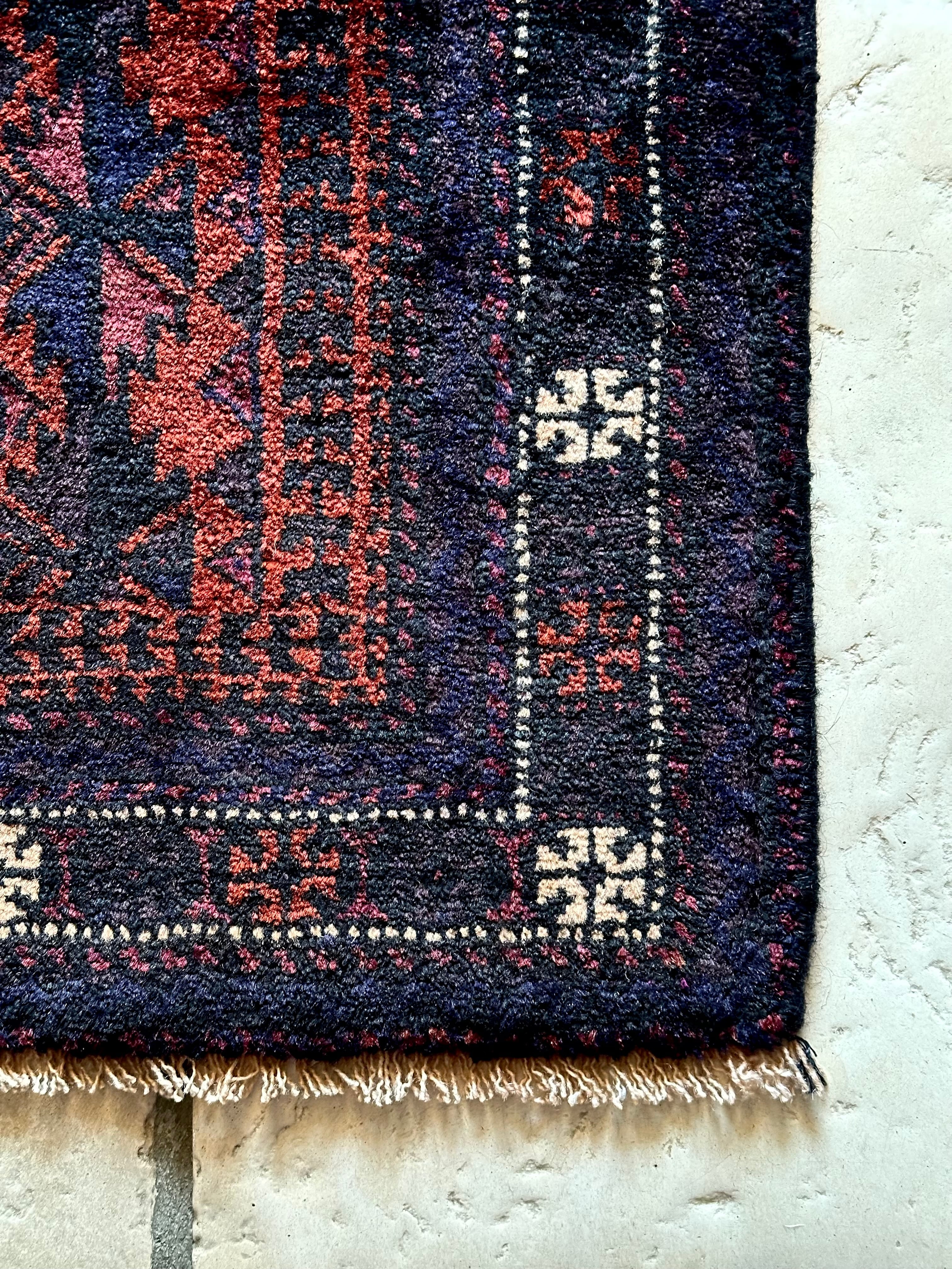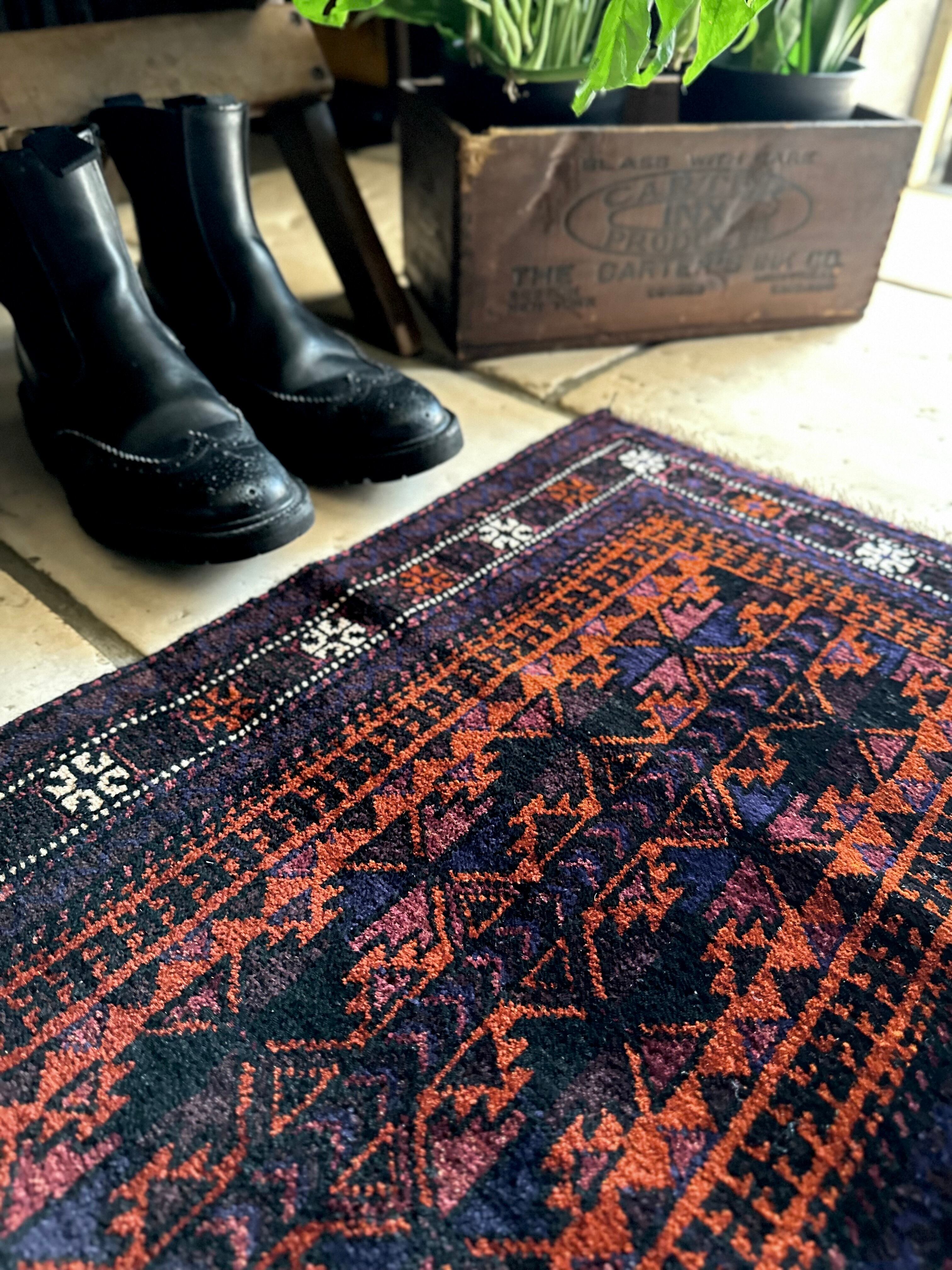 ダークな印象のテラコッタとブラックにキラリと光るネイビーブルーの特殊な色合いが目を引くこちらは、イラン南東部はシスターン地方のザボールに居住するシスターン・バルーチのトライバルラグで、バルーチ族の中でも一目置かれる産地のラグになります。