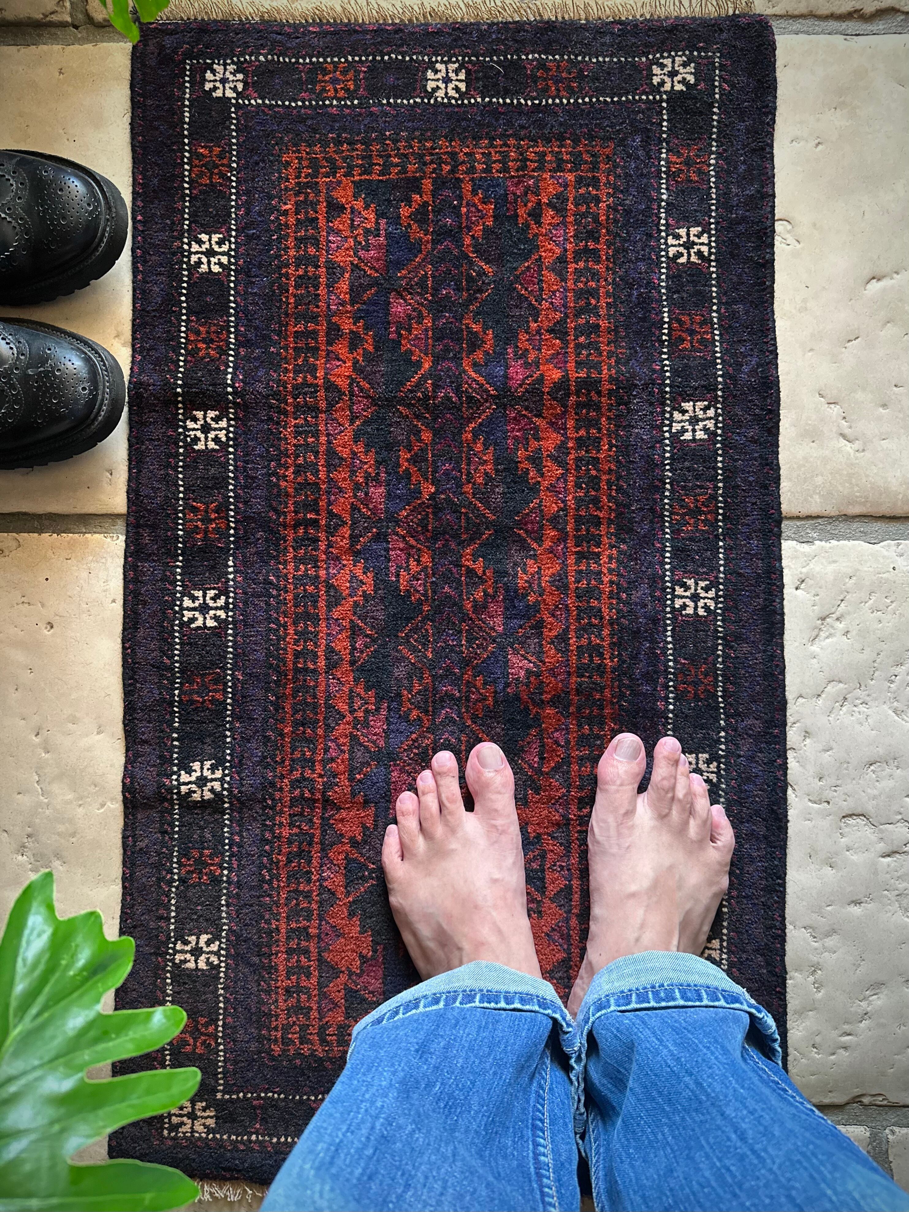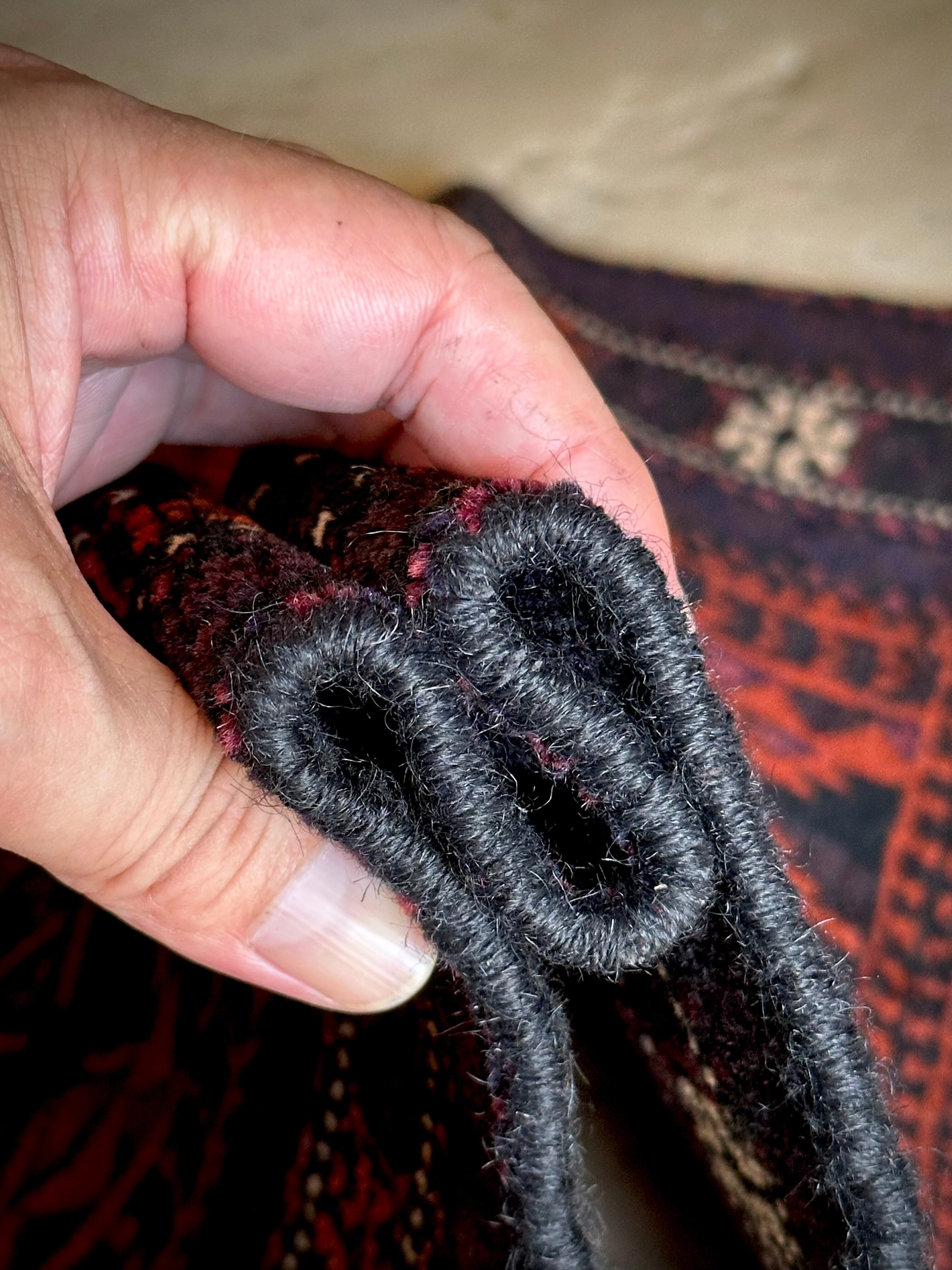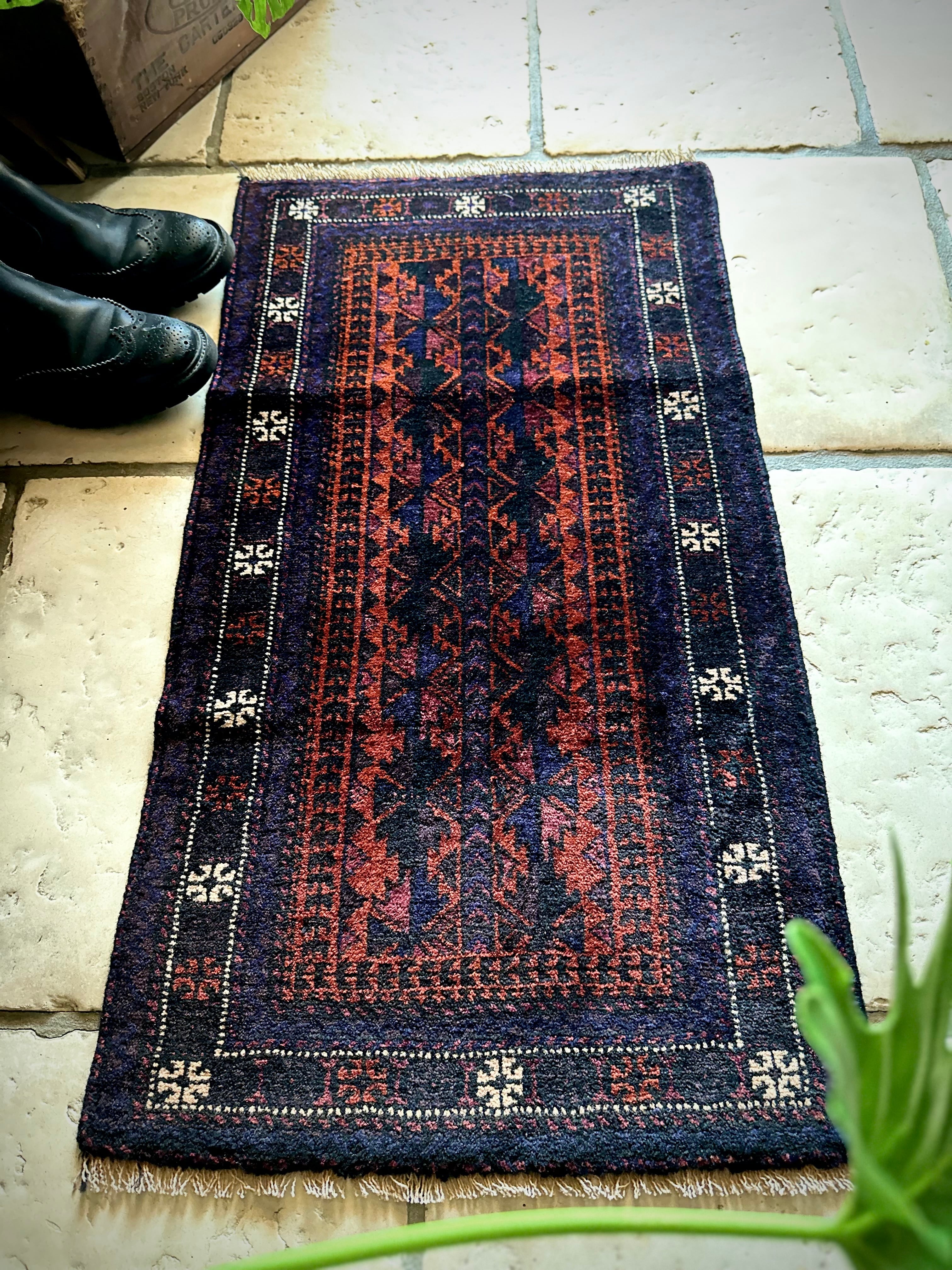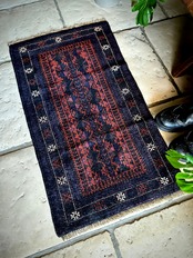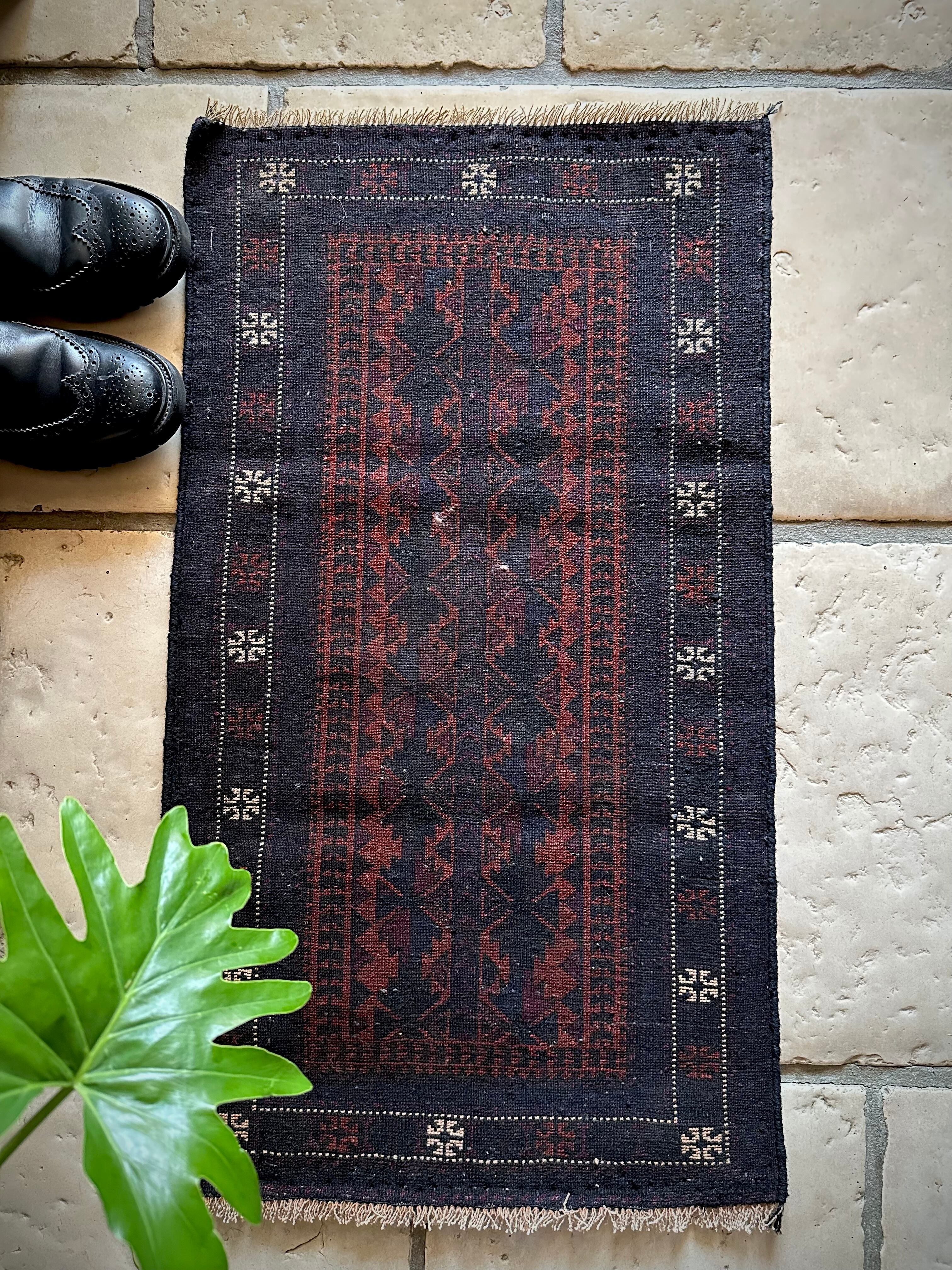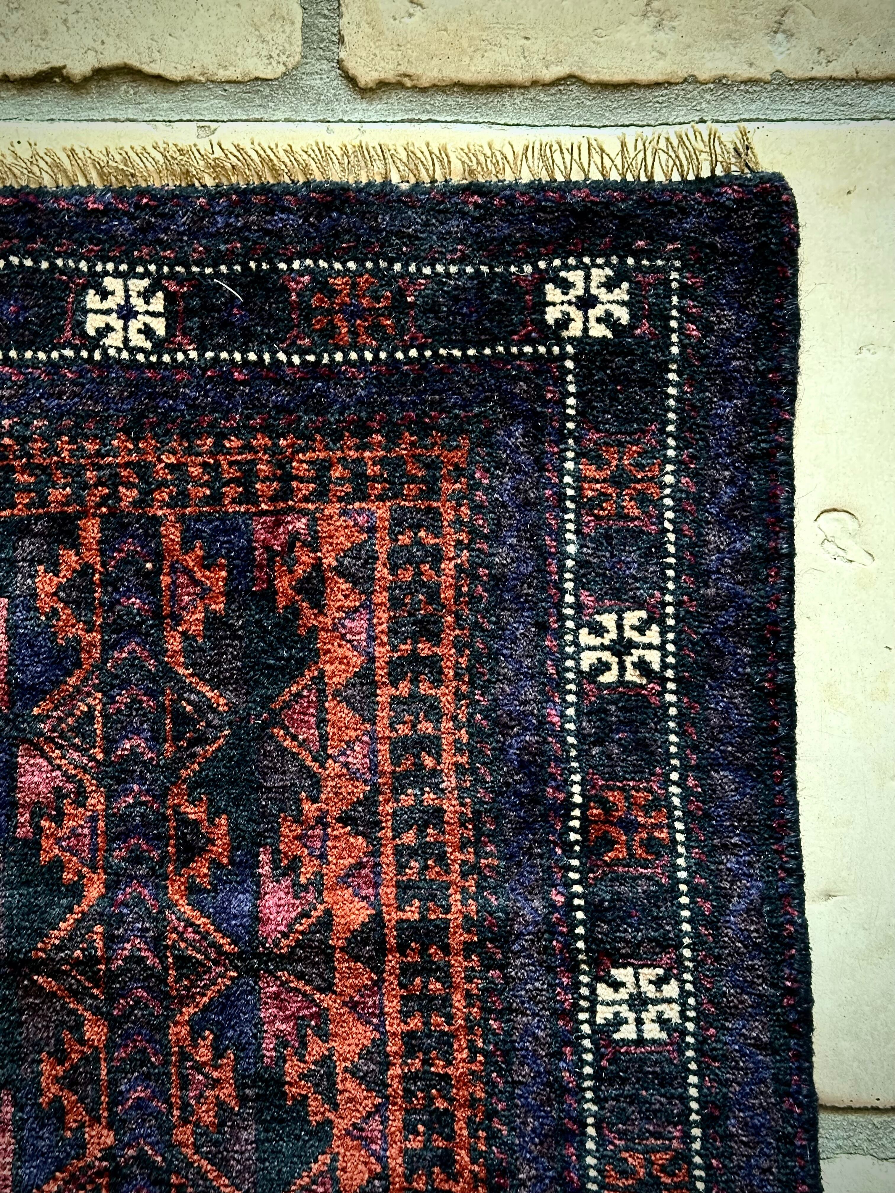 ダークな印象のテラコッタとブラックにキラリと光るネイビーブルーの特殊な色合いが目を引くこちらは、イラン南東部はシスターン地方のザボールに居住するシスターン・バルーチのトライバルラグで、バルーチ族の中でも一目置かれる産地のラグになります。
