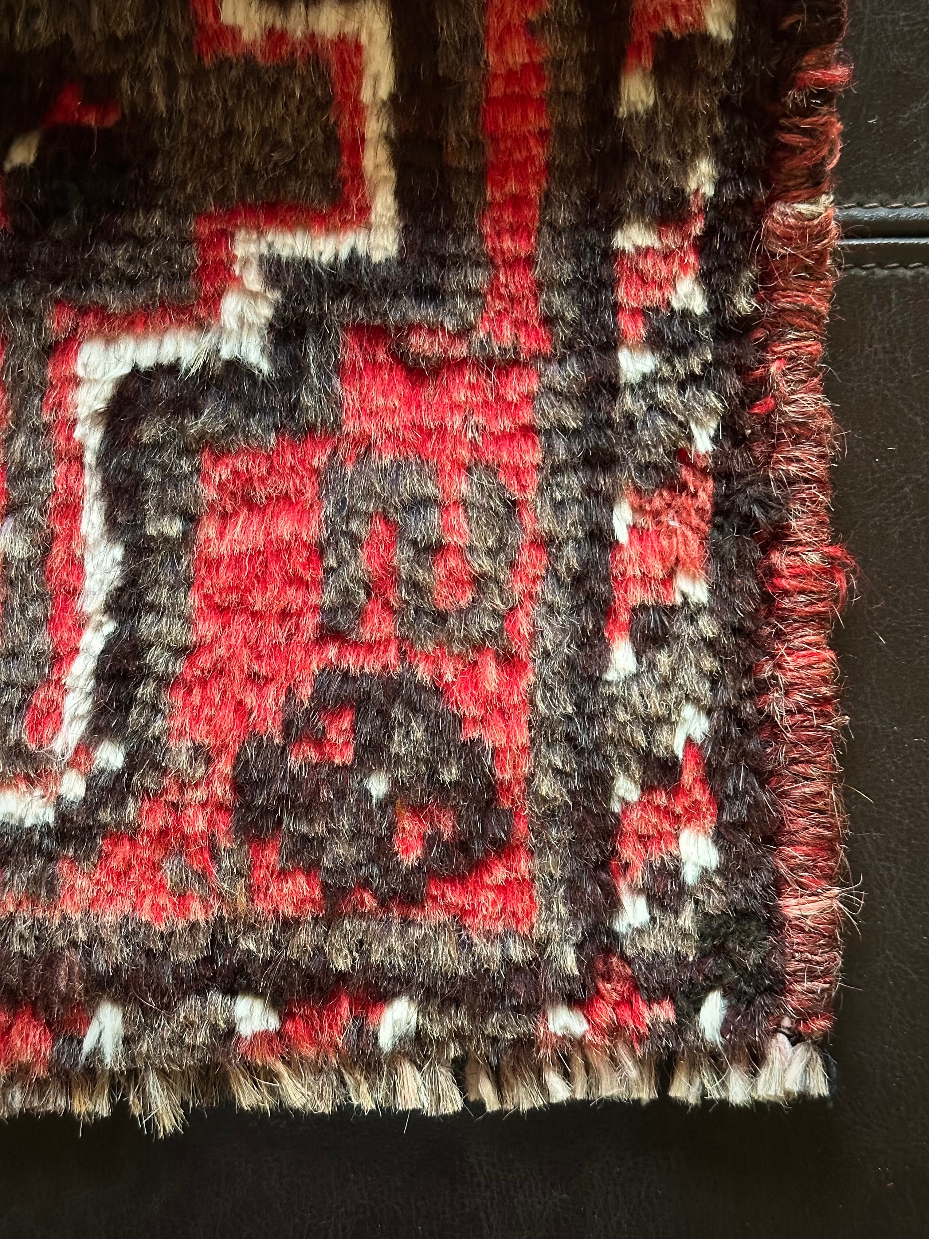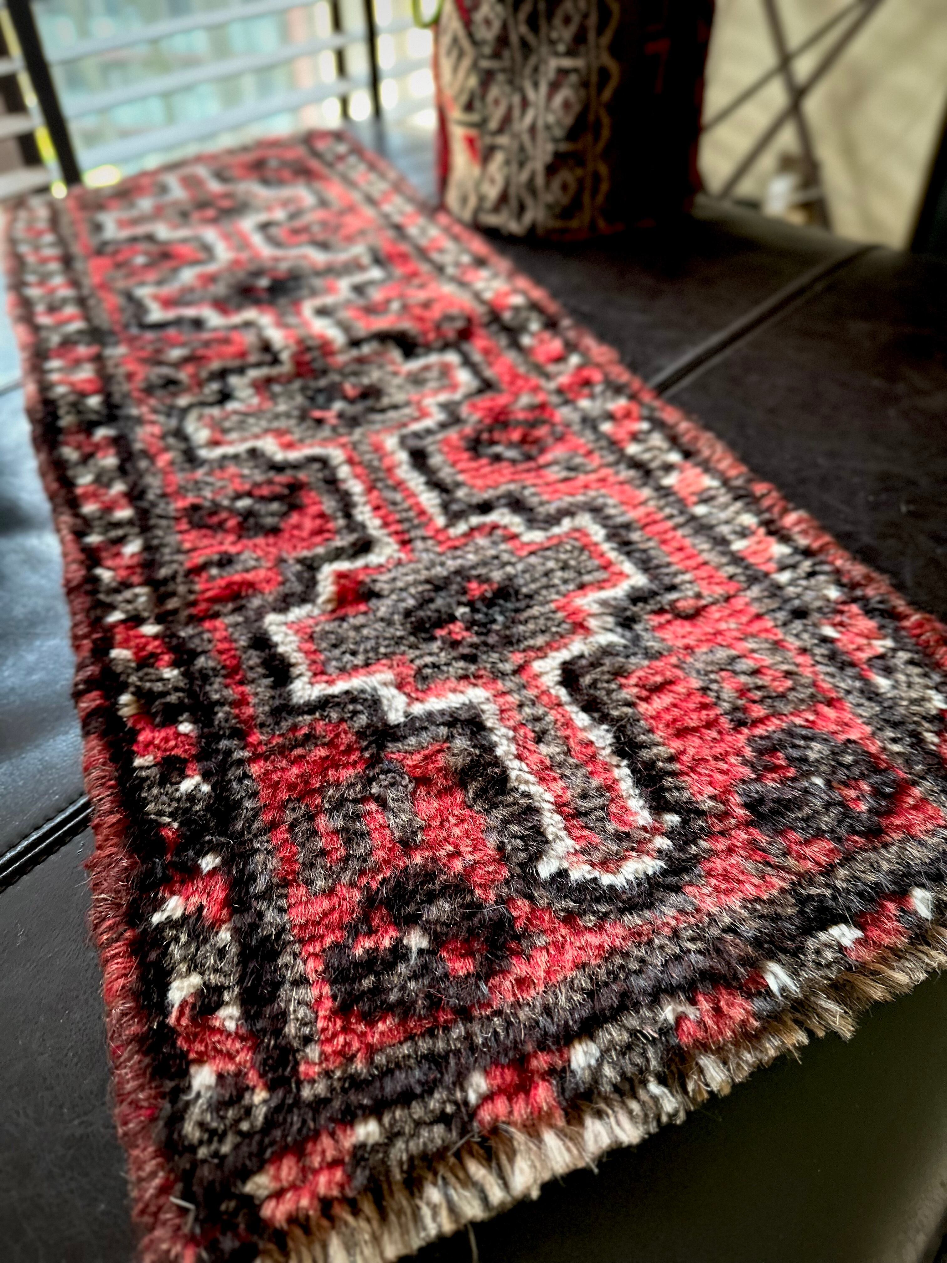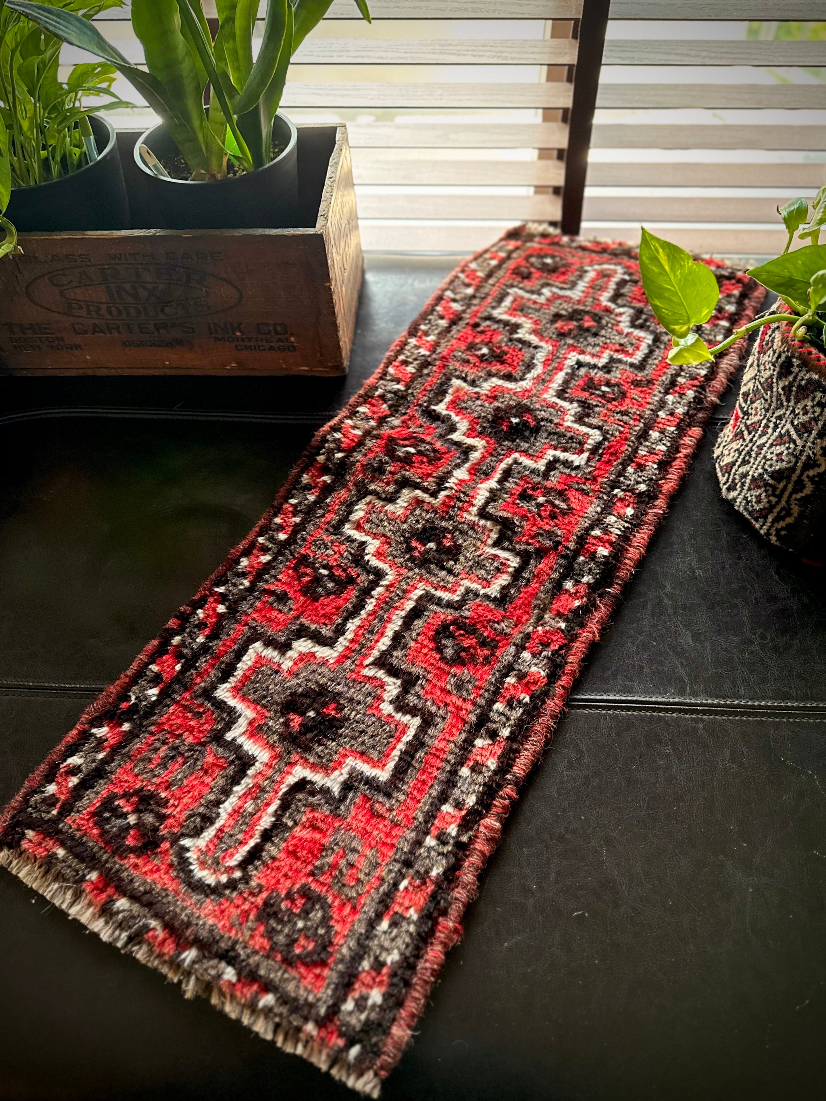 やや大振りなミニランナーとも呼べるサイズ感が珍しく、小さいだけにいろんな使い方が楽しめる1枚で、鉢置きや小物置きとしてもアクセントが効いていて、カシュガイならではの毛足の長いフサフサとしたパイルが心地よく、ちょっとしたプレゼントにも最適でしょうか。