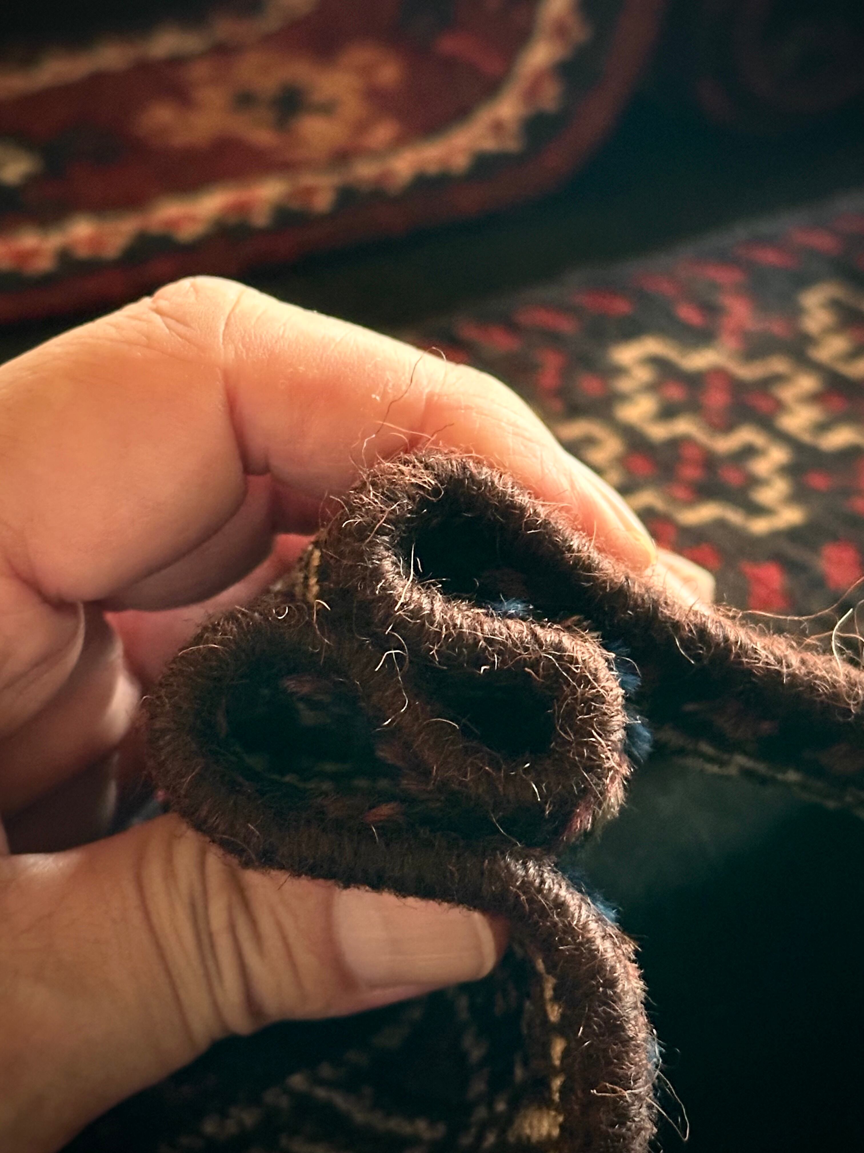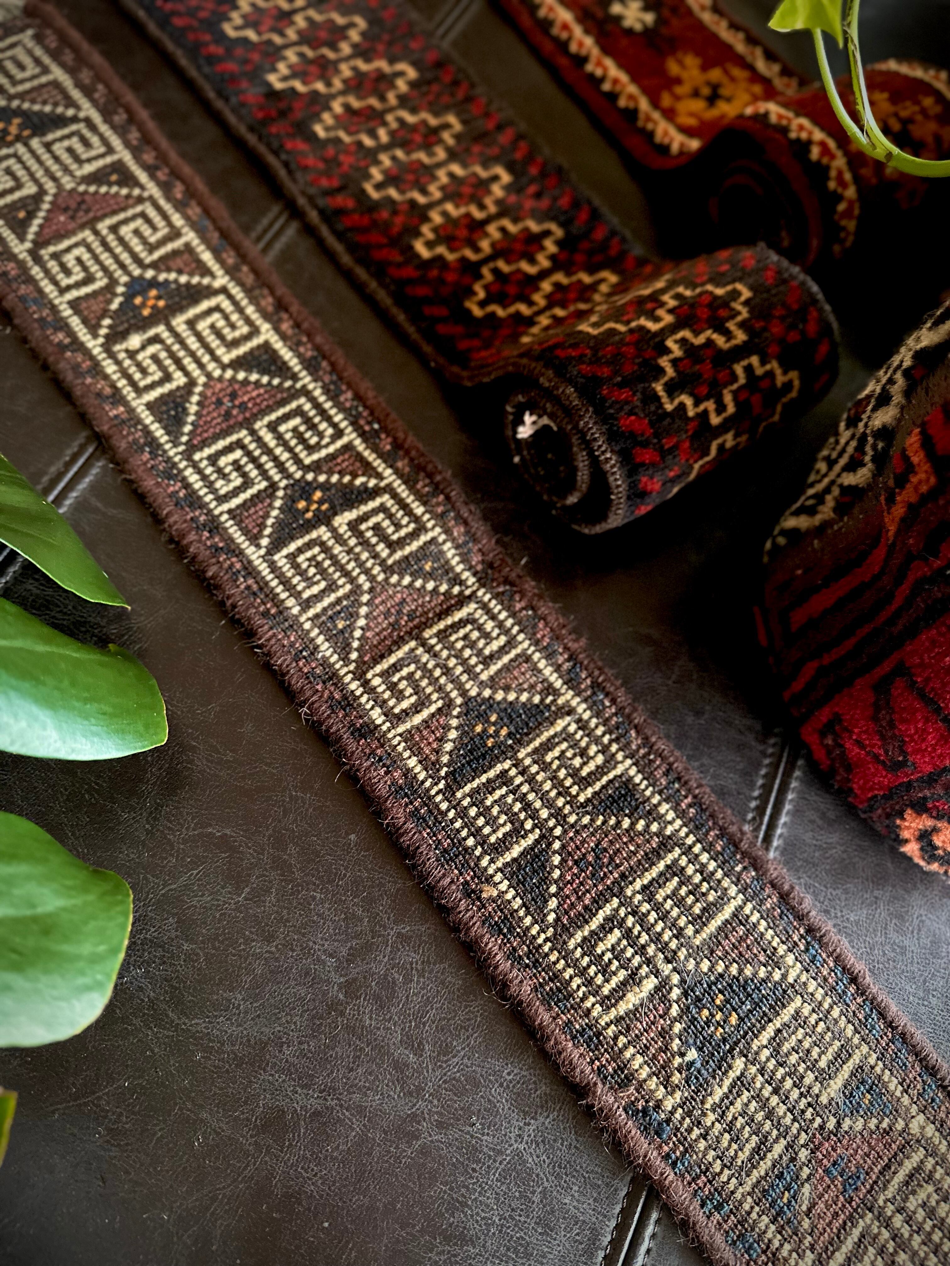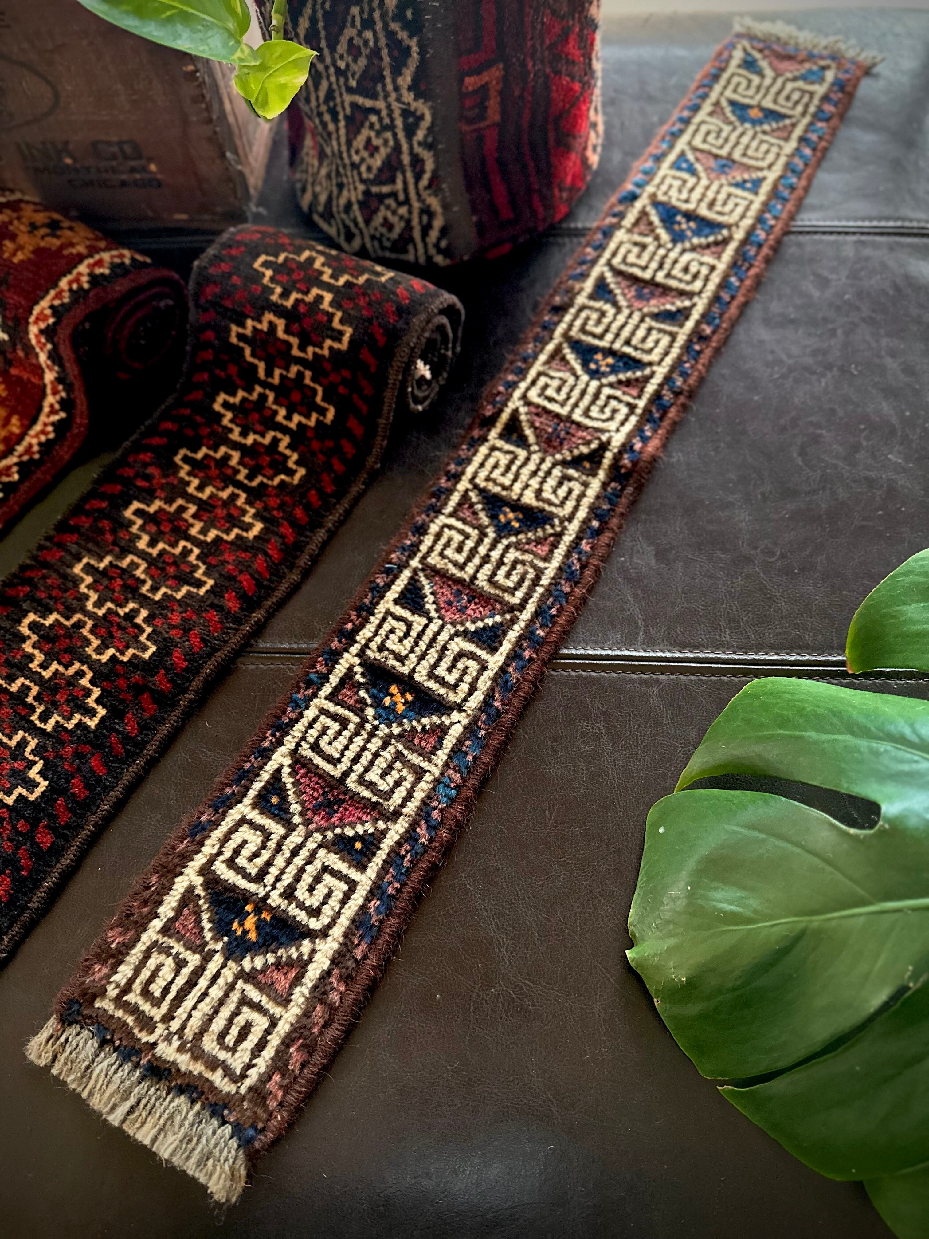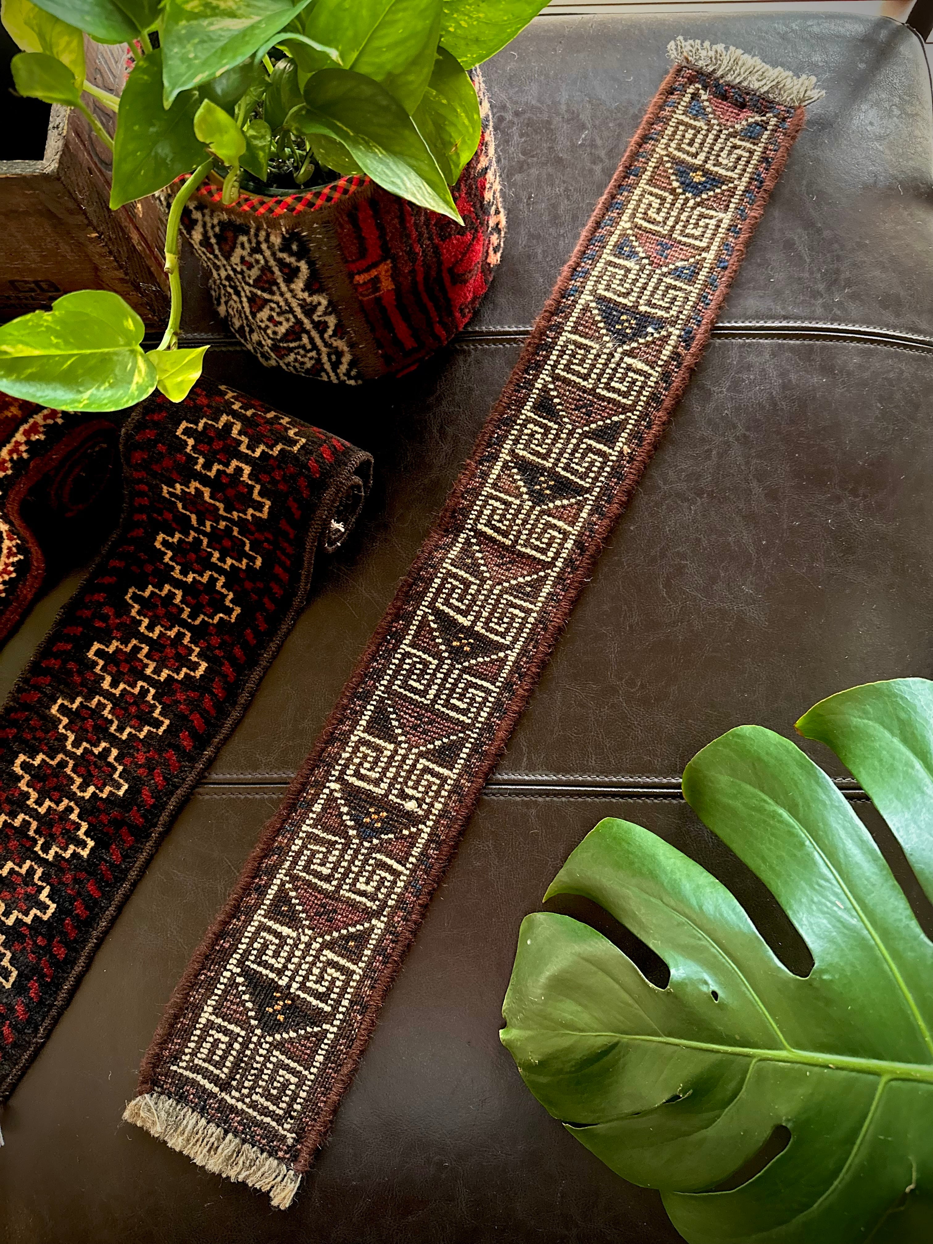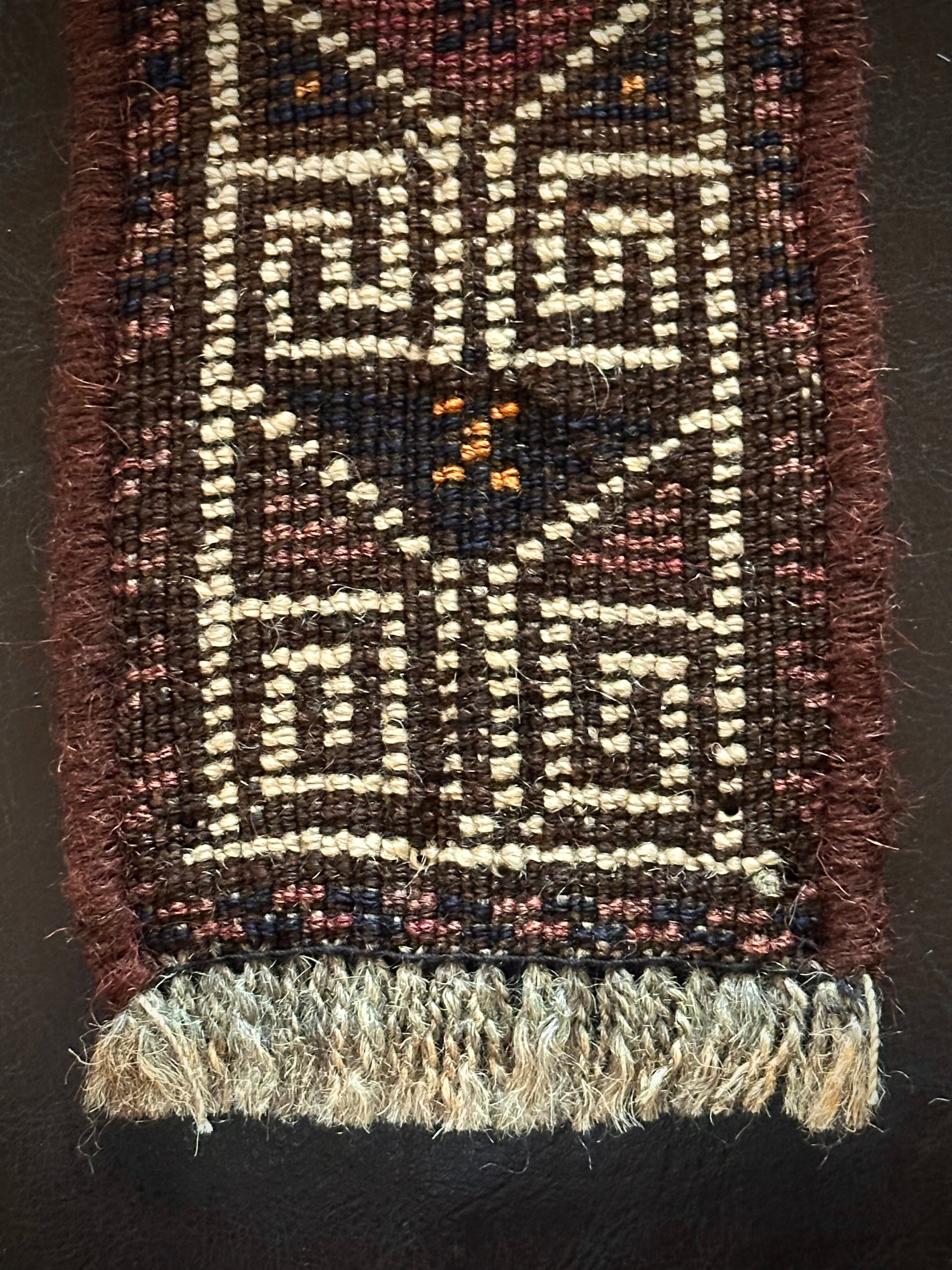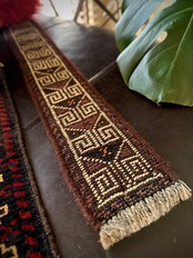 こちらの商品はアフガニスタンのヘラート州に居住するバルーチ族によって、ひとつひとつ手織りされたアニマル・トラッピングスと呼ばれる動物用の首飾りで、元はタッセルやビーズなどが付いていたのを取り除いてミニラグに仕立て直したモノになります。