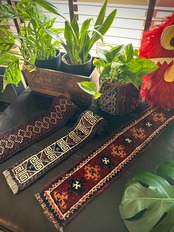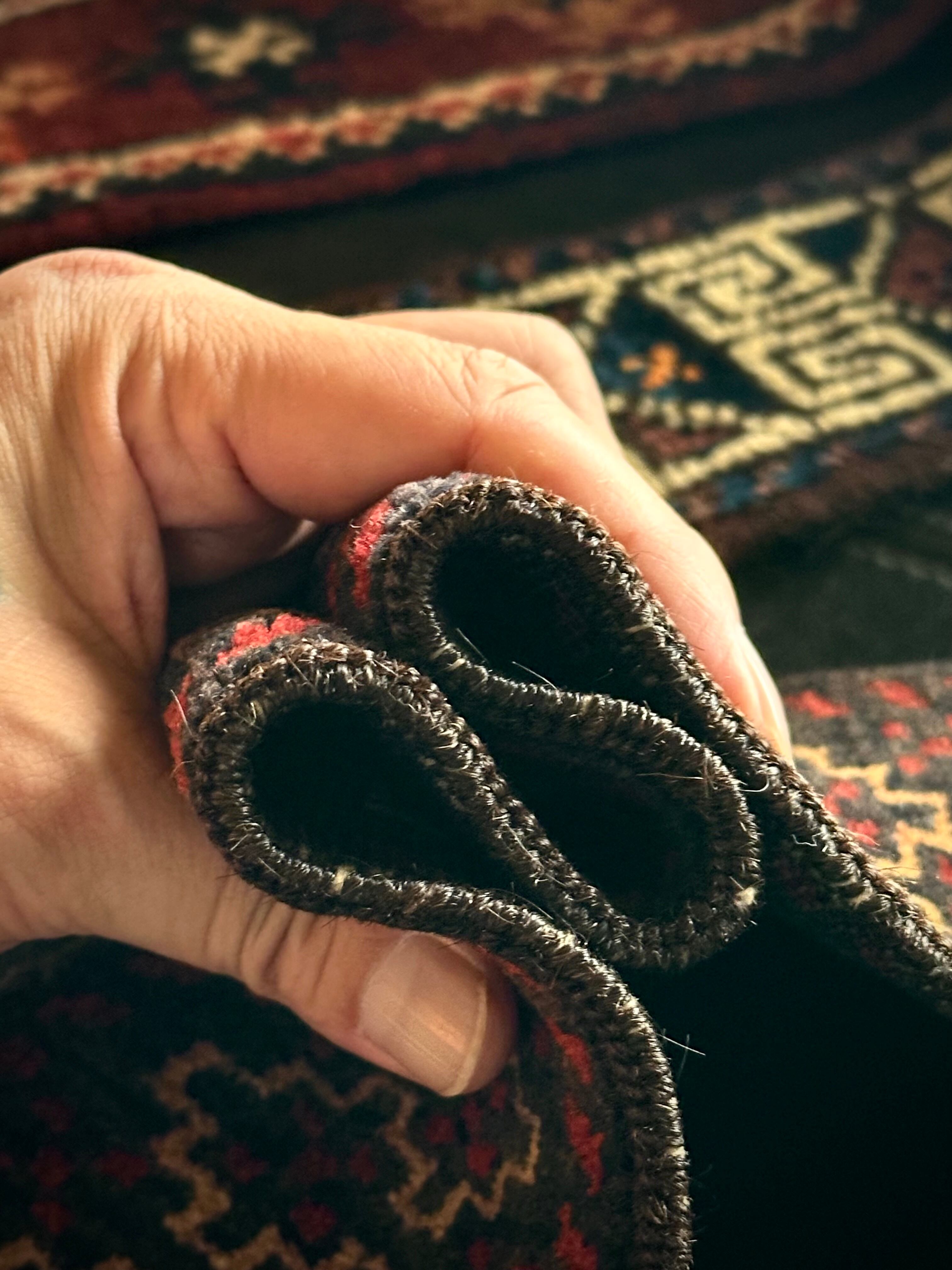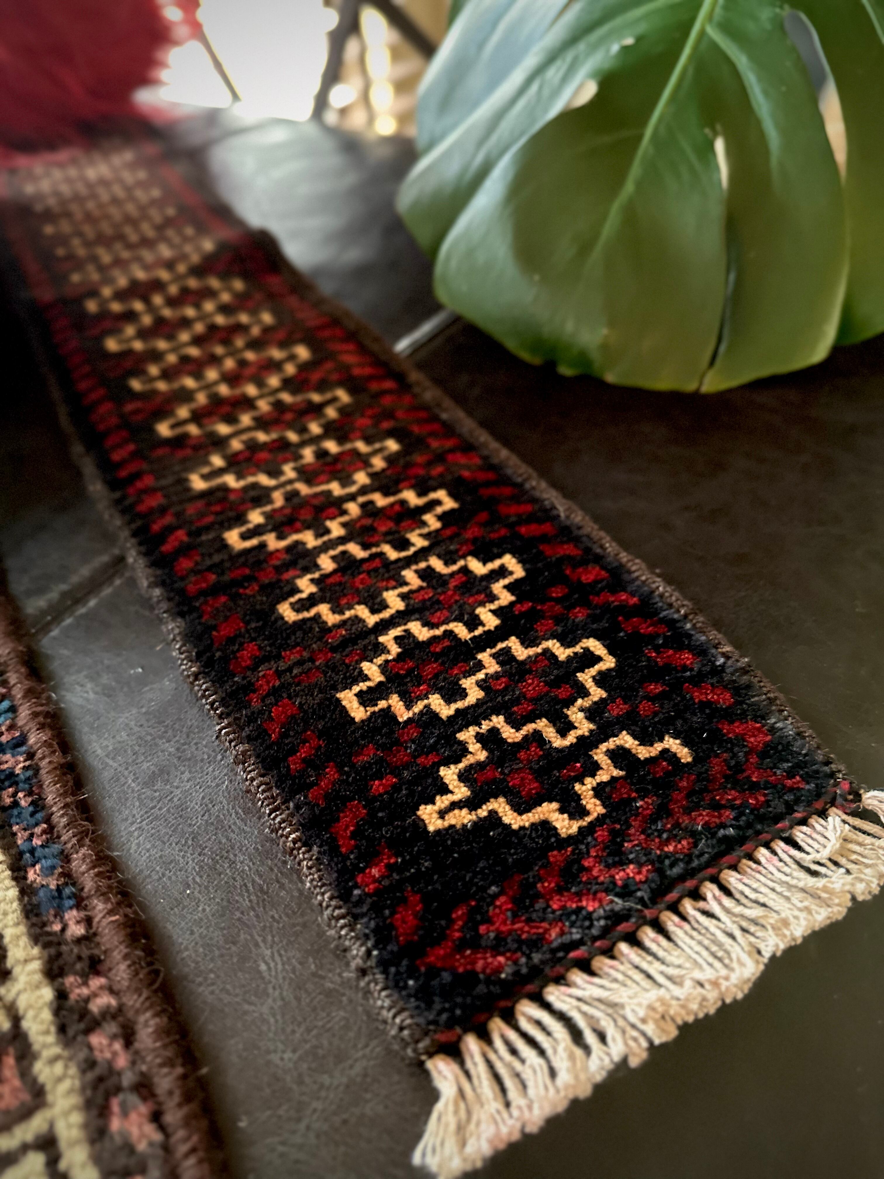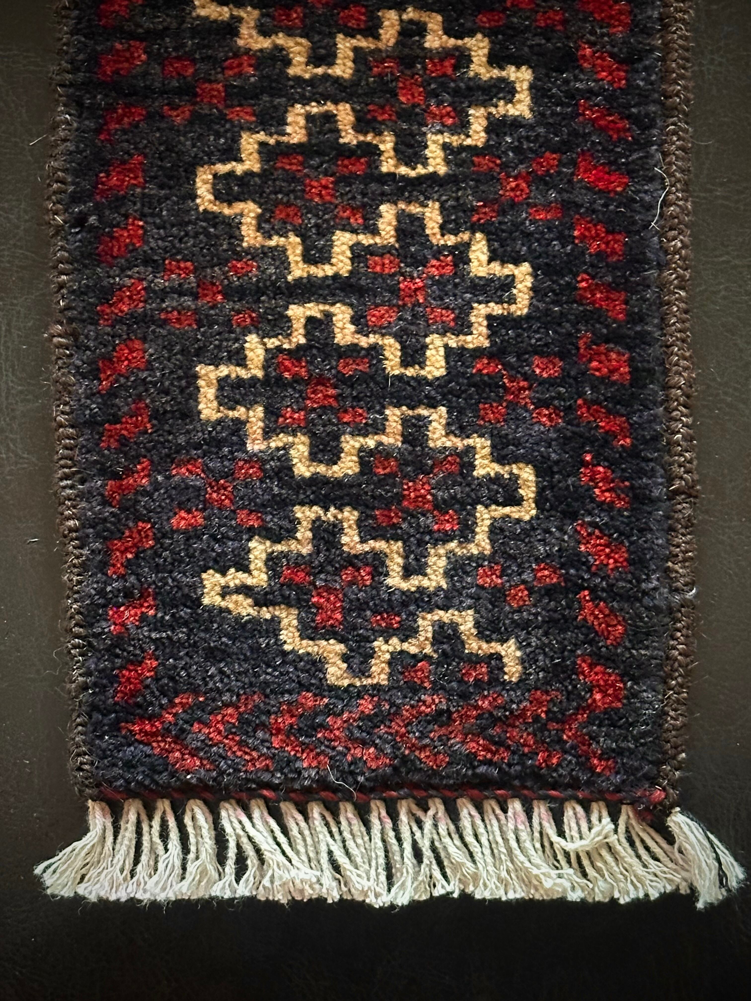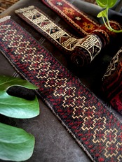 こちらの商品はアフガニスタンのヘラート州に居住するバルーチ族によって、ひとつひとつ手織りされたアニマル・トラッピングスと呼ばれる動物用の首飾りで、元はタッセルやビーズなどが付いていたのを取り除いてミニラグに仕立て直したモノになります。