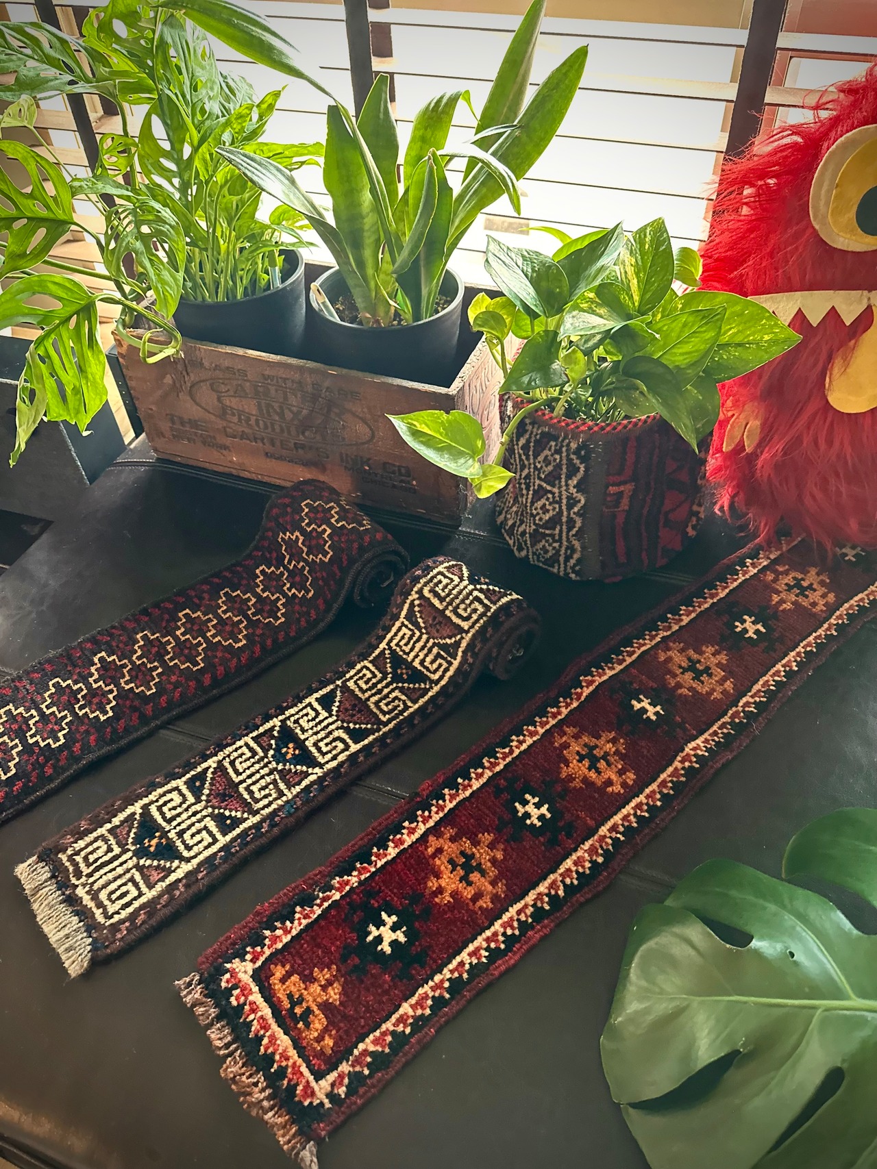 経年としては50年のヴィンテージラグになりますが、それほどの使用感はなく目立つ汚れにダメージのないグッドなコンディションで、小さいながらもトライバルらしい柄にブラック&レッドの色合いがかっこいいですね。