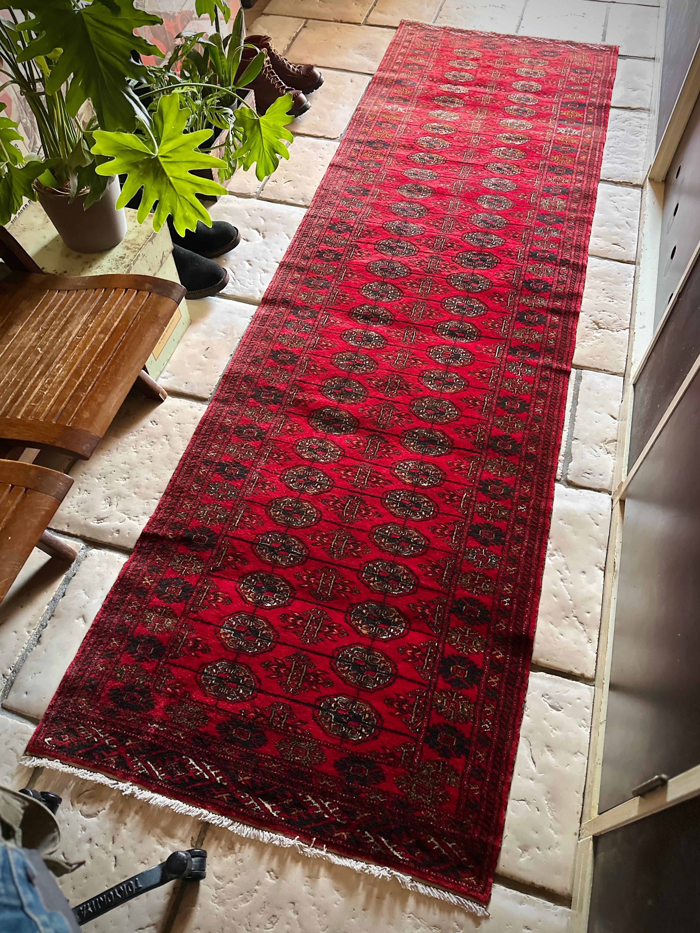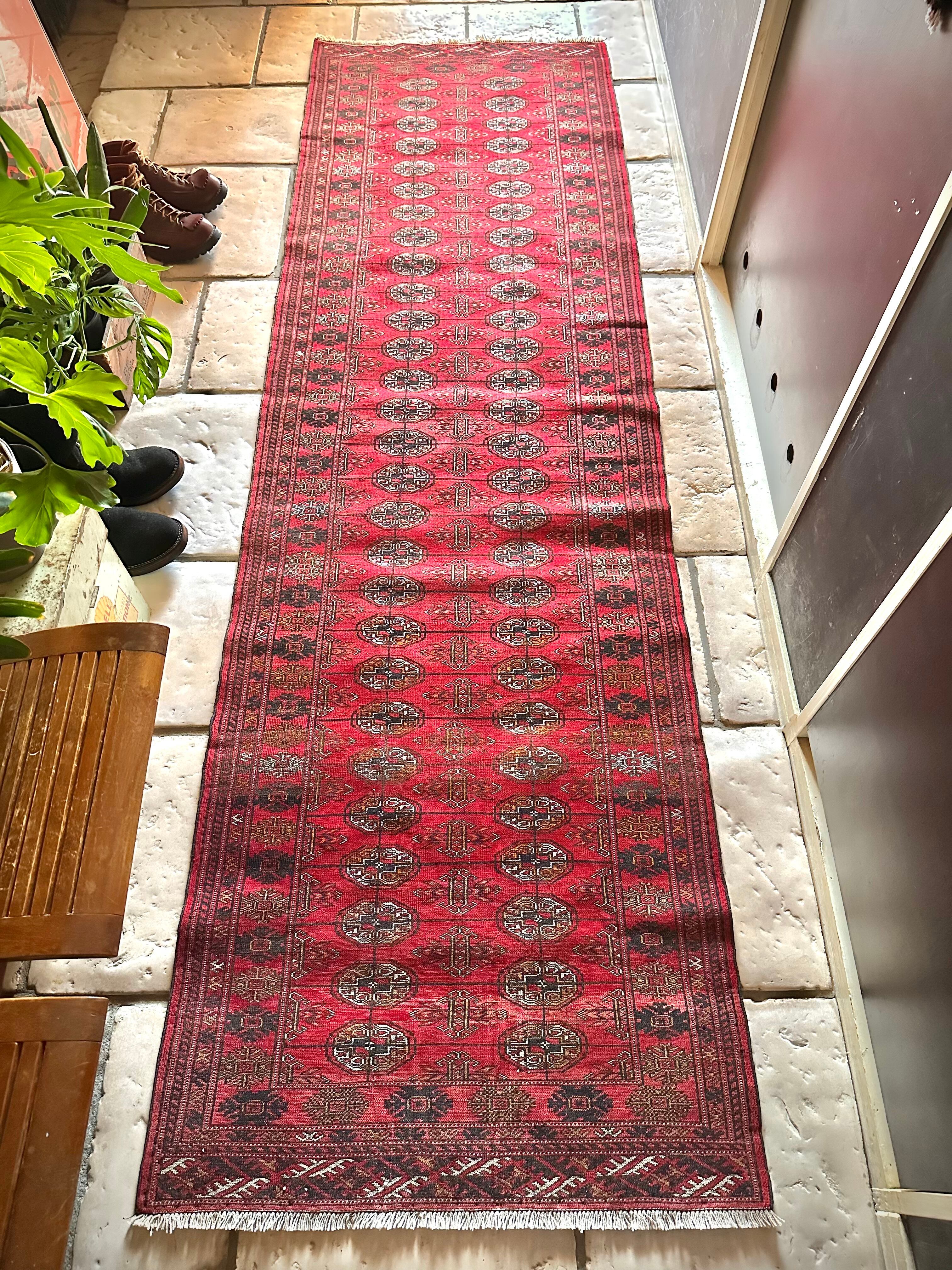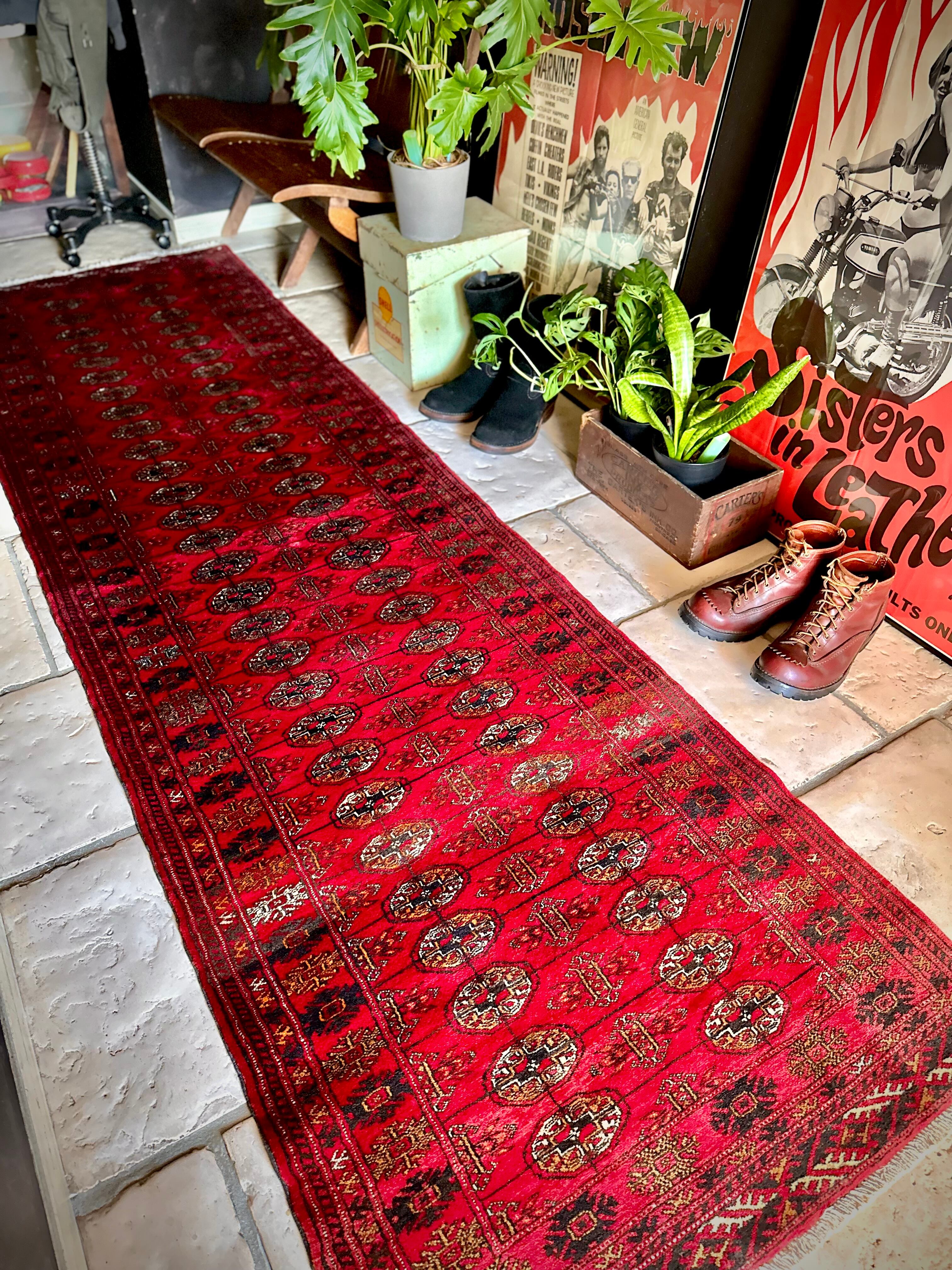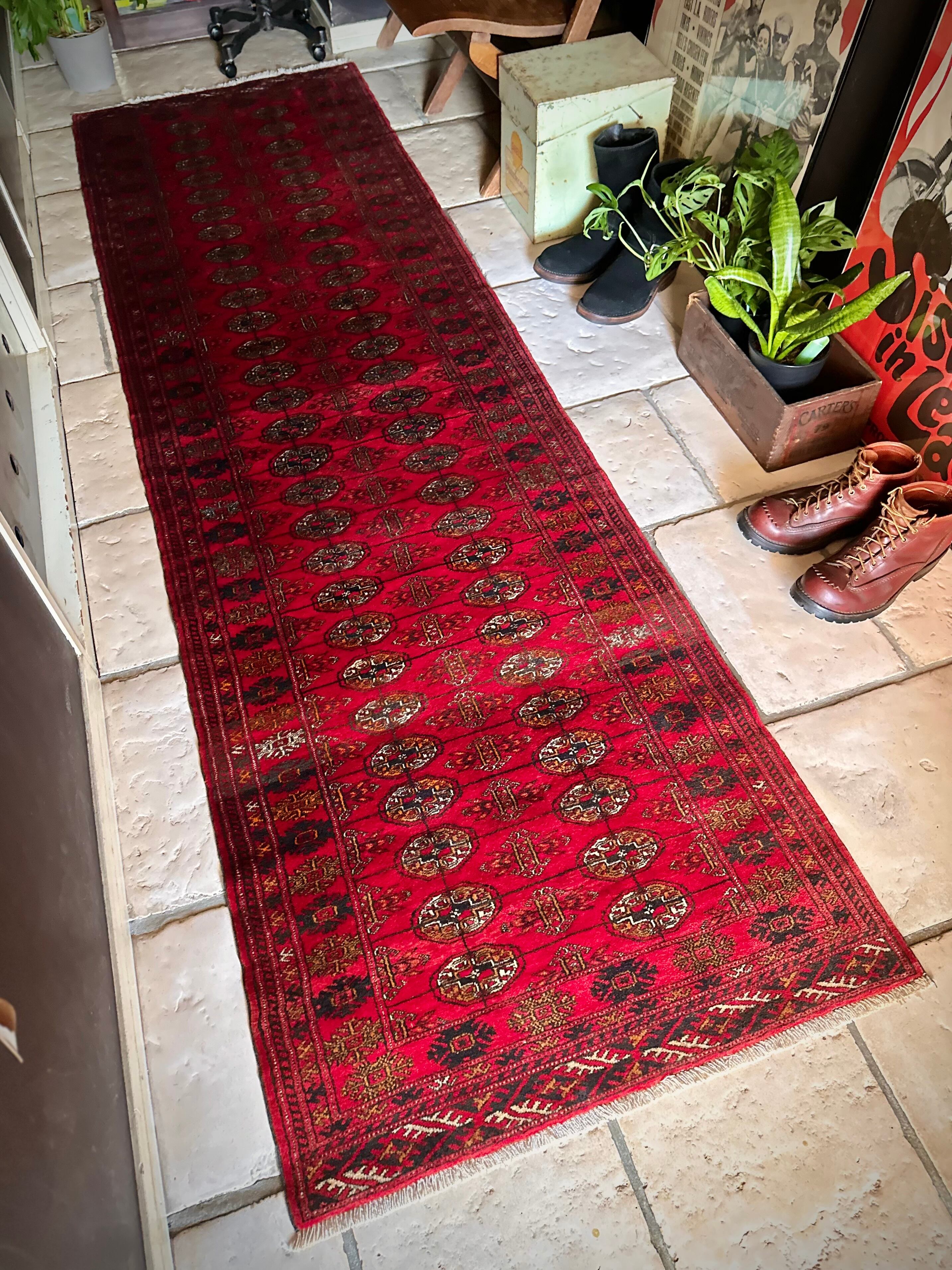 これぞまさしくレッドカーペットと言わんばかりの真っ赤なこちらは、アフガニスタン北部に居住するトルクメン族のトライバルラグで、長さが3メートル近くもある特大ランナーサイズになります。