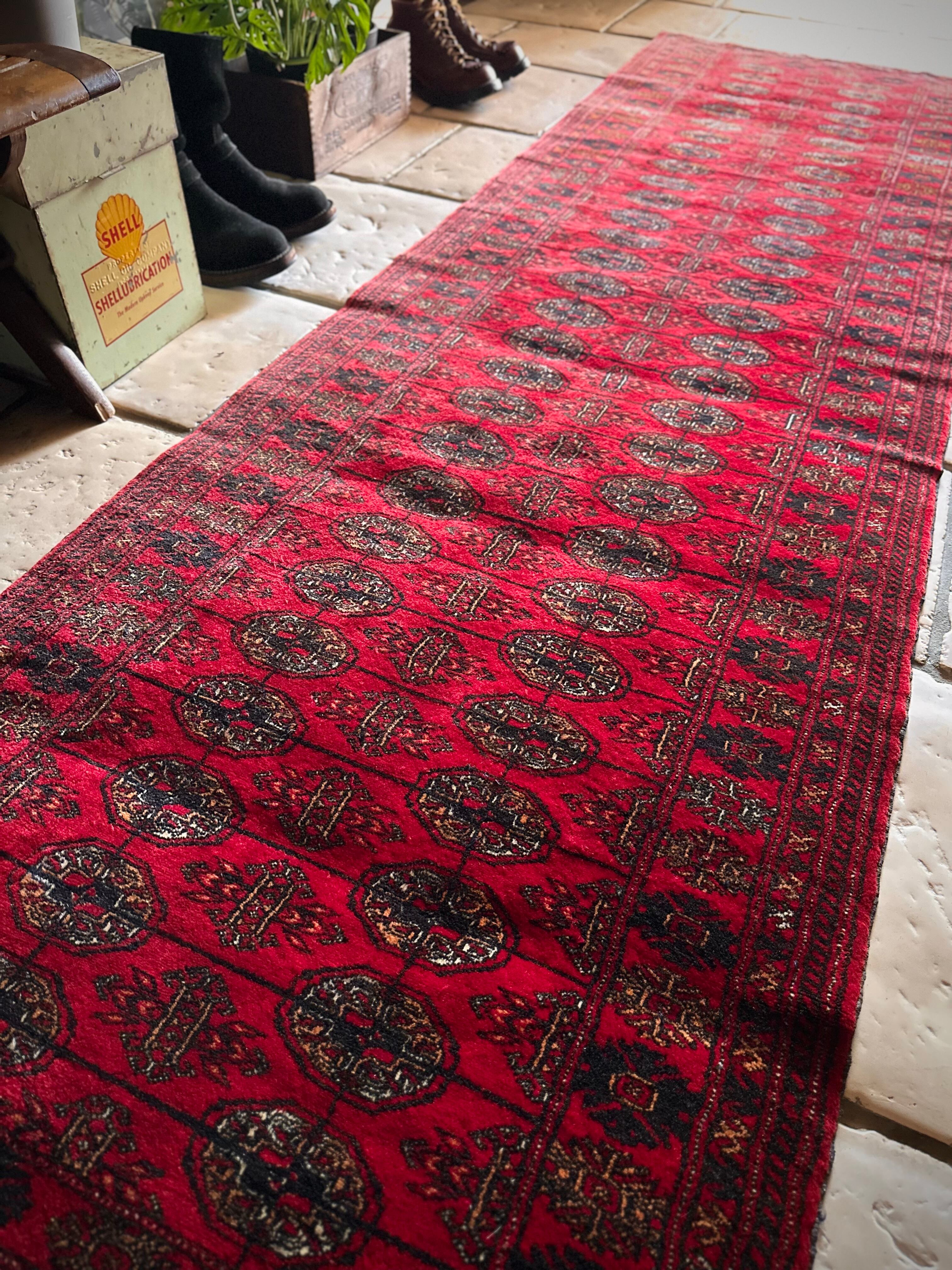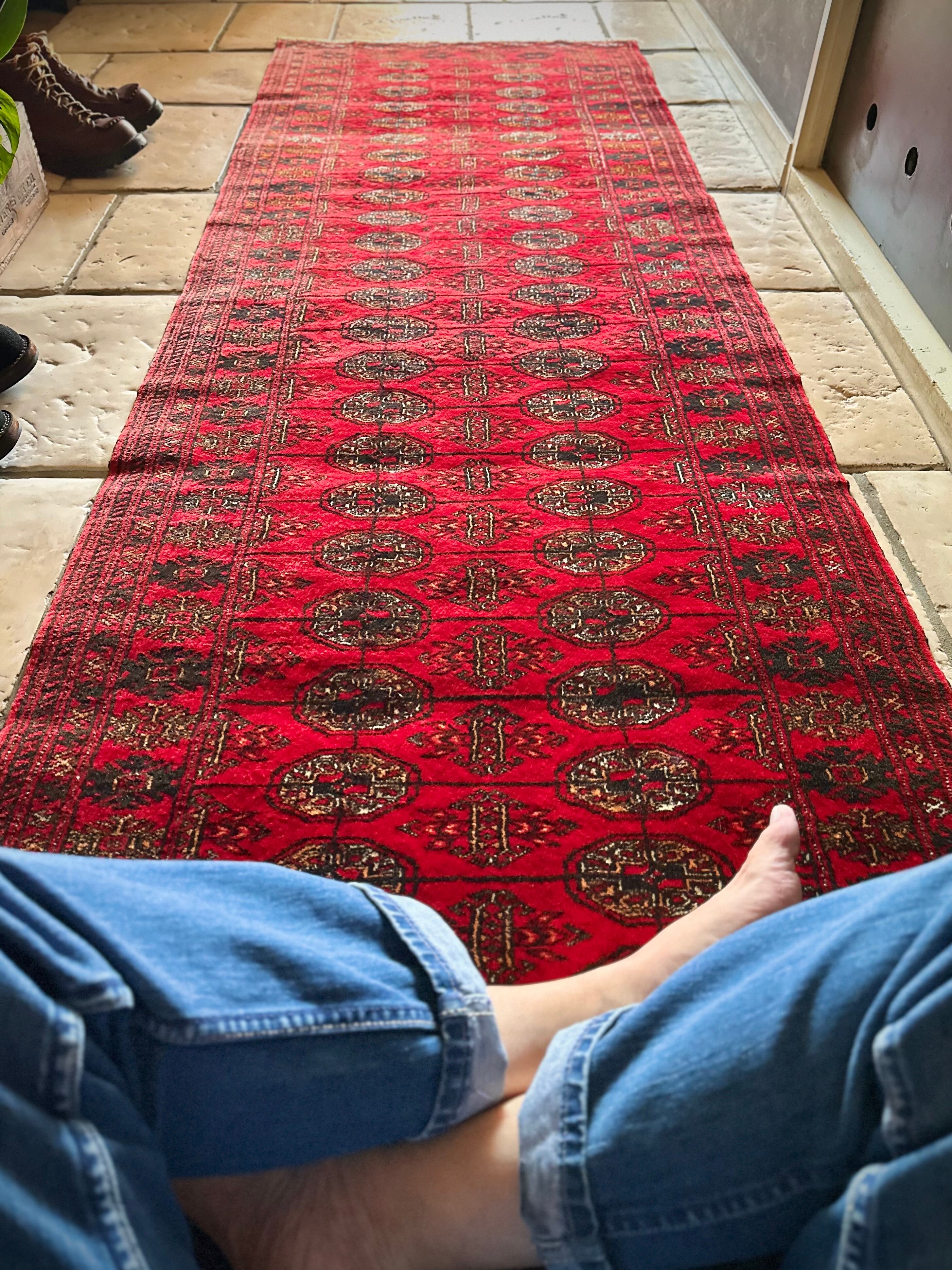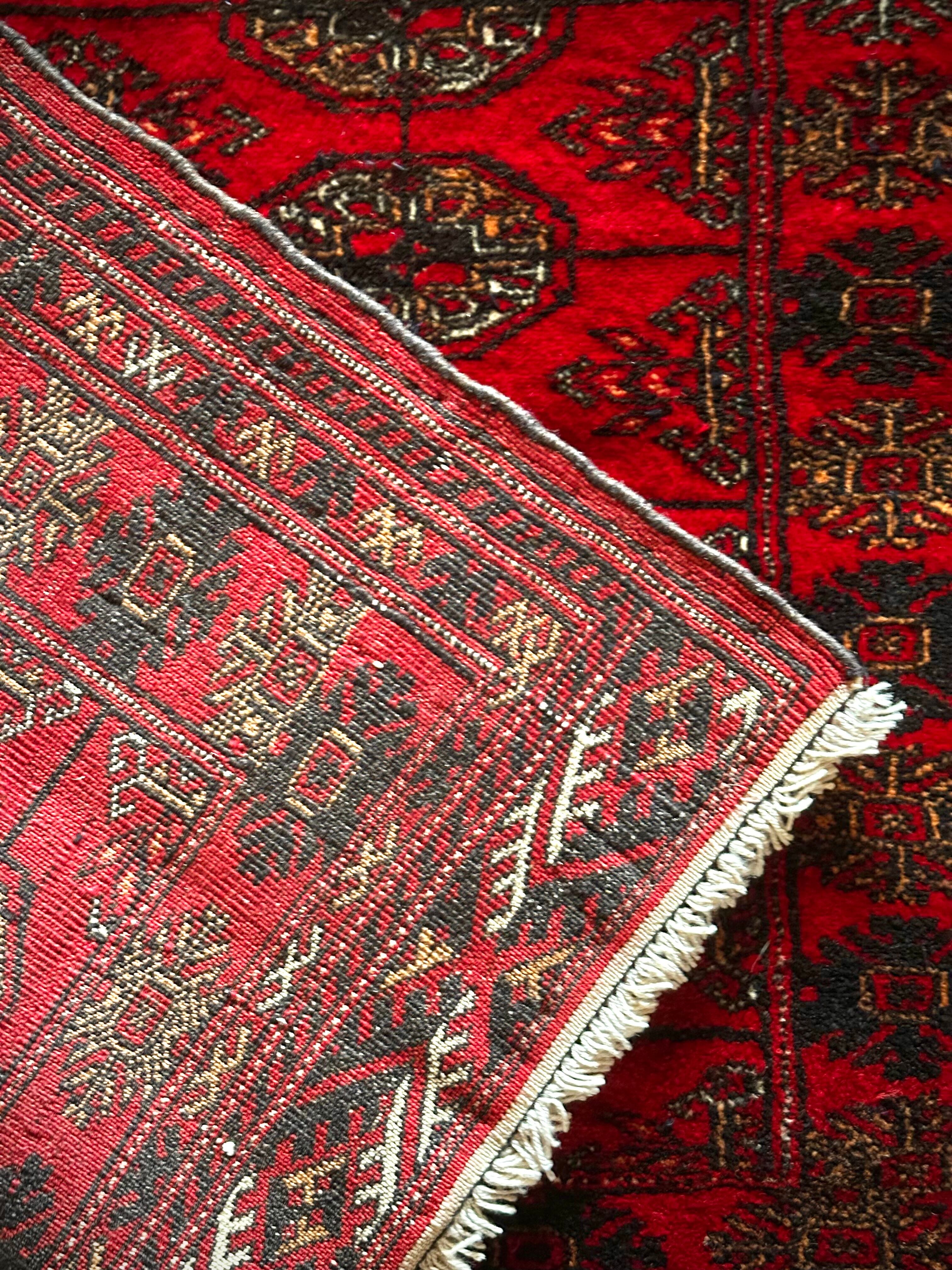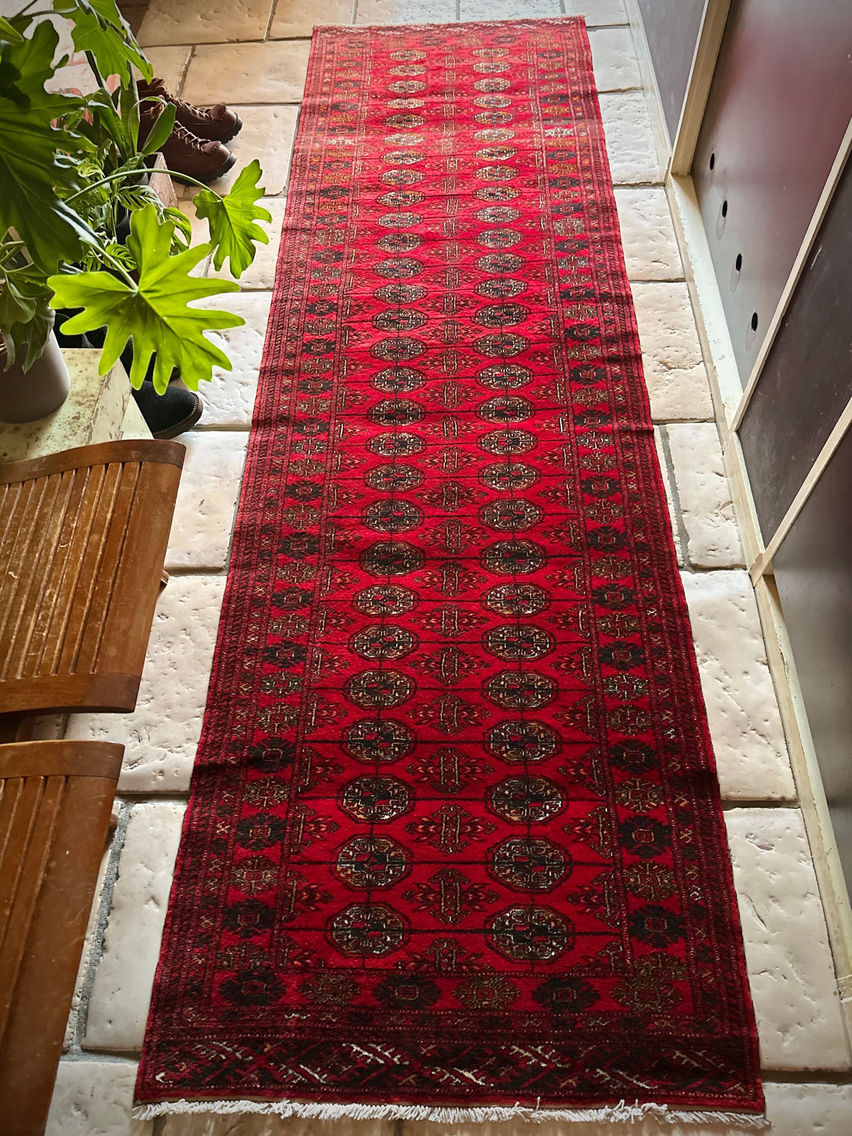 これぞまさしくレッドカーペットと言わんばかりの真っ赤なこちらは、アフガニスタン北部に居住するトルクメン族のトライバルラグで、長さが3メートル近くもある特大ランナーサイズになります。