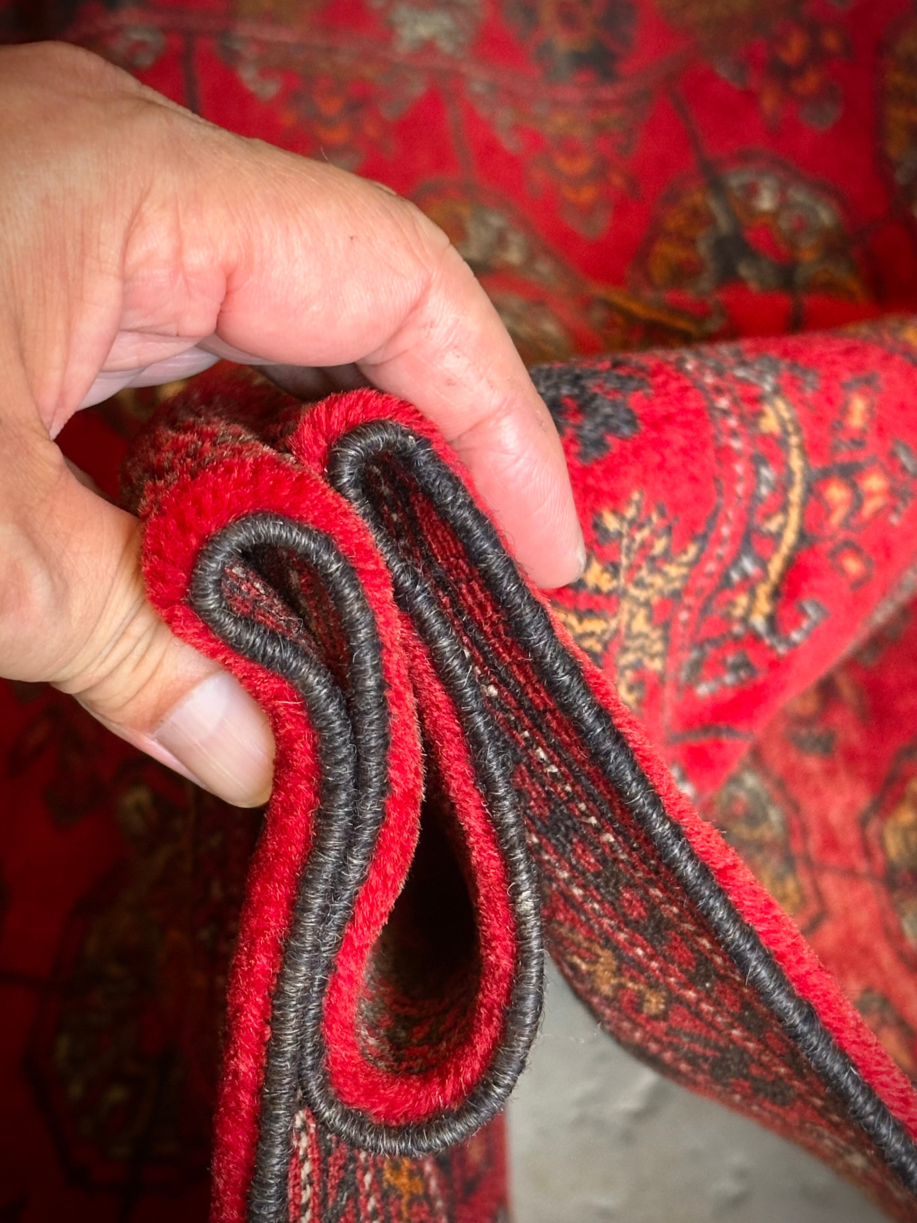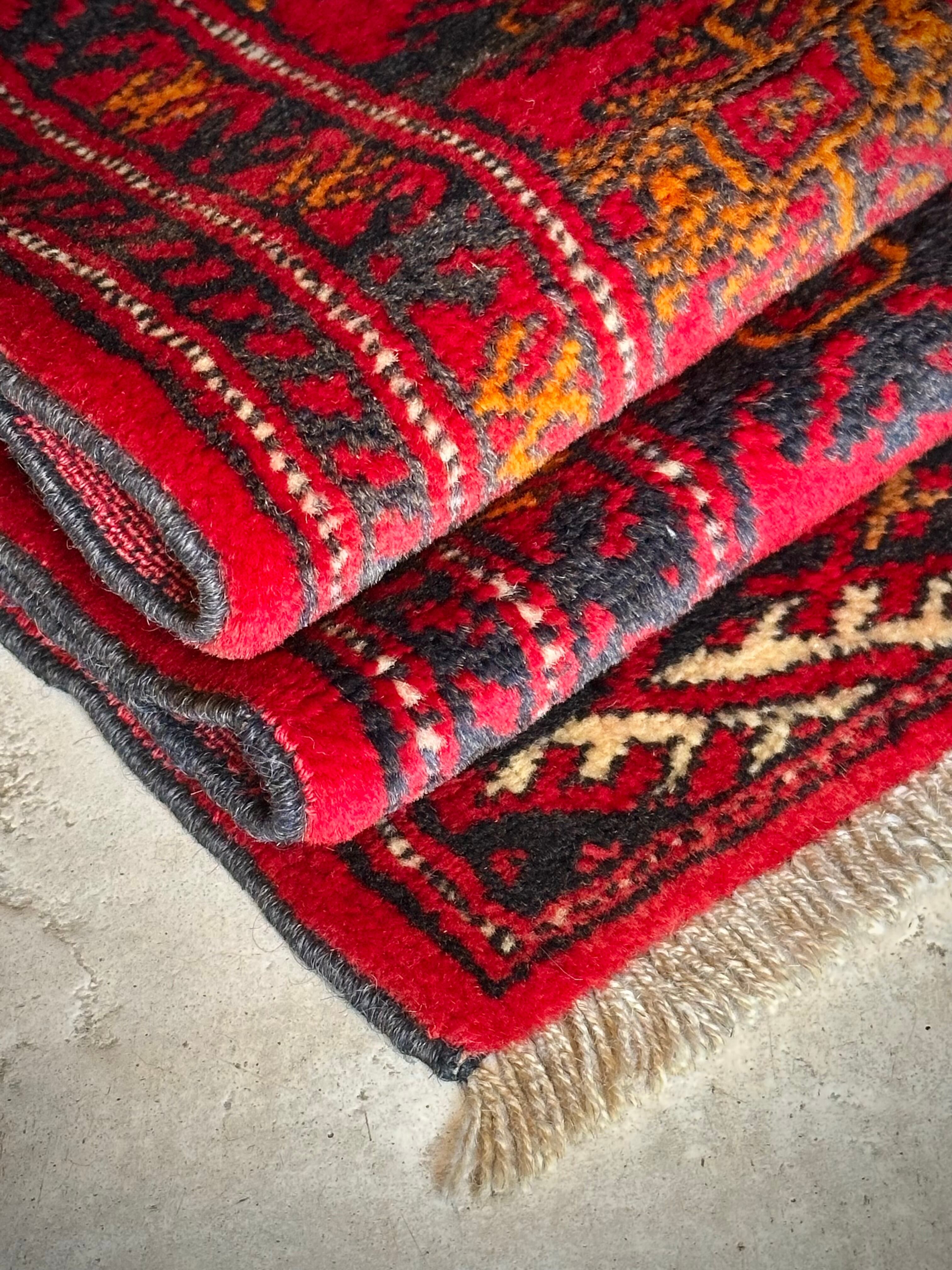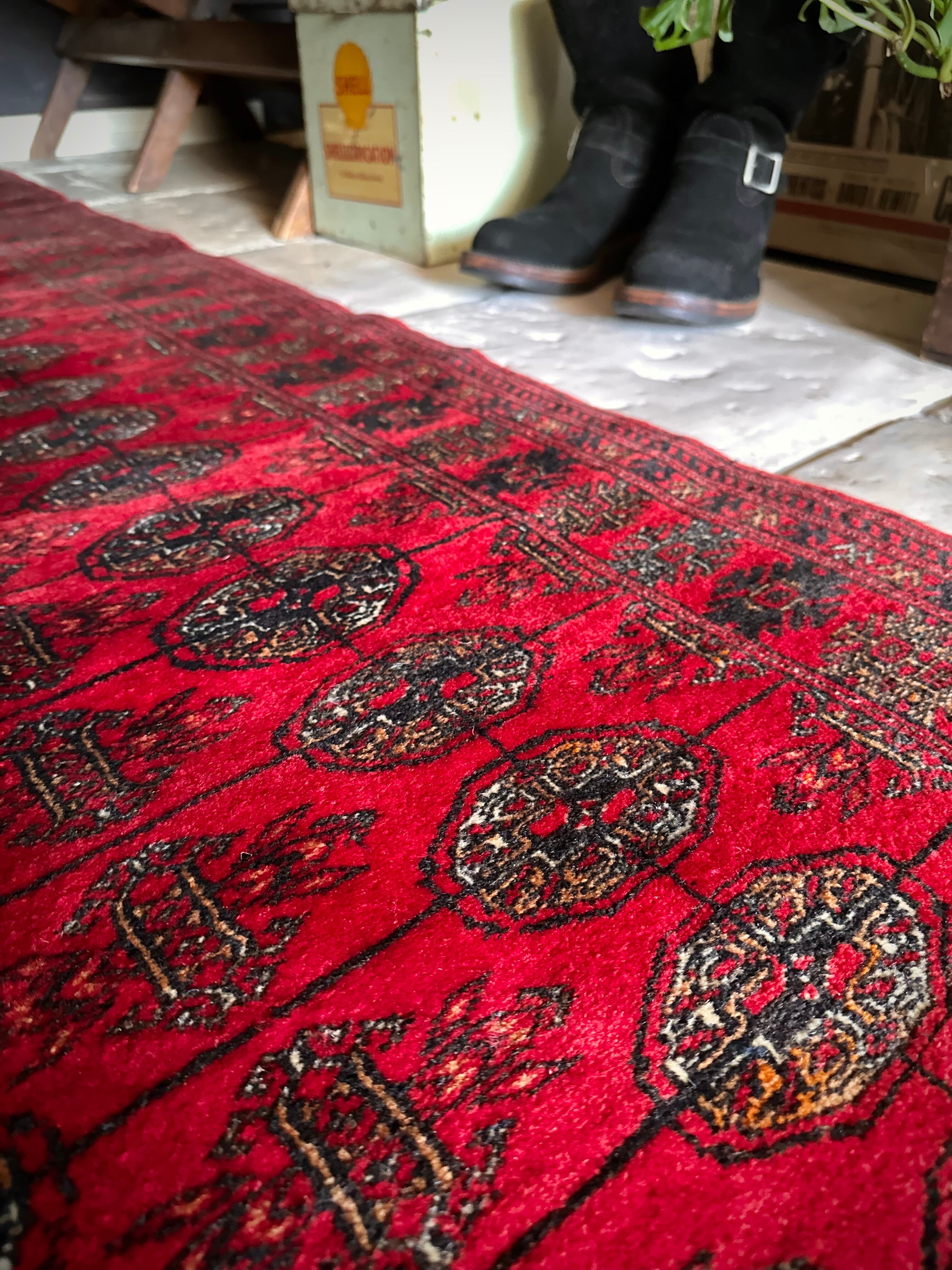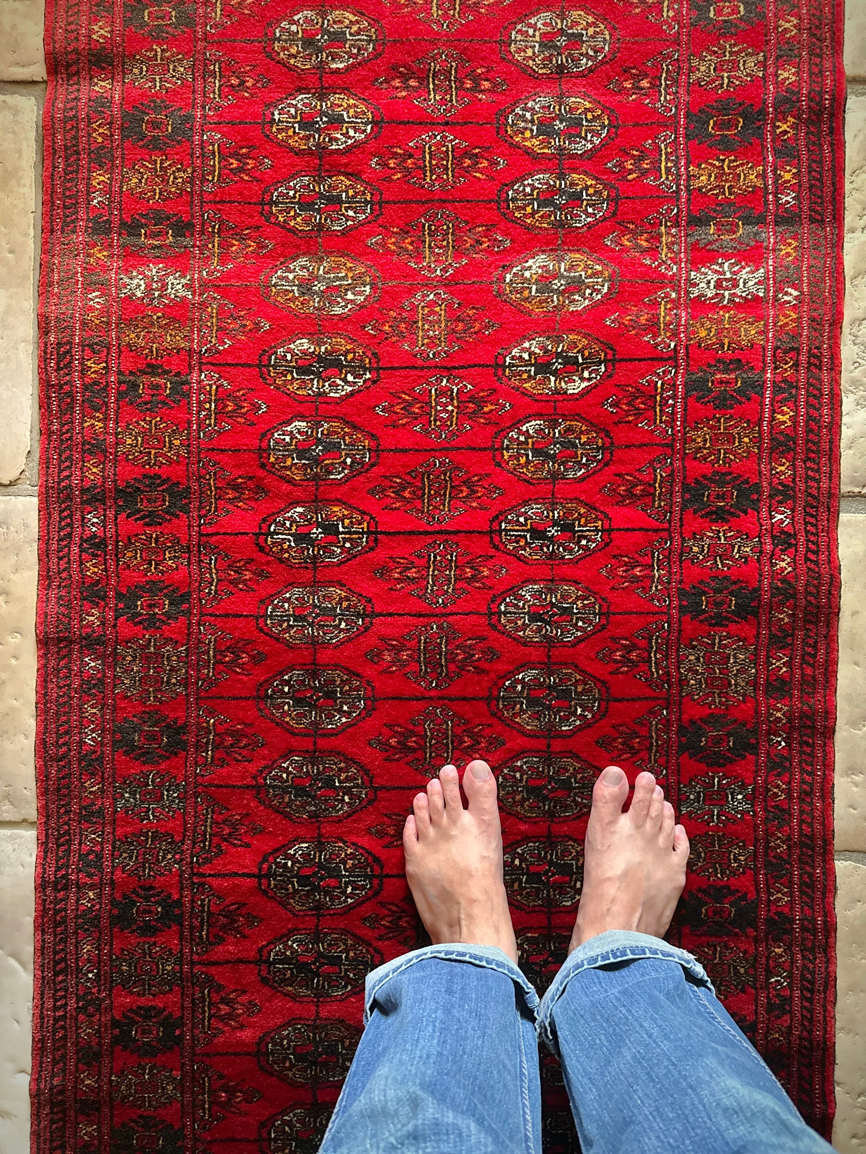 これぞまさしくレッドカーペットと言わんばかりの真っ赤なこちらは、アフガニスタン北部に居住するトルクメン族のトライバルラグで、長さが3メートル近くもある特大ランナーサイズになります。