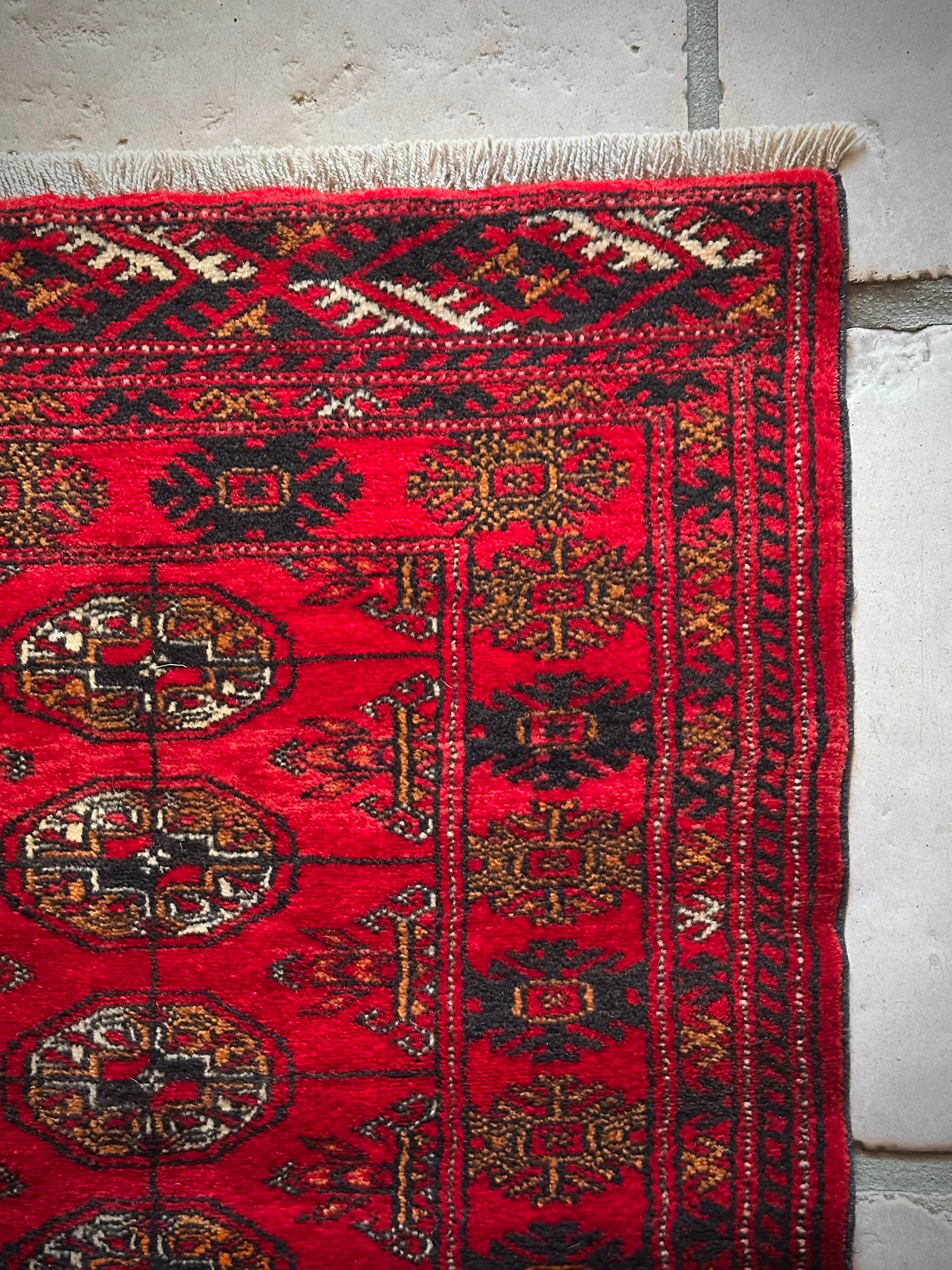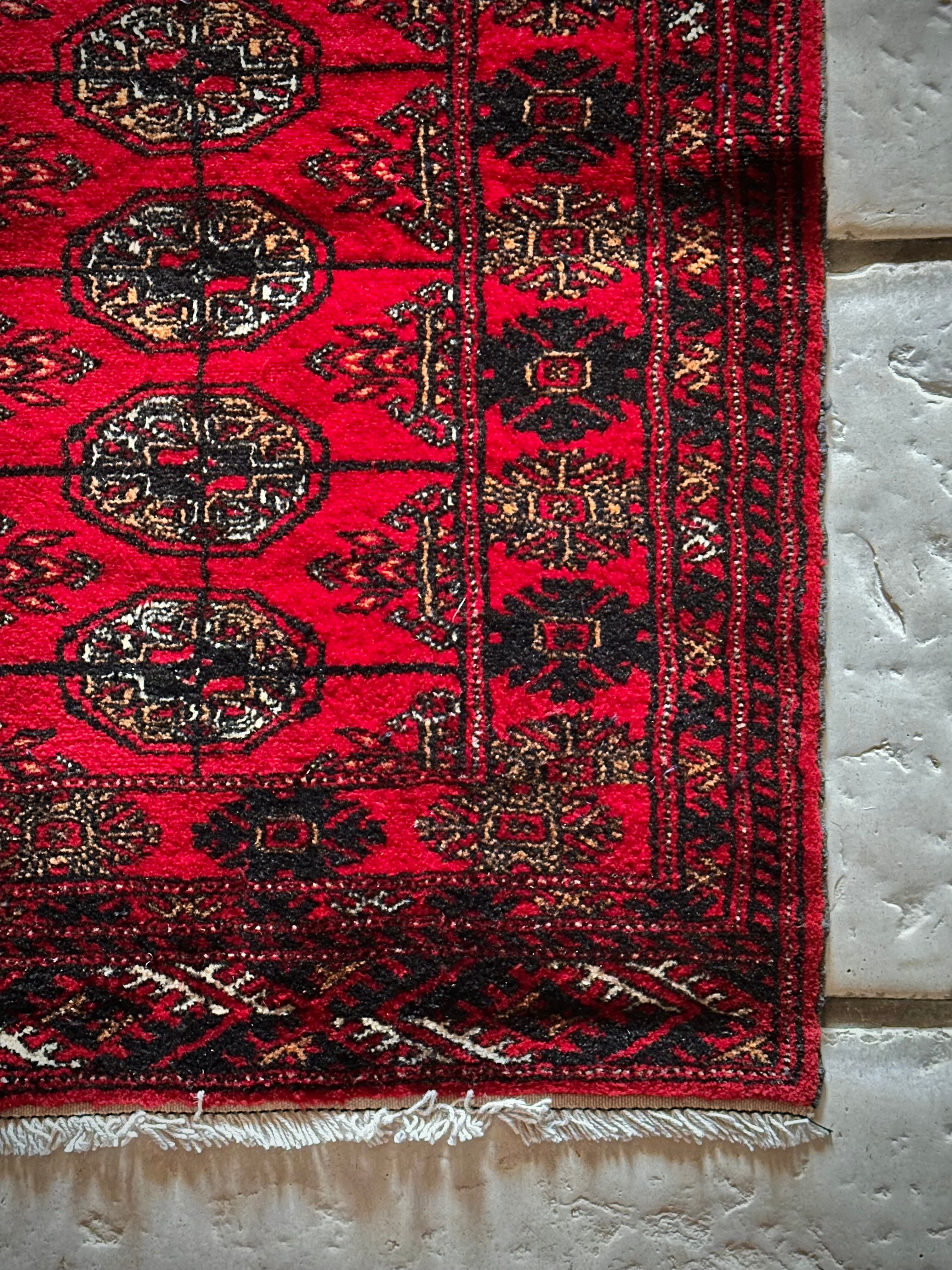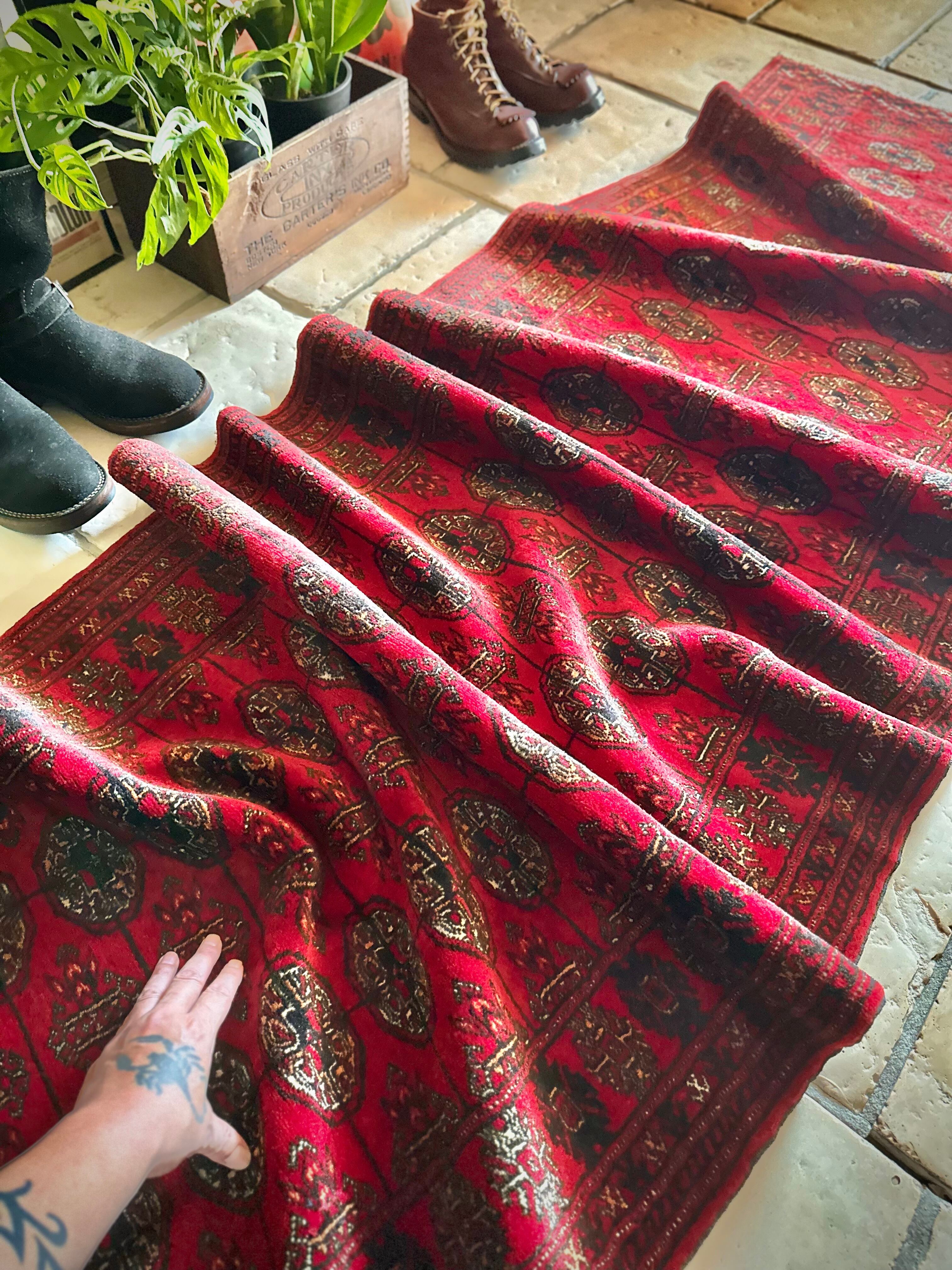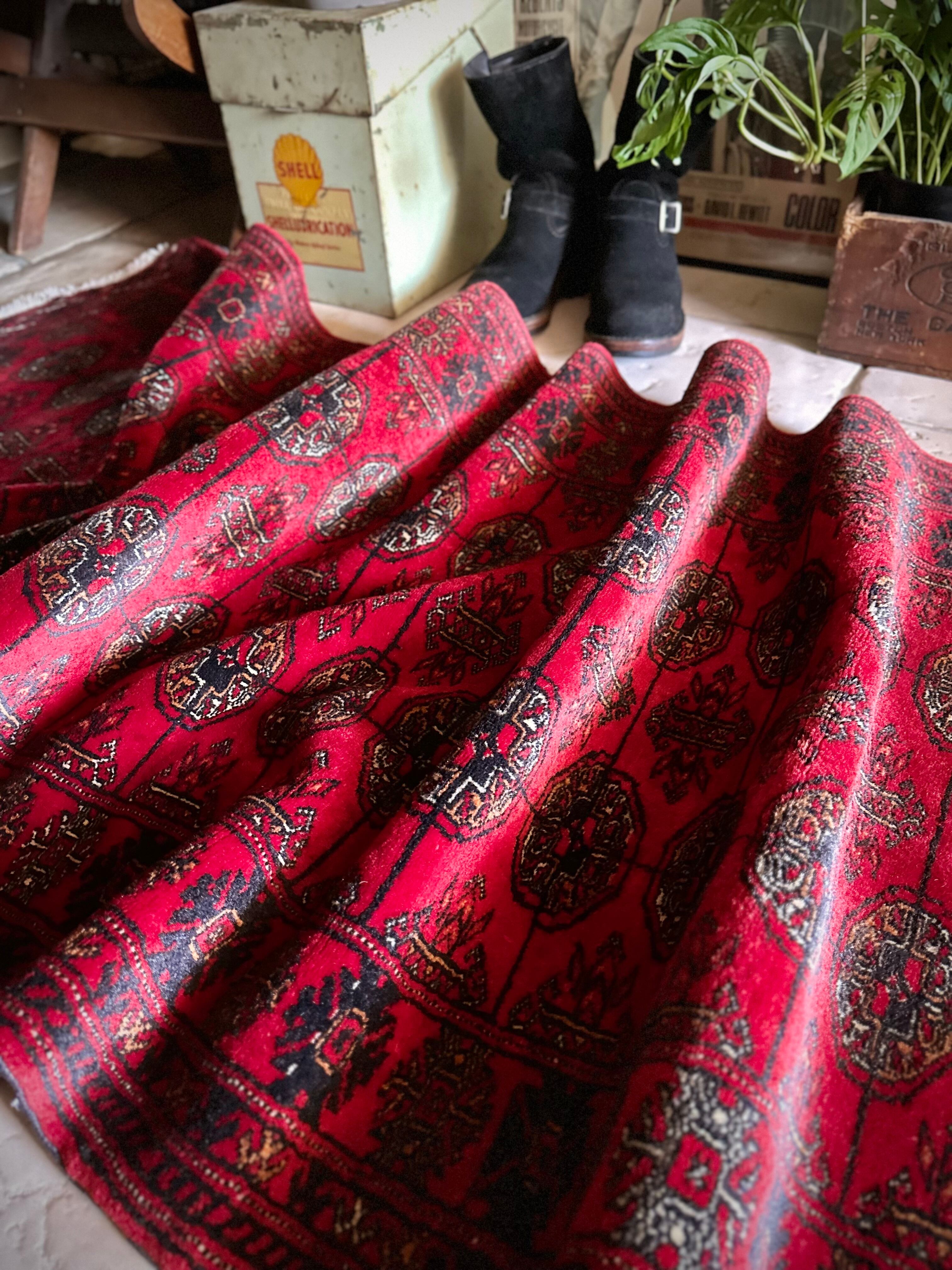 これぞまさしくレッドカーペットと言わんばかりの真っ赤なこちらは、アフガニスタン北部に居住するトルクメン族のトライバルラグで、長さが3メートル近くもある特大ランナーサイズになります。