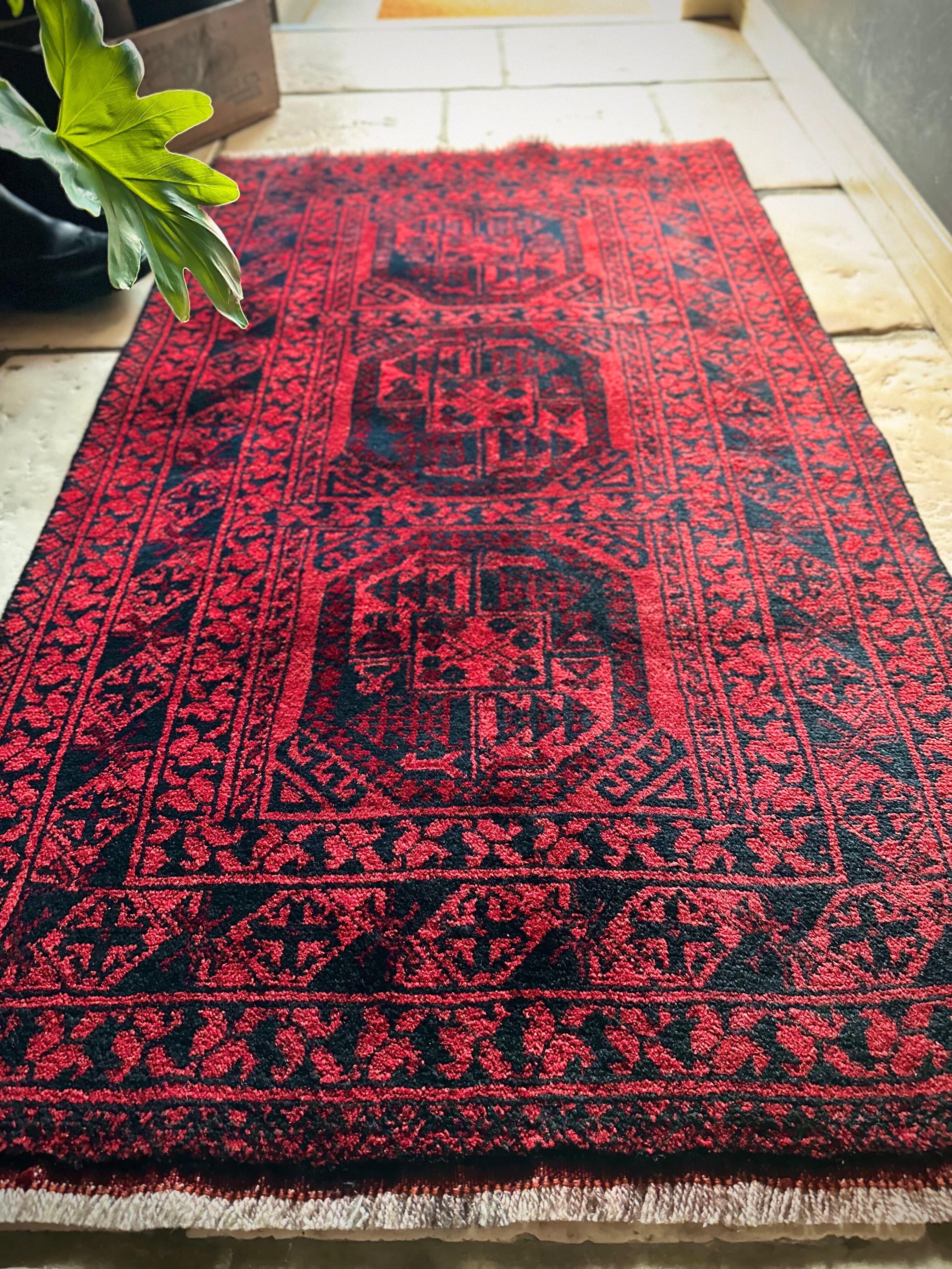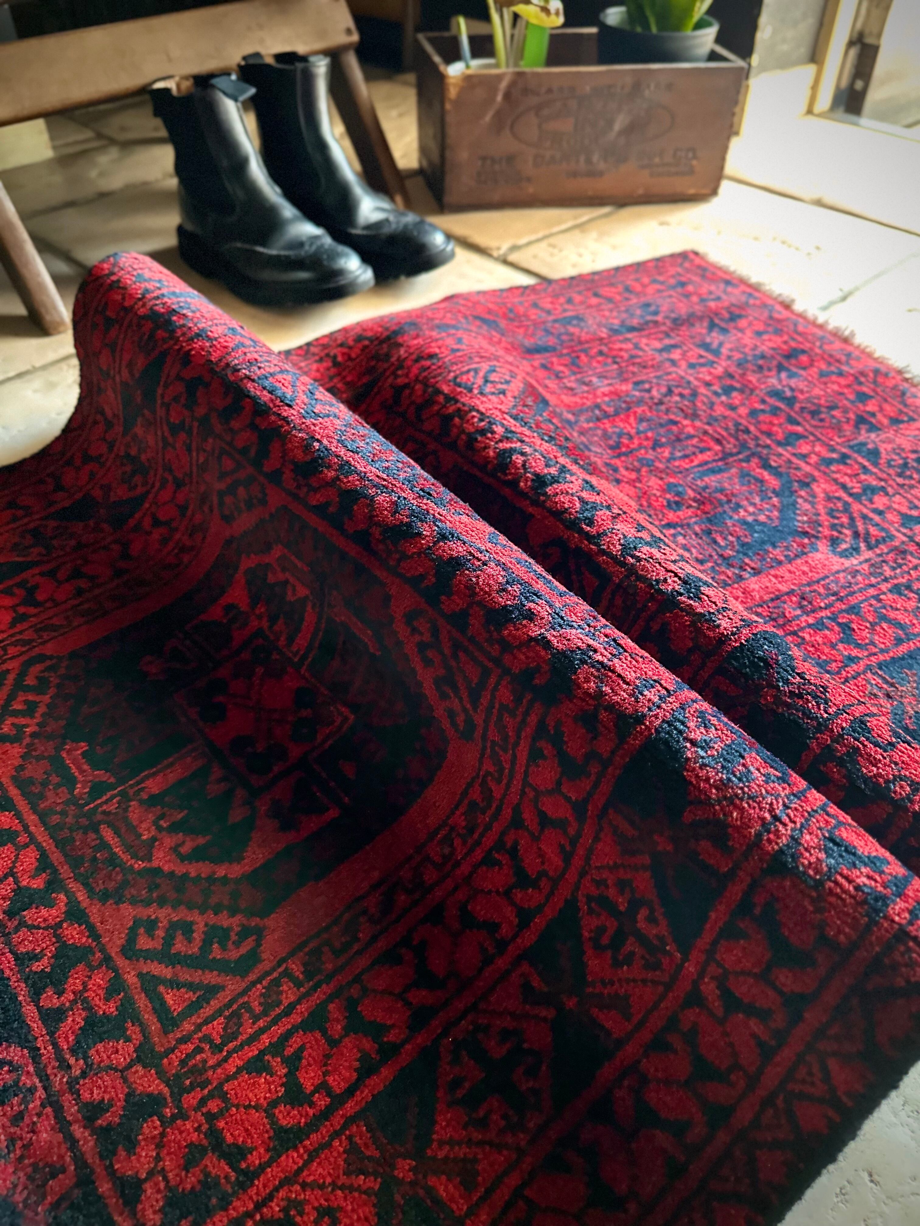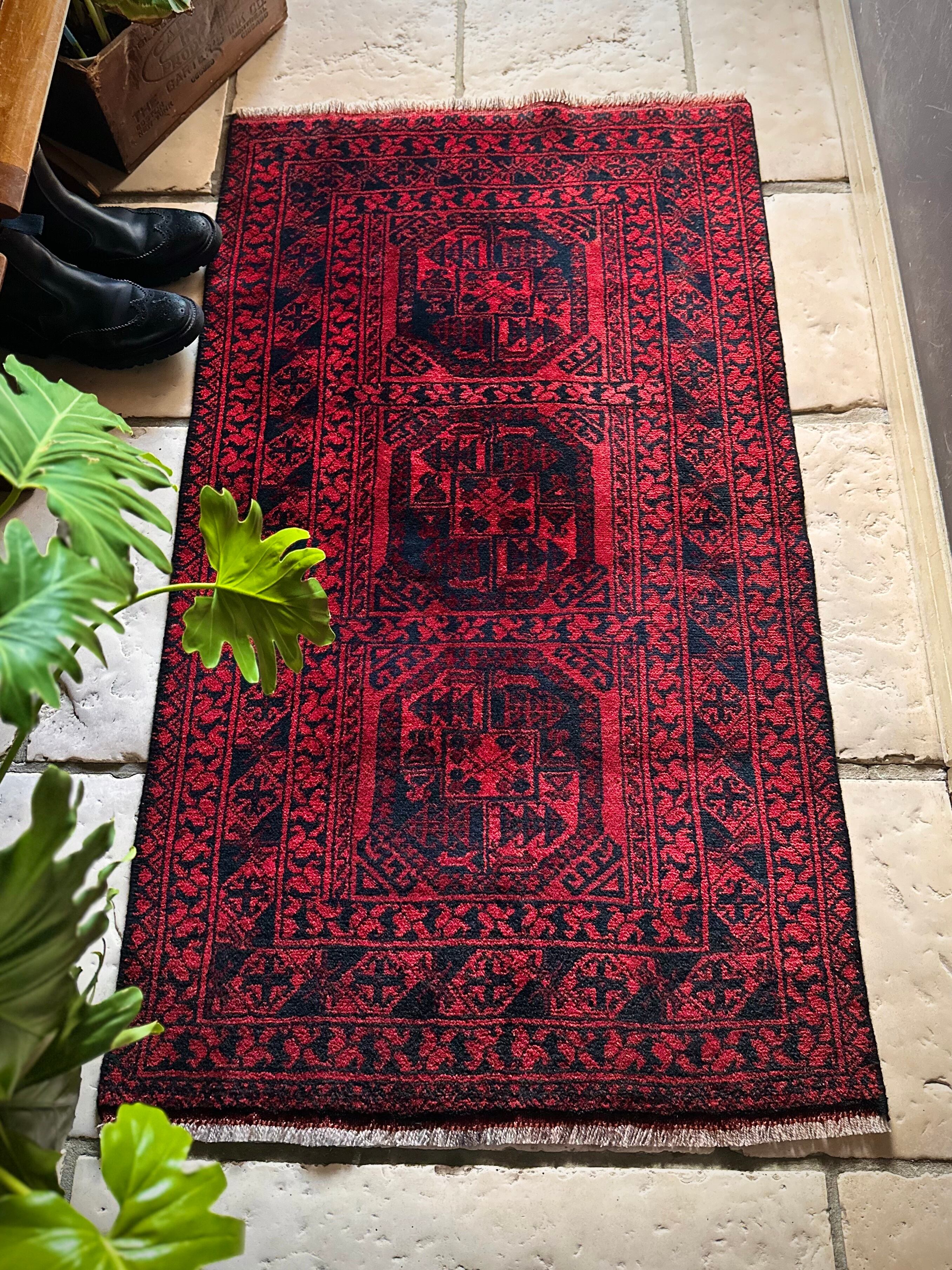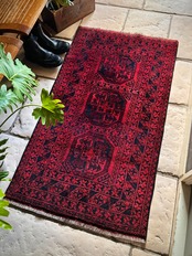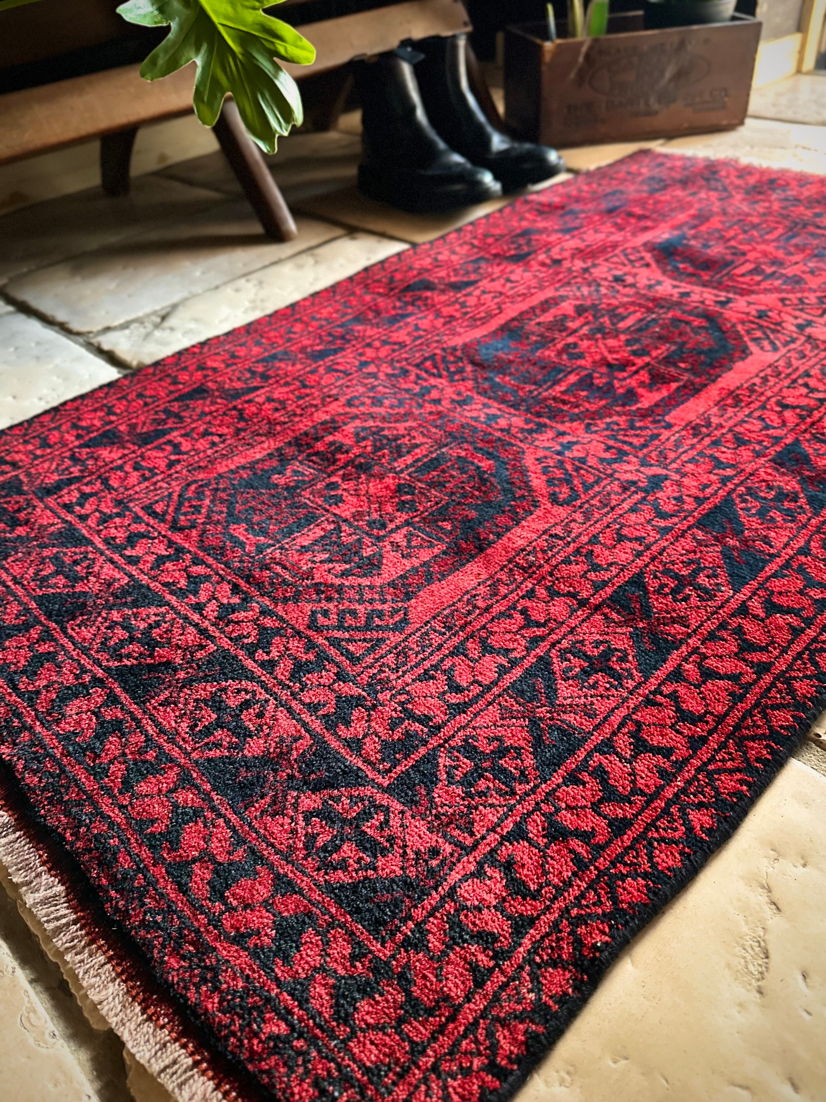 真っ赤なフィールドに象の足跡と呼ばれるフィルパイ紋様のスレイマンギュルがかっこいいこちらは、アフガニスタン北部に居住するトルクメンの支族であるエルサリ部族のトライバルラグになります。