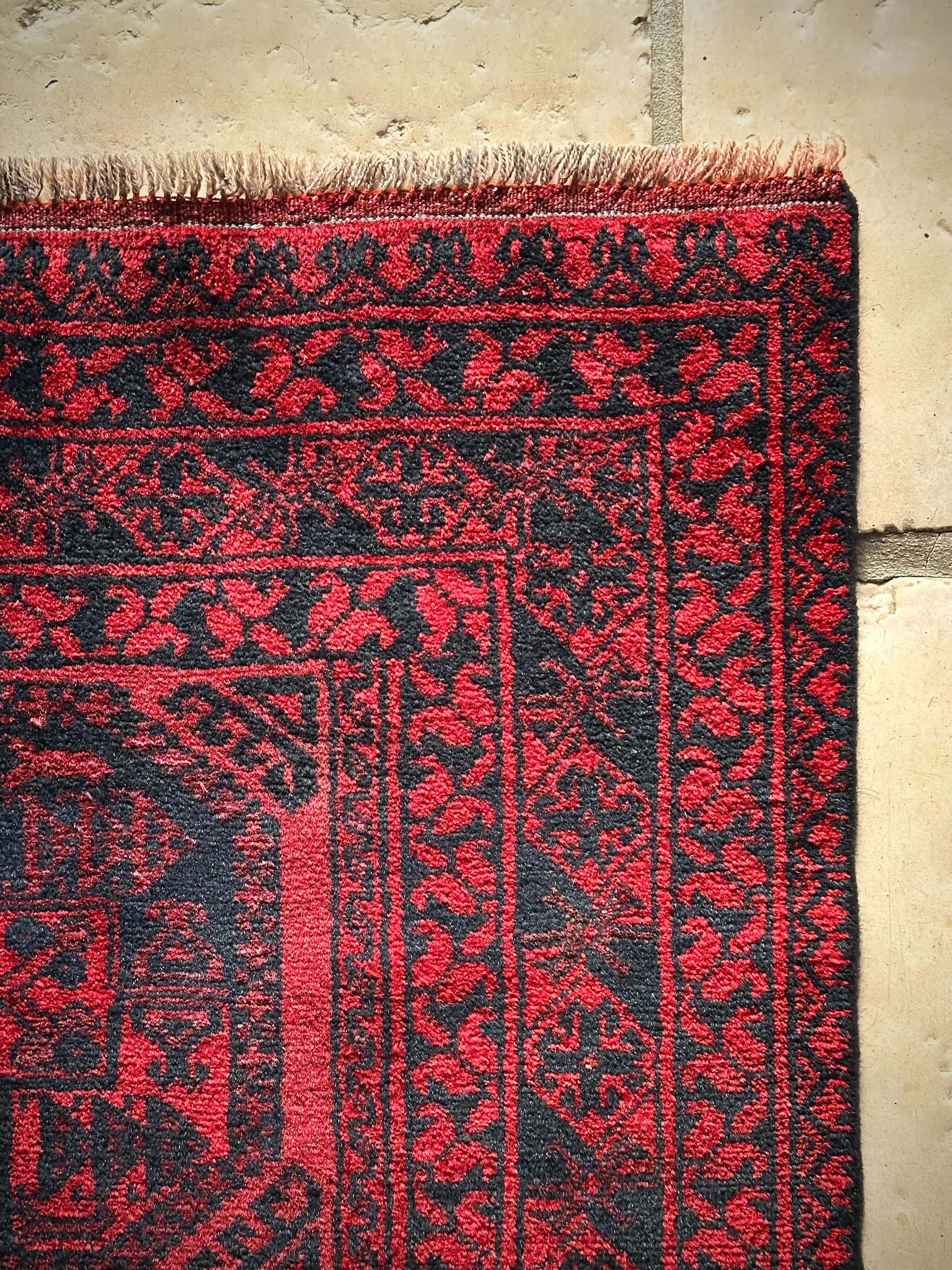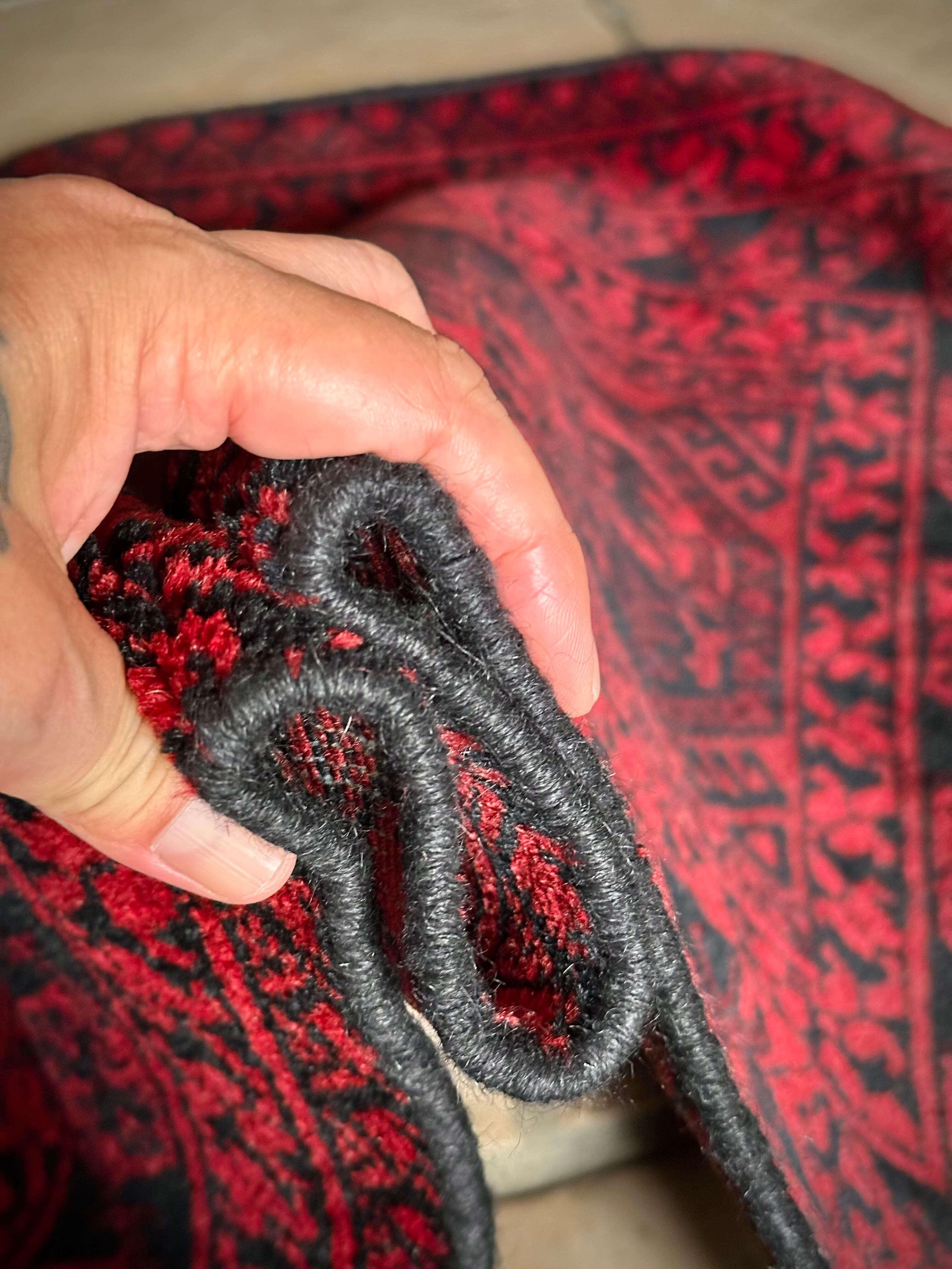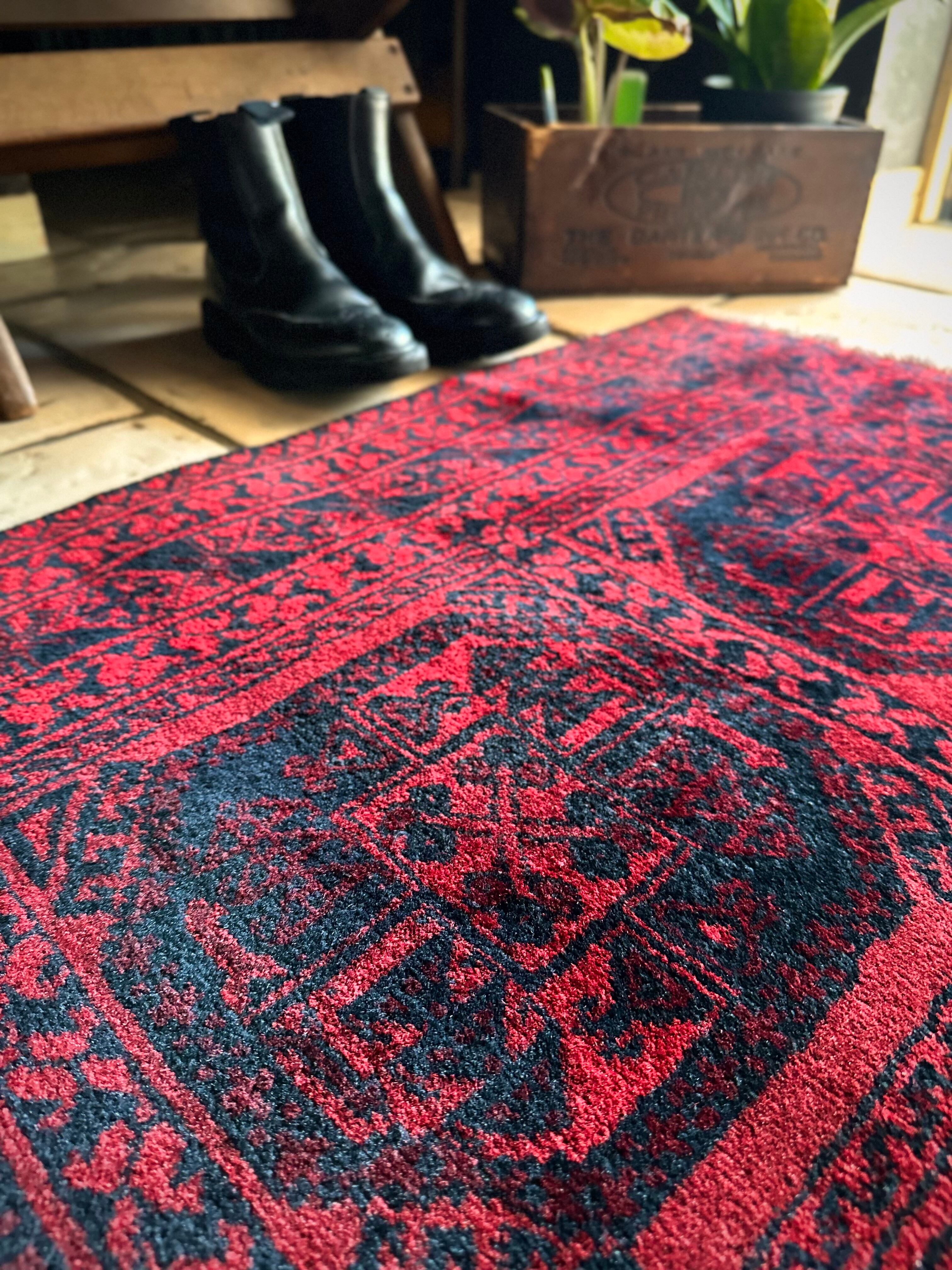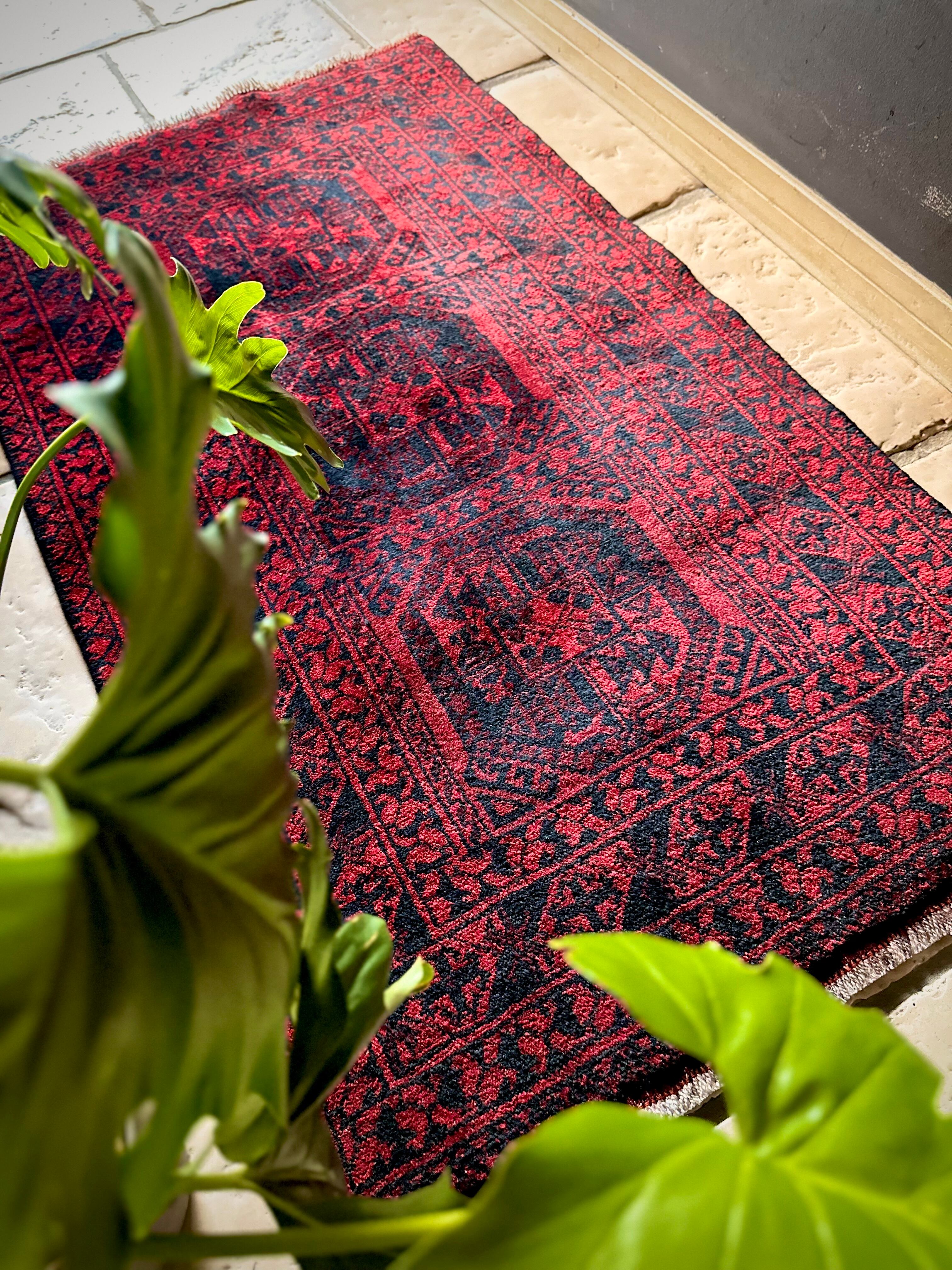 真っ赤なフィールドに象の足跡と呼ばれるフィルパイ紋様のスレイマンギュルがかっこいいこちらは、アフガニスタン北部に居住するトルクメンの支族であるエルサリ部族のトライバルラグになります。