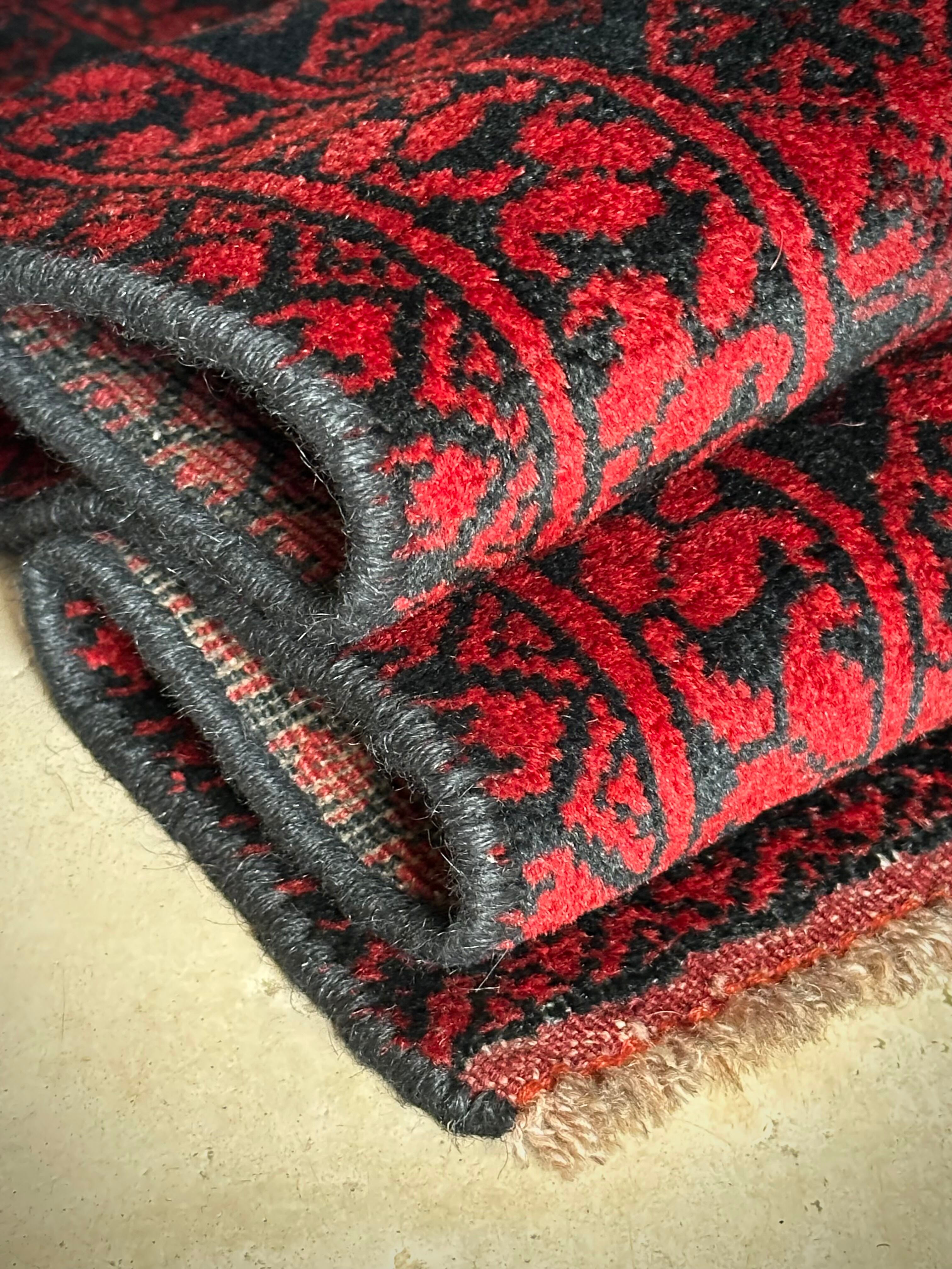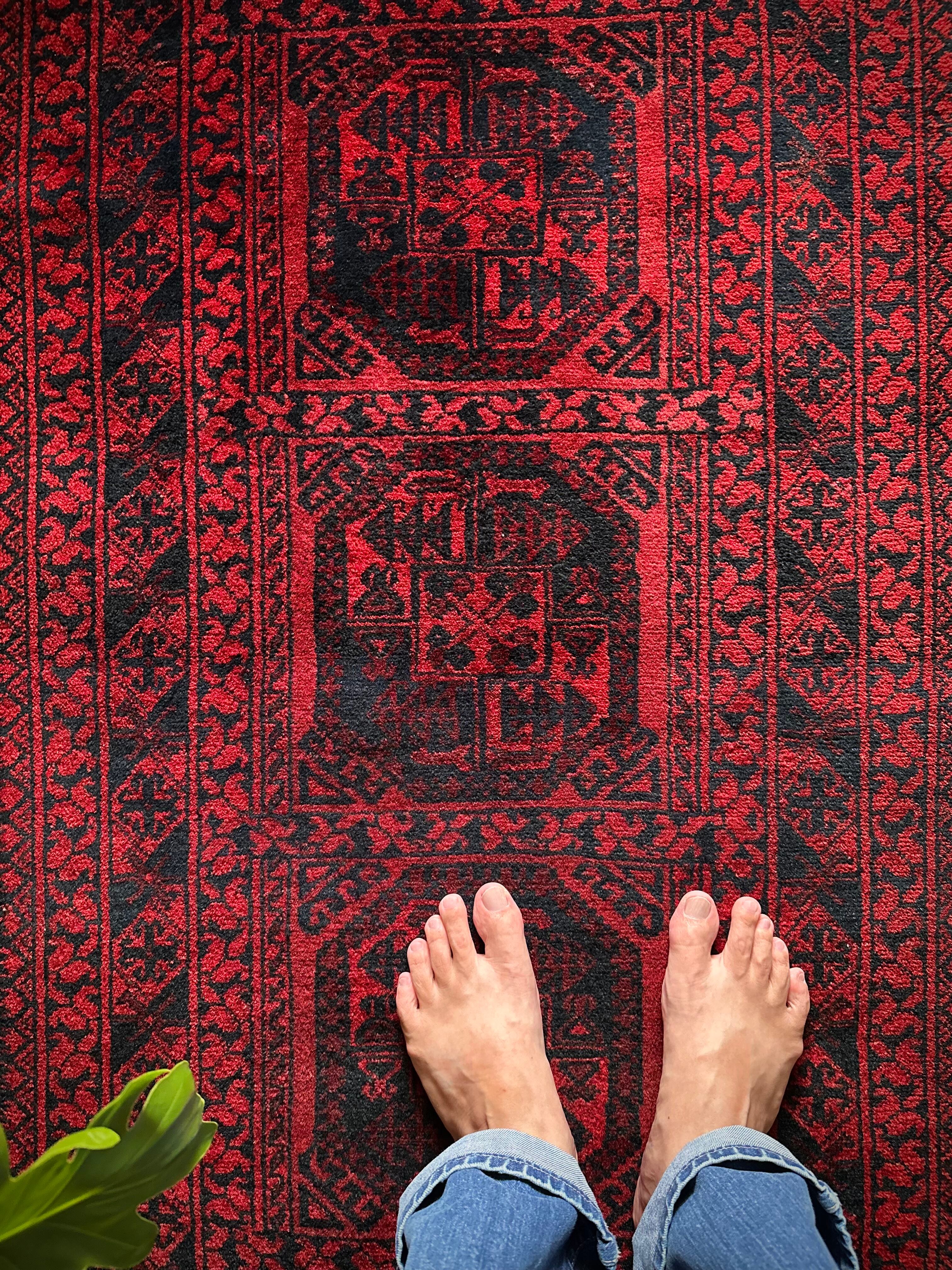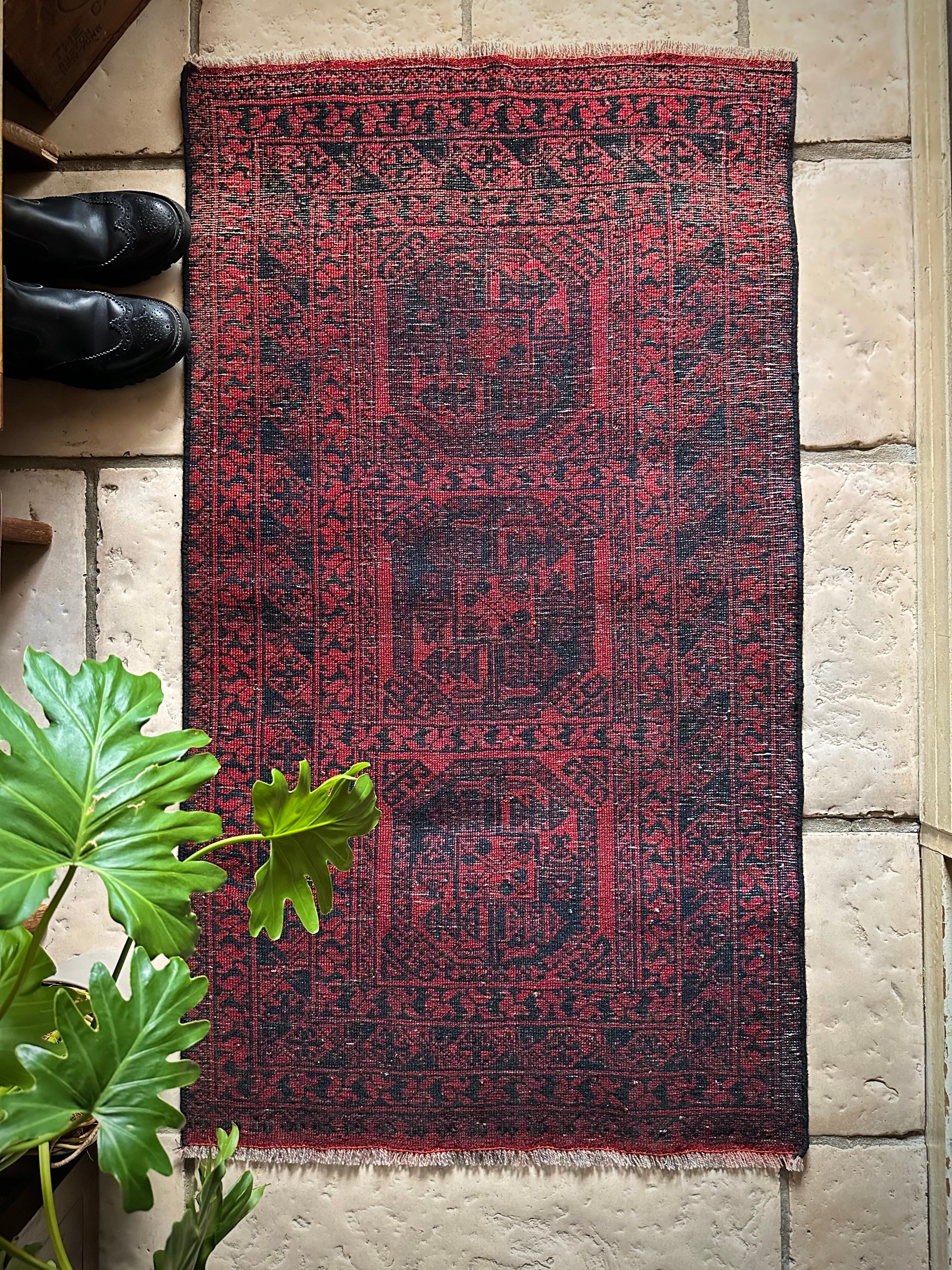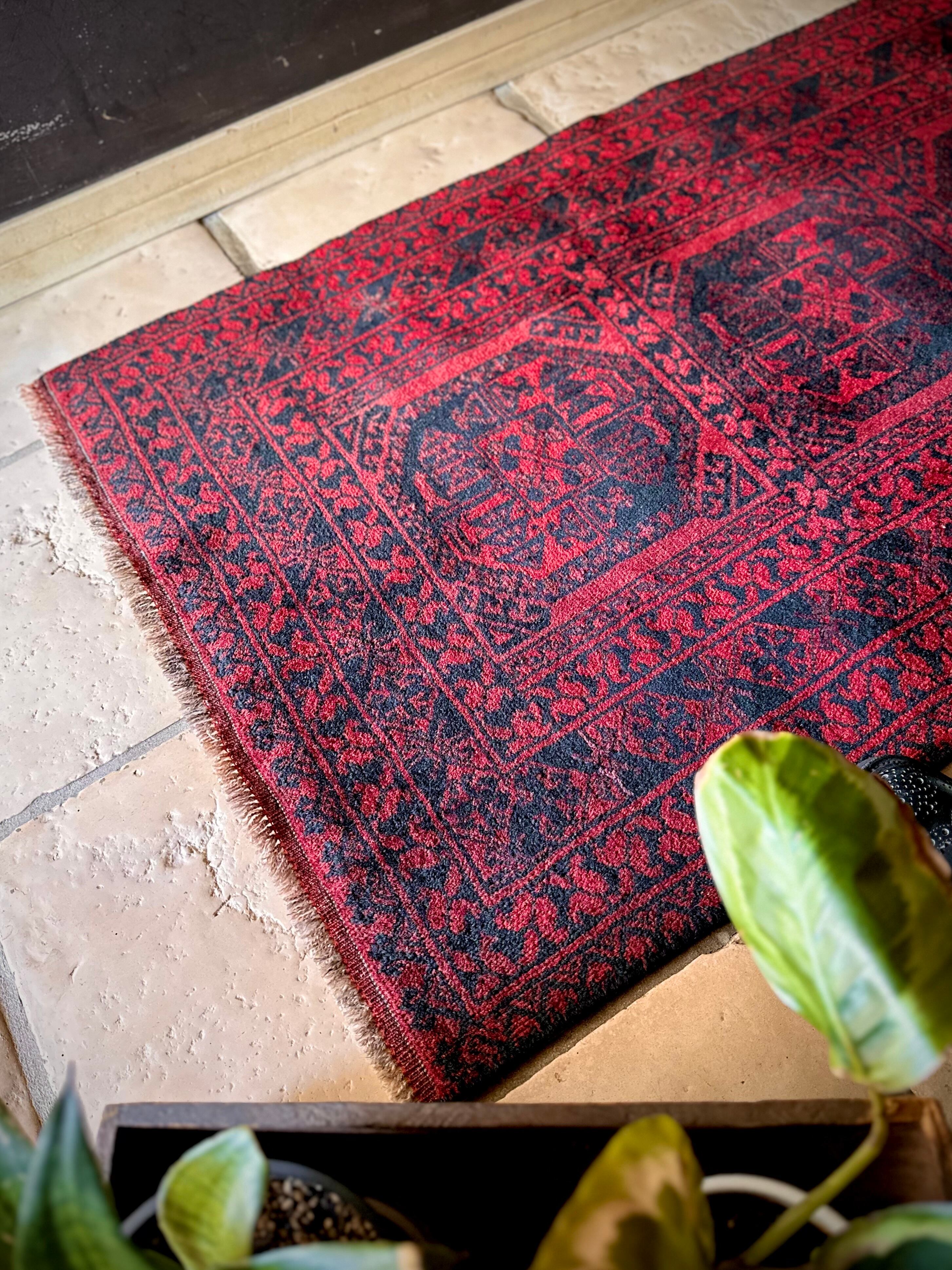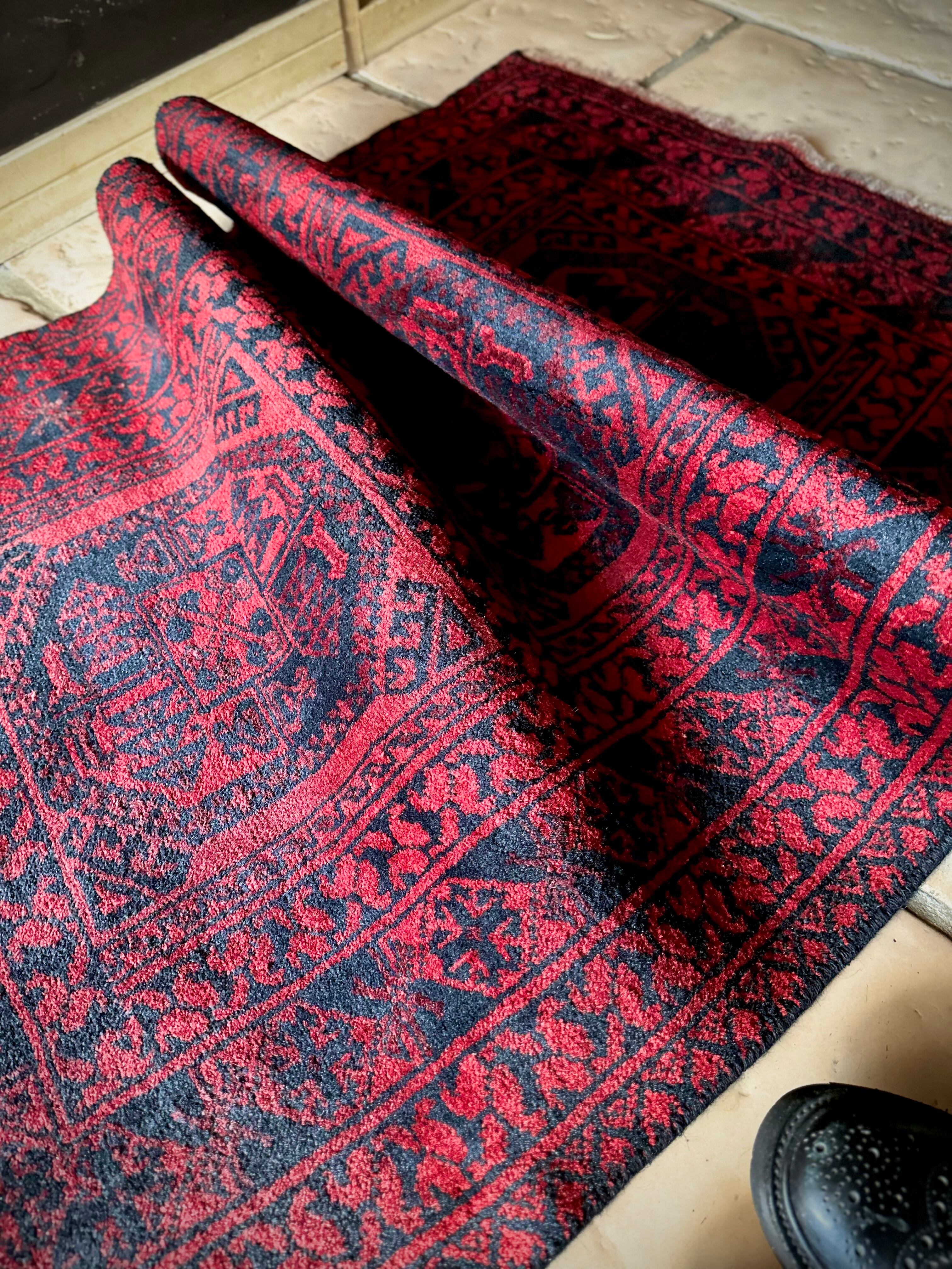 真っ赤なフィールドに象の足跡と呼ばれるフィルパイ紋様のスレイマンギュルがかっこいいこちらは、アフガニスタン北部に居住するトルクメンの支族であるエルサリ部族のトライバルラグになります。