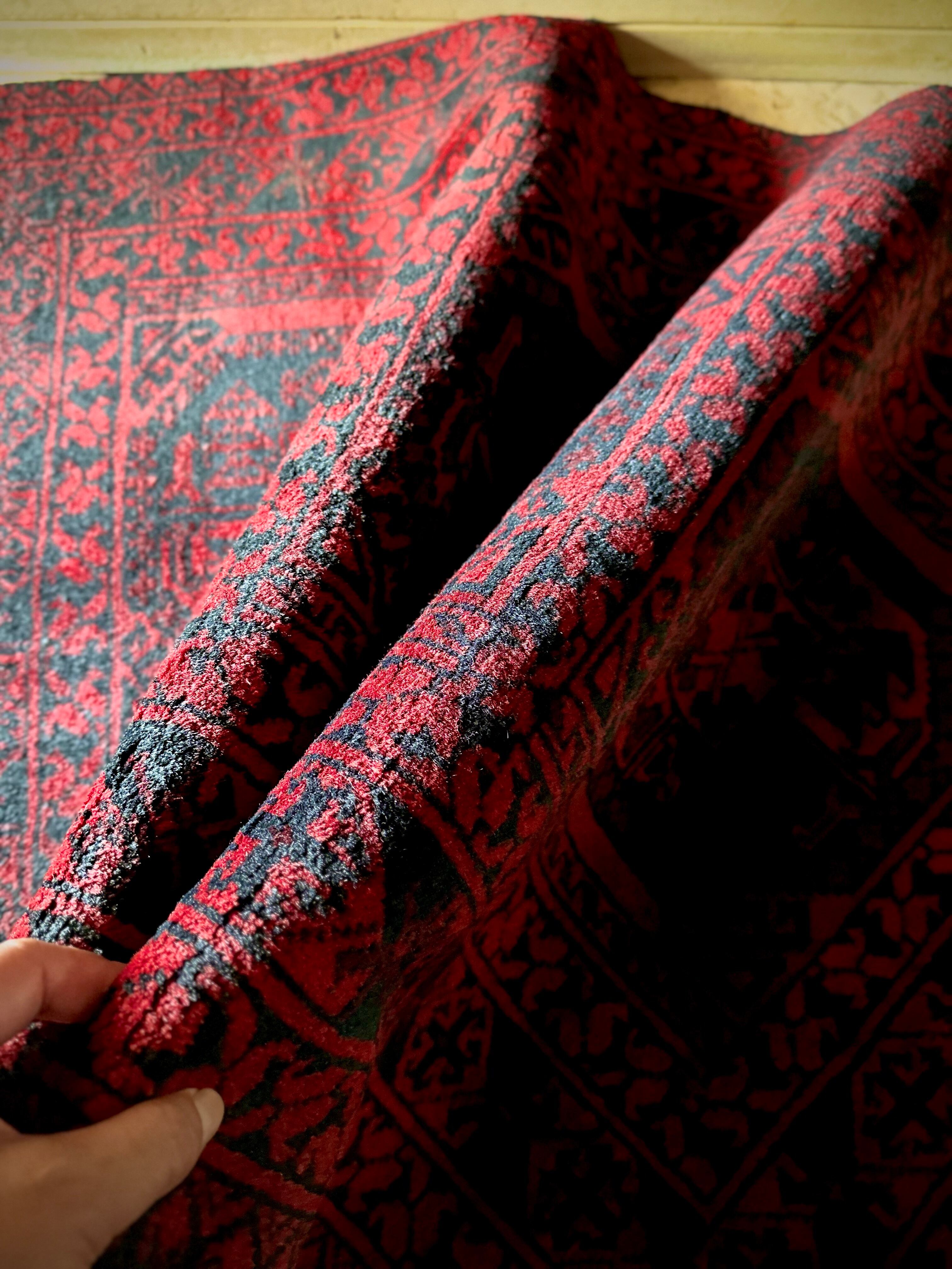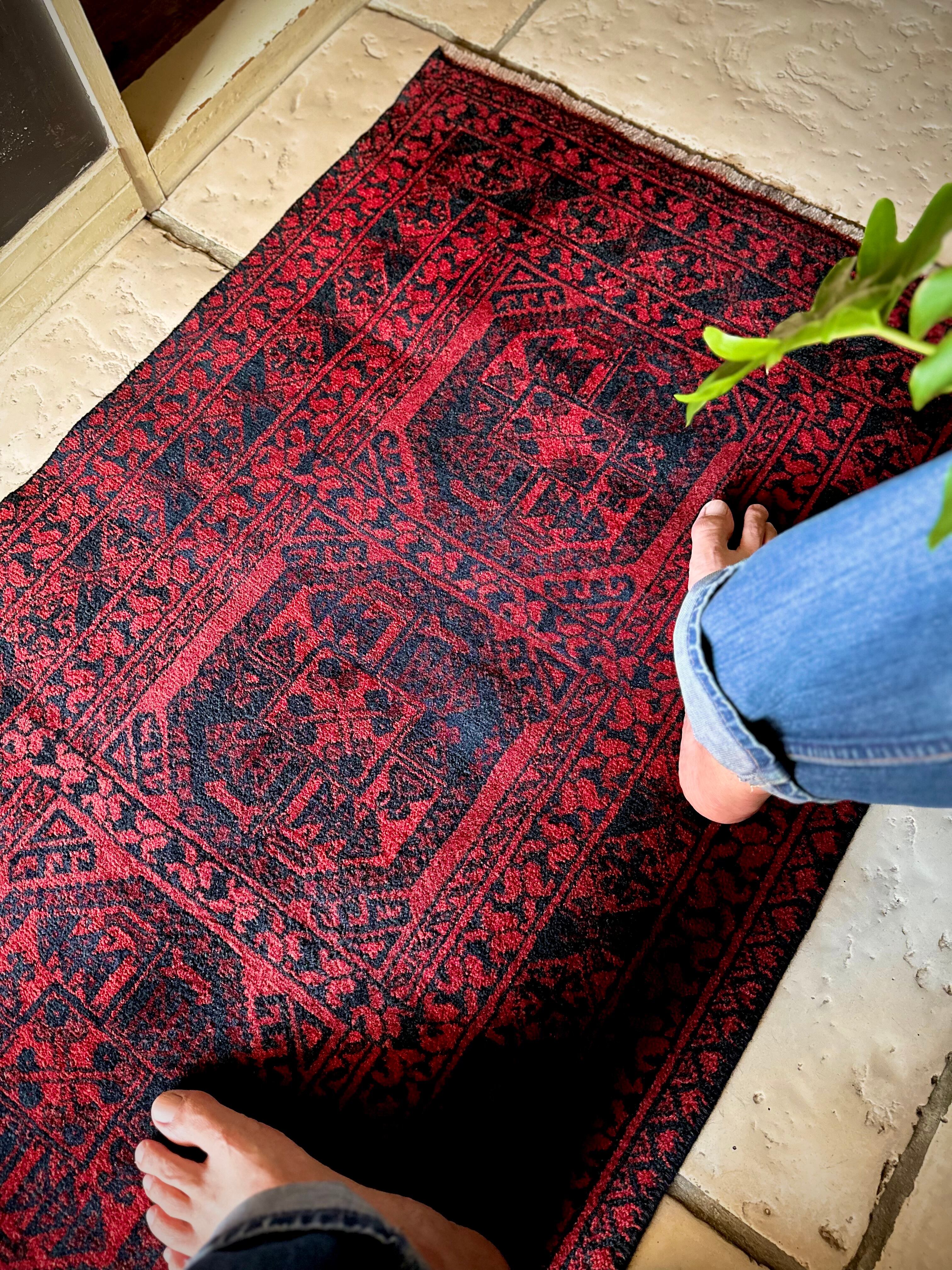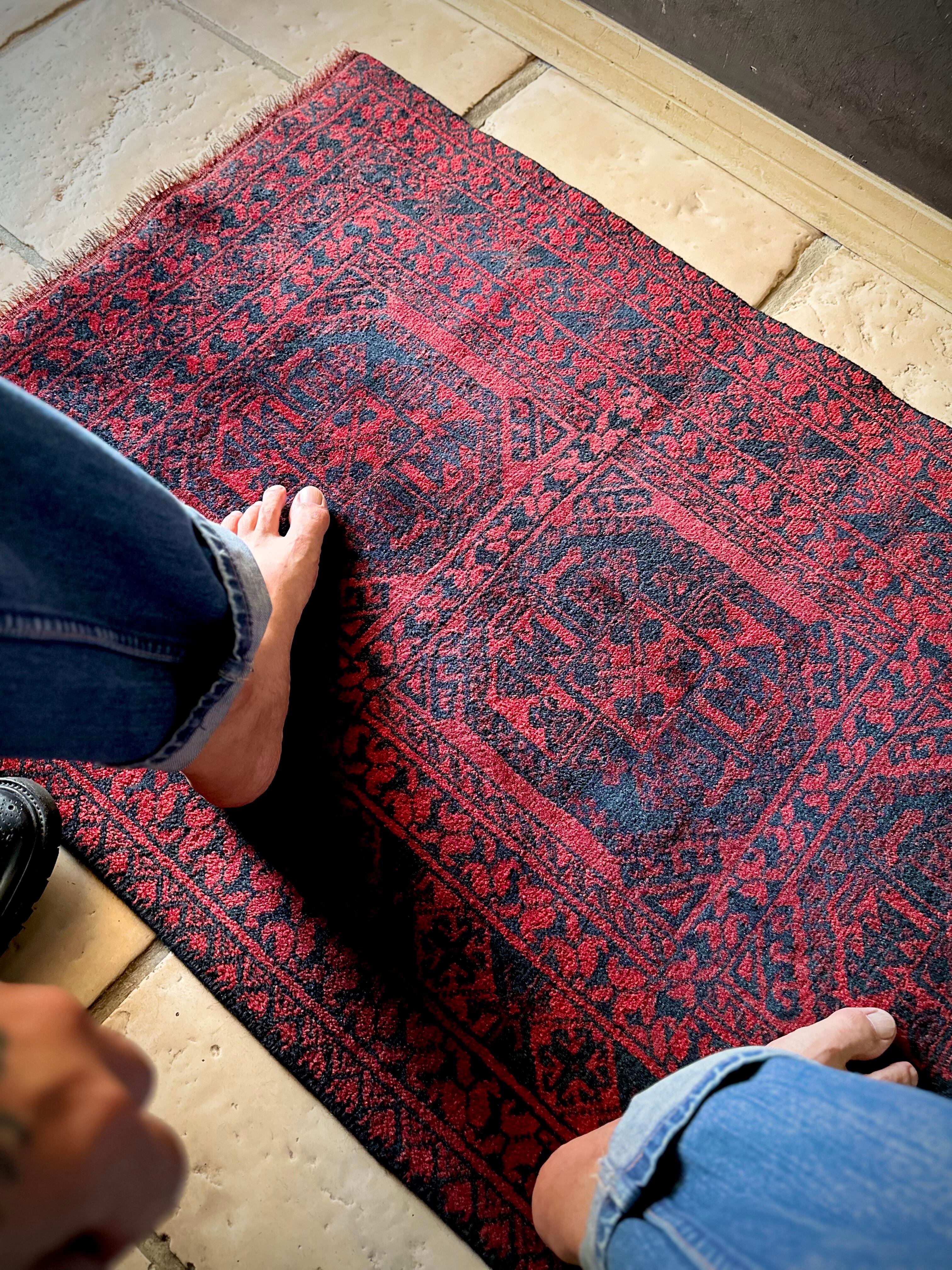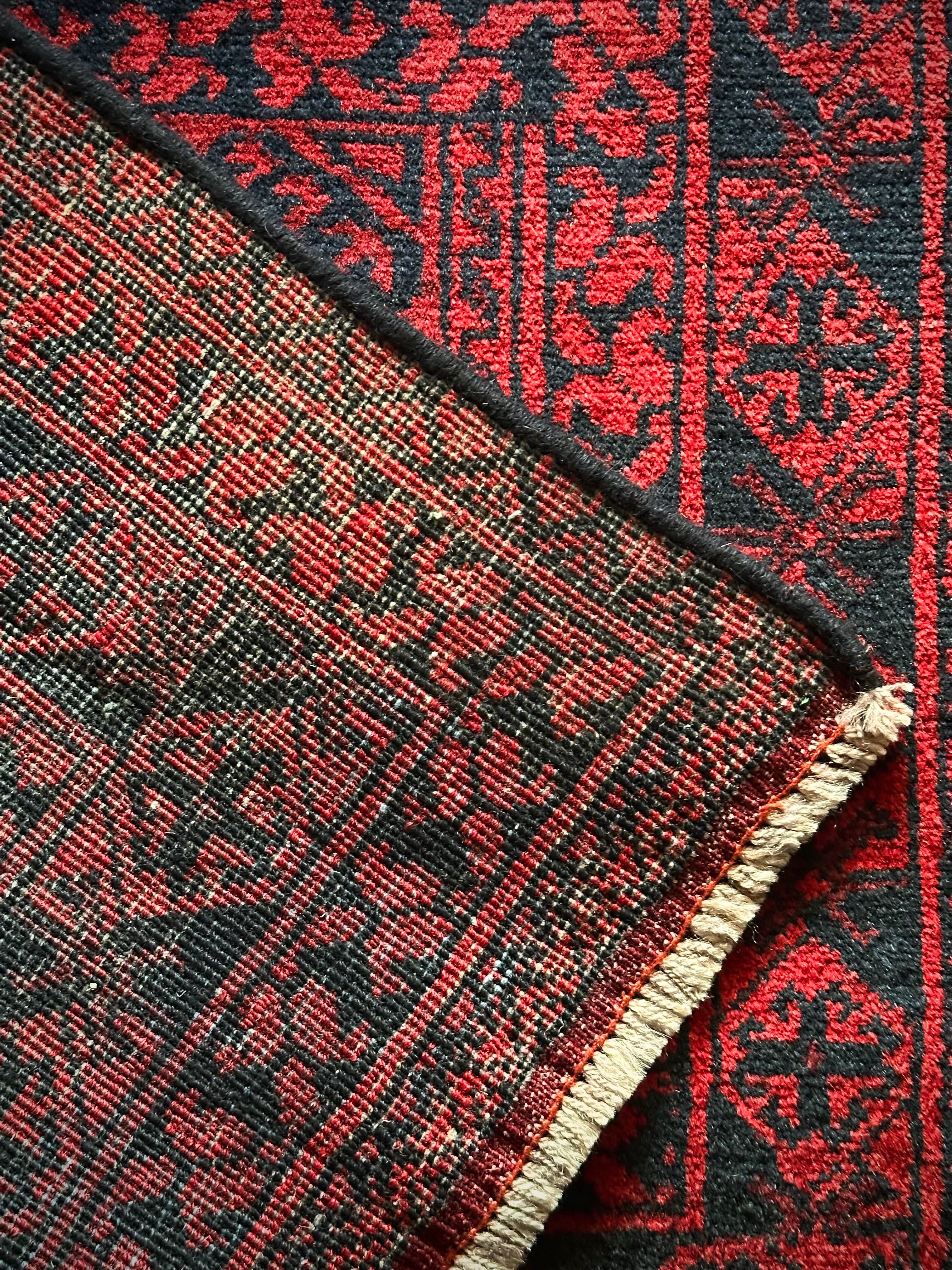 真っ赤なフィールドに象の足跡と呼ばれるフィルパイ紋様のスレイマンギュルがかっこいいこちらは、アフガニスタン北部に居住するトルクメンの支族であるエルサリ部族のトライバルラグになります。
