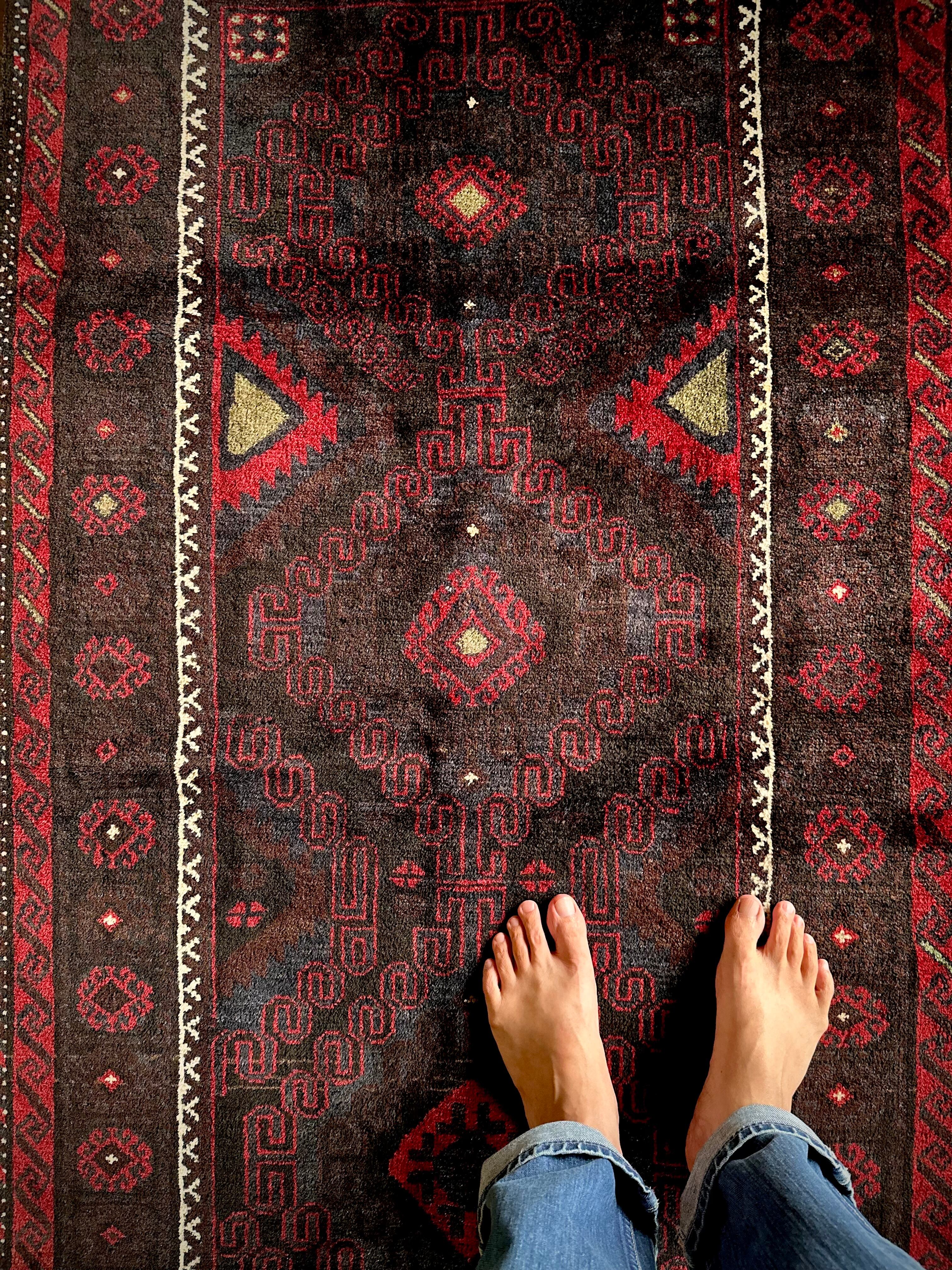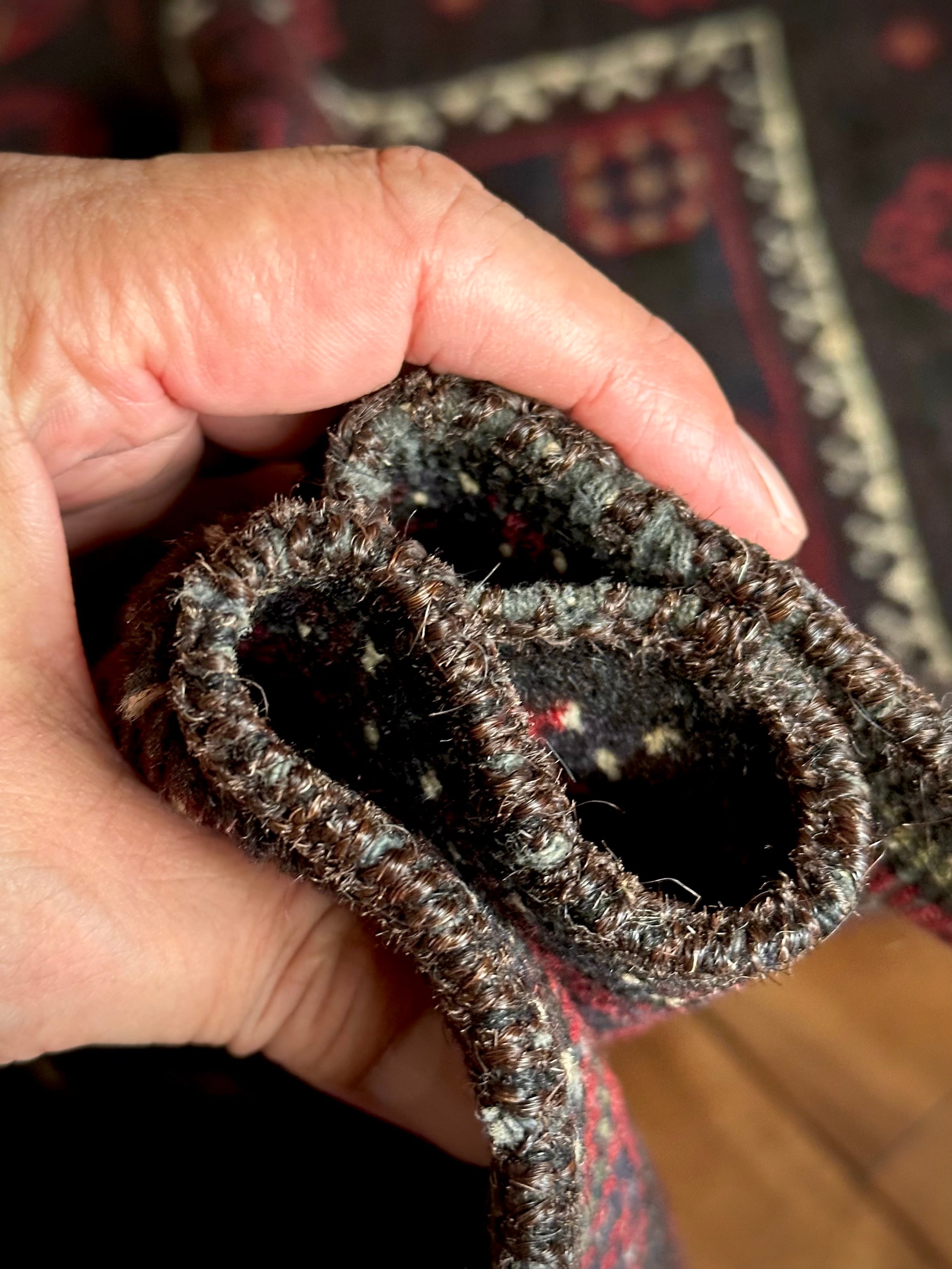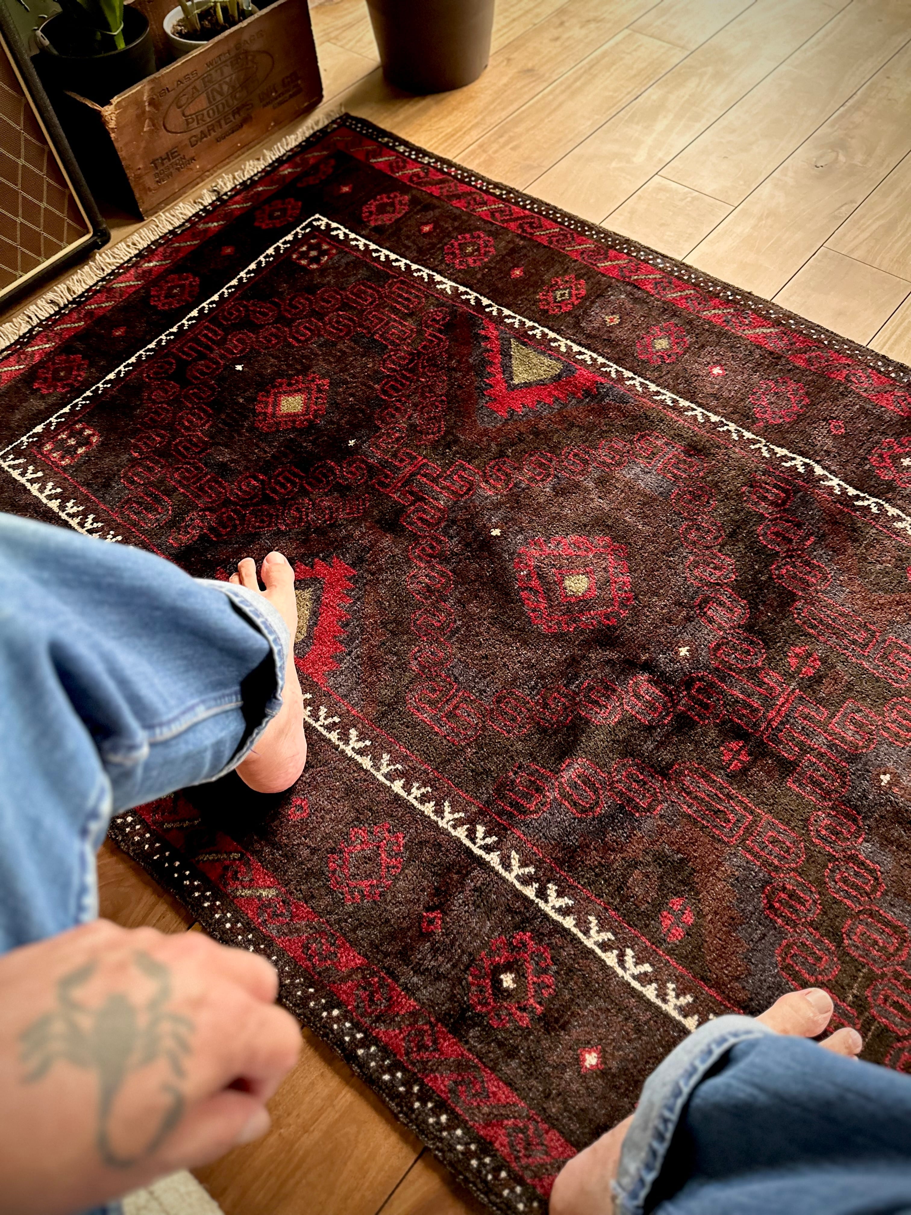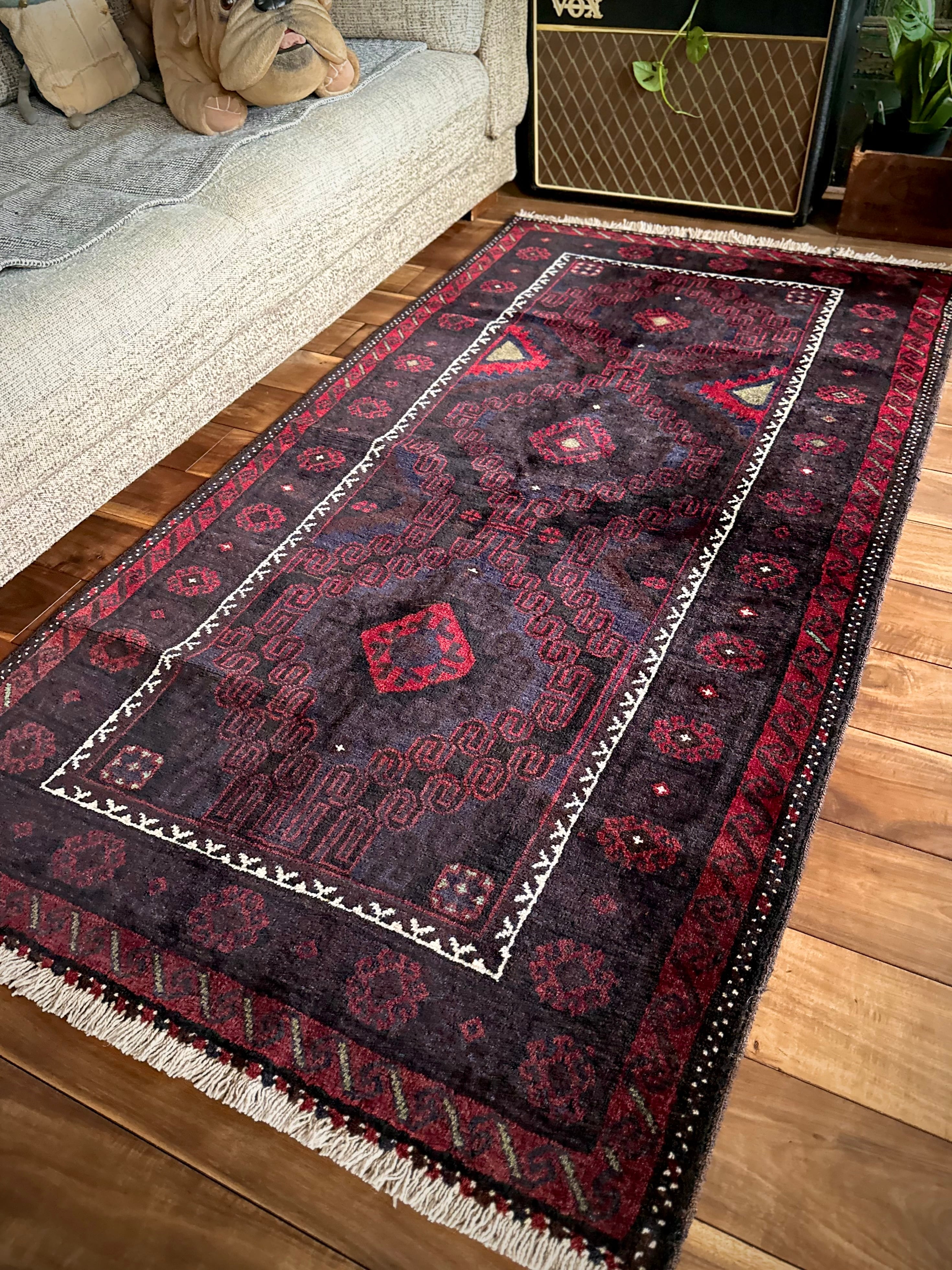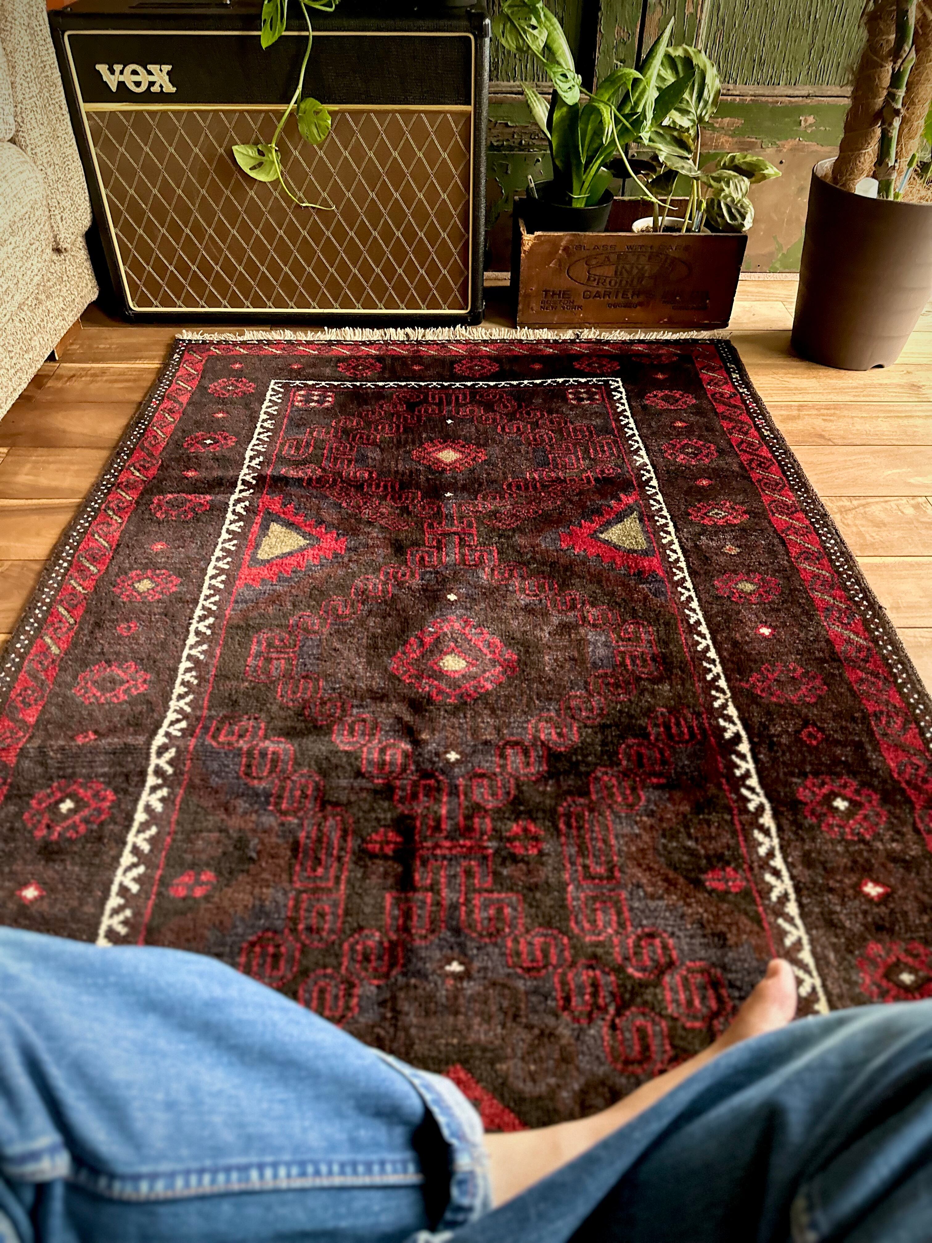 経年としては50年のヴィンテージラグとなり艶の出やすい色合いなのはご覧の通りで、それほどの使用感はなく目立つ汚れやダメージにリペア箇所は見当たらないグッドなコンディションに、アフガンバルーチならではのソフトな質感が最高です。