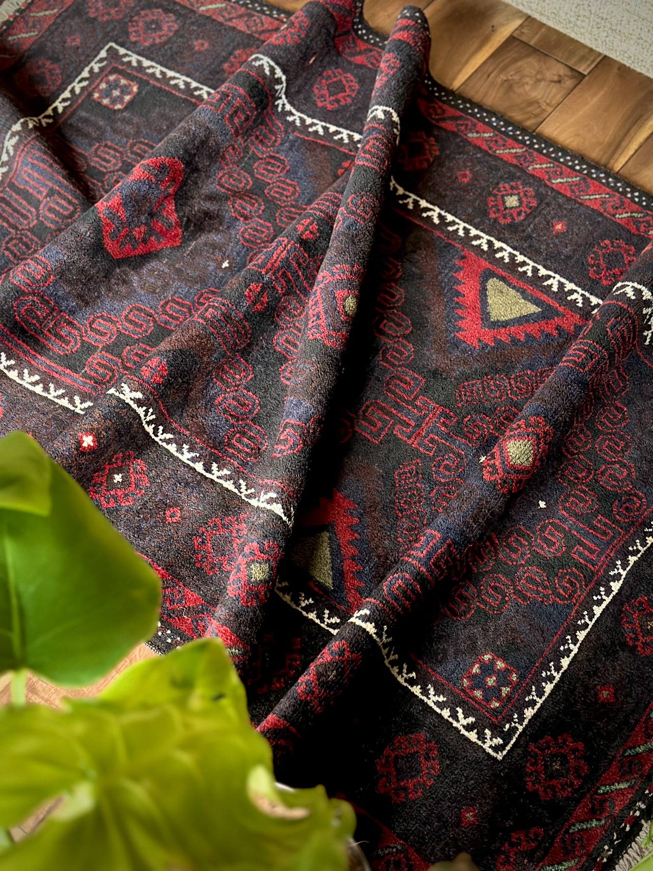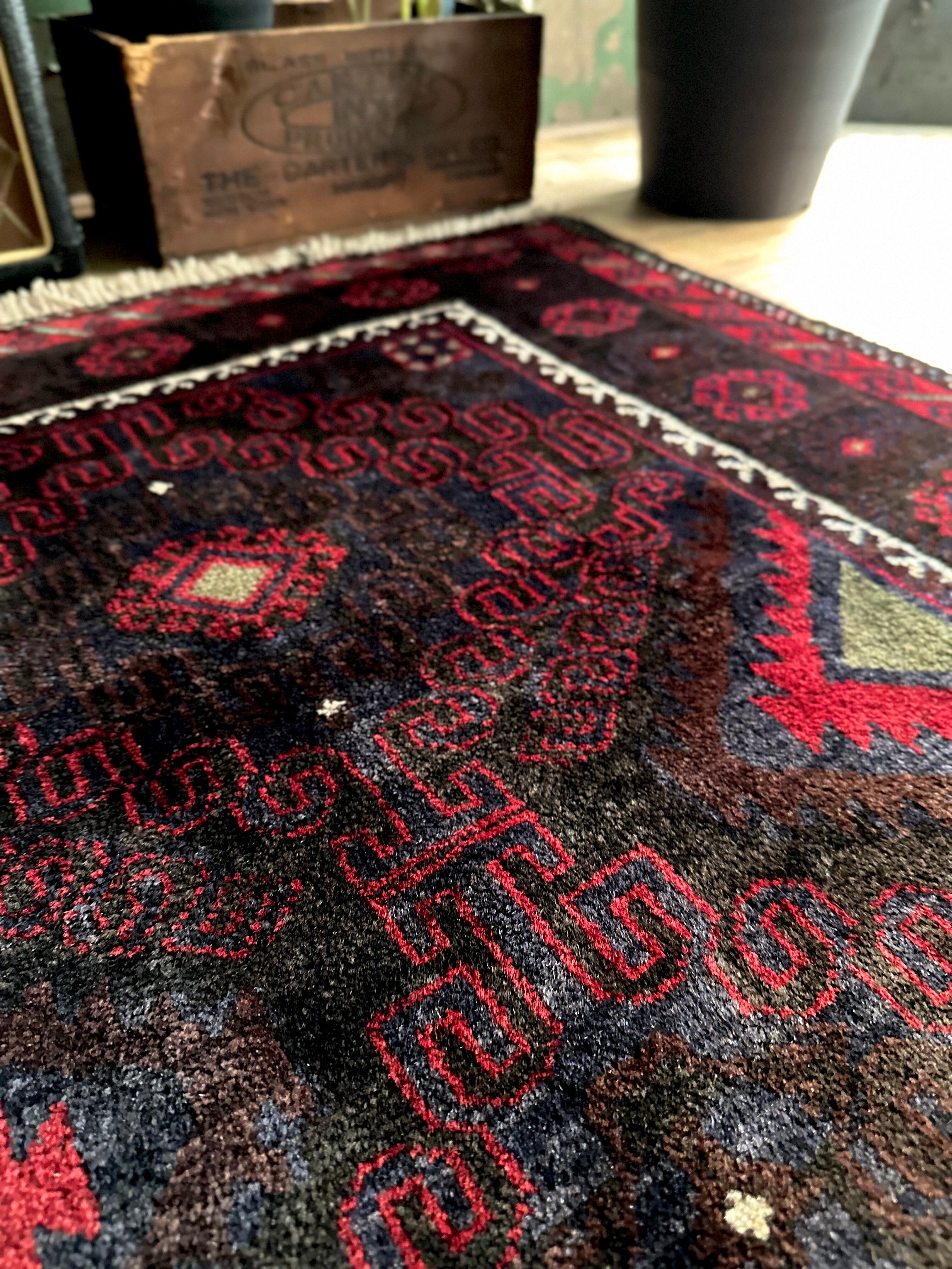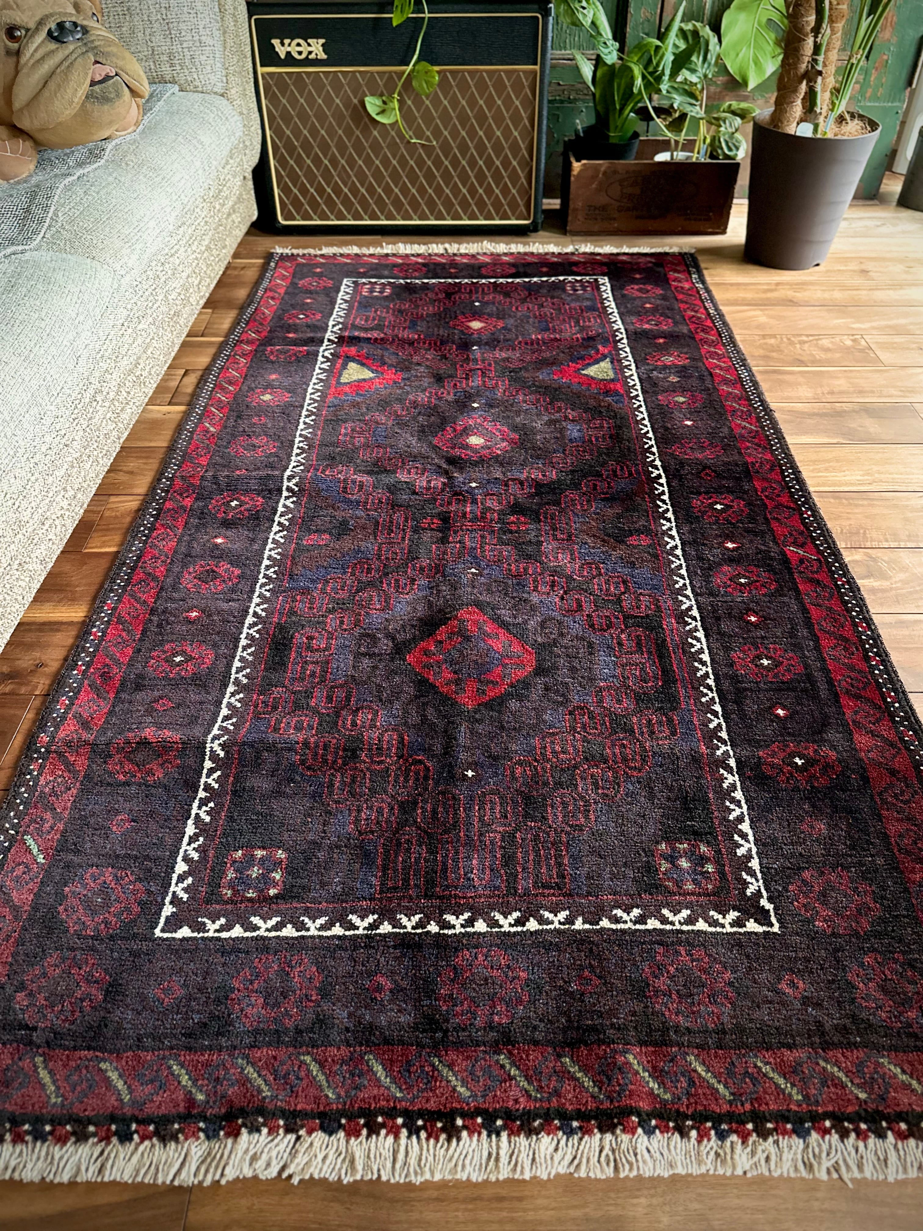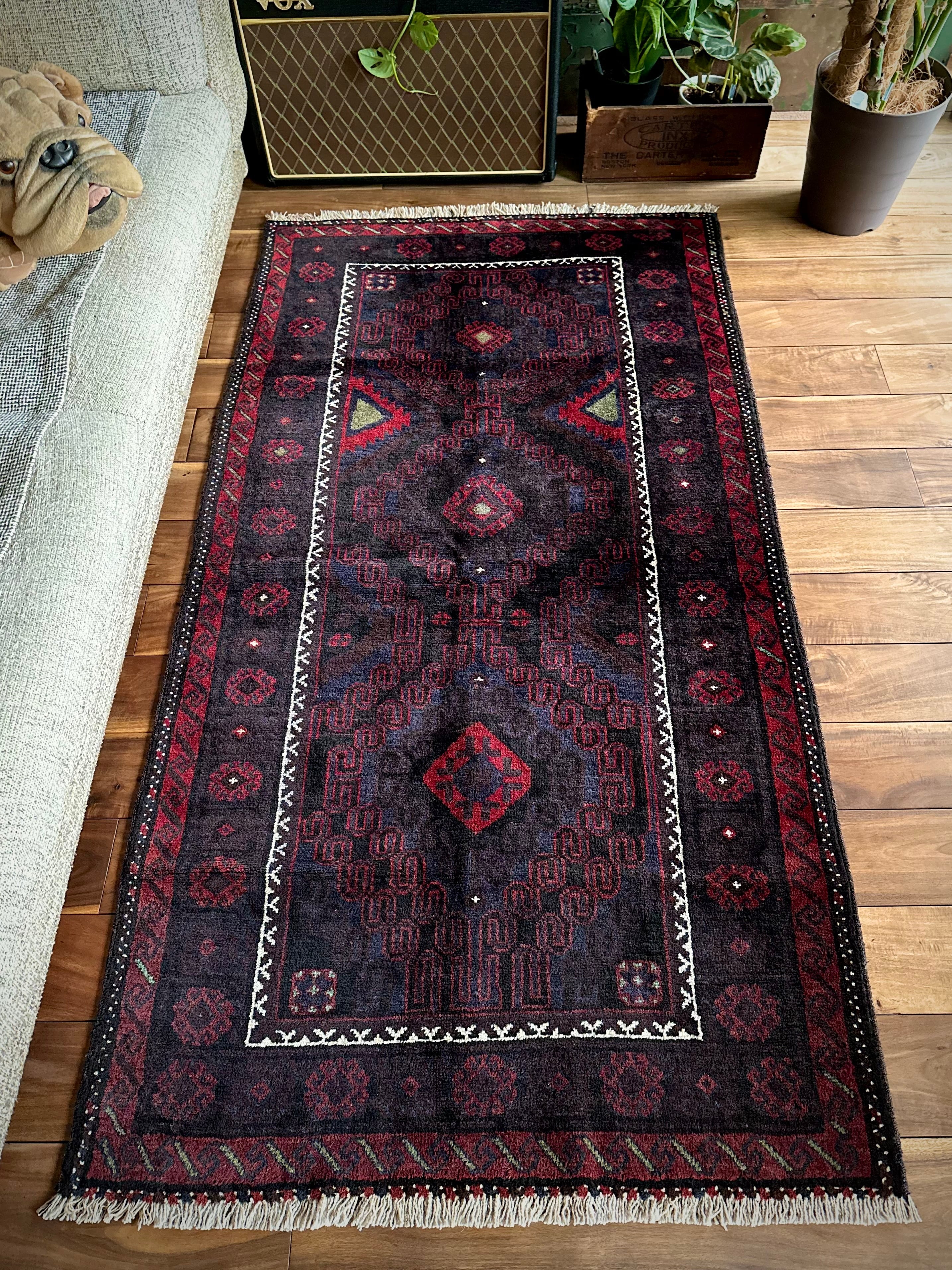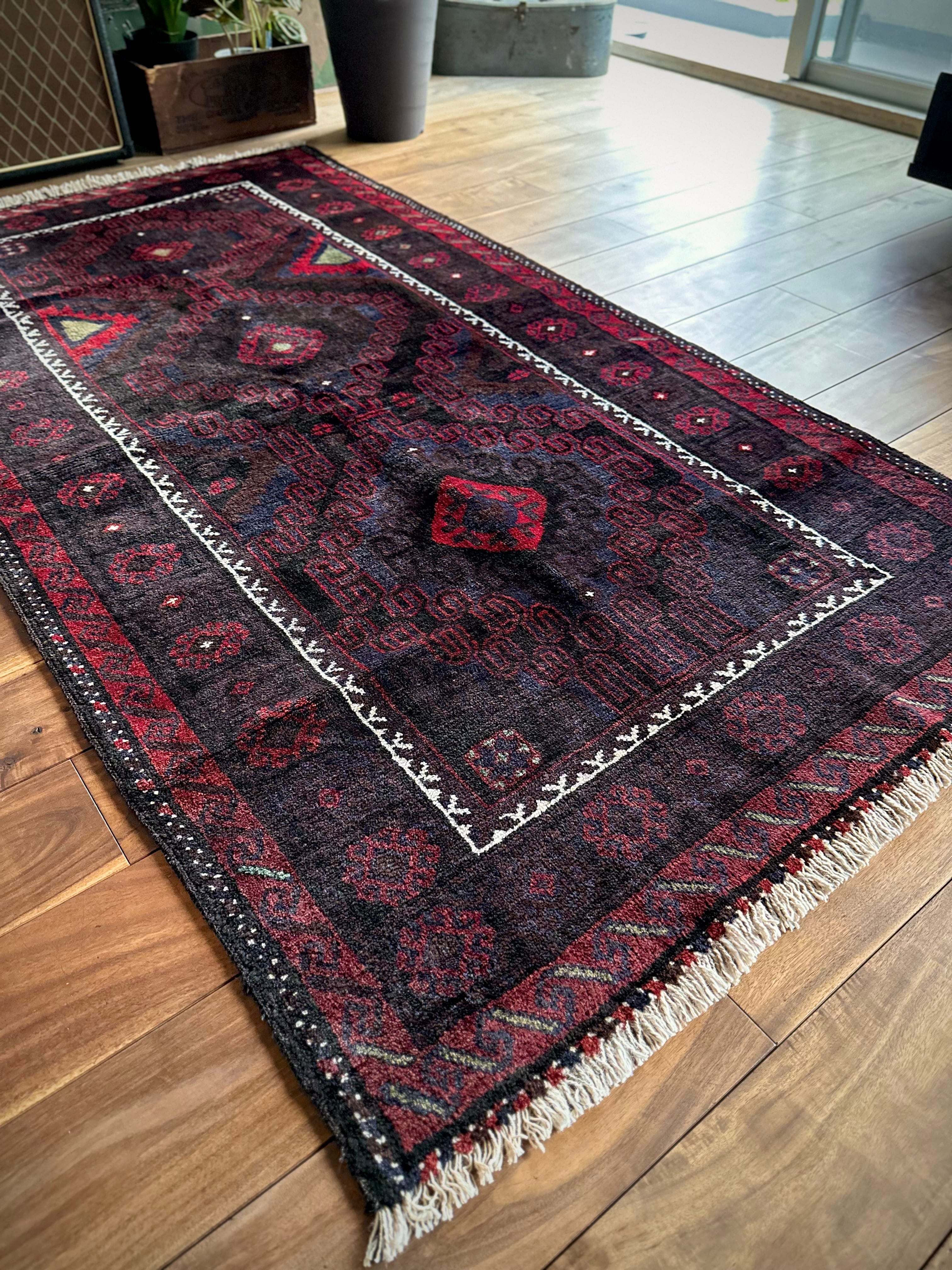 ブラックをベースにネイビーとレッドで刻まれた独特な紋様がかっこいいこちらは、アフガニスタンはヘラート州に居住するバルーチ族のトライバルラグで、フィールドに描かれた水の波紋を表現した柄がアフガンバルーチらしい渋味を醸し出しています。