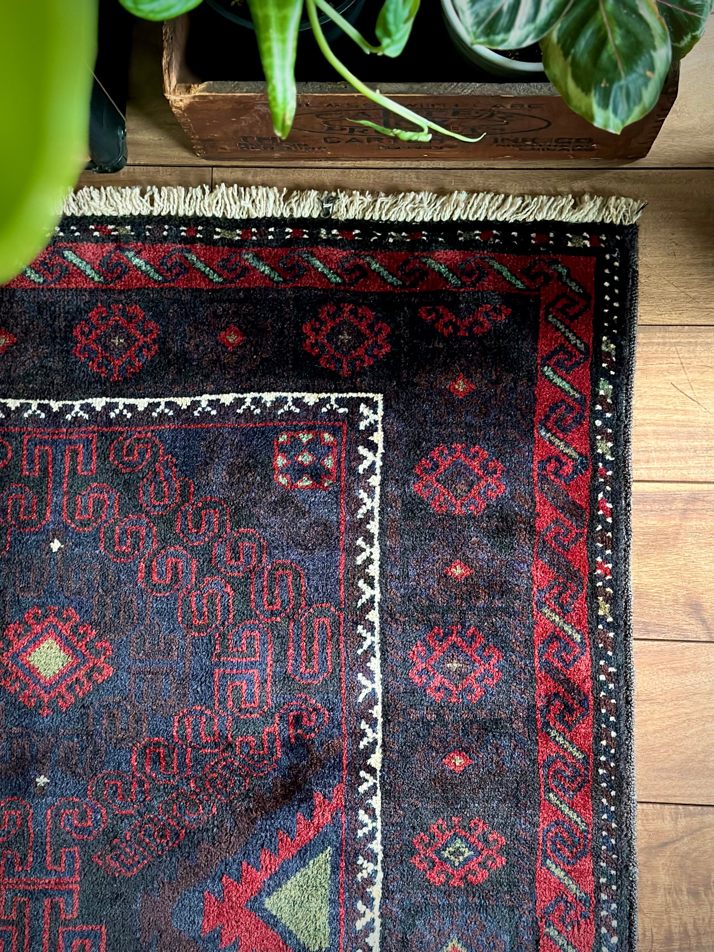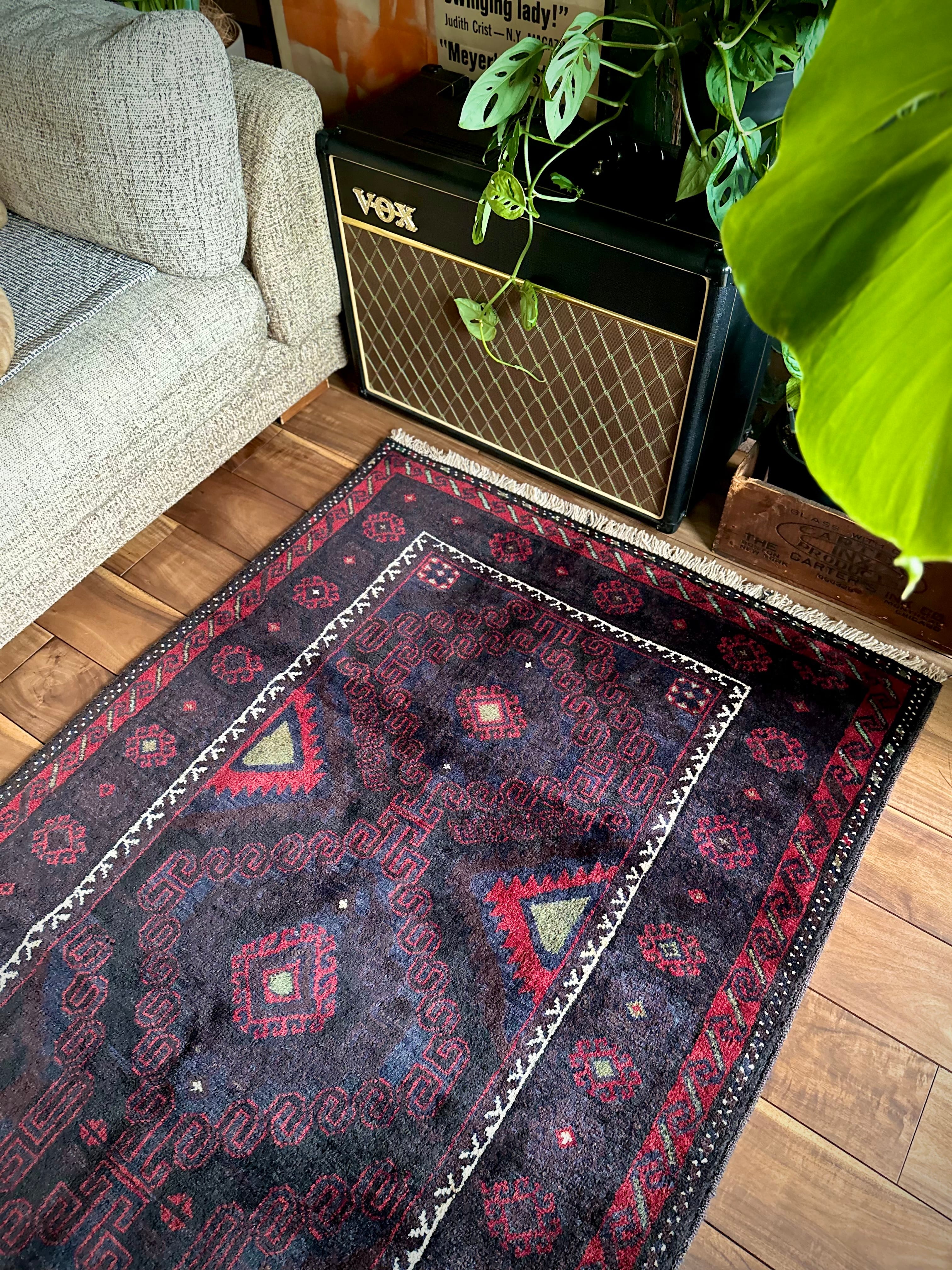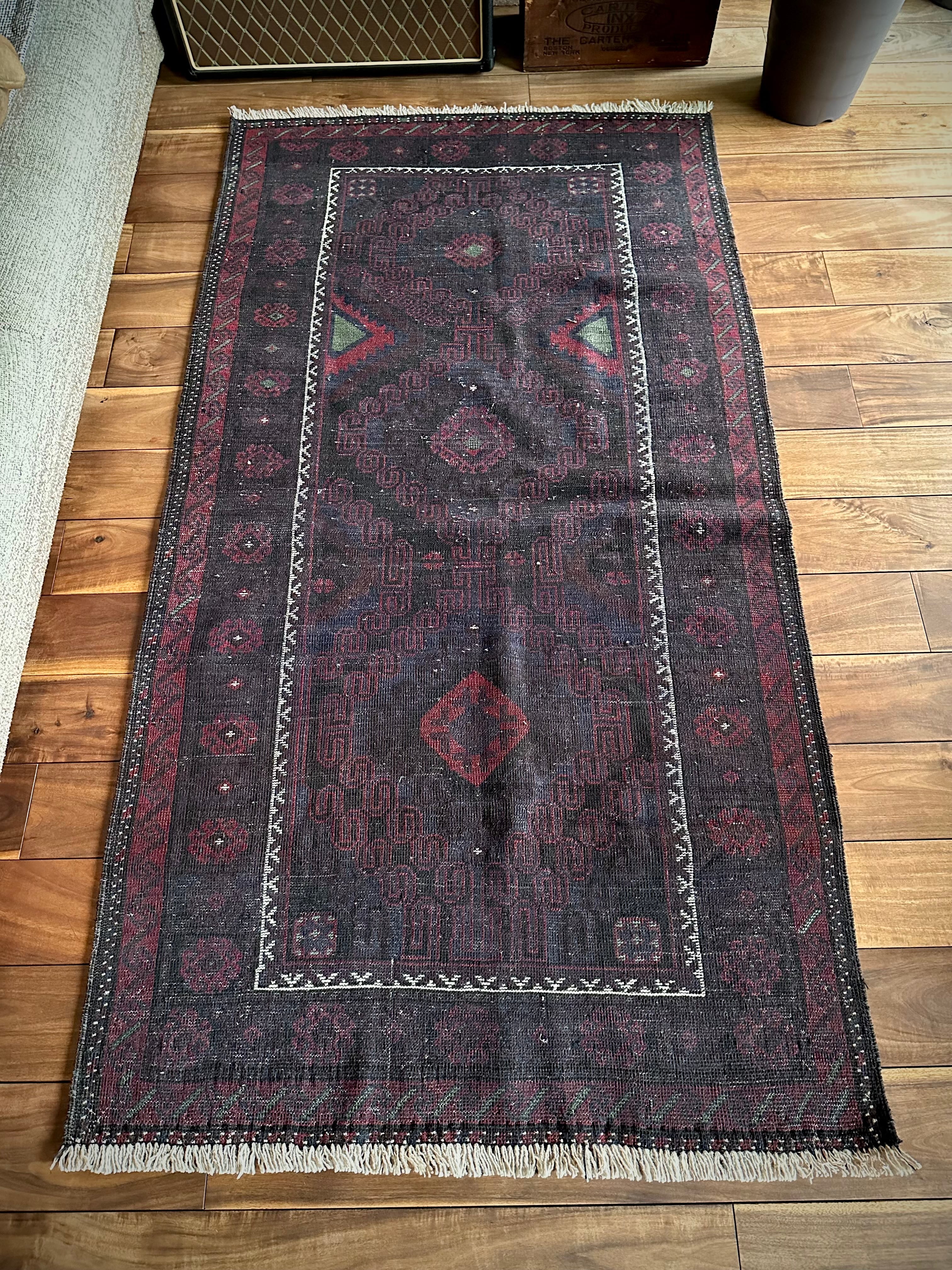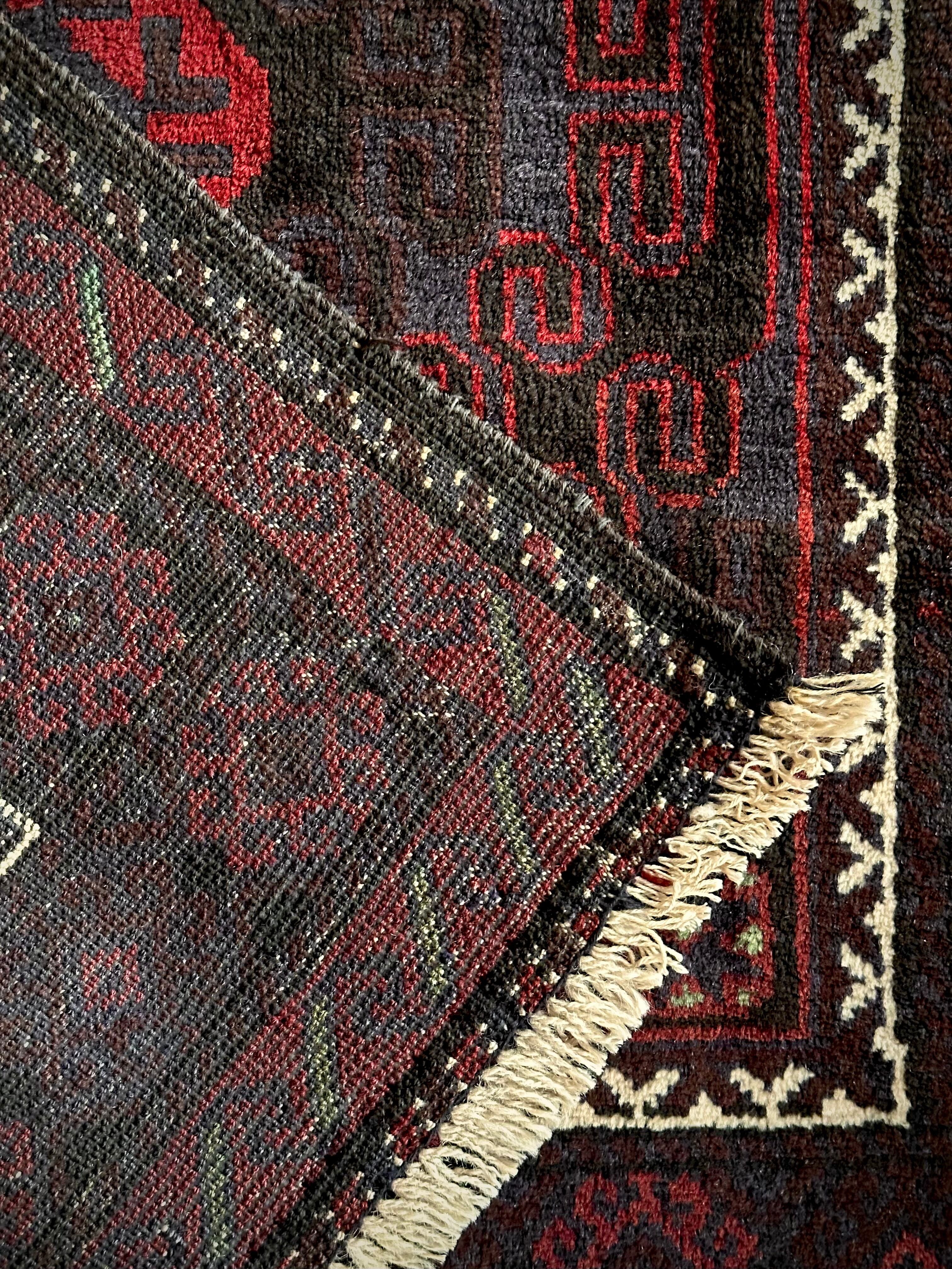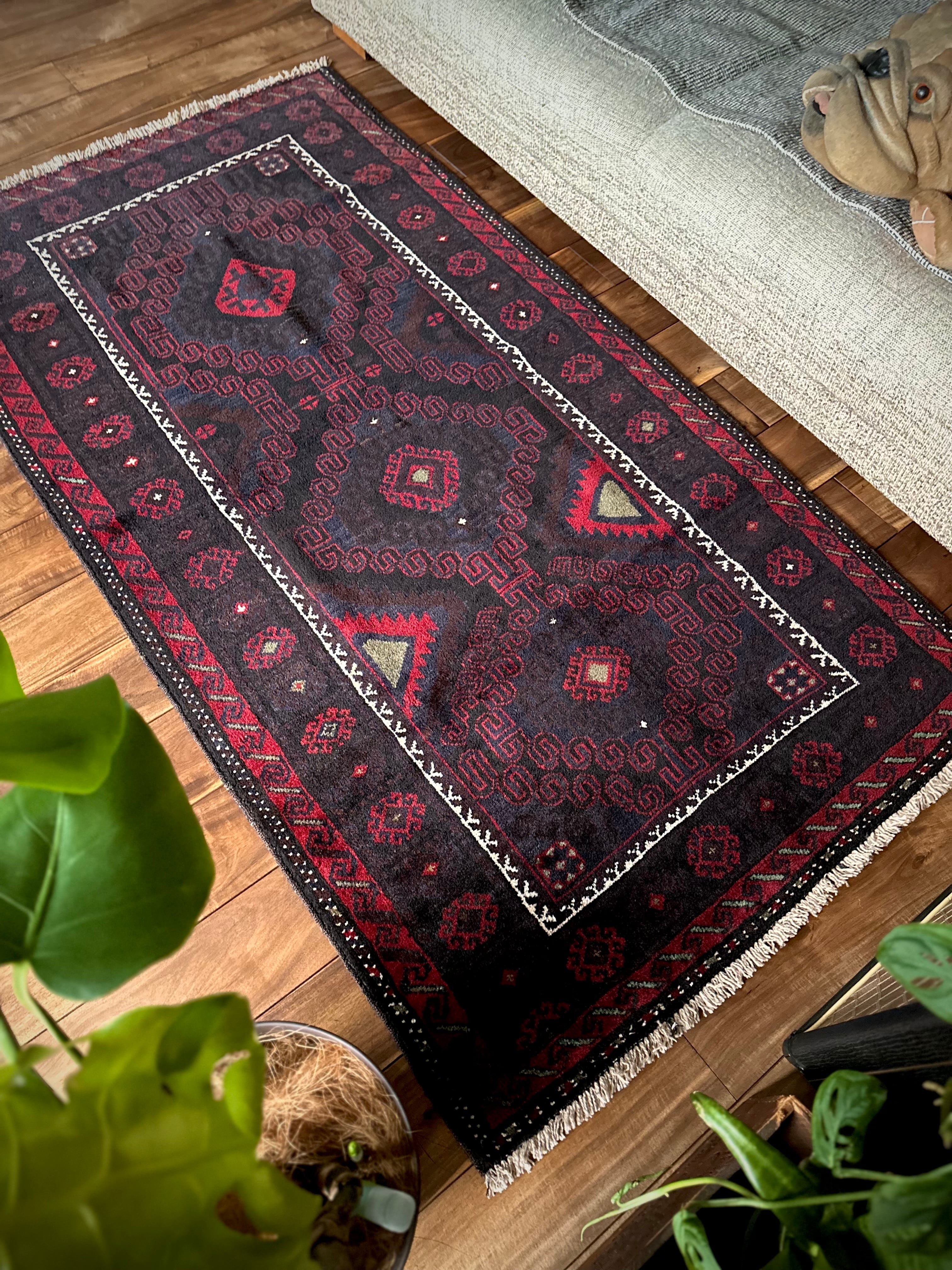 ブラックをベースにネイビーとレッドで刻まれた独特な紋様がかっこいいこちらは、アフガニスタンはヘラート州に居住するバルーチ族のトライバルラグで、フィールドに描かれた水の波紋を表現した柄がアフガンバルーチらしい渋味を醸し出しています。