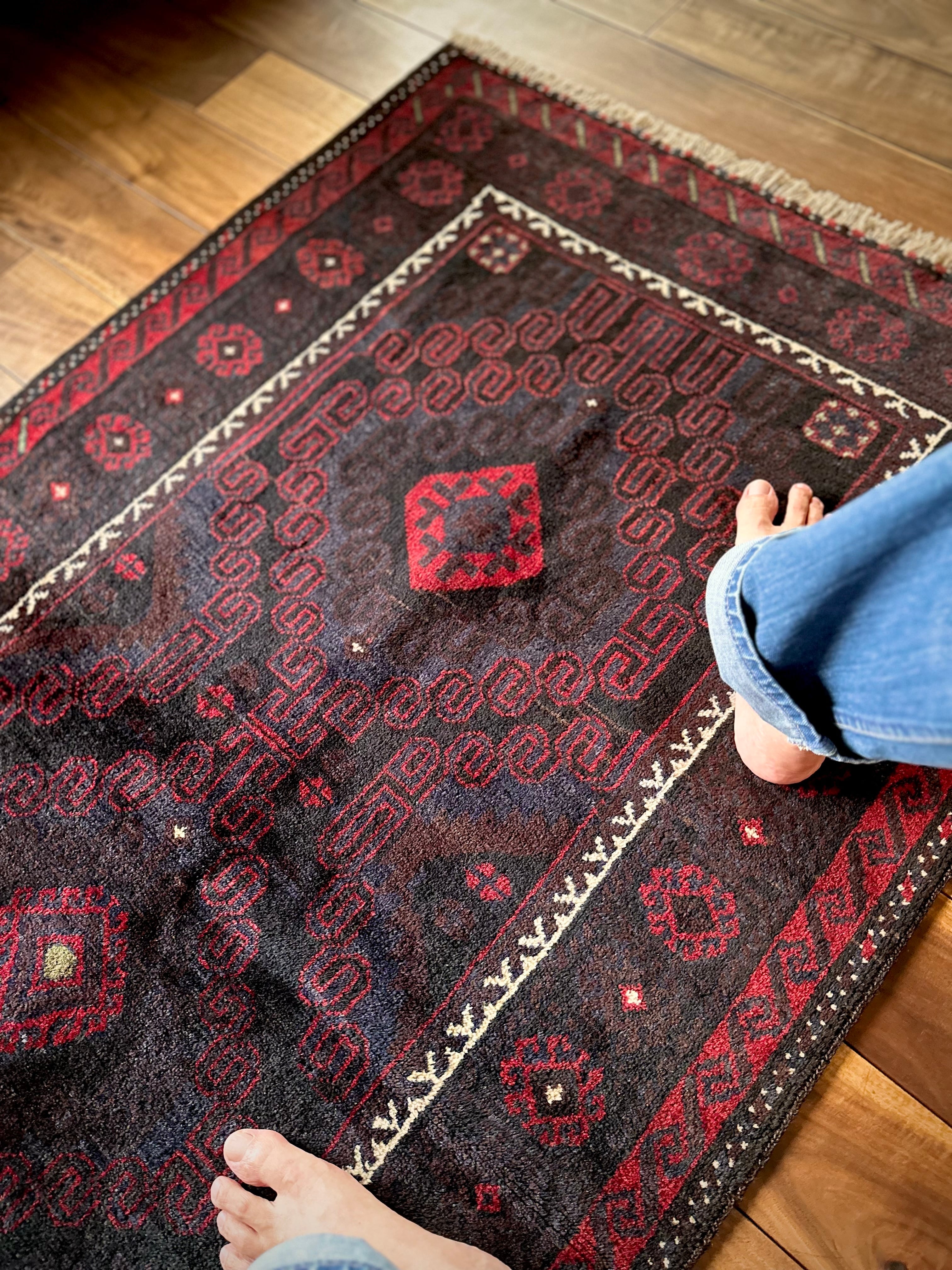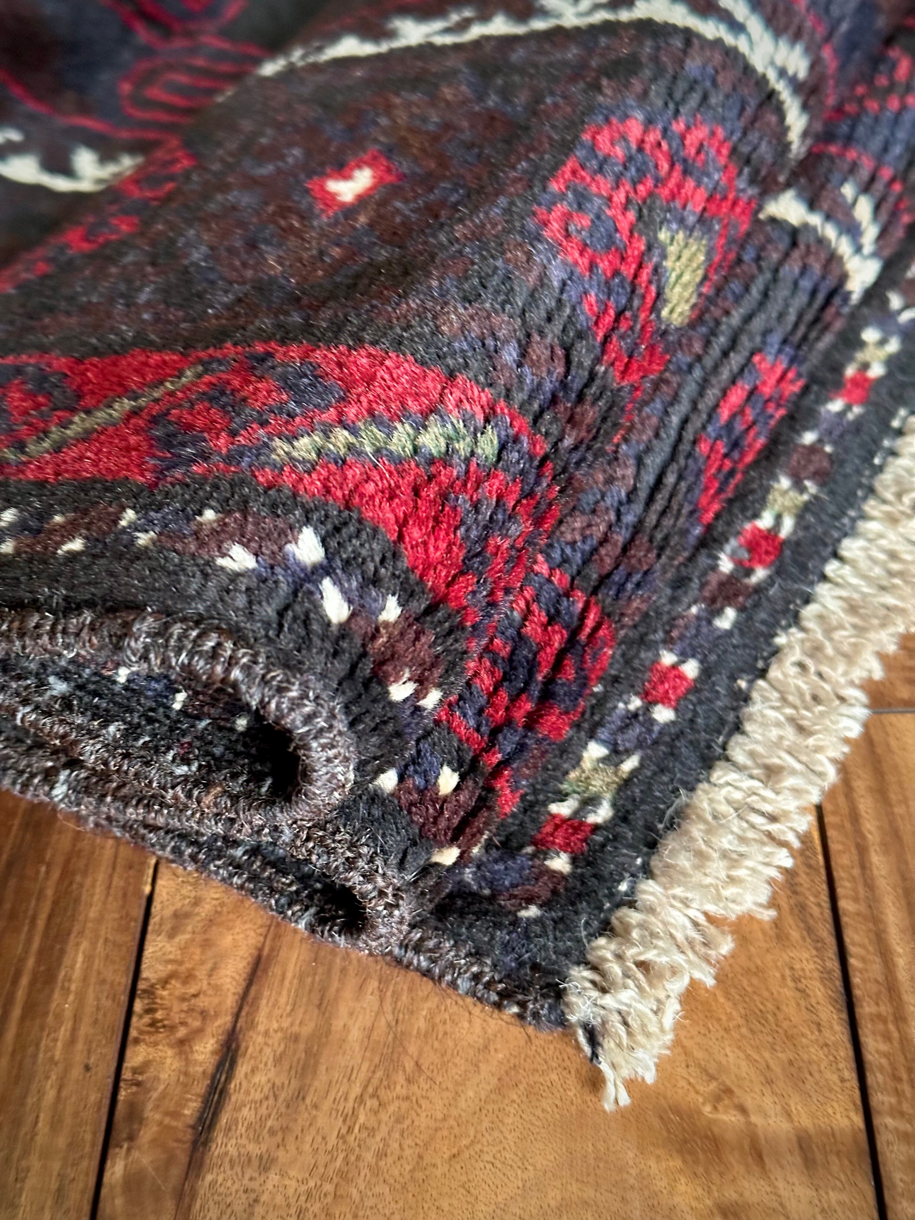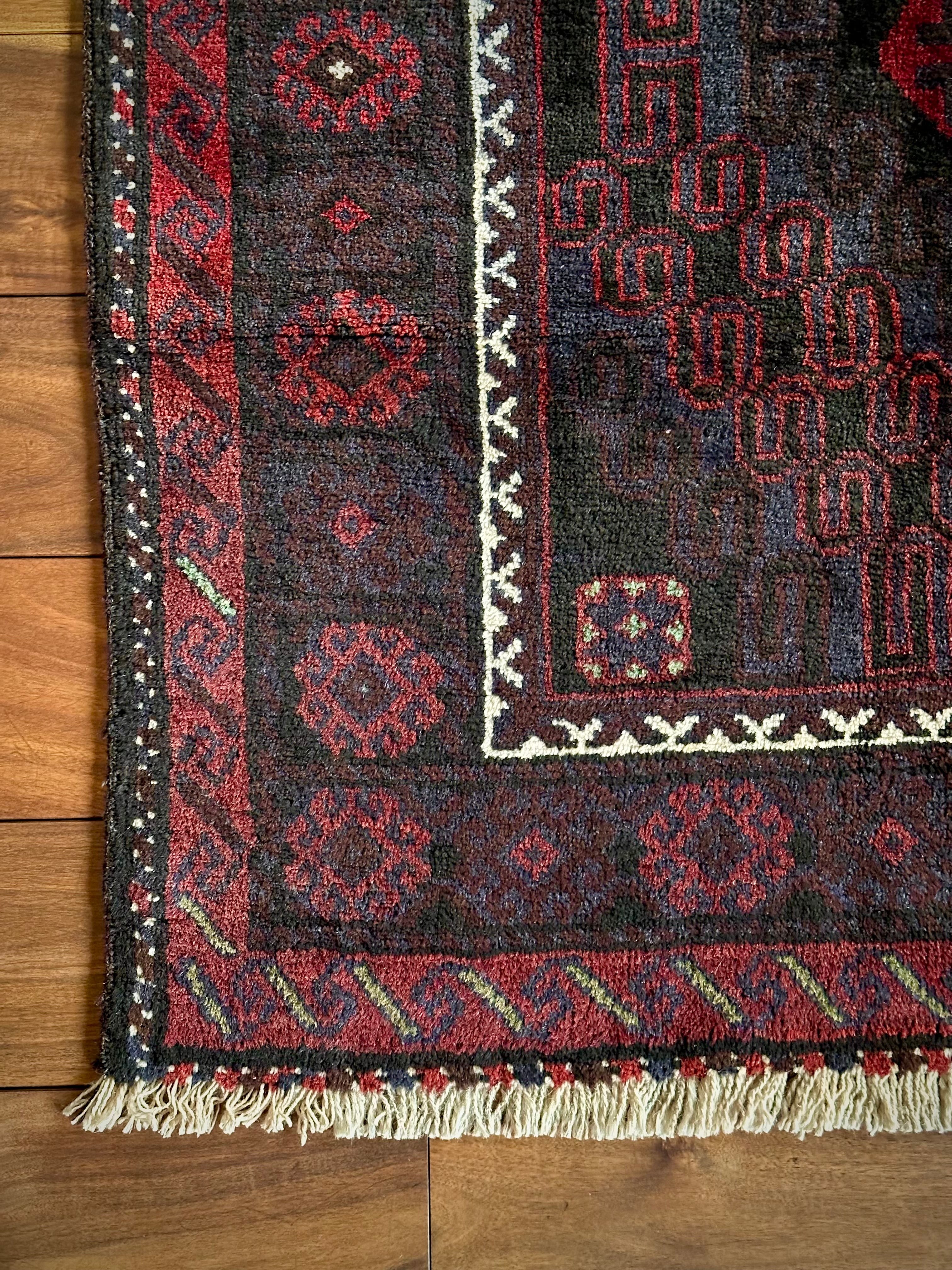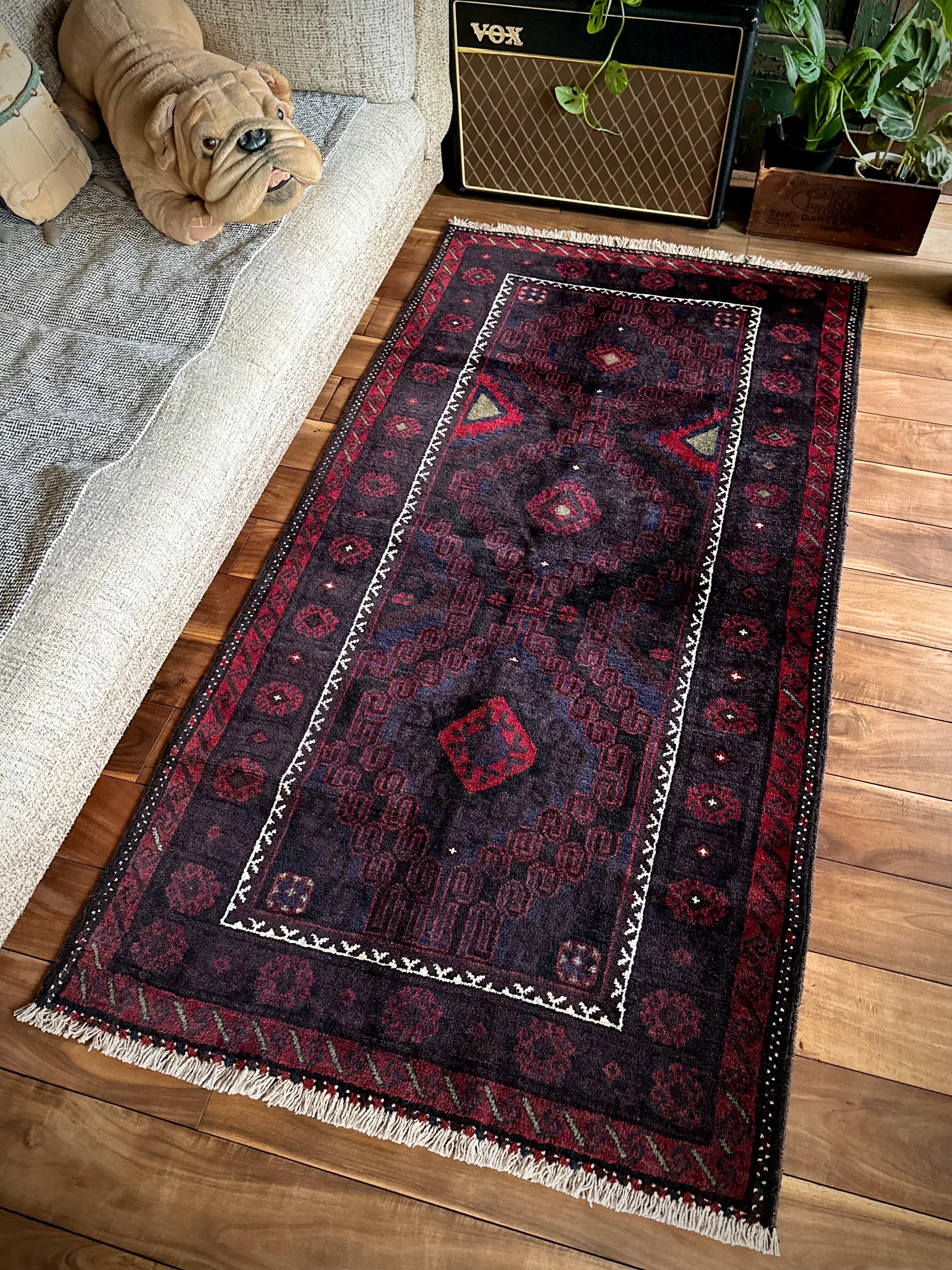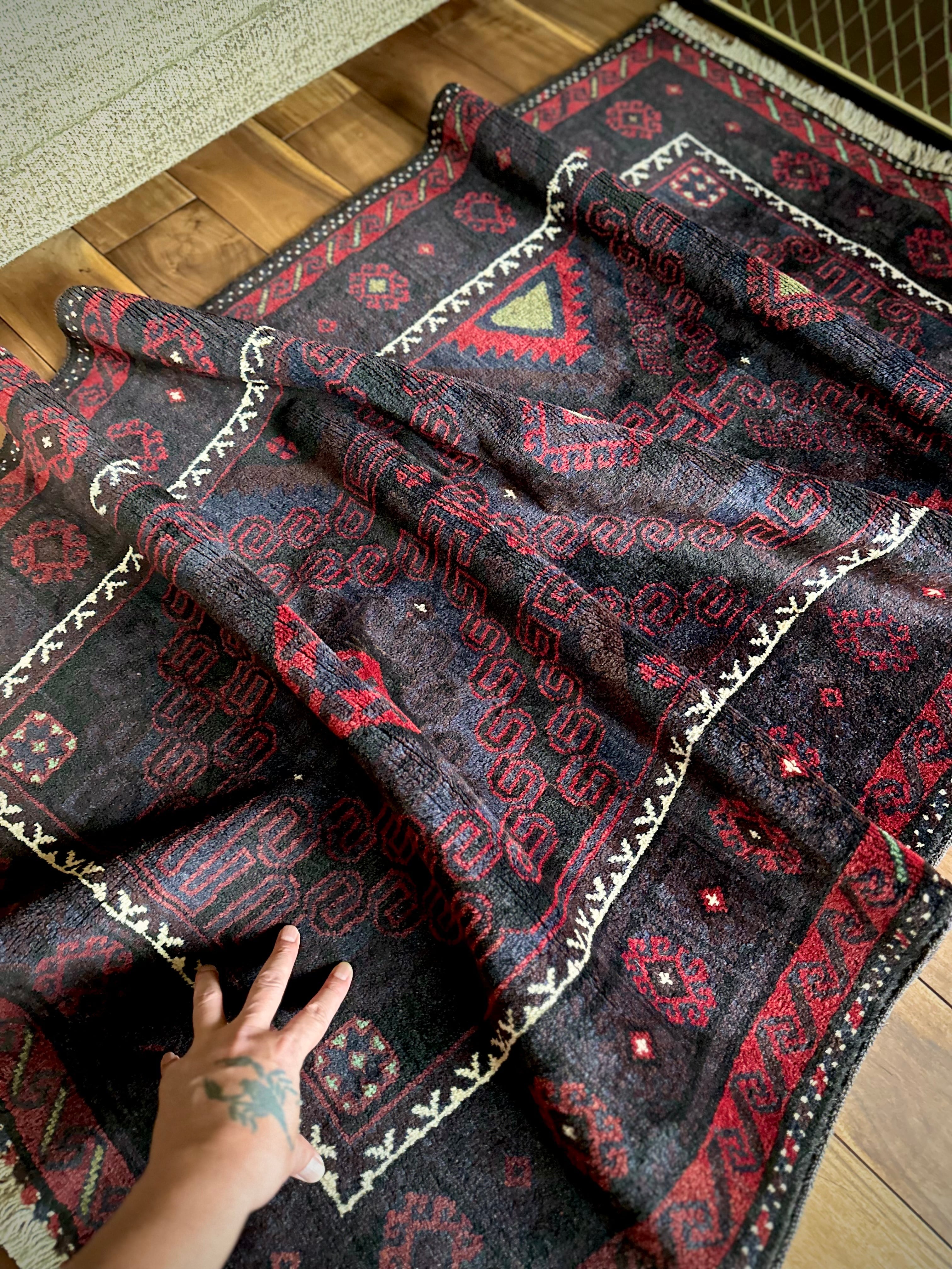 ブラックをベースにネイビーとレッドで刻まれた独特な紋様がかっこいいこちらは、アフガニスタンはヘラート州に居住するバルーチ族のトライバルラグで、フィールドに描かれた水の波紋を表現した柄がアフガンバルーチらしい渋味を醸し出しています。