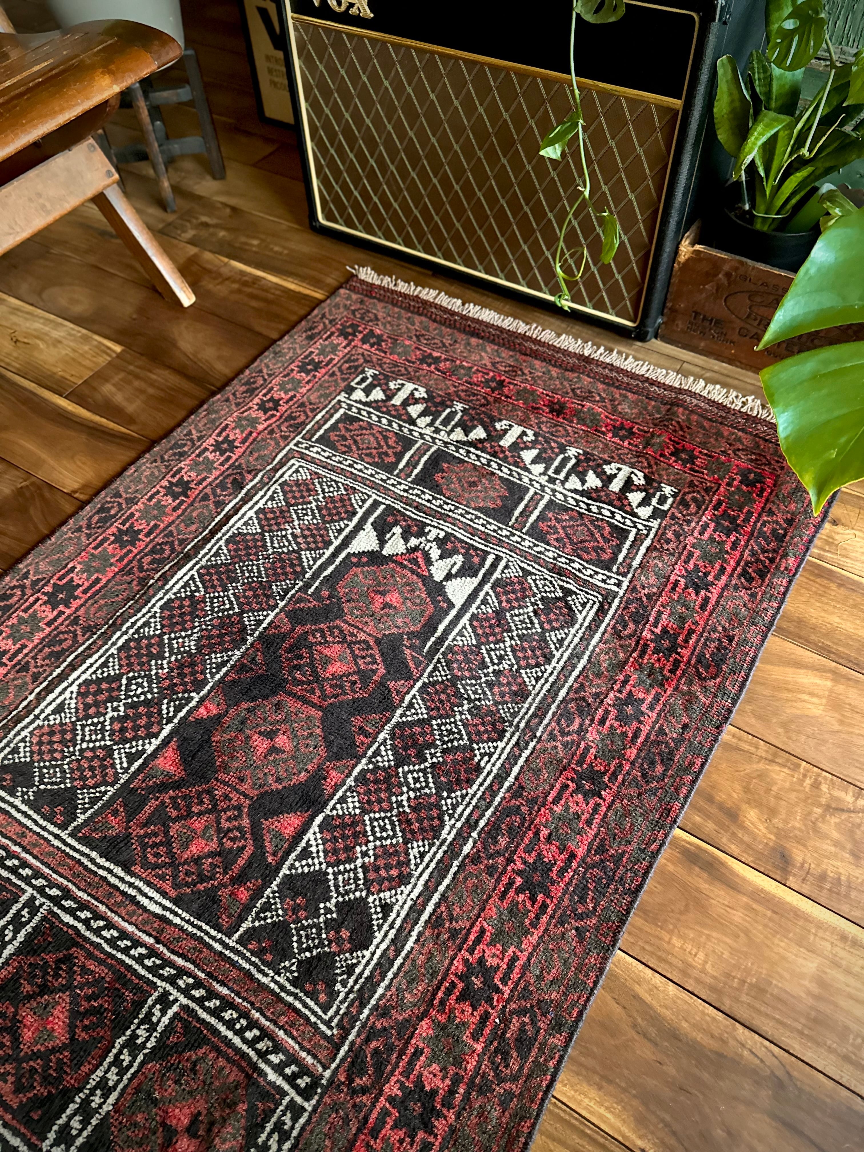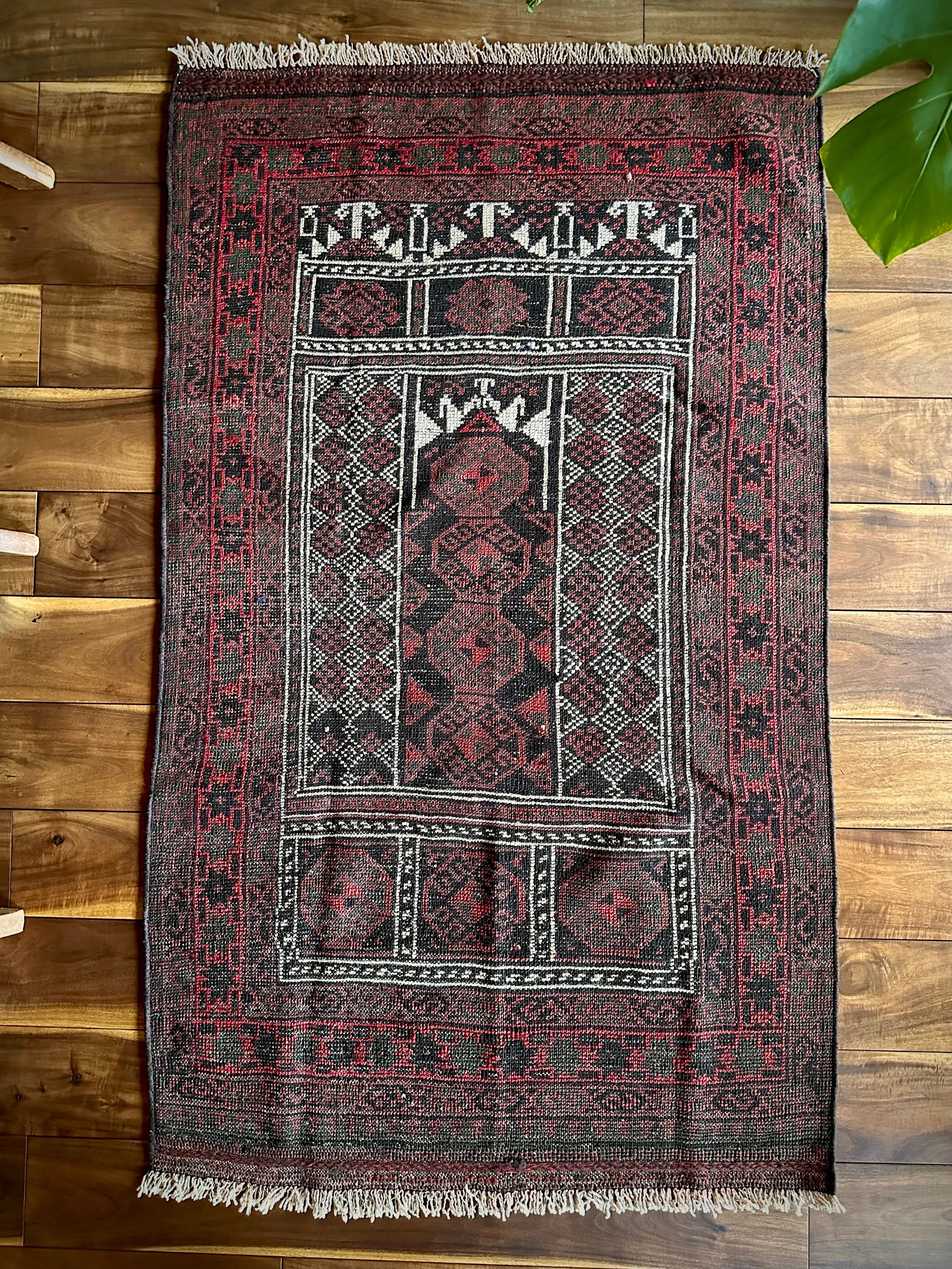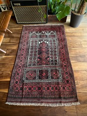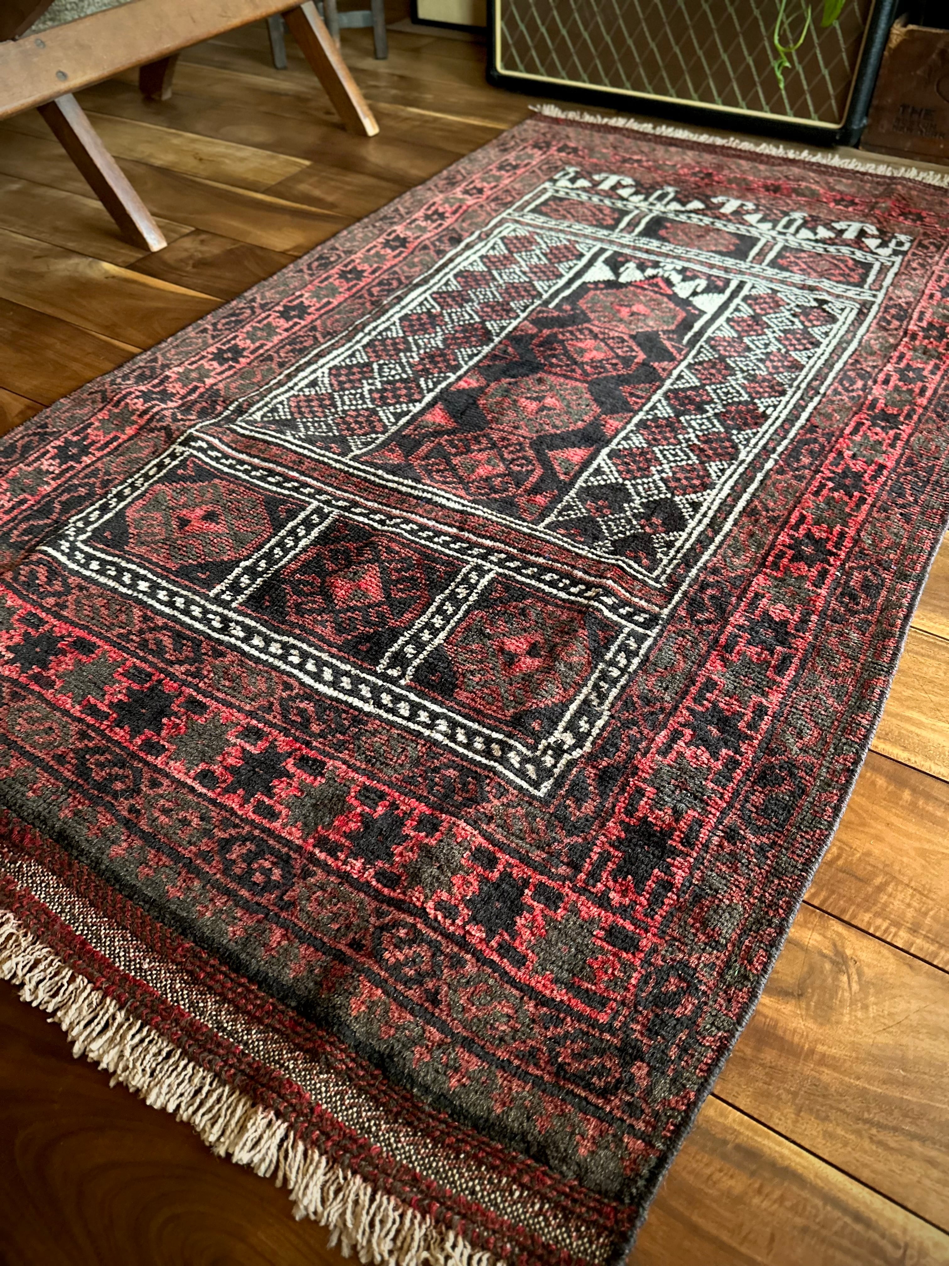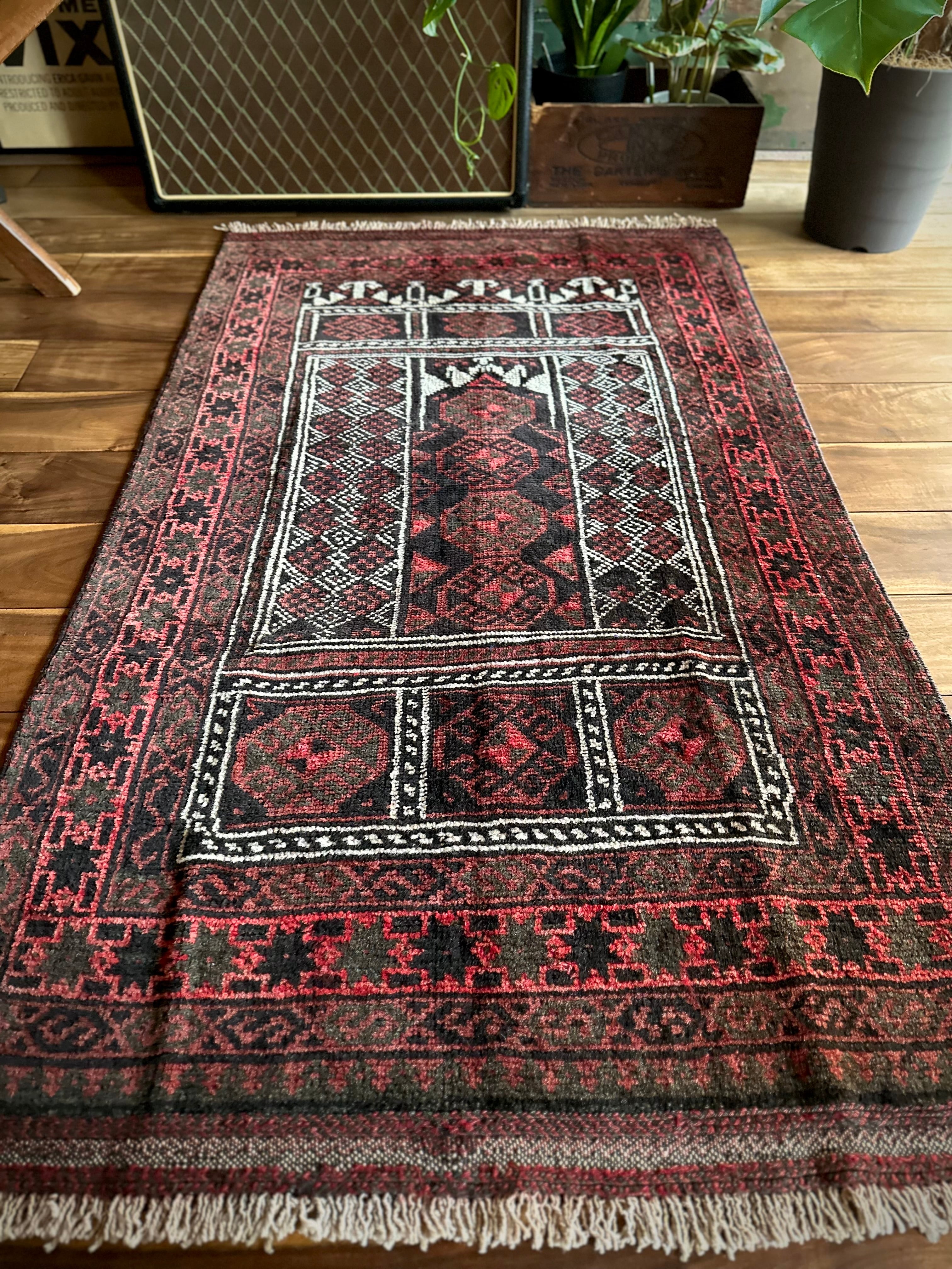 色褪せた赤をベースにブラックやグレーにバーガンディの渋い配色がかっこいいこちらは、アフガニスタンはヘラート州に居住するバルーチ族のトライバルラグで、祈りの際に用いられるプレイヤーラグになります。