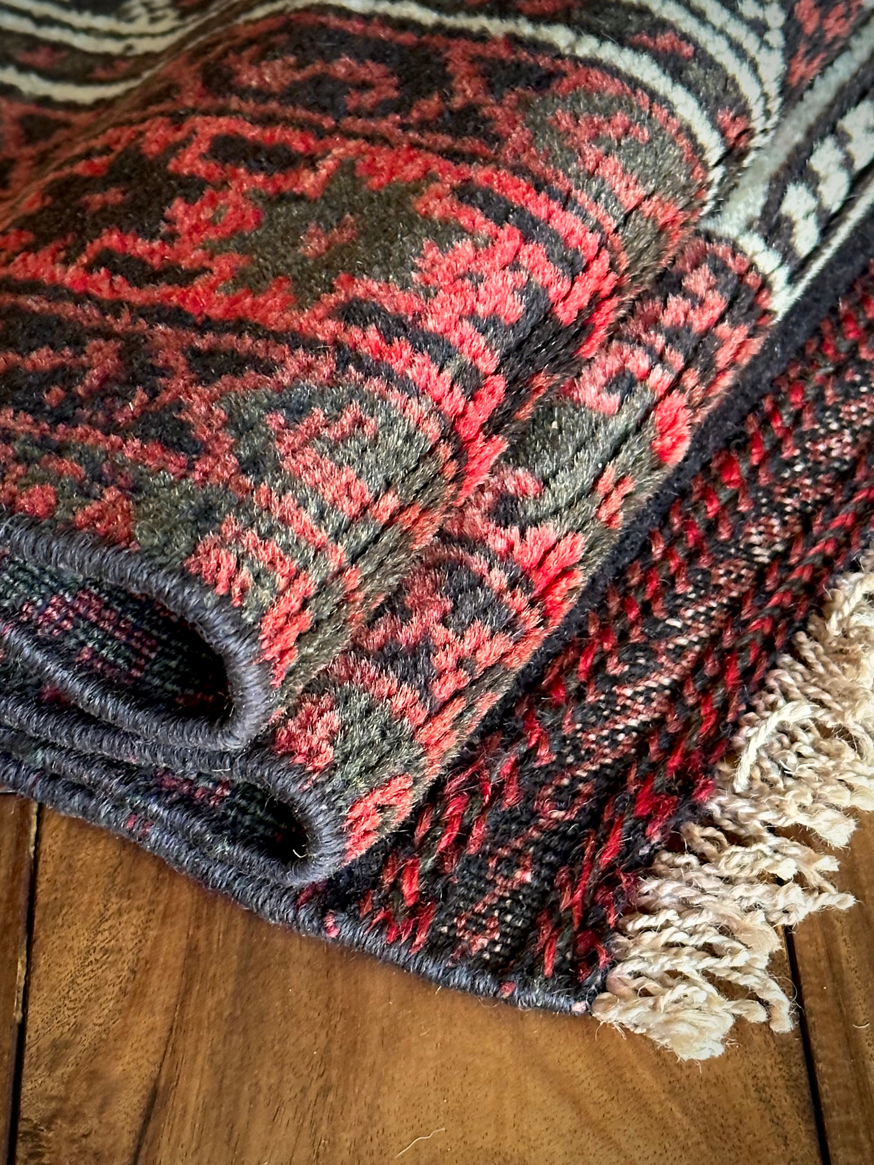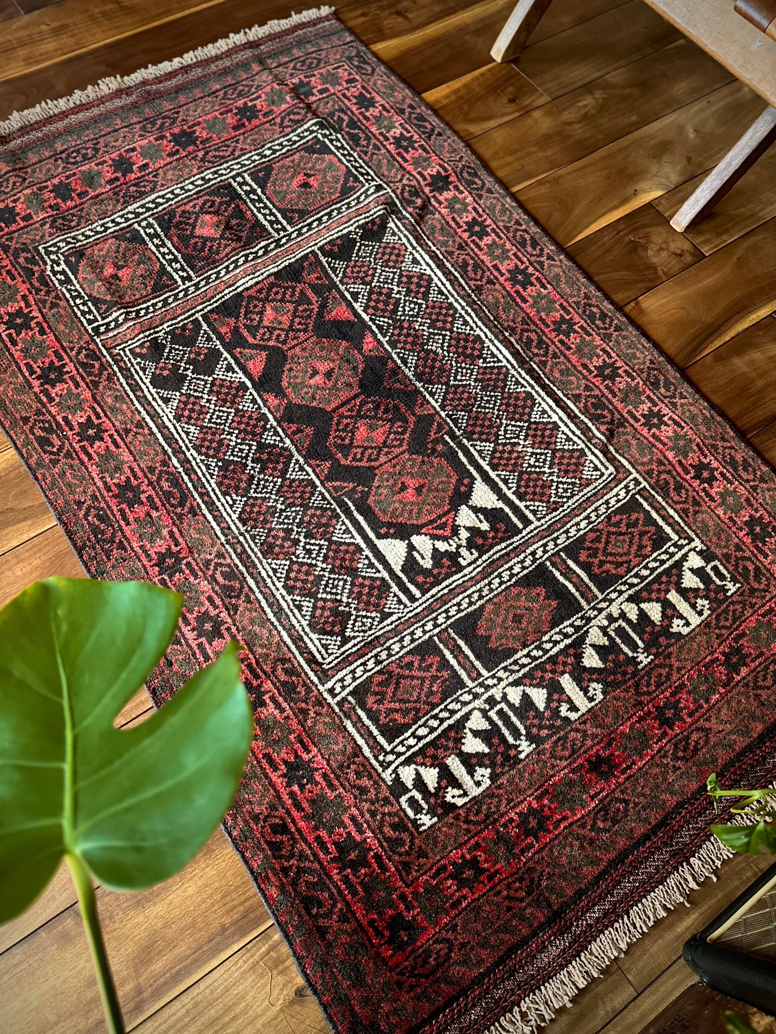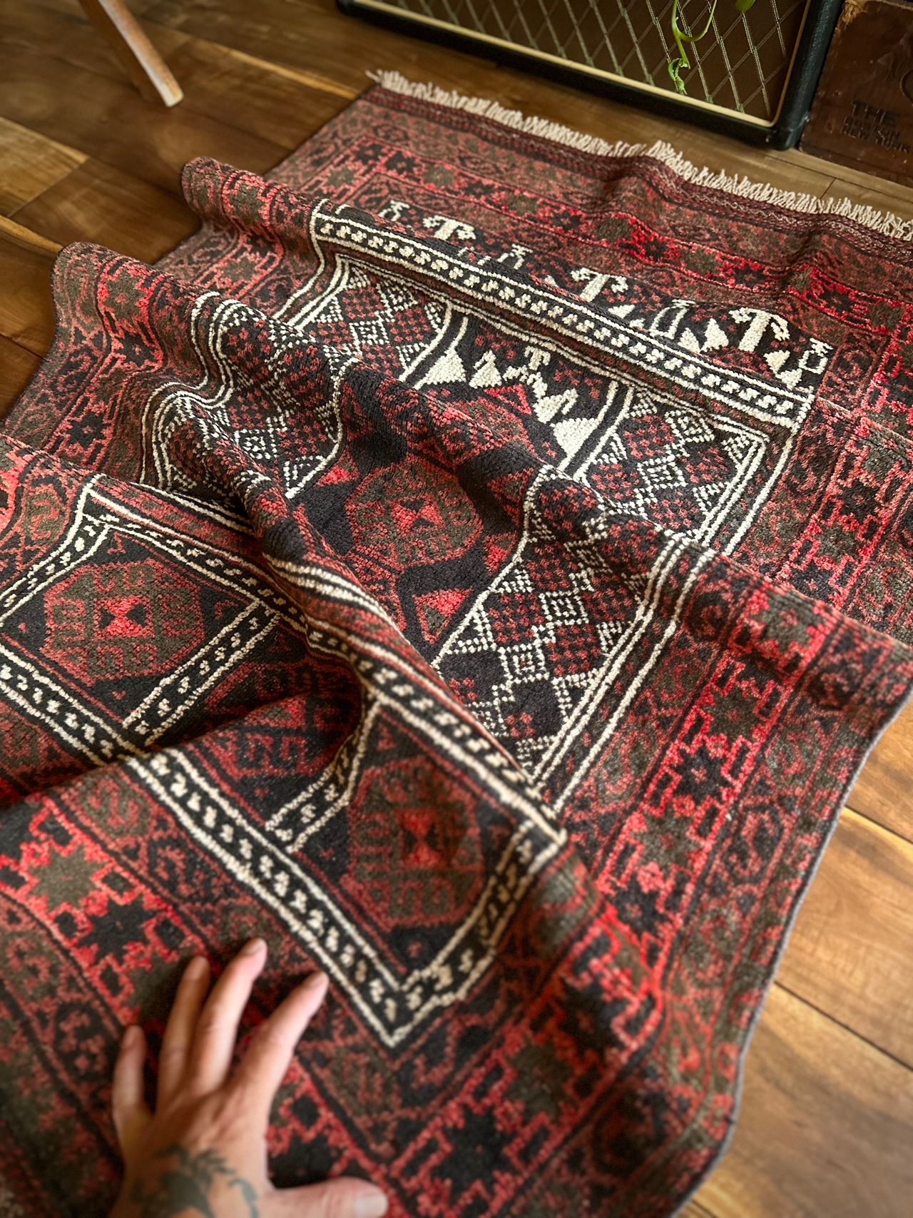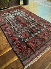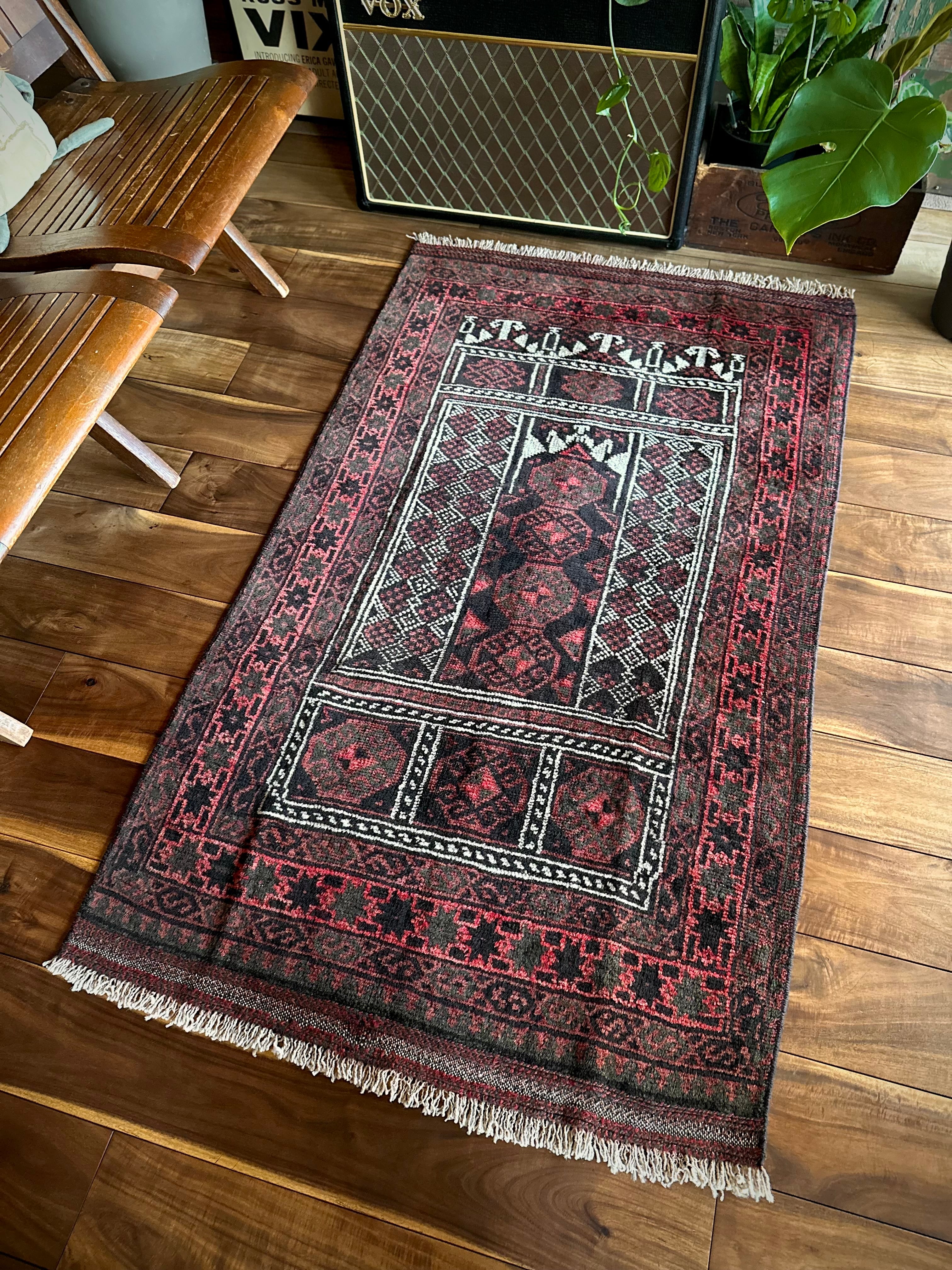 色褪せた赤をベースにブラックやグレーにバーガンディの渋い配色がかっこいいこちらは、アフガニスタンはヘラート州に居住するバルーチ族のトライバルラグで、祈りの際に用いられるプレイヤーラグになります。