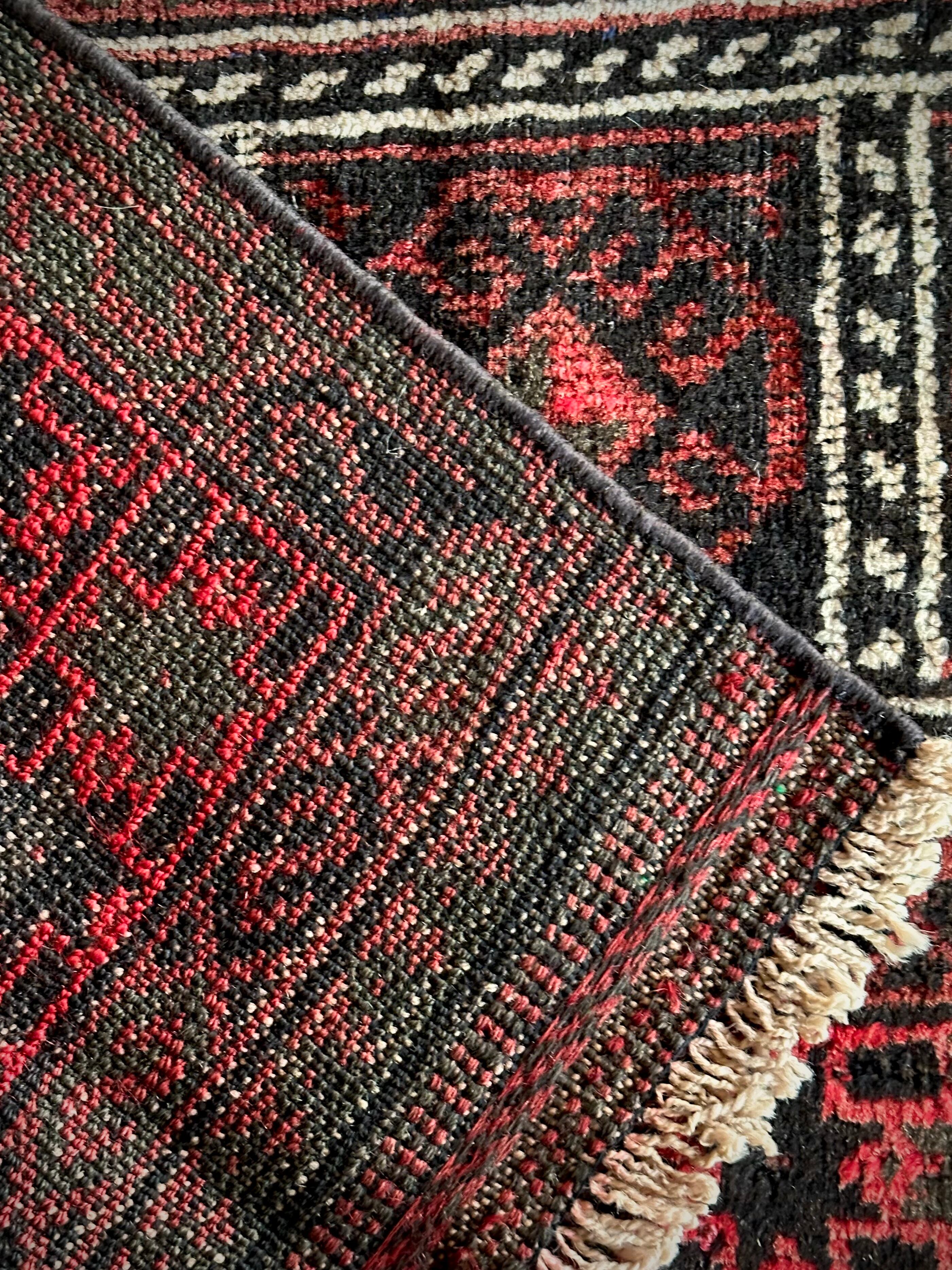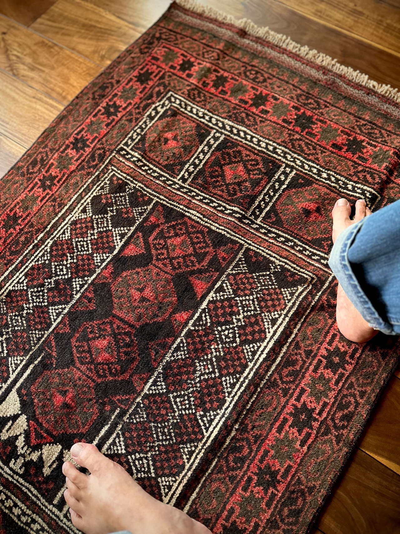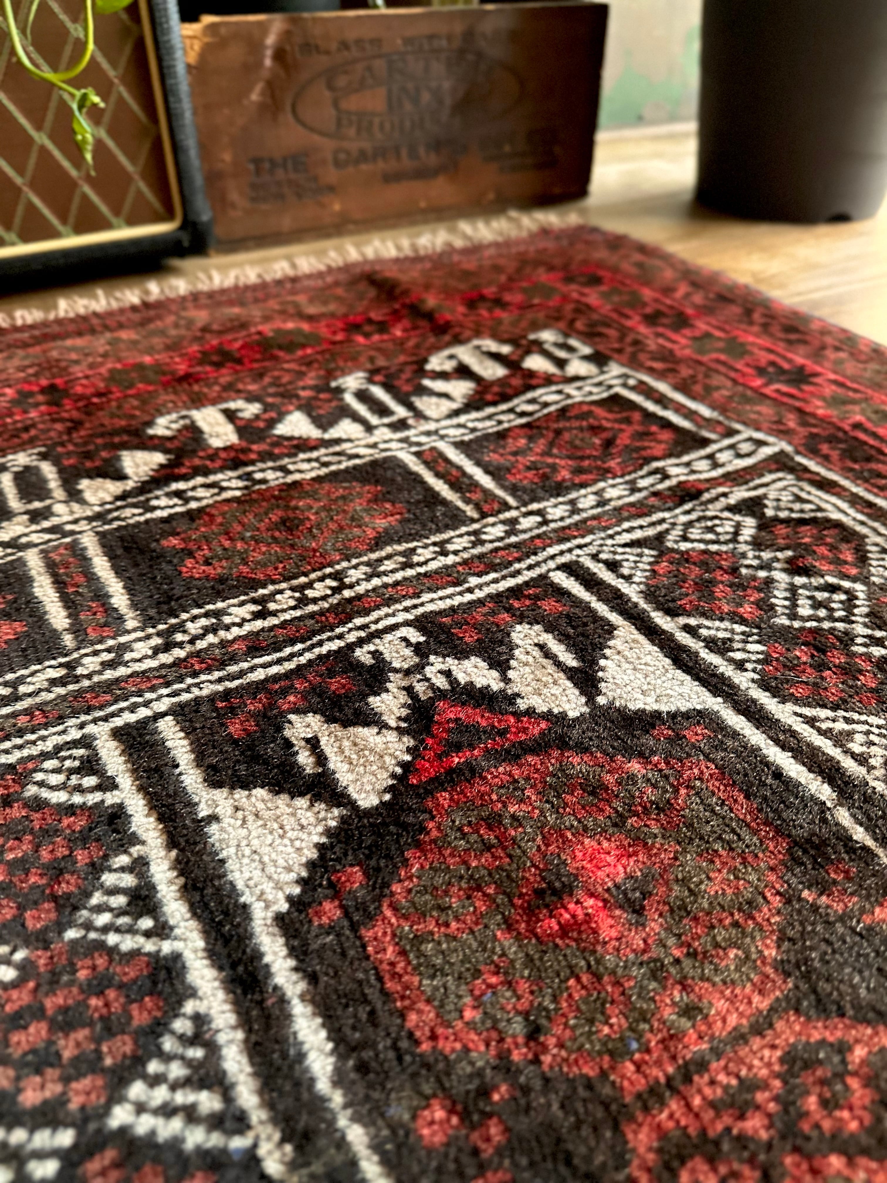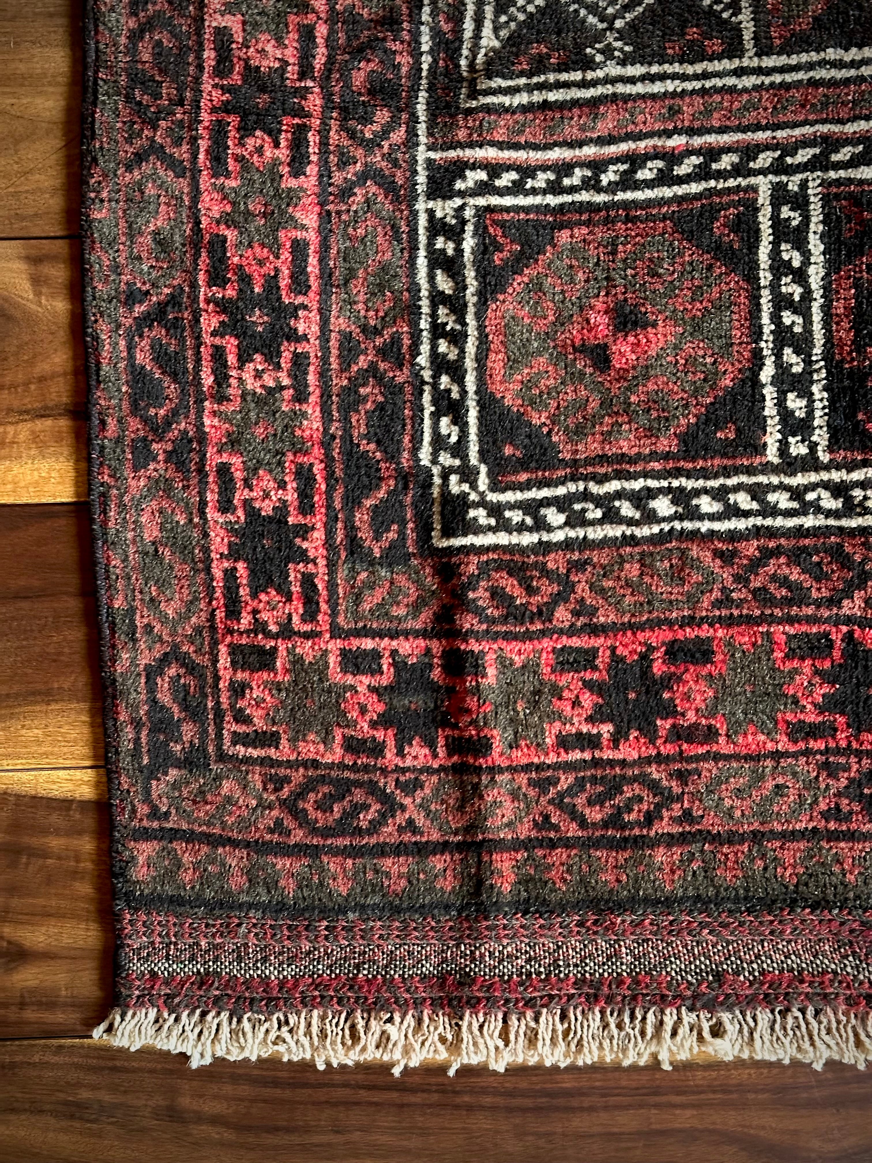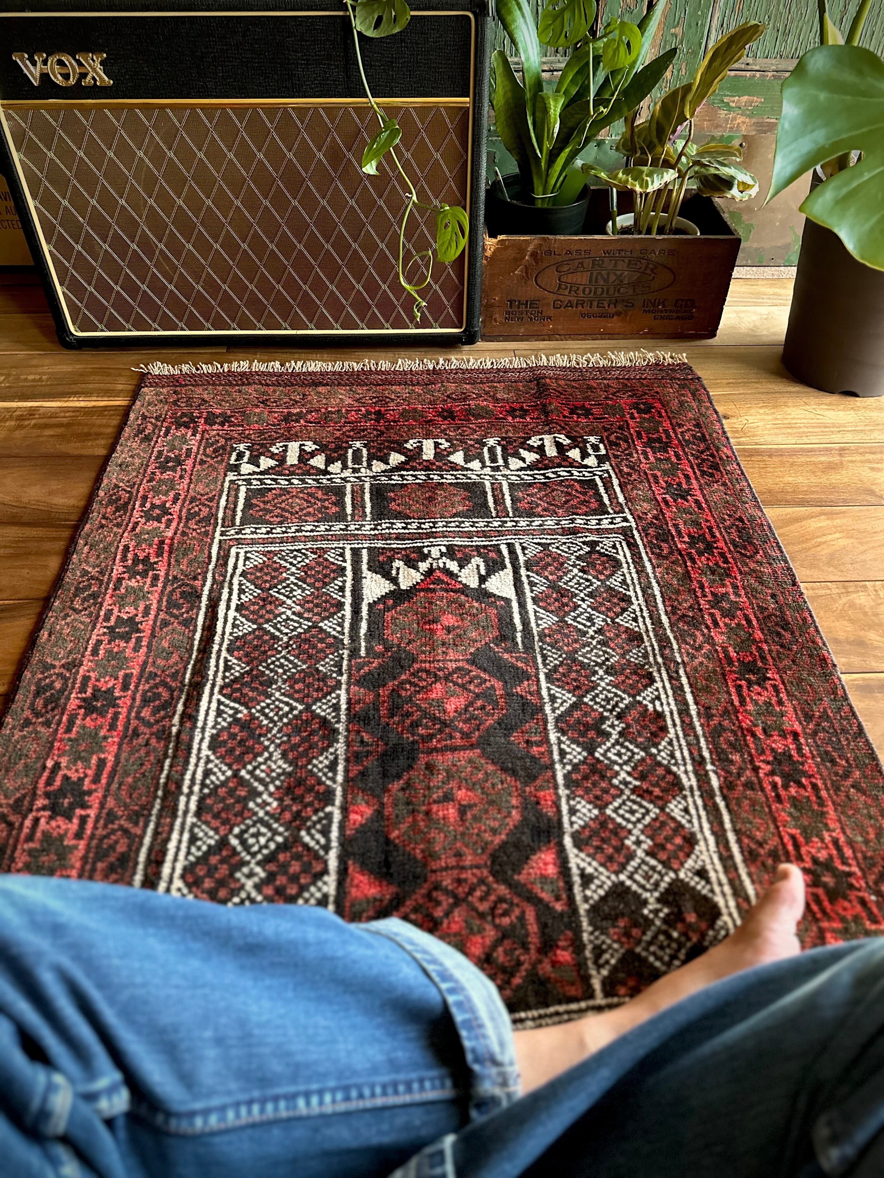 色褪せた赤をベースにブラックやグレーにバーガンディの渋い配色がかっこいいこちらは、アフガニスタンはヘラート州に居住するバルーチ族のトライバルラグで、祈りの際に用いられるプレイヤーラグになります。