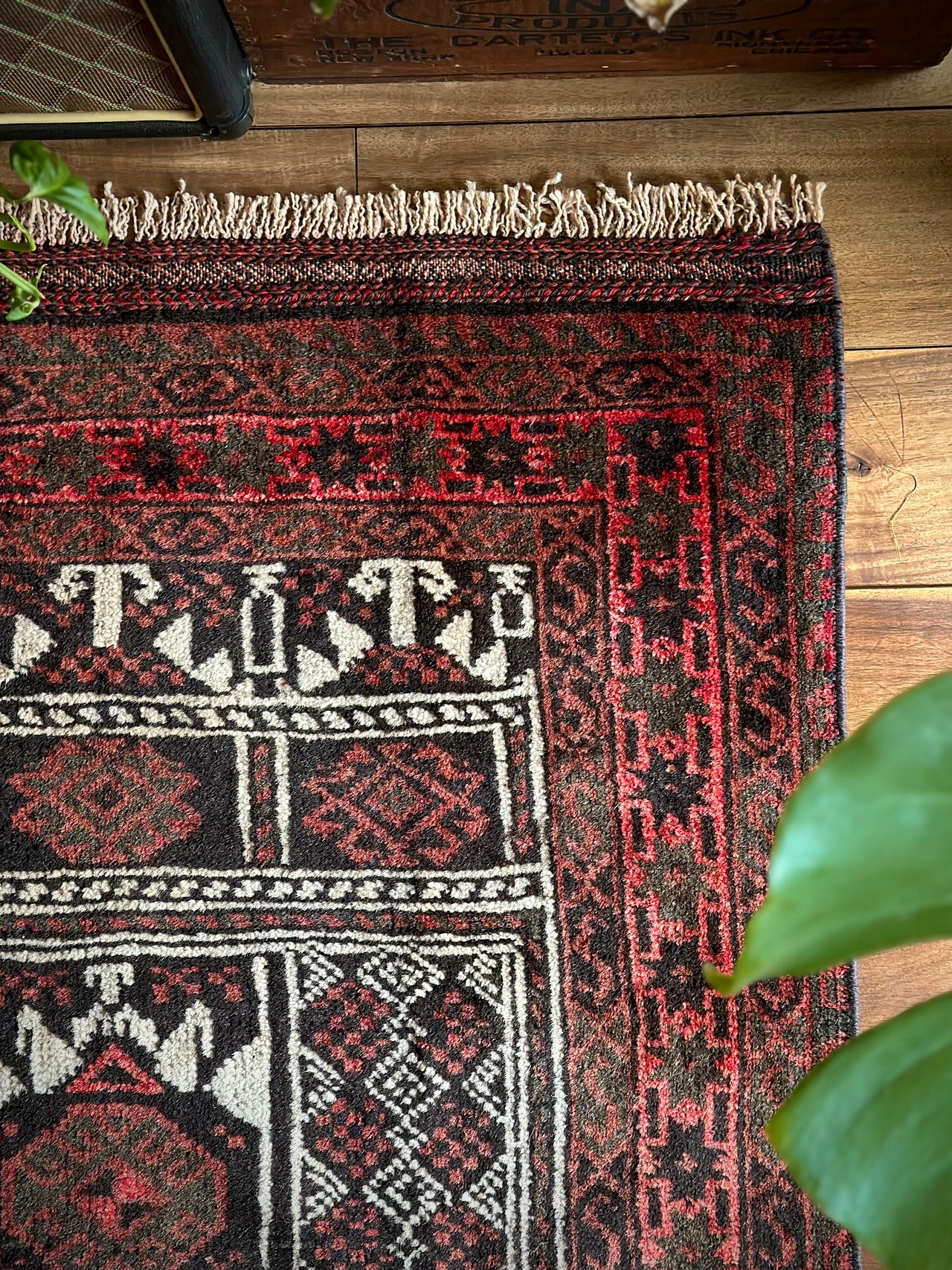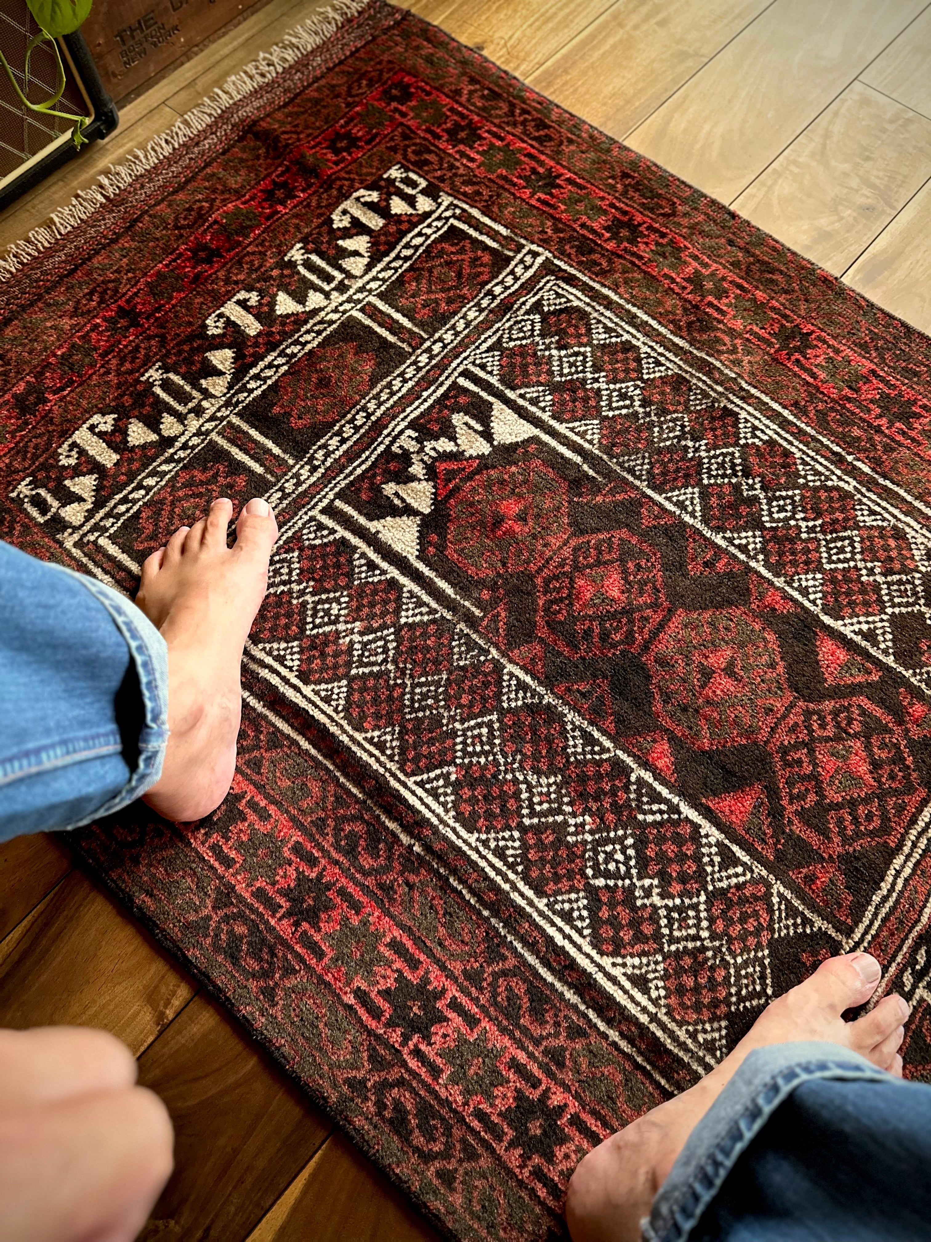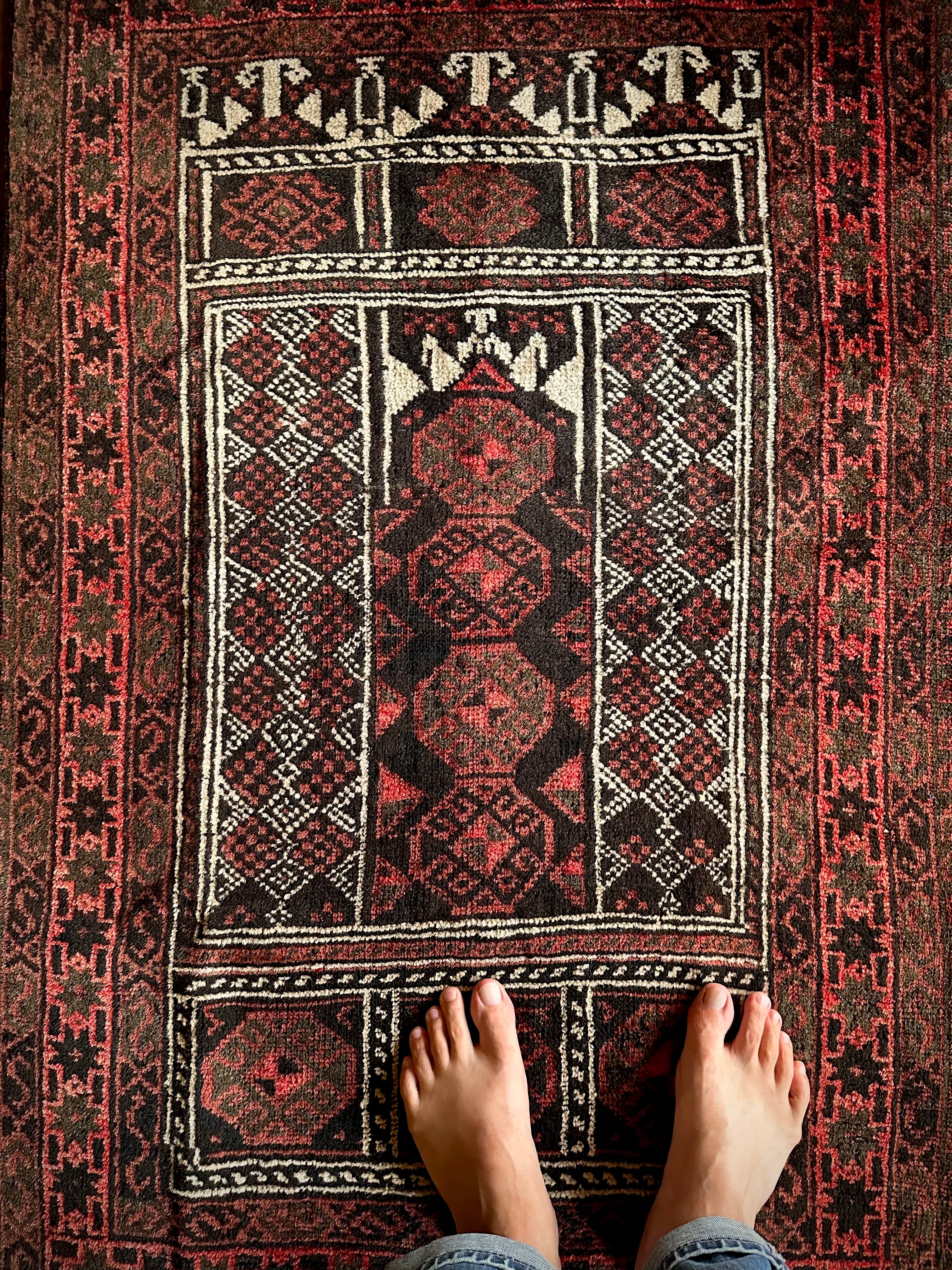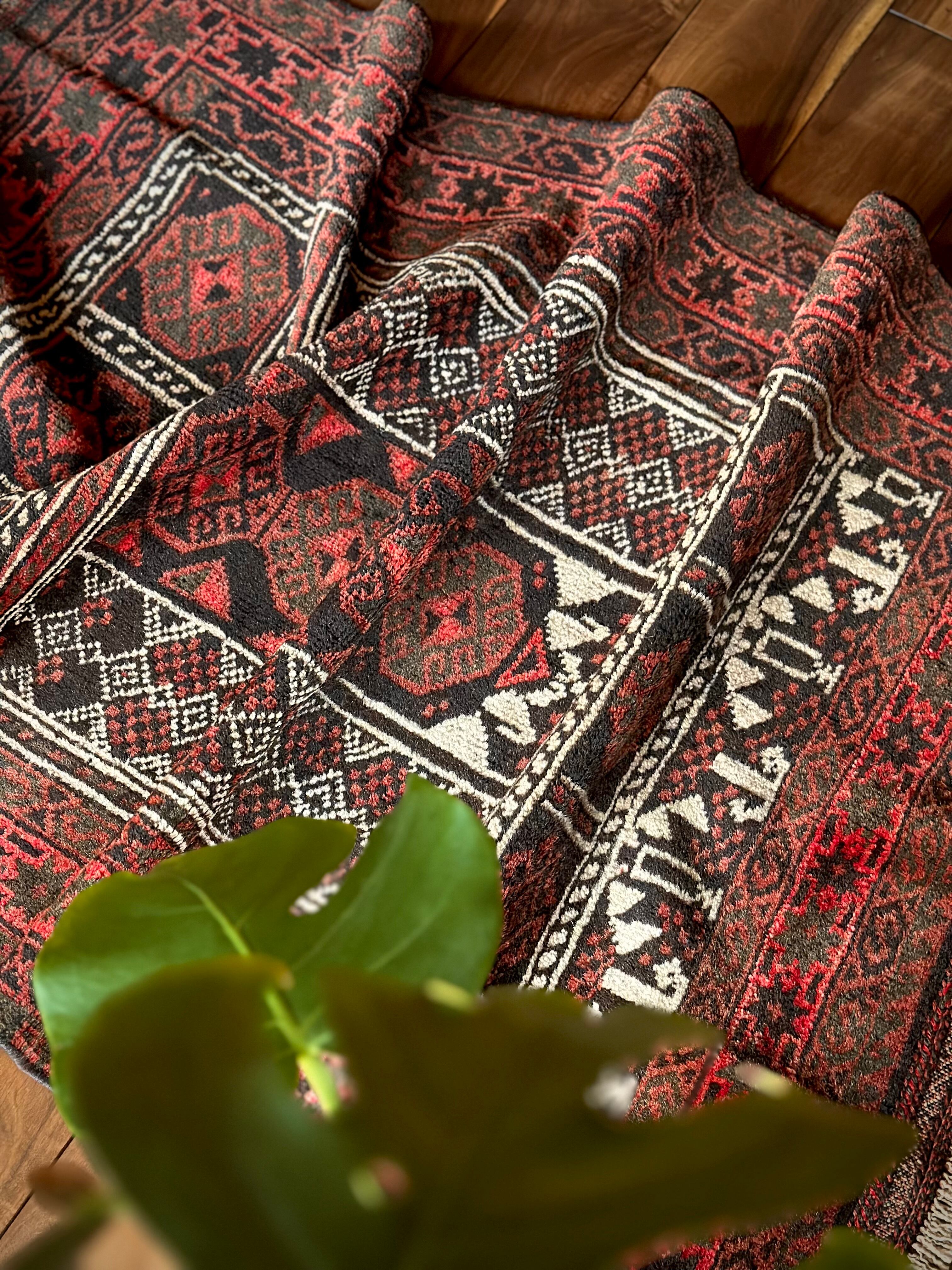色褪せた赤をベースにブラックやグレーにバーガンディの渋い配色がかっこいいこちらは、アフガニスタンはヘラート州に居住するバルーチ族のトライバルラグで、祈りの際に用いられるプレイヤーラグになります。