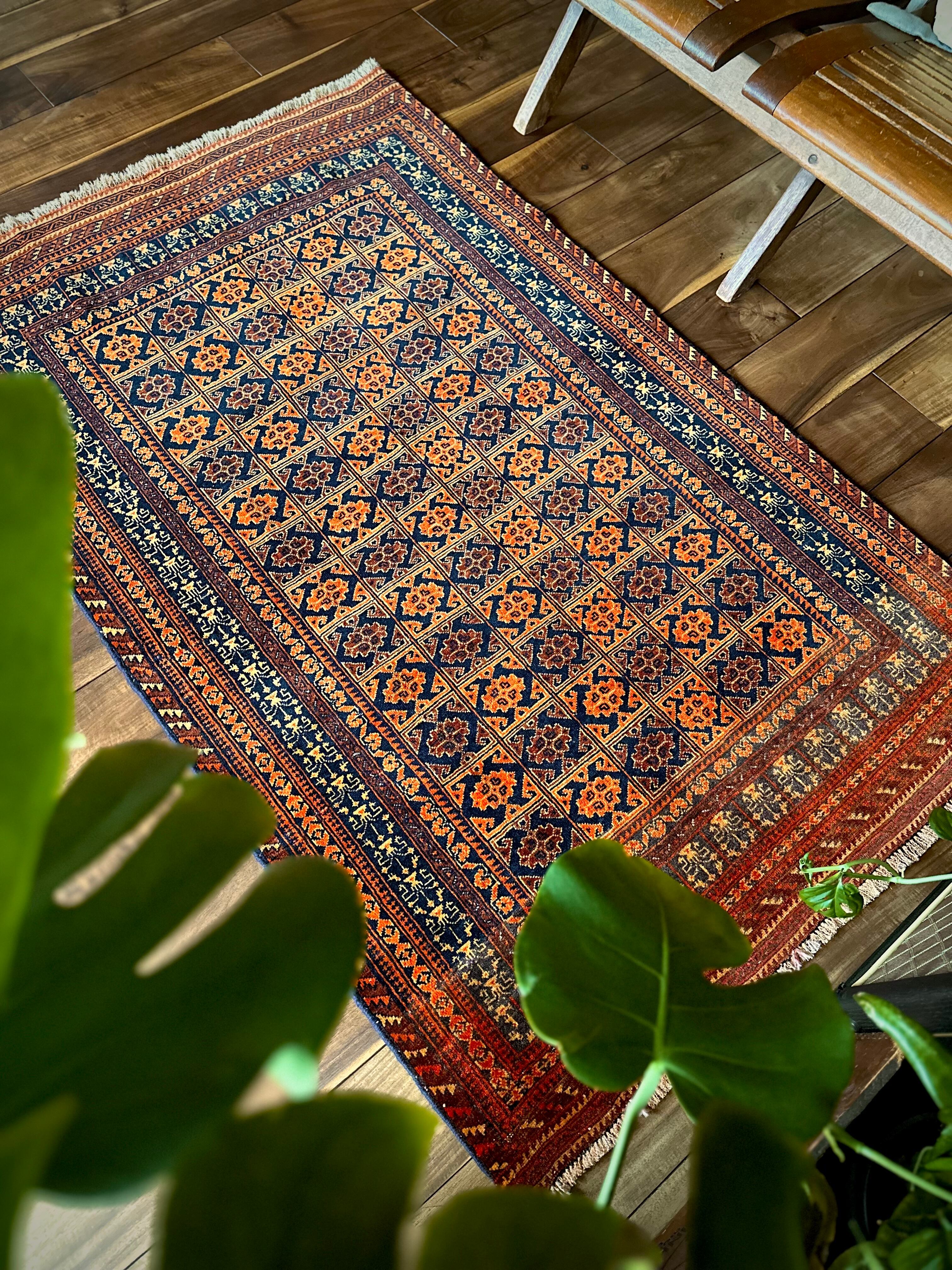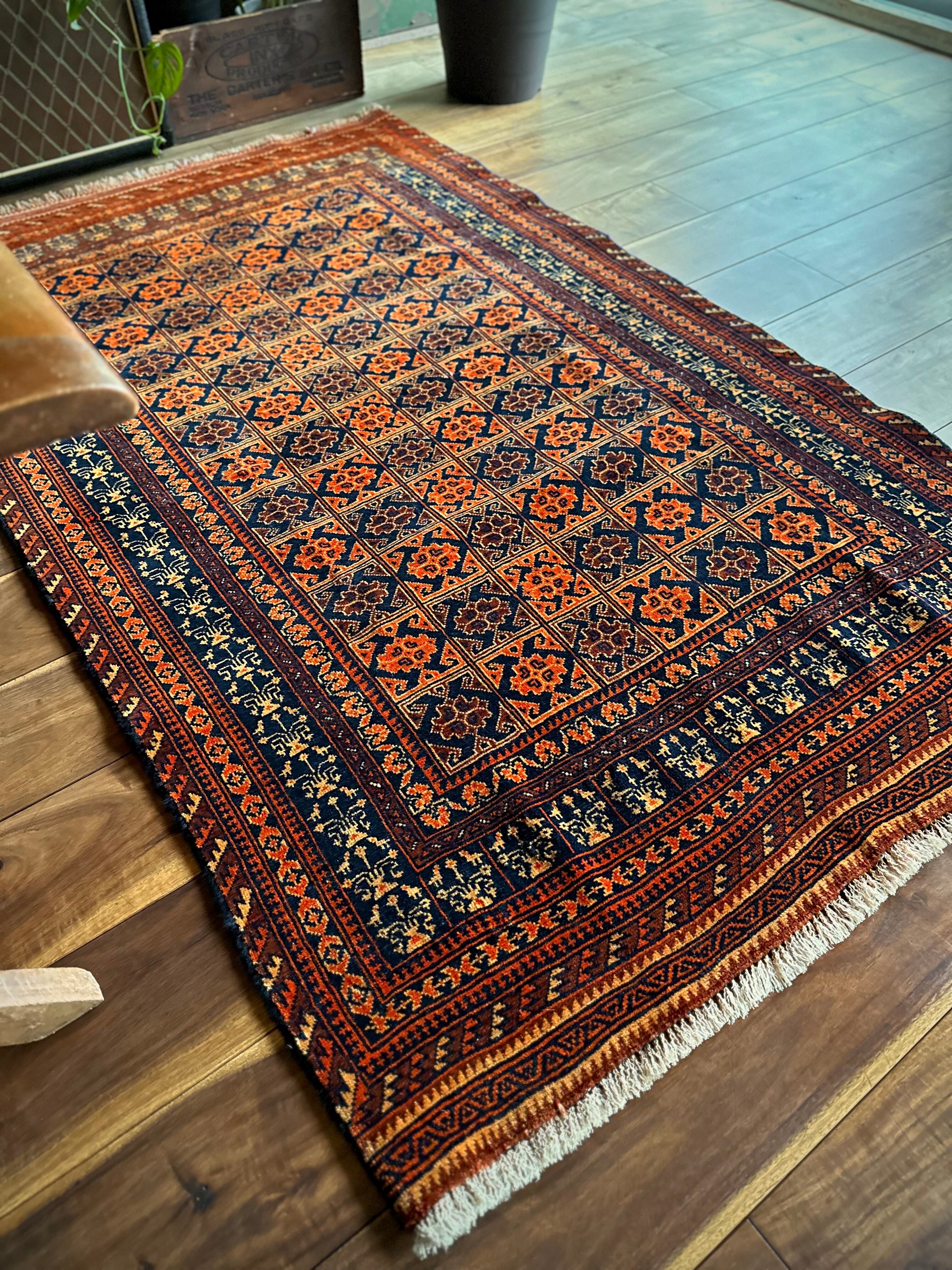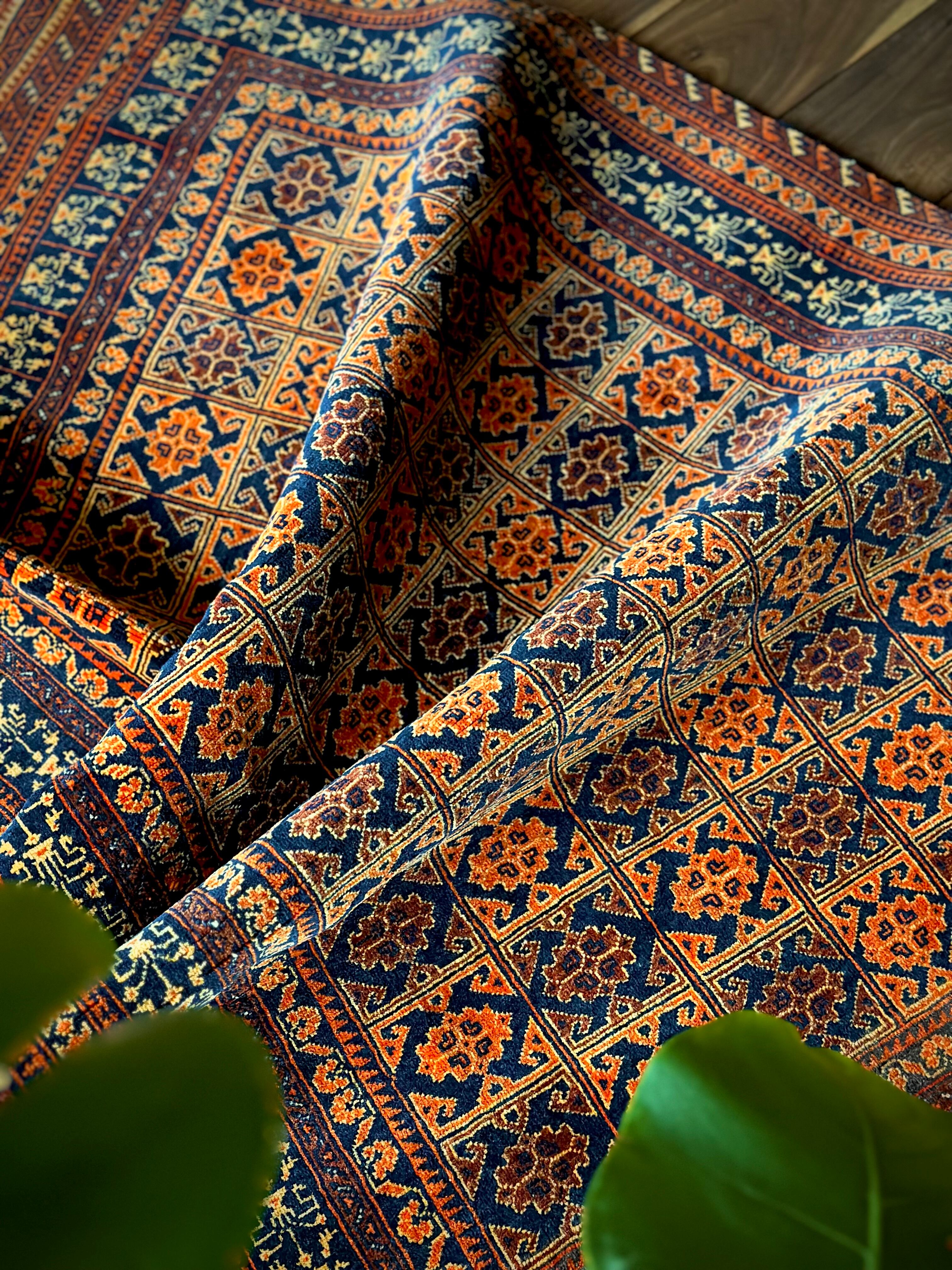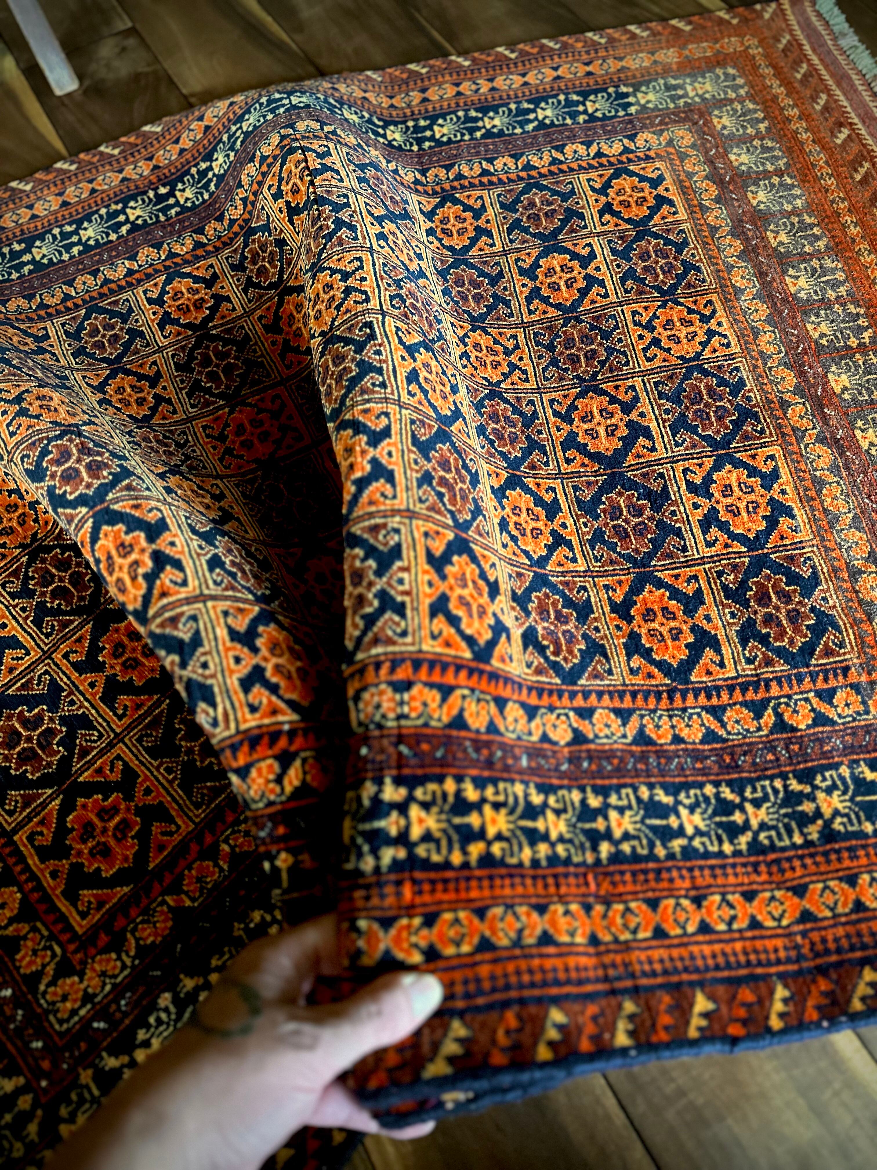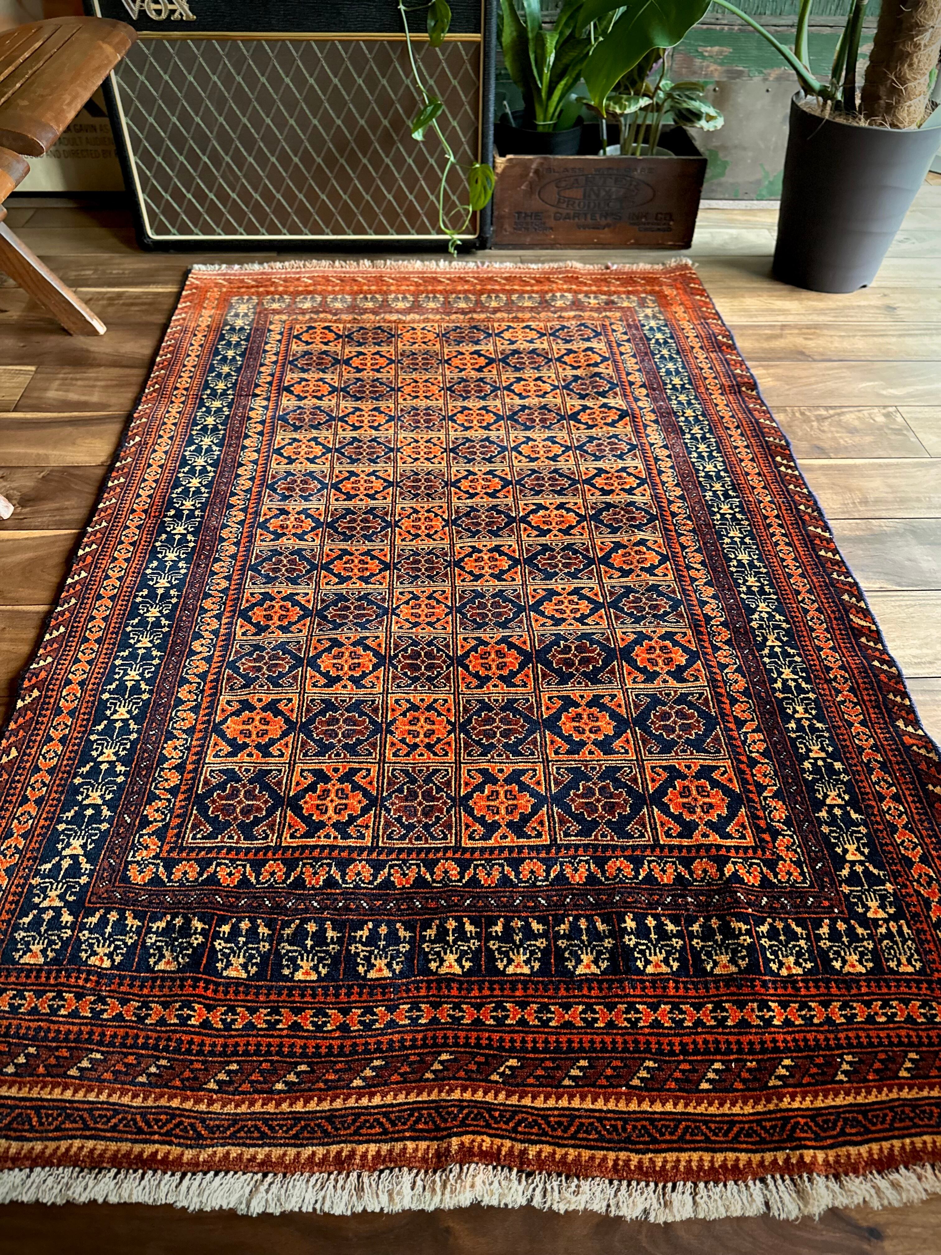 オレンジを基調としながら濃いネイビーとブラウンに合わせたゴールドに輝く輪郭が素晴らしいこちらは、アフガニスタン北部に居住するトルクメン族系のパシュトゥーン人によって手織りされたトライバルラグで、この細やかな手仕事が賞賛されているアリホジャと呼ばれるヴィンテージラグになります。
