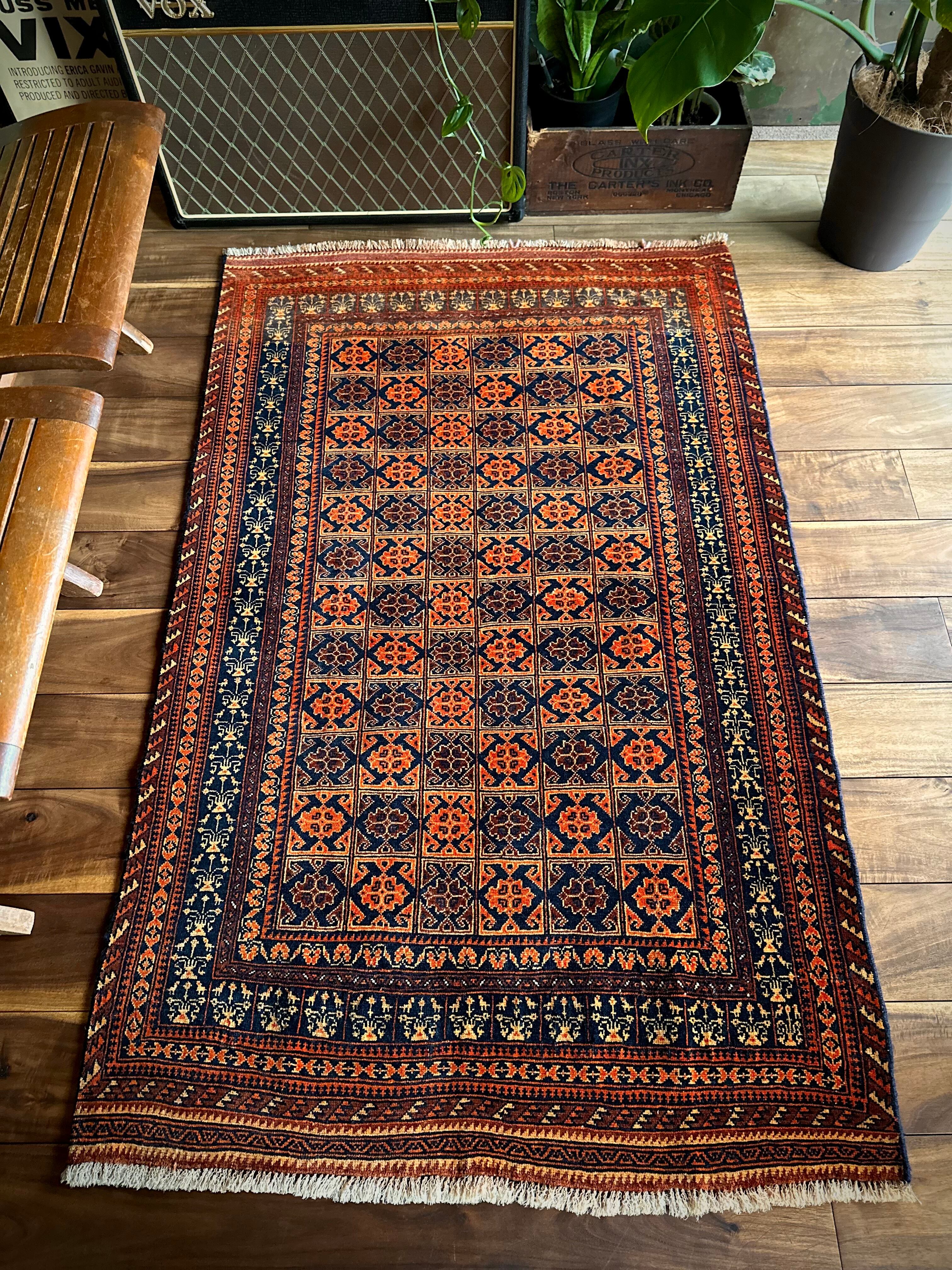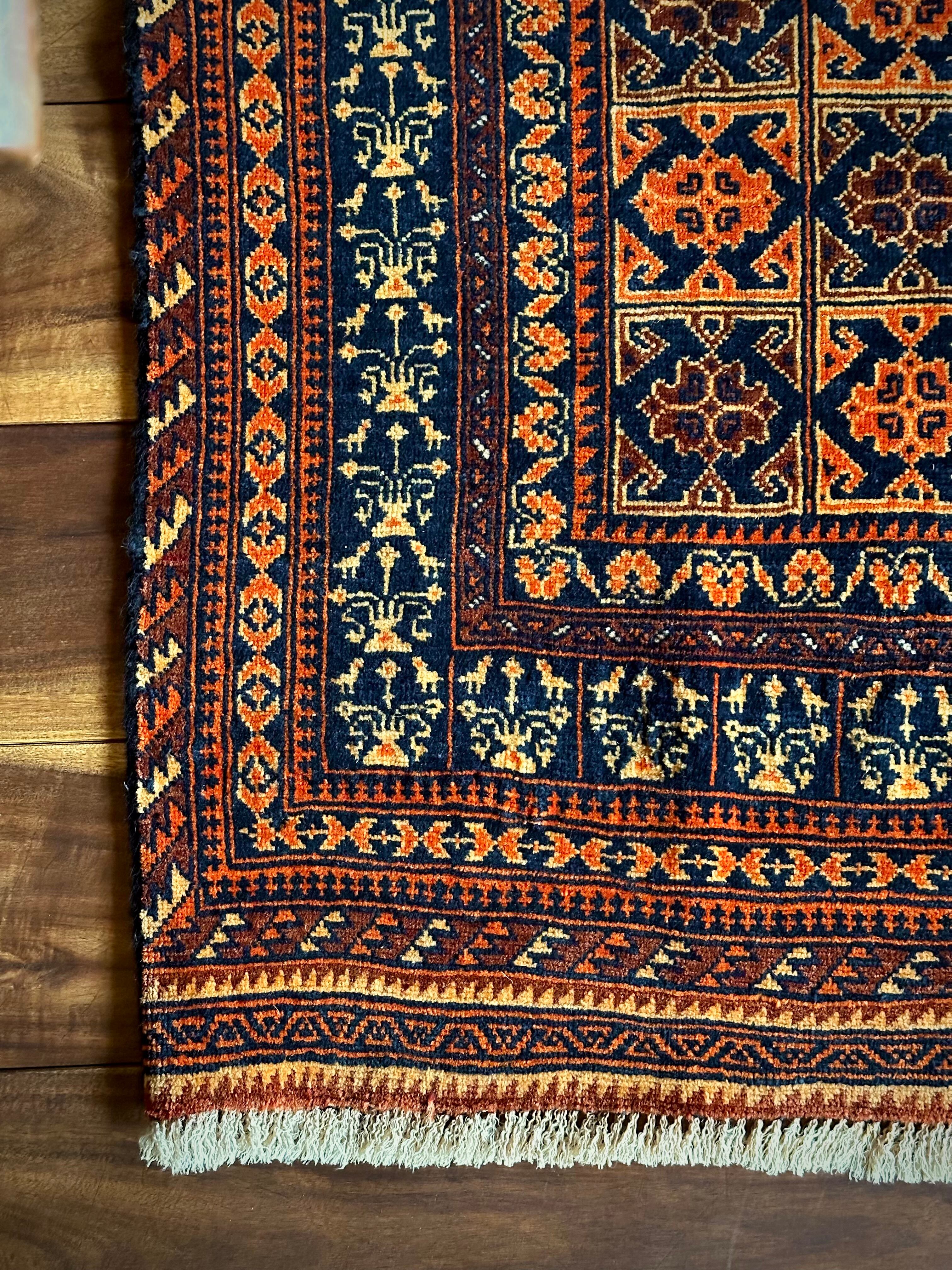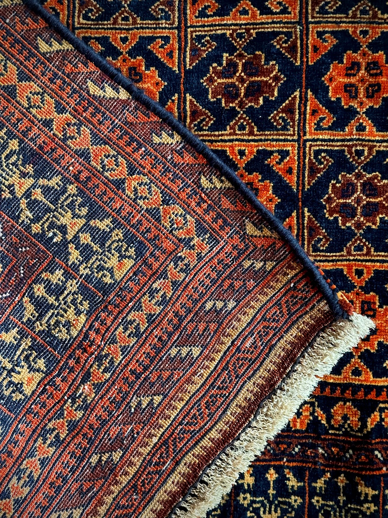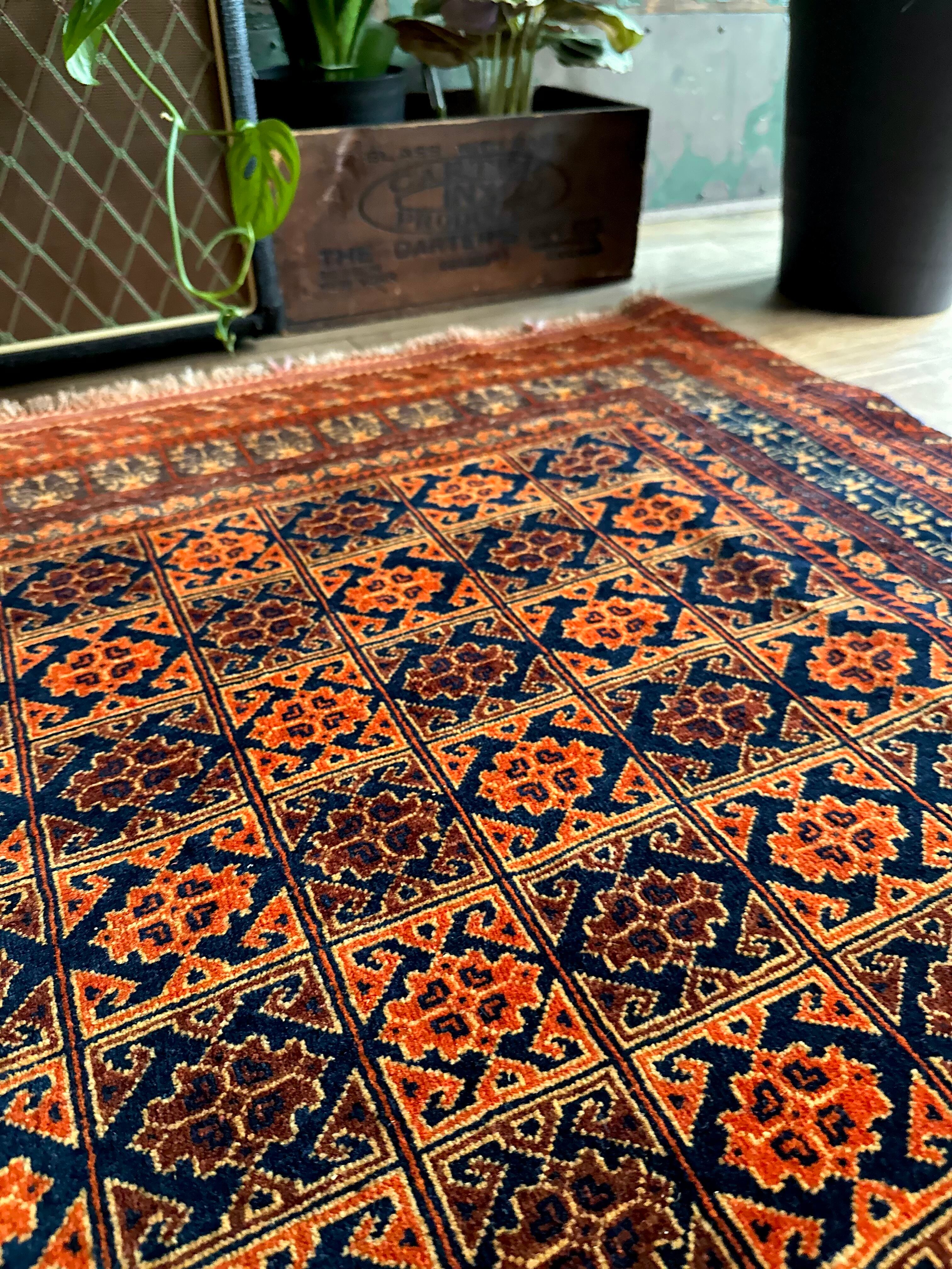 オレンジを基調としながら濃いネイビーとブラウンに合わせたゴールドに輝く輪郭が素晴らしいこちらは、アフガニスタン北部に居住するトルクメン族系のパシュトゥーン人によって手織りされたトライバルラグで、この細やかな手仕事が賞賛されているアリホジャと呼ばれるヴィンテージラグになります。