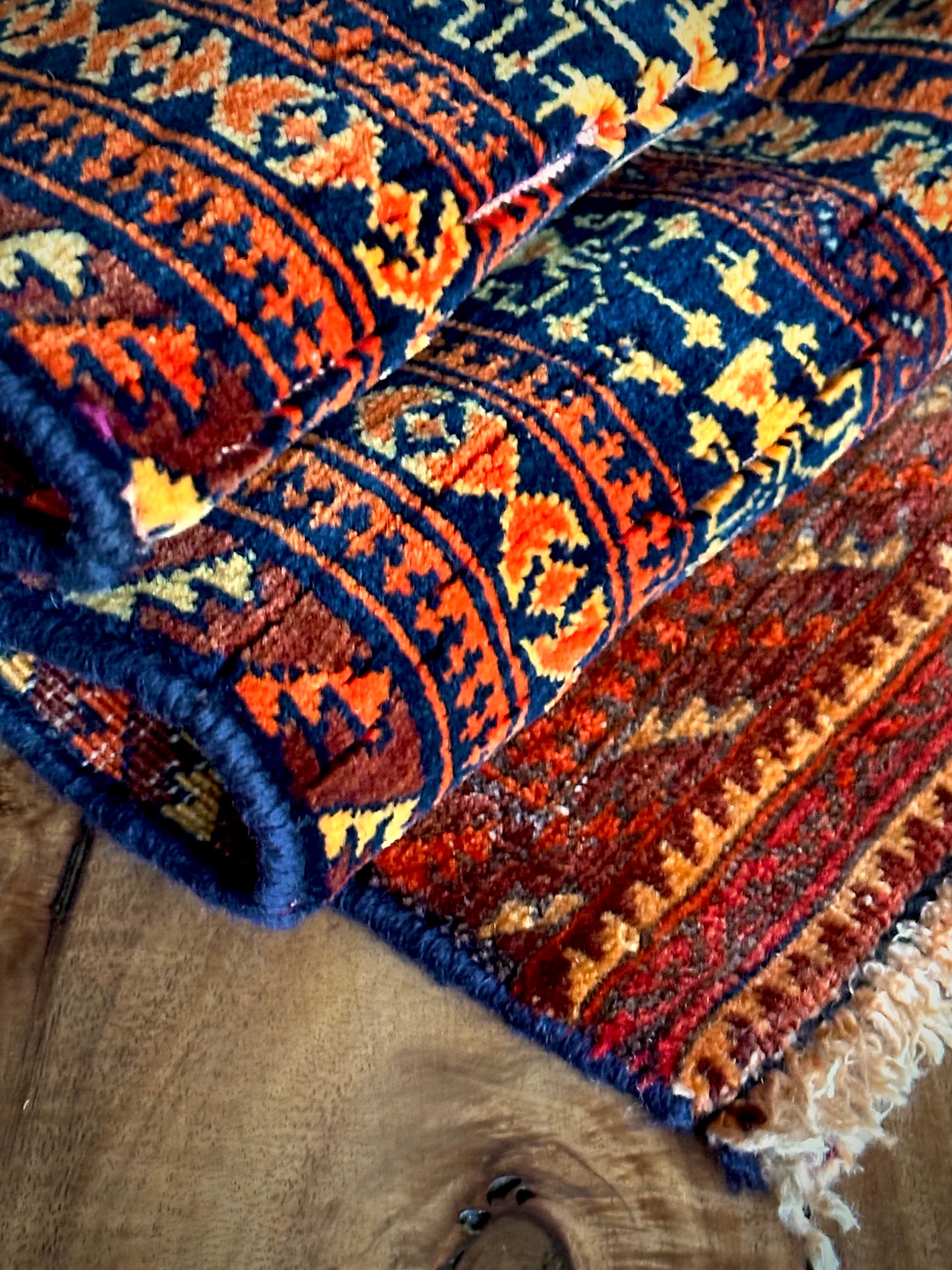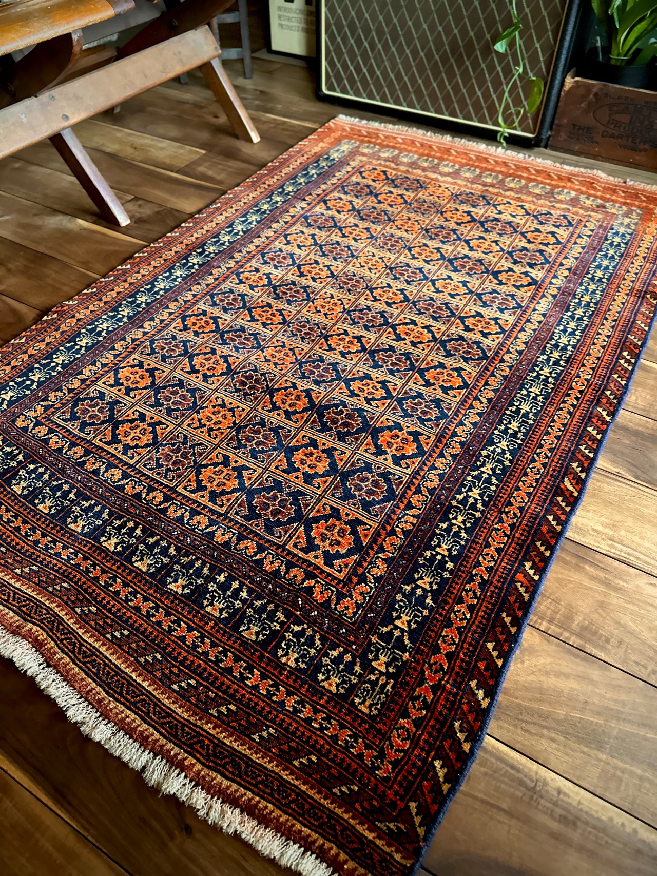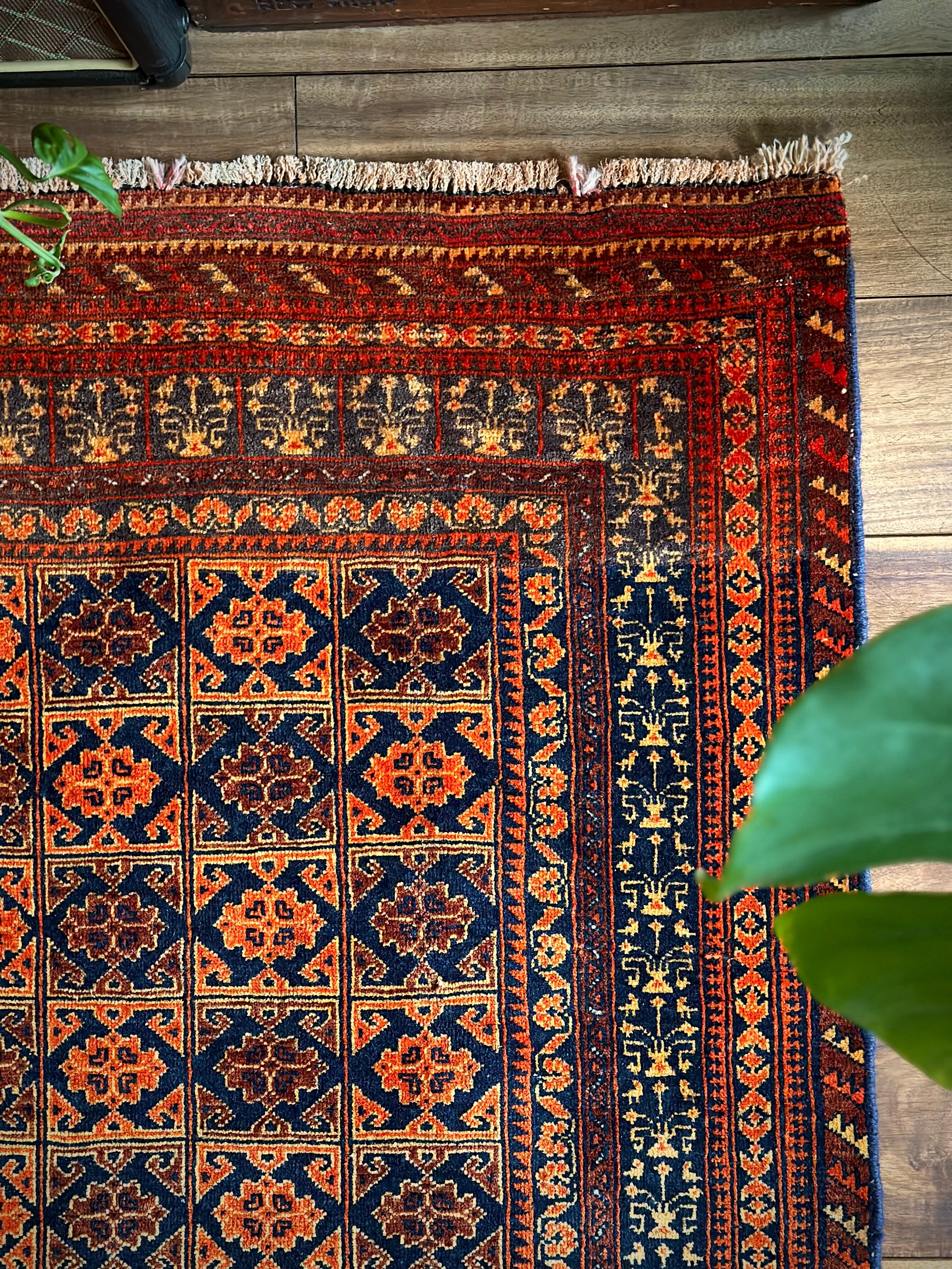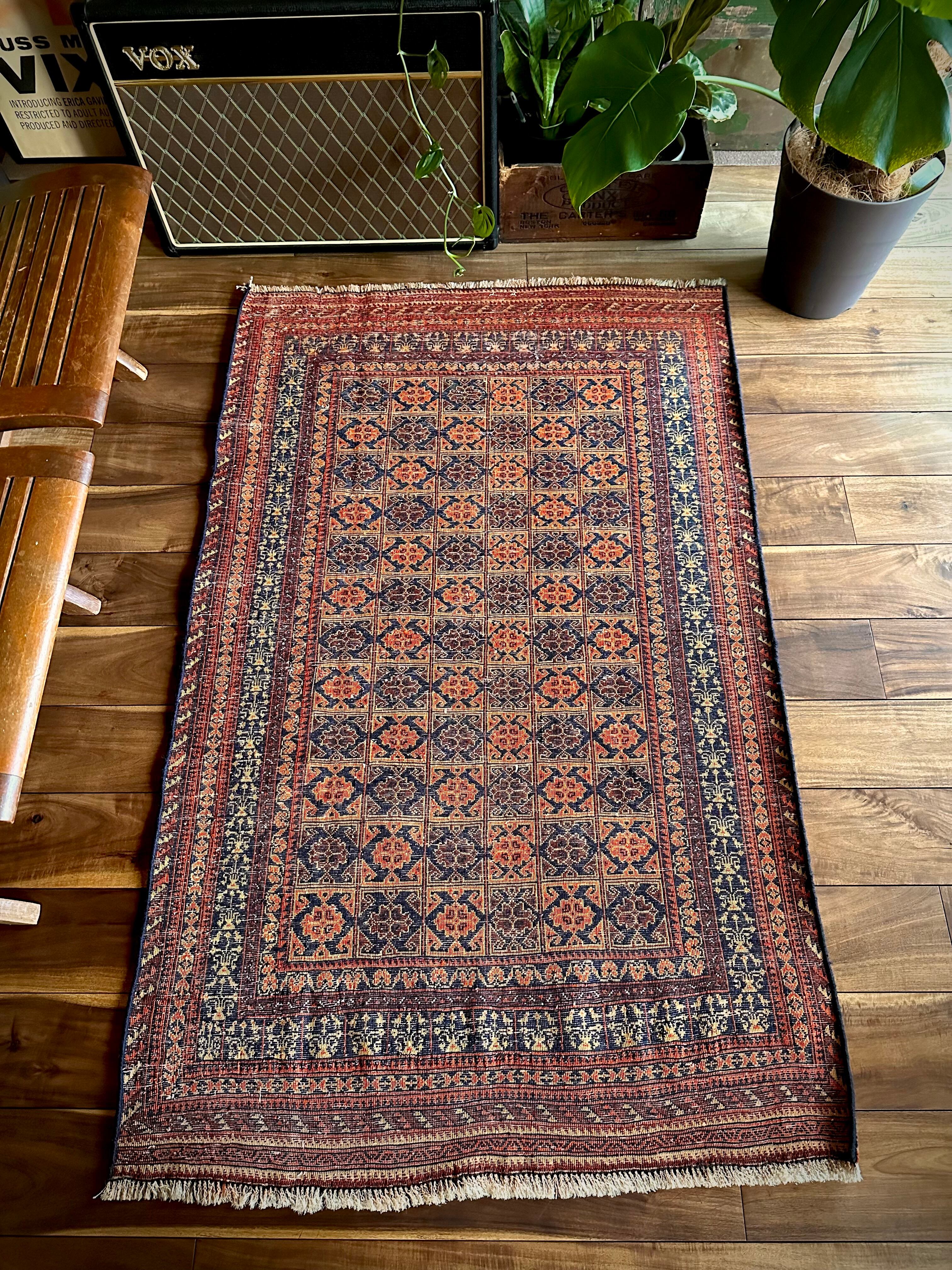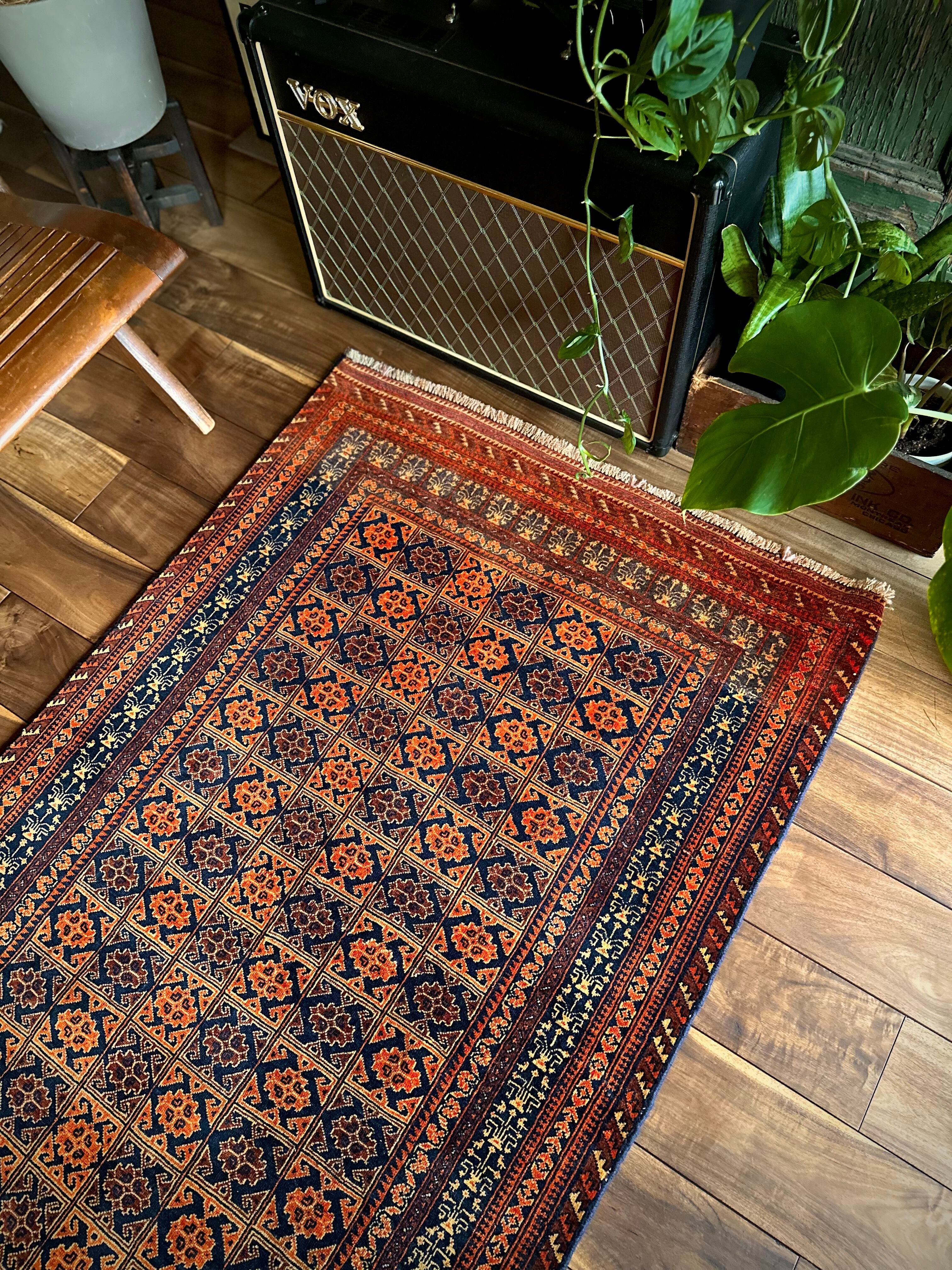 オレンジを基調としながら濃いネイビーとブラウンに合わせたゴールドに輝く輪郭が素晴らしいこちらは、アフガニスタン北部に居住するトルクメン族系のパシュトゥーン人によって手織りされたトライバルラグで、この細やかな手仕事が賞賛されているアリホジャと呼ばれるヴィンテージラグになります。