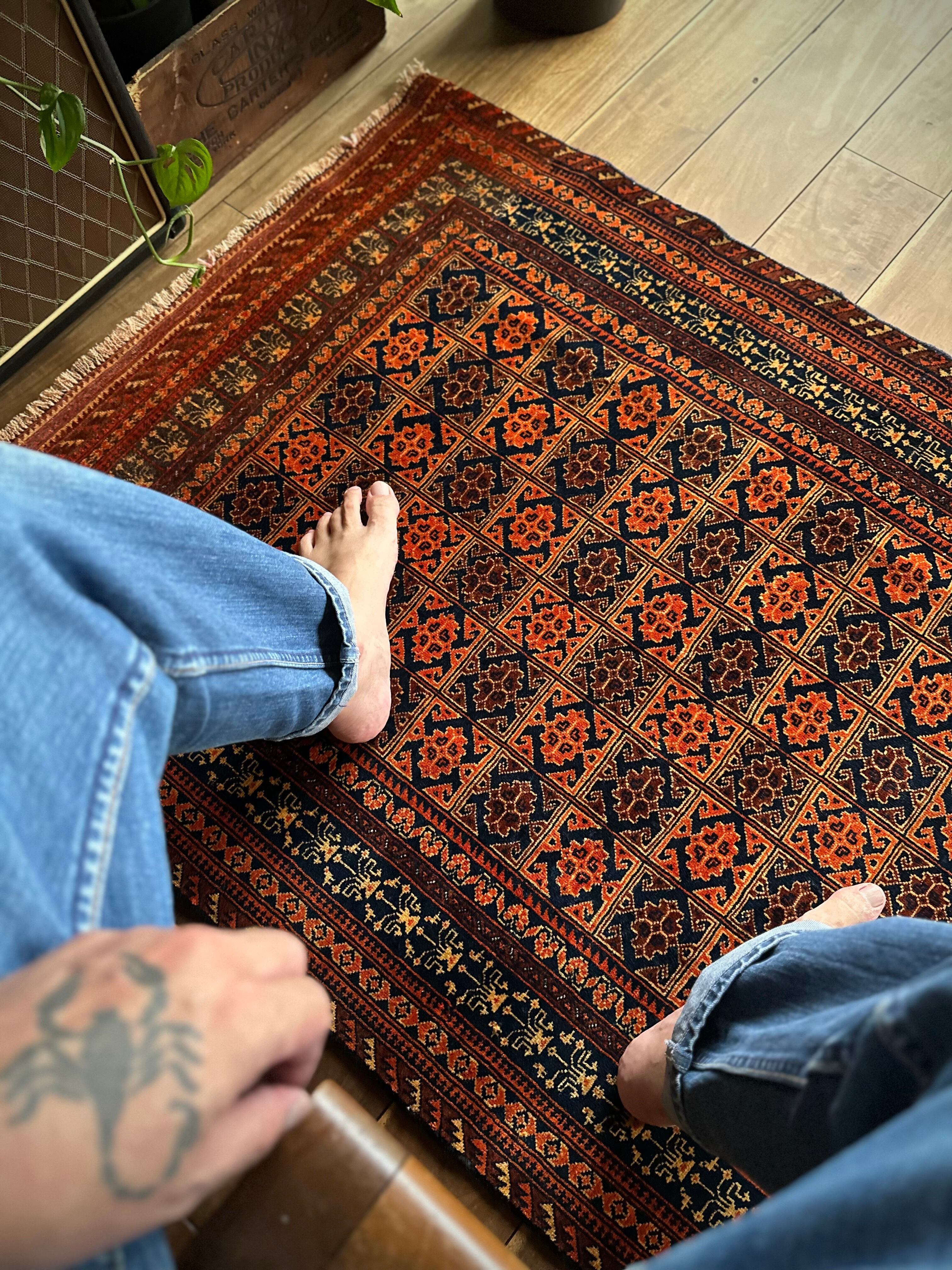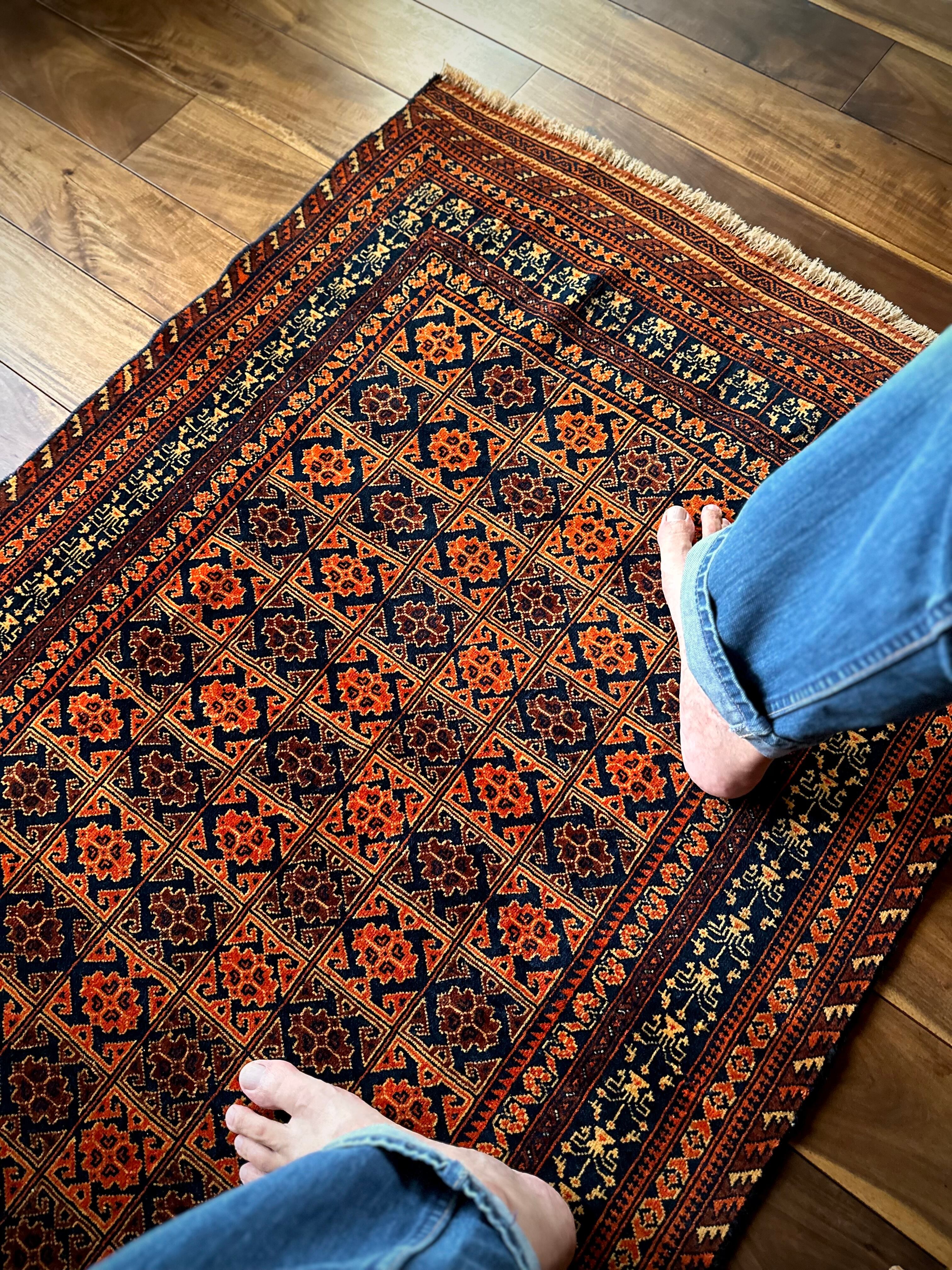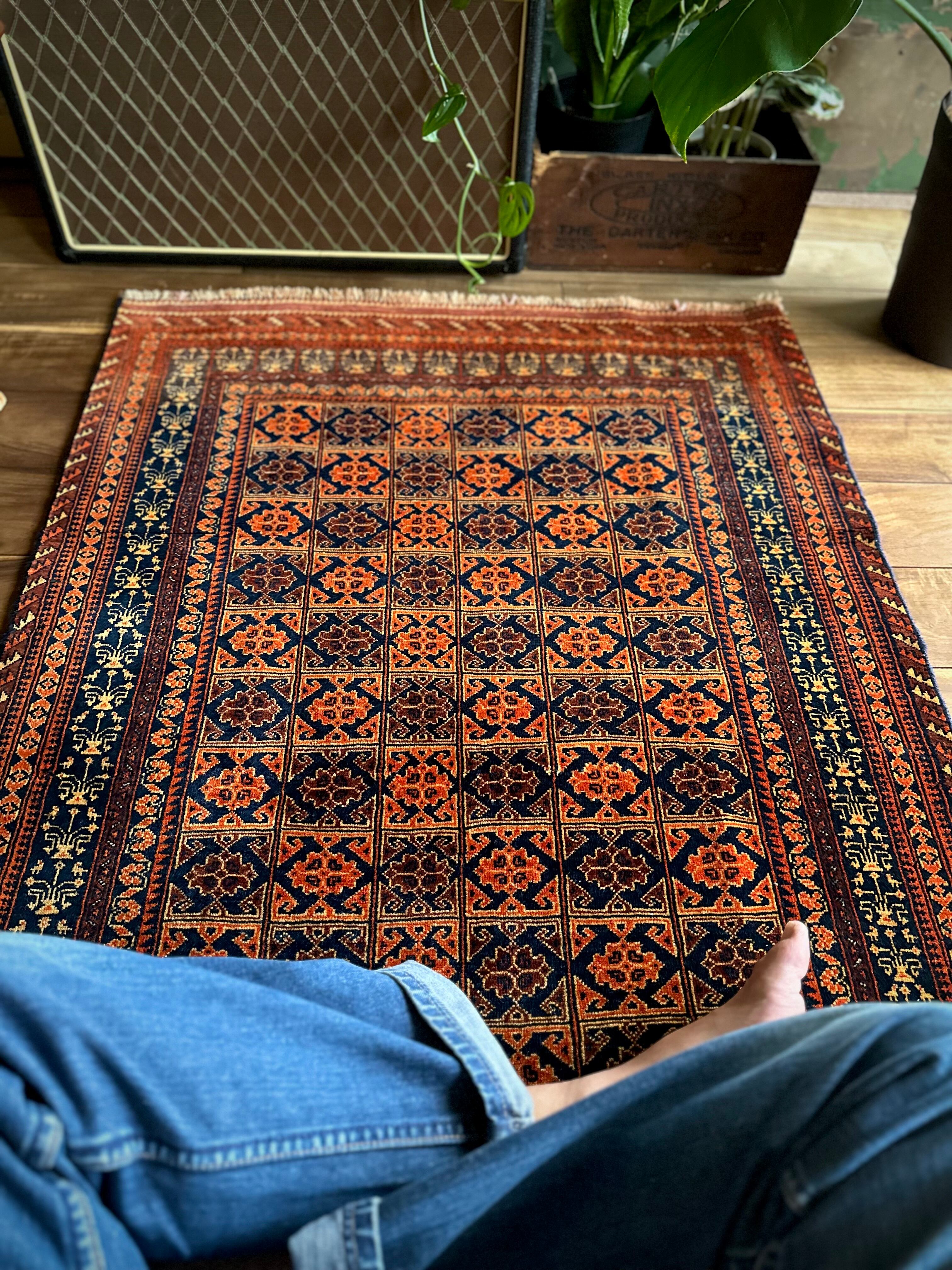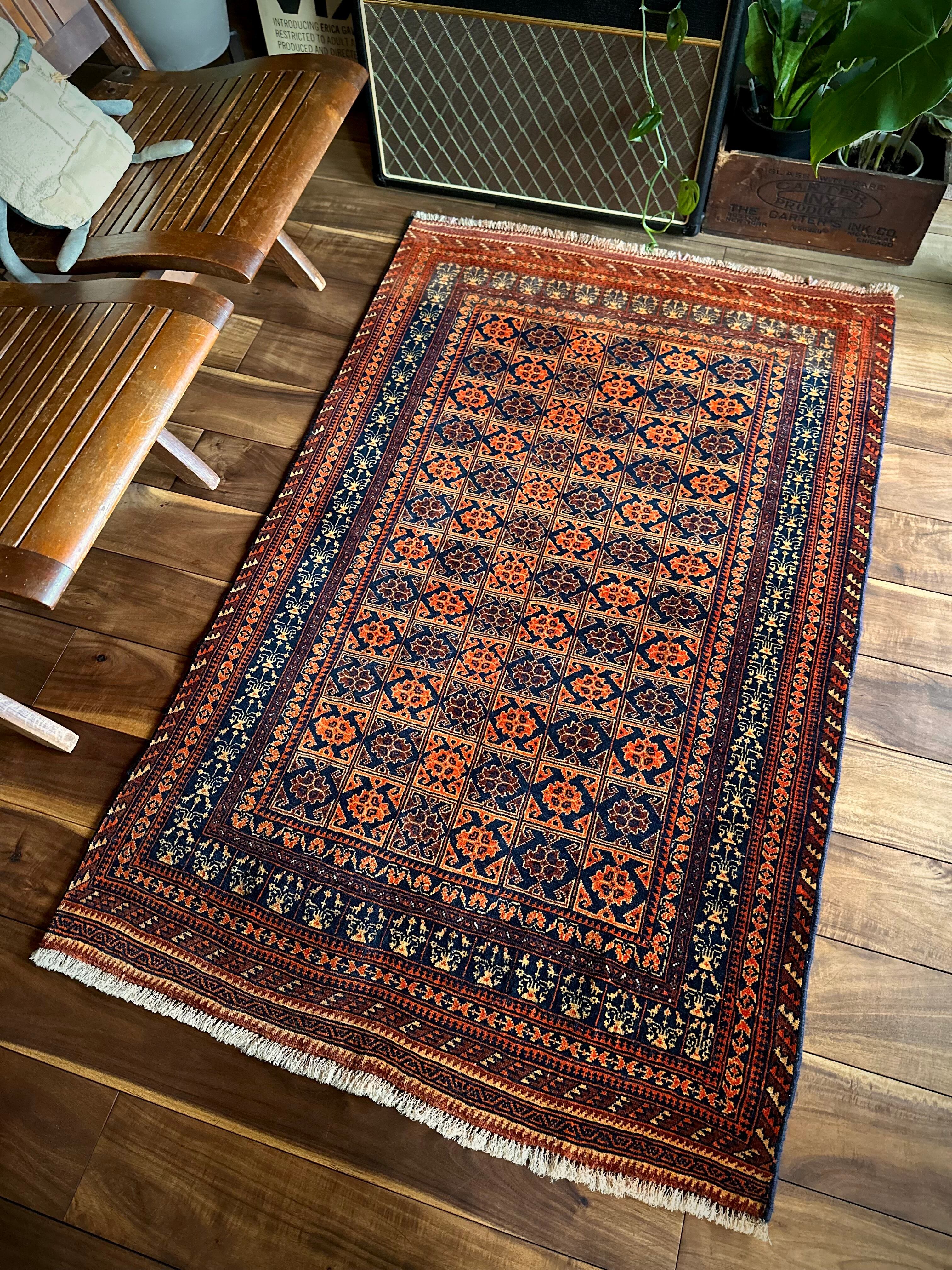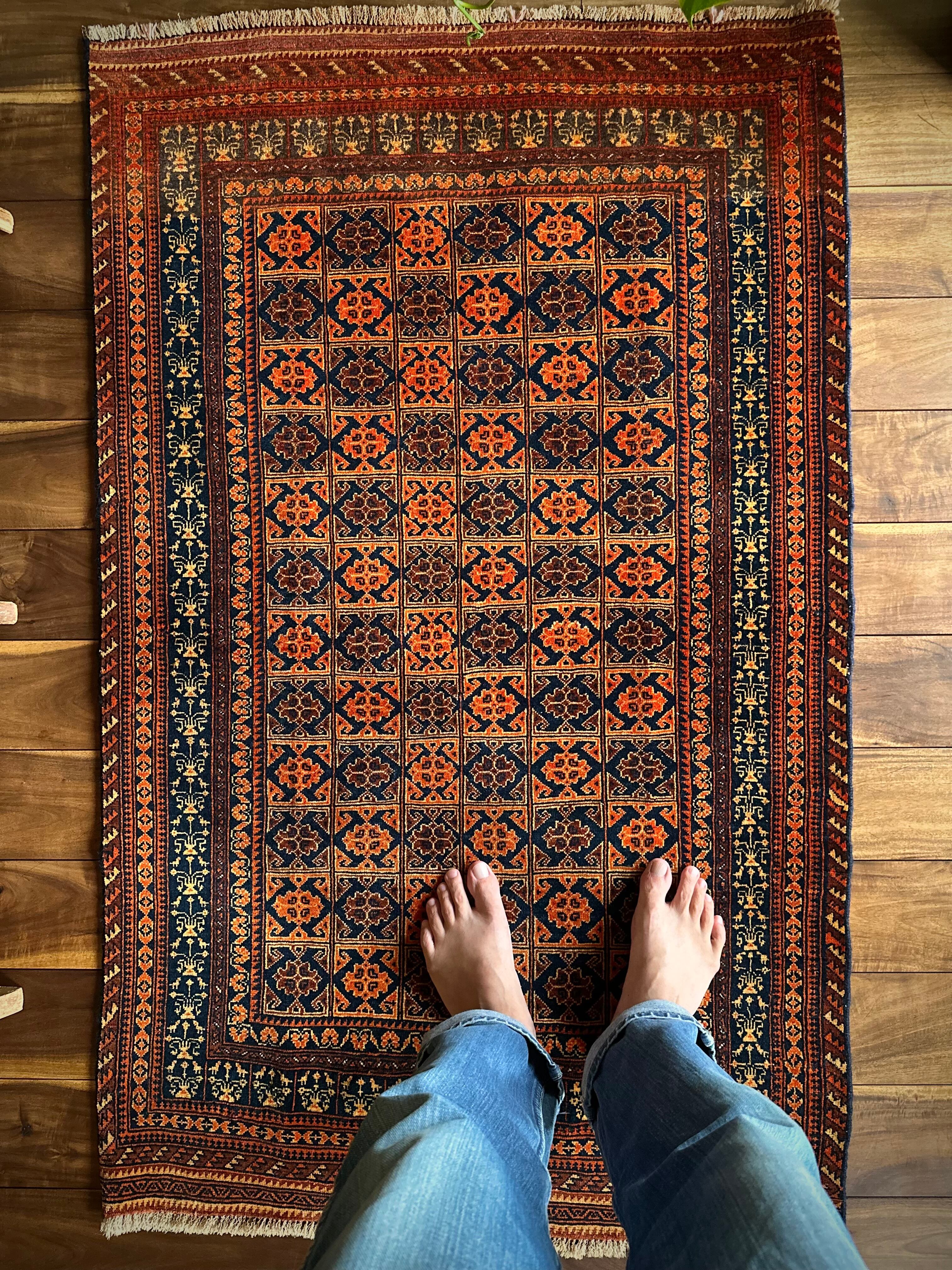 オレンジを基調としながら濃いネイビーとブラウンに合わせたゴールドに輝く輪郭が素晴らしいこちらは、アフガニスタン北部に居住するトルクメン族系のパシュトゥーン人によって手織りされたトライバルラグで、この細やかな手仕事が賞賛されているアリホジャと呼ばれるヴィンテージラグになります。