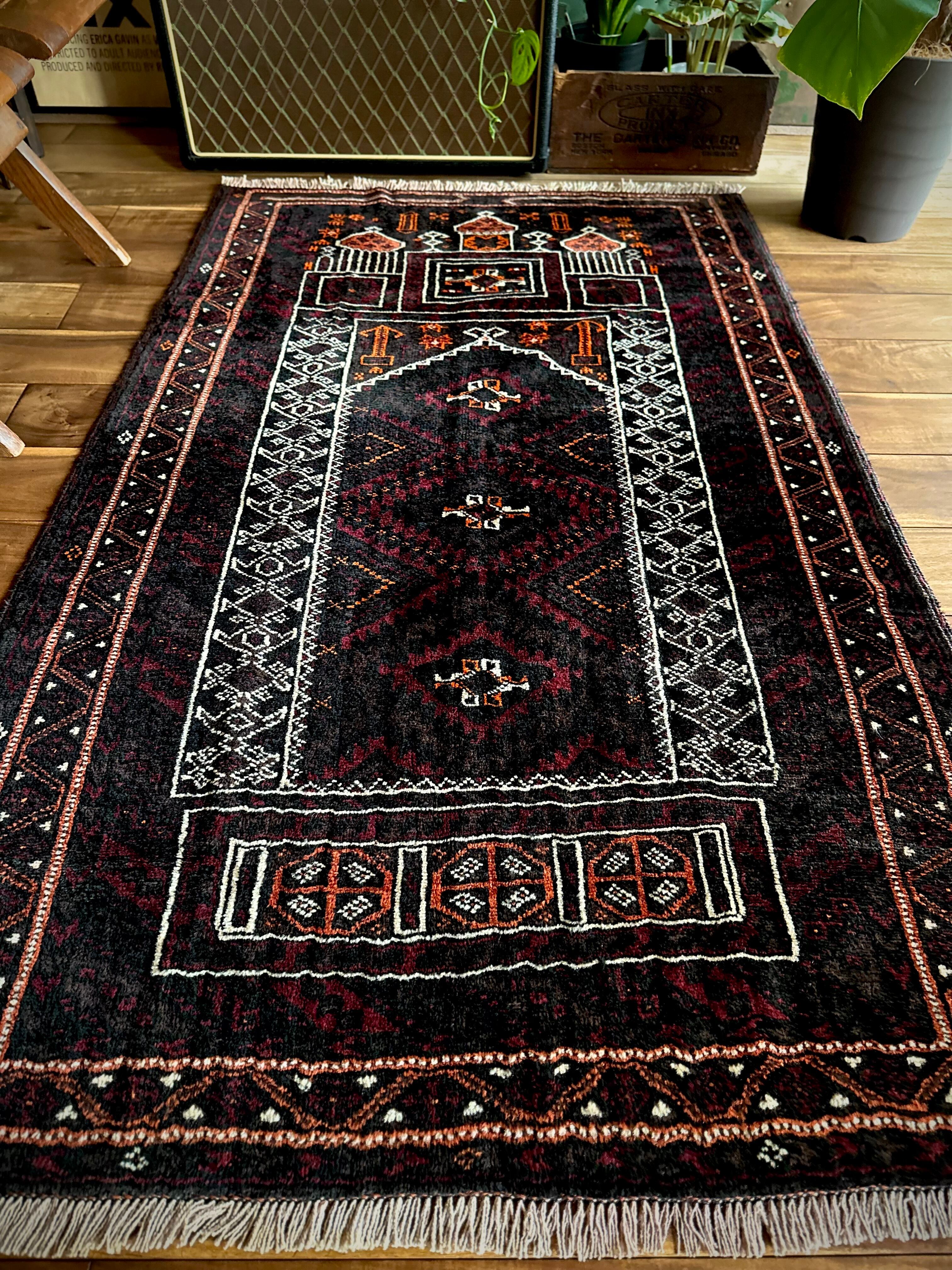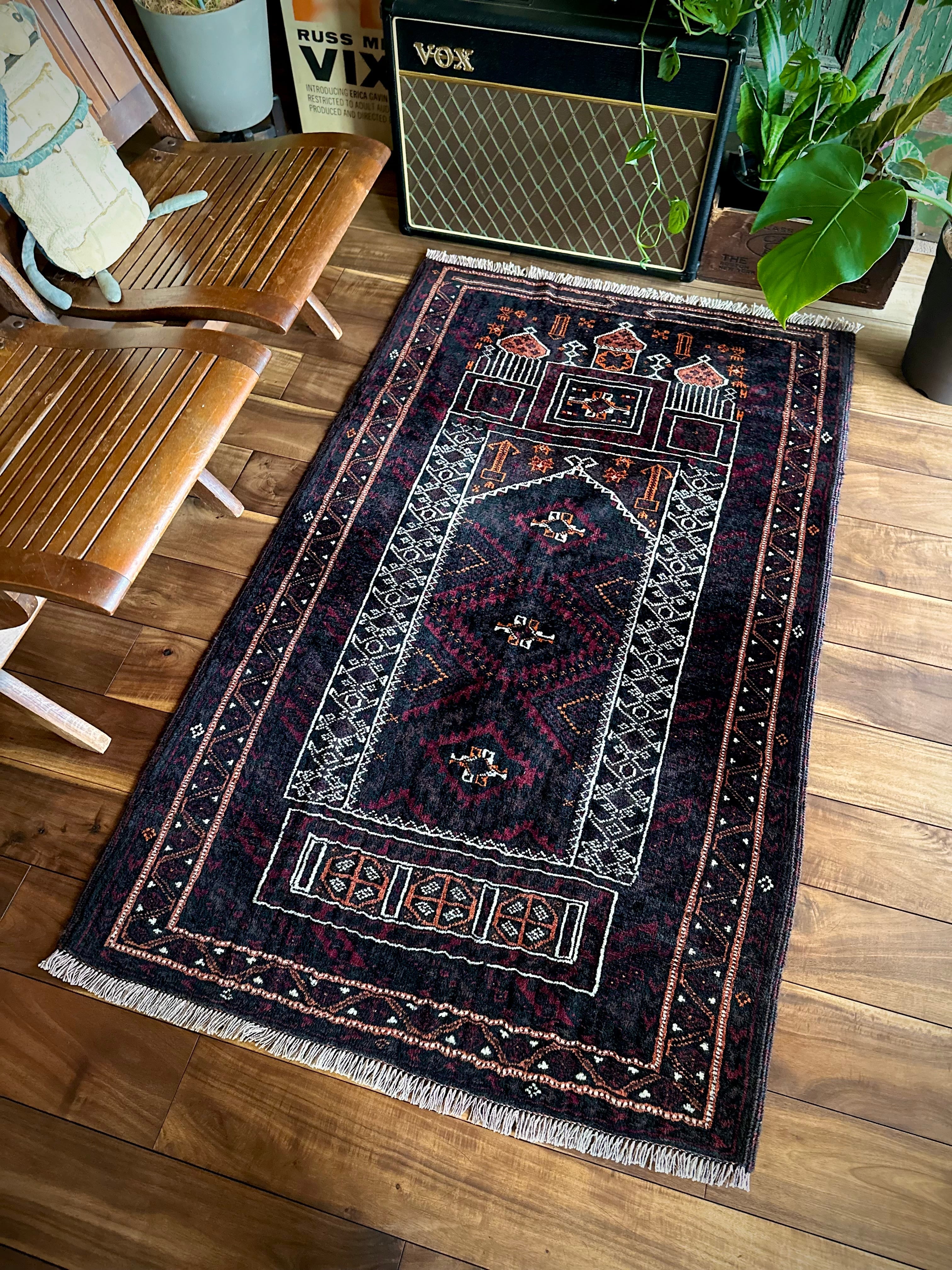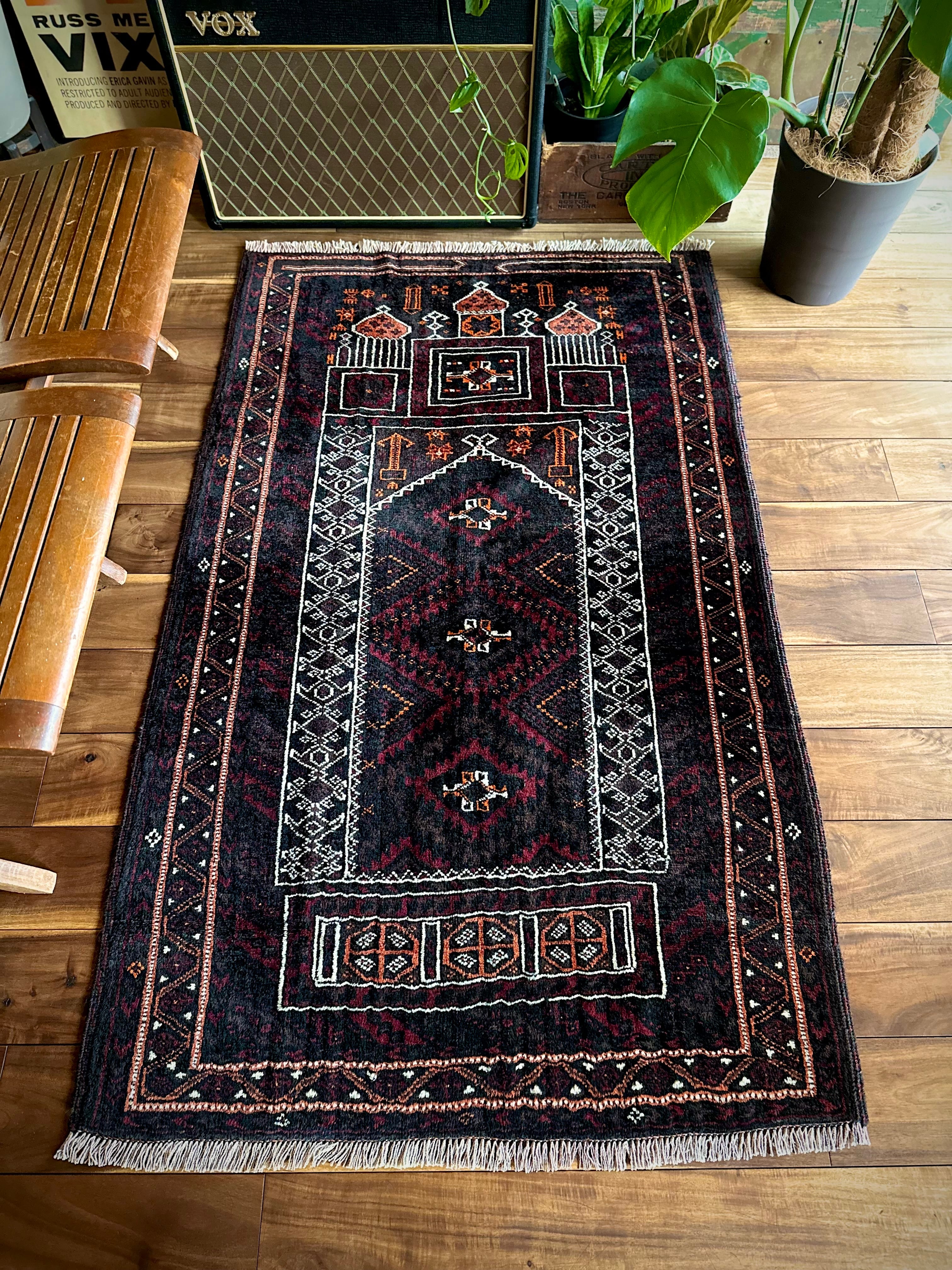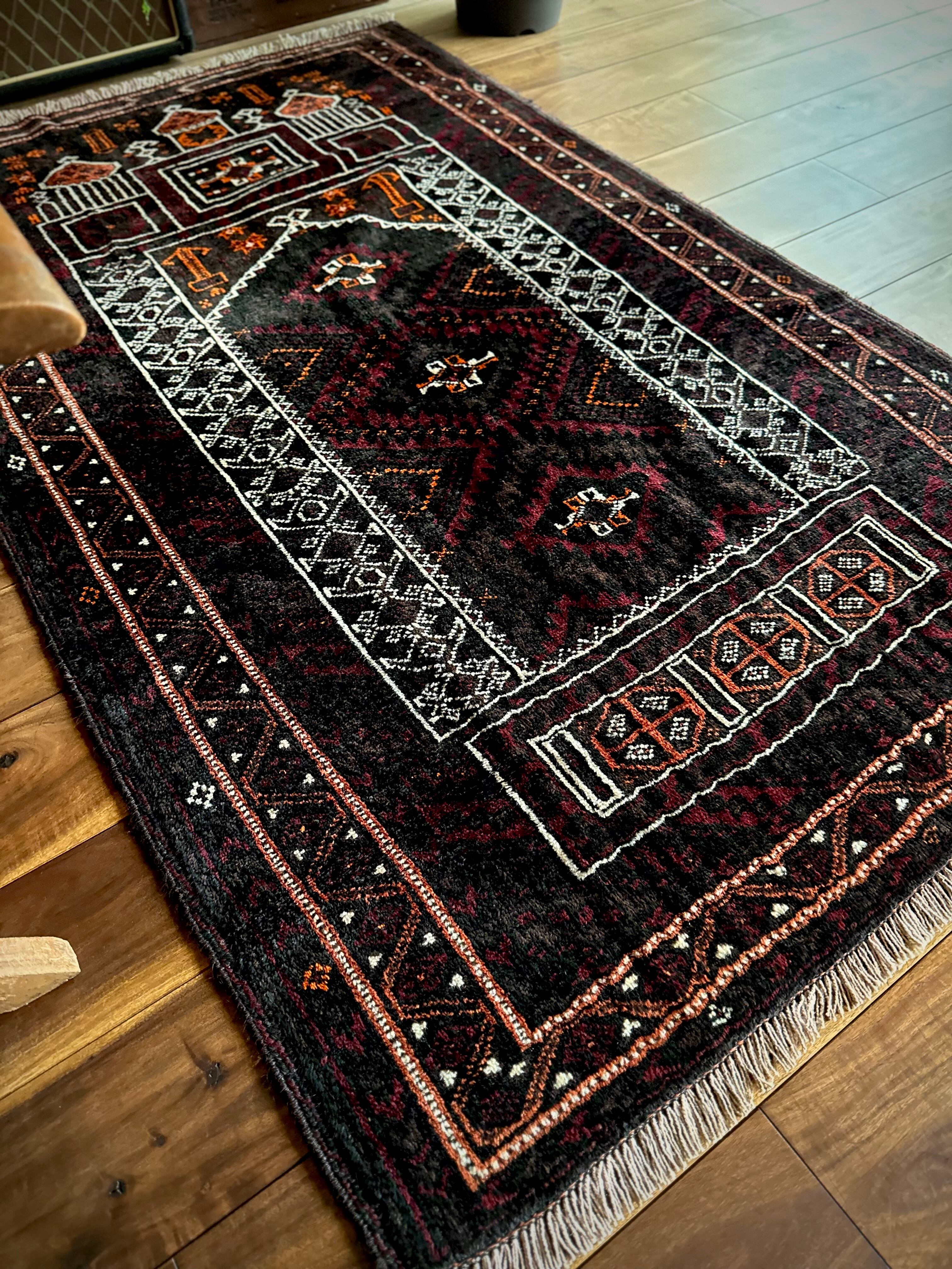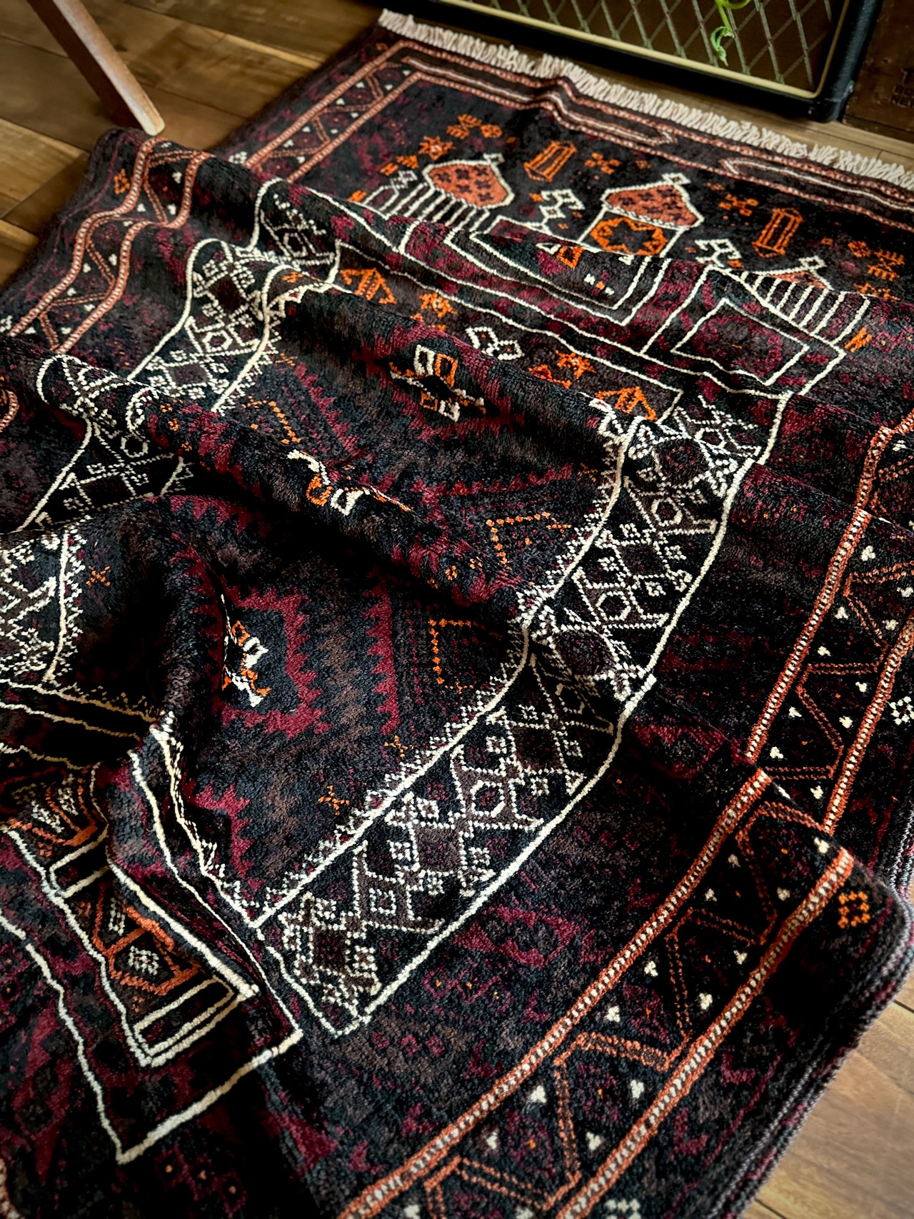 全体的なブラックベースに浮かび上がるオレンジとホワイトが神格さを表しているこちらは、アフガニスタンはヘラート州に居住するバルーチ族のトライバルラグで、モスクがあしらわれた祈祷用のプレイヤーラグになります。