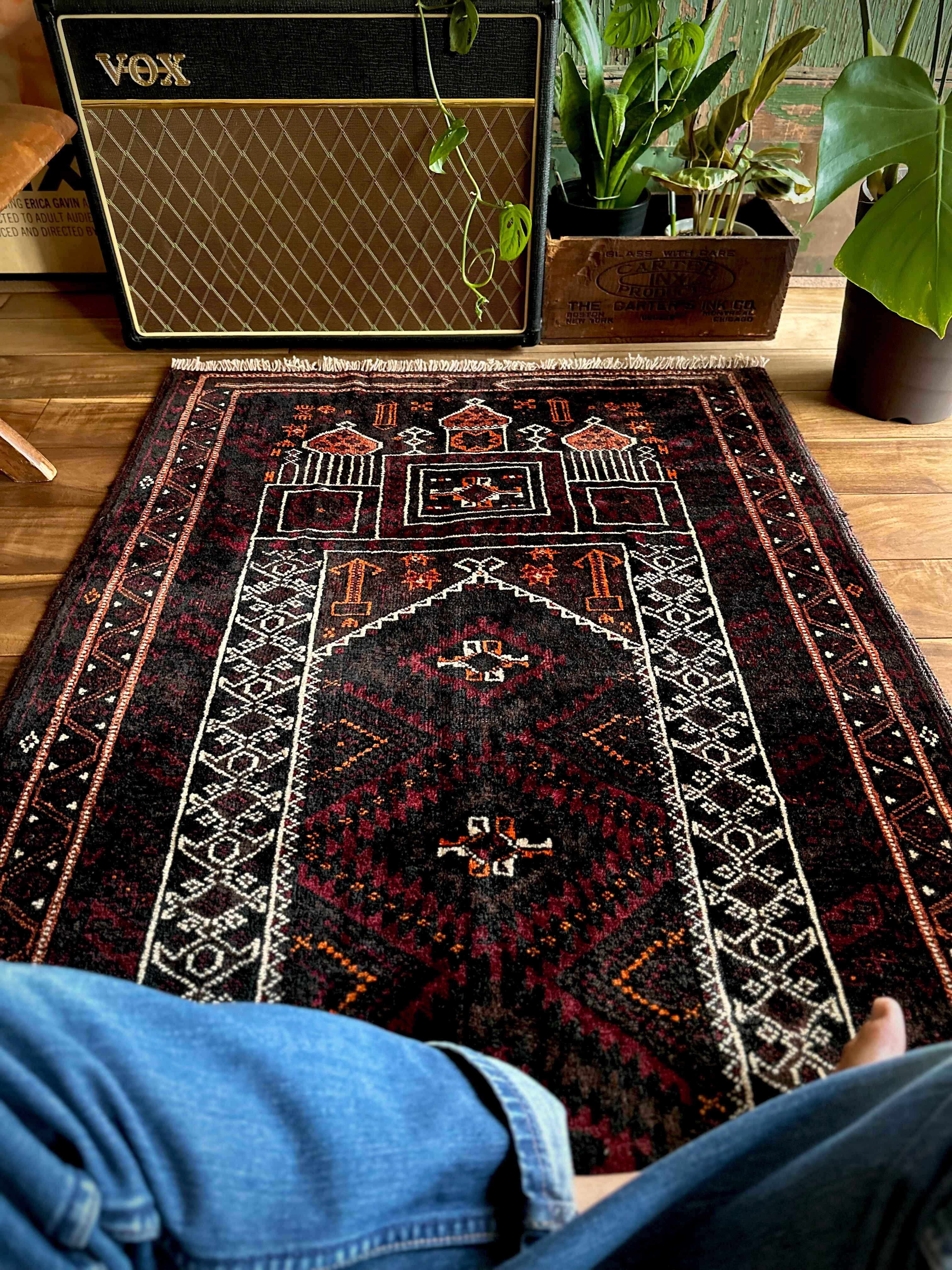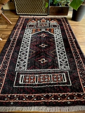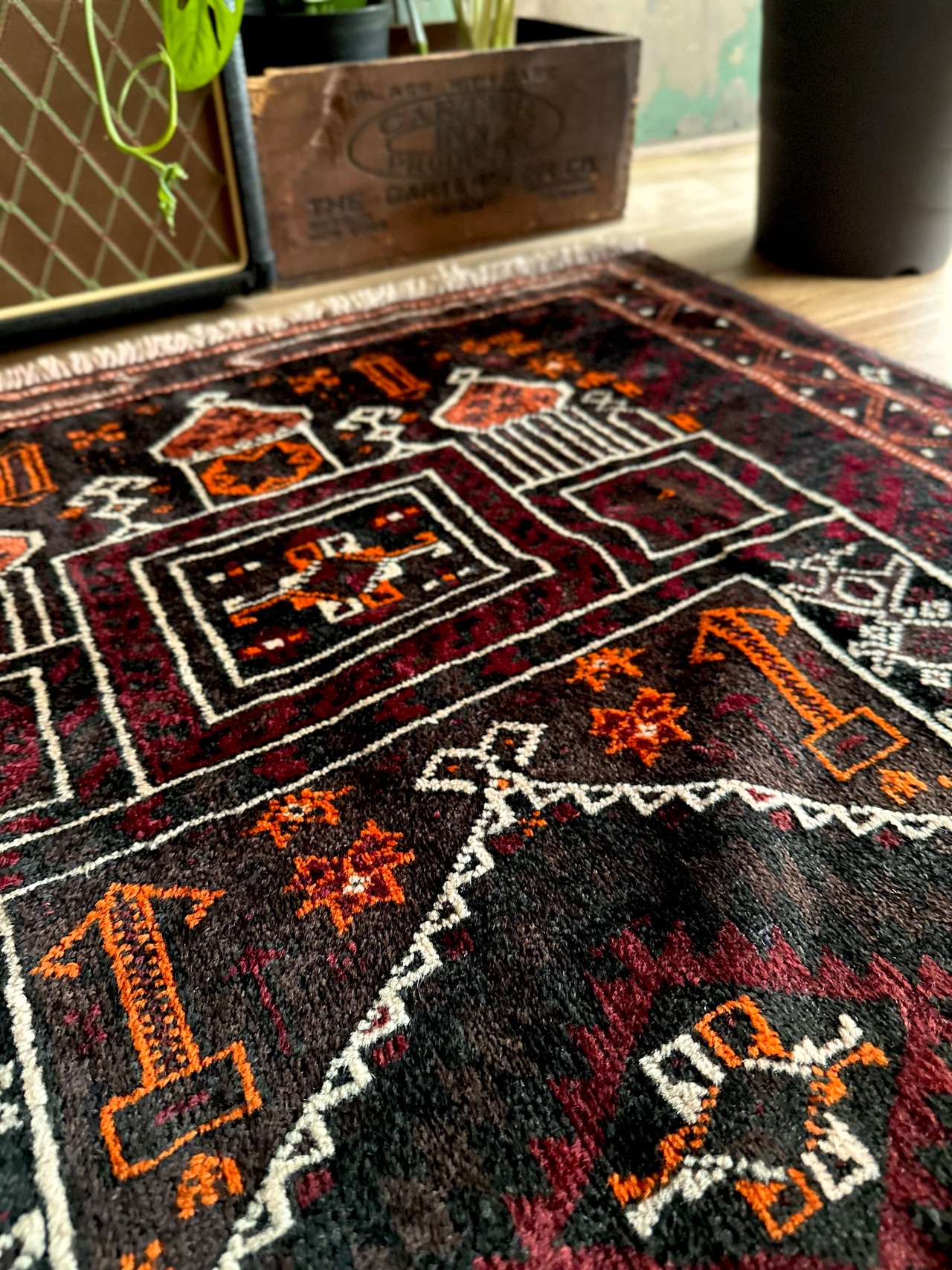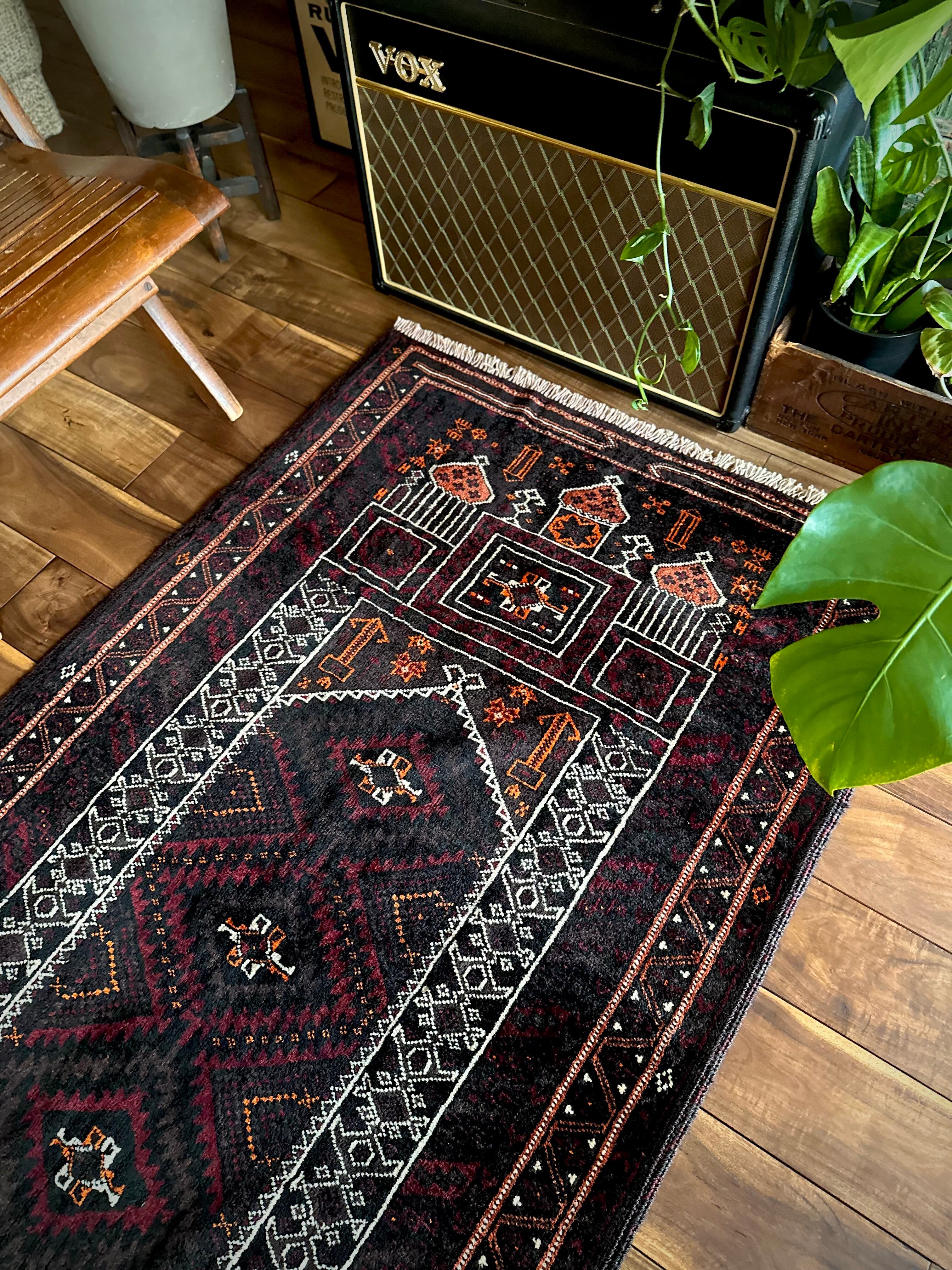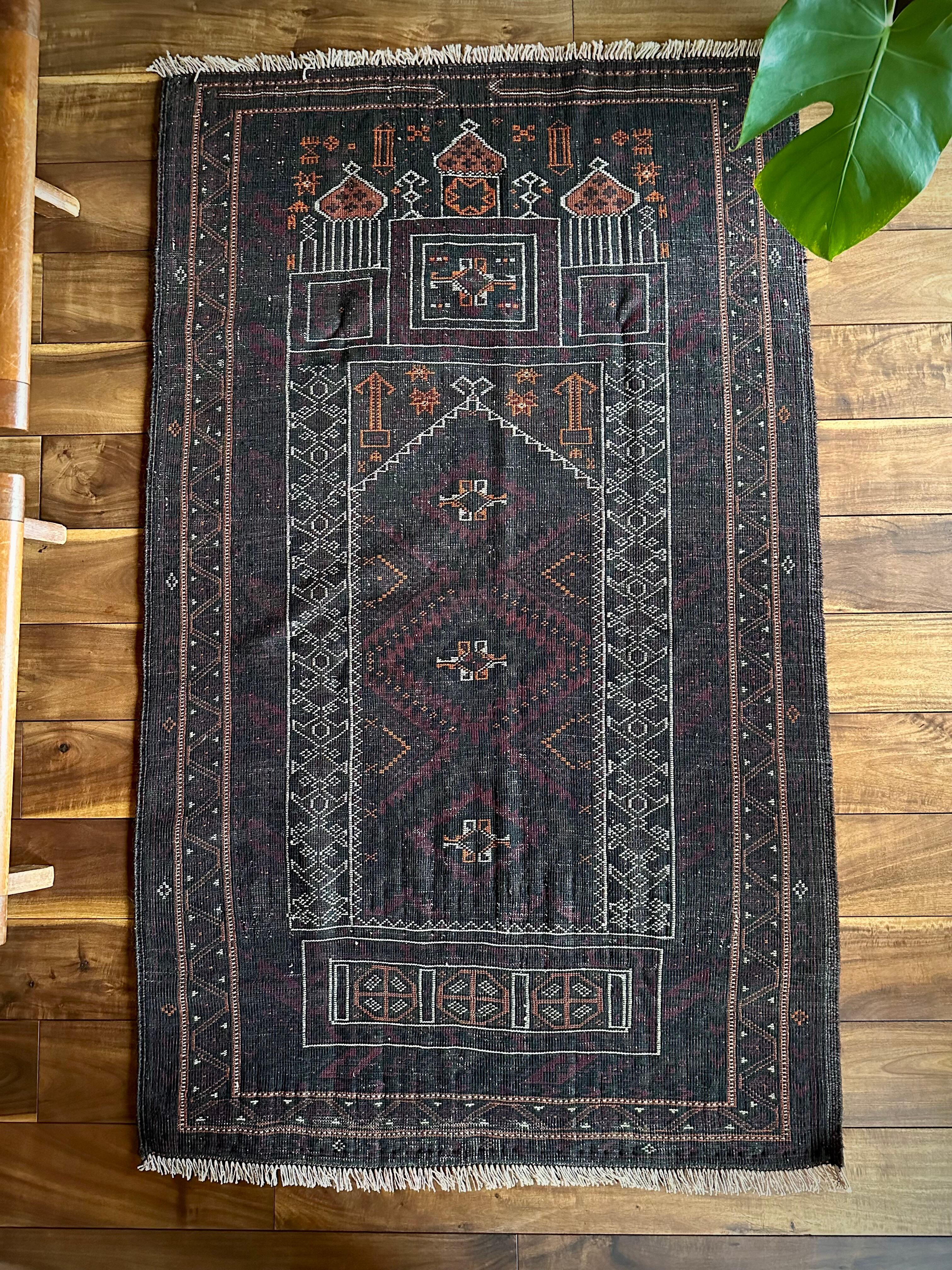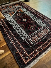 全体的なブラックベースに浮かび上がるオレンジとホワイトが神格さを表しているこちらは、アフガニスタンはヘラート州に居住するバルーチ族のトライバルラグで、モスクがあしらわれた祈祷用のプレイヤーラグになります。