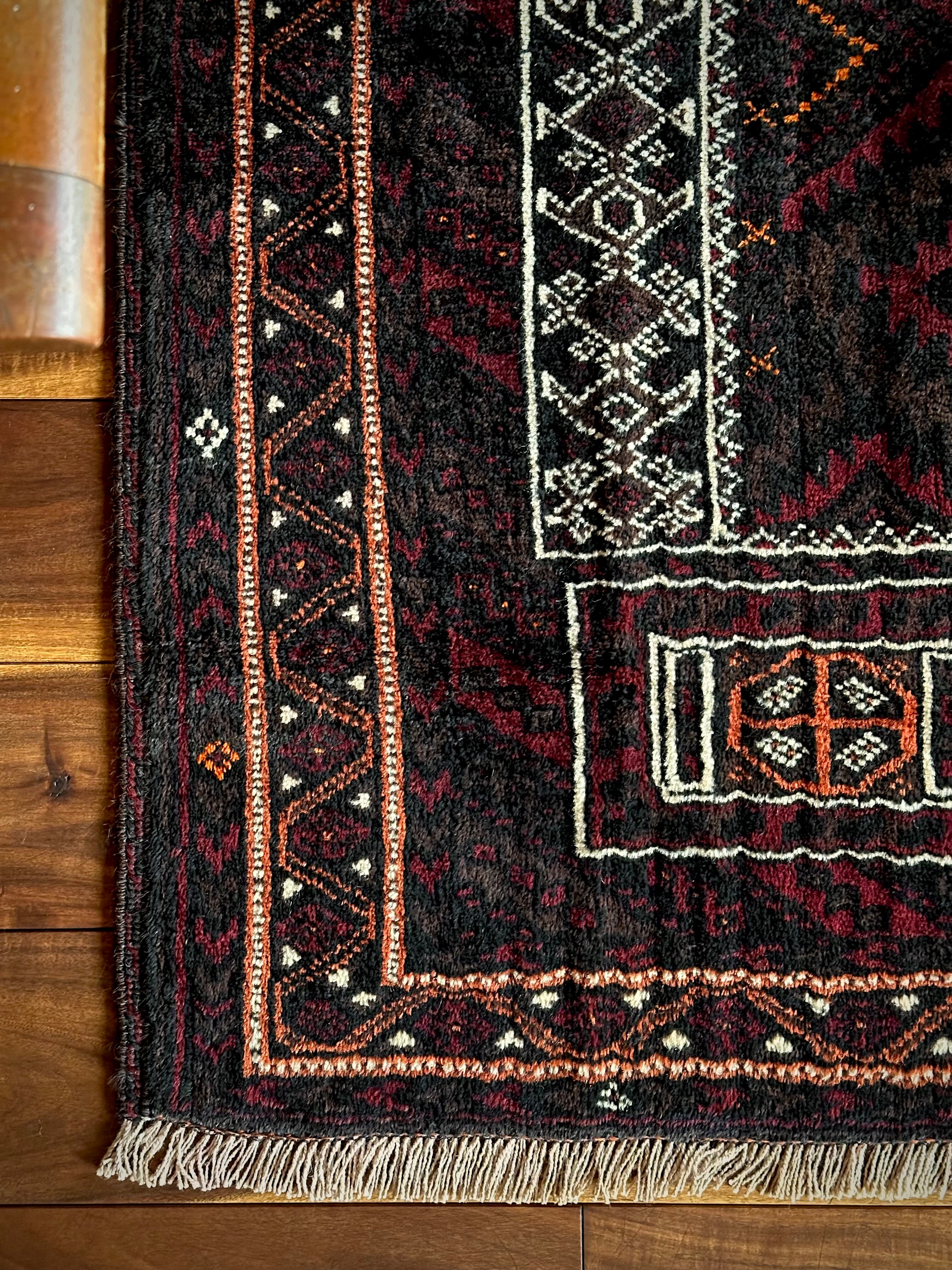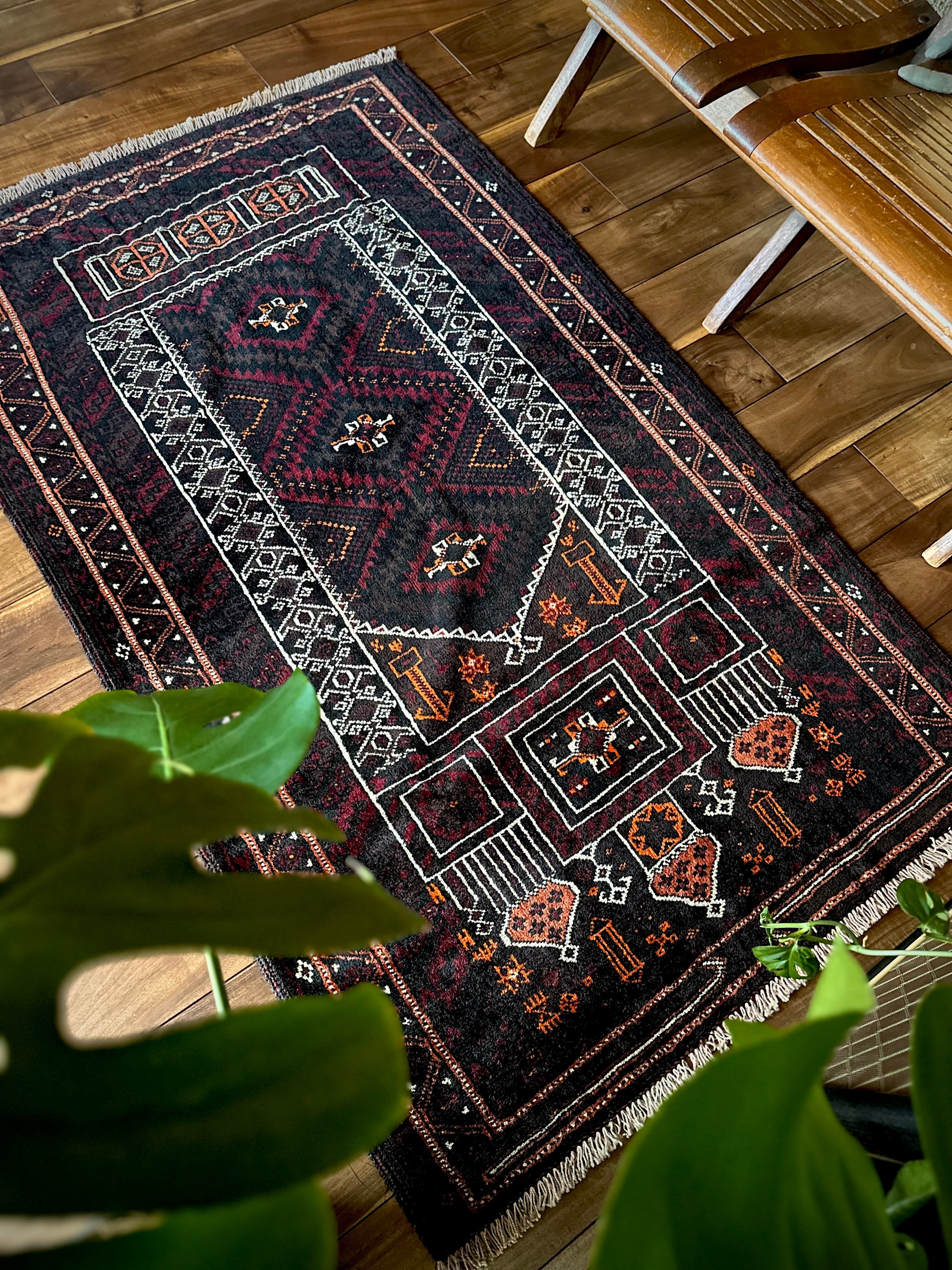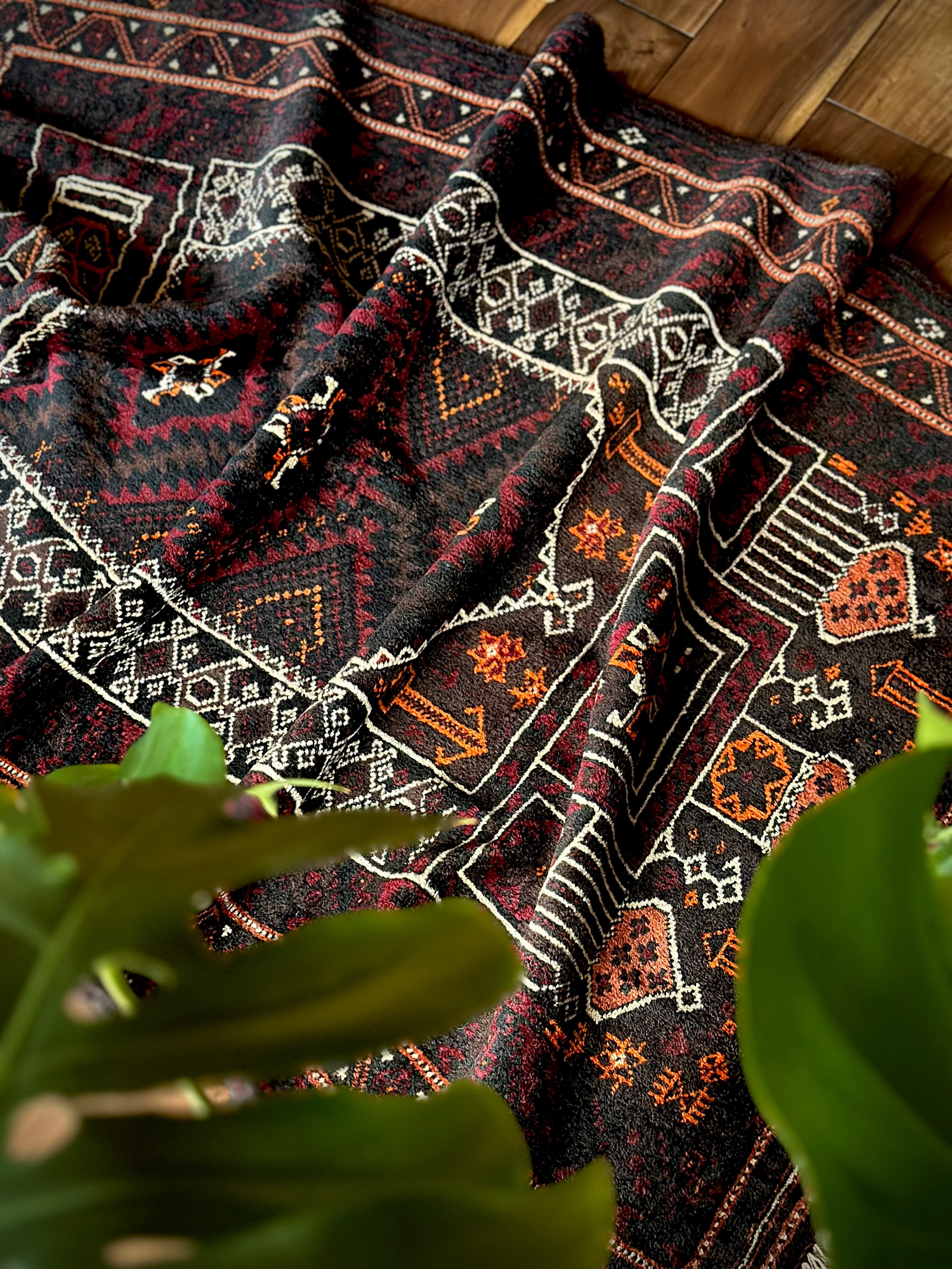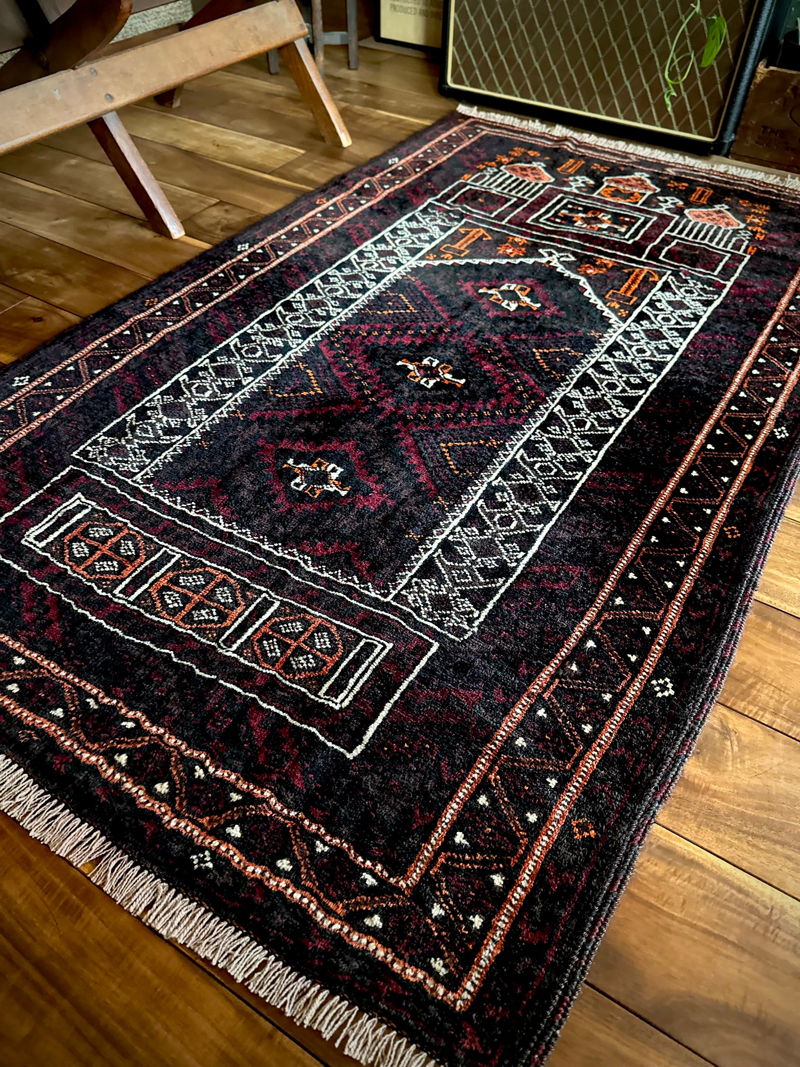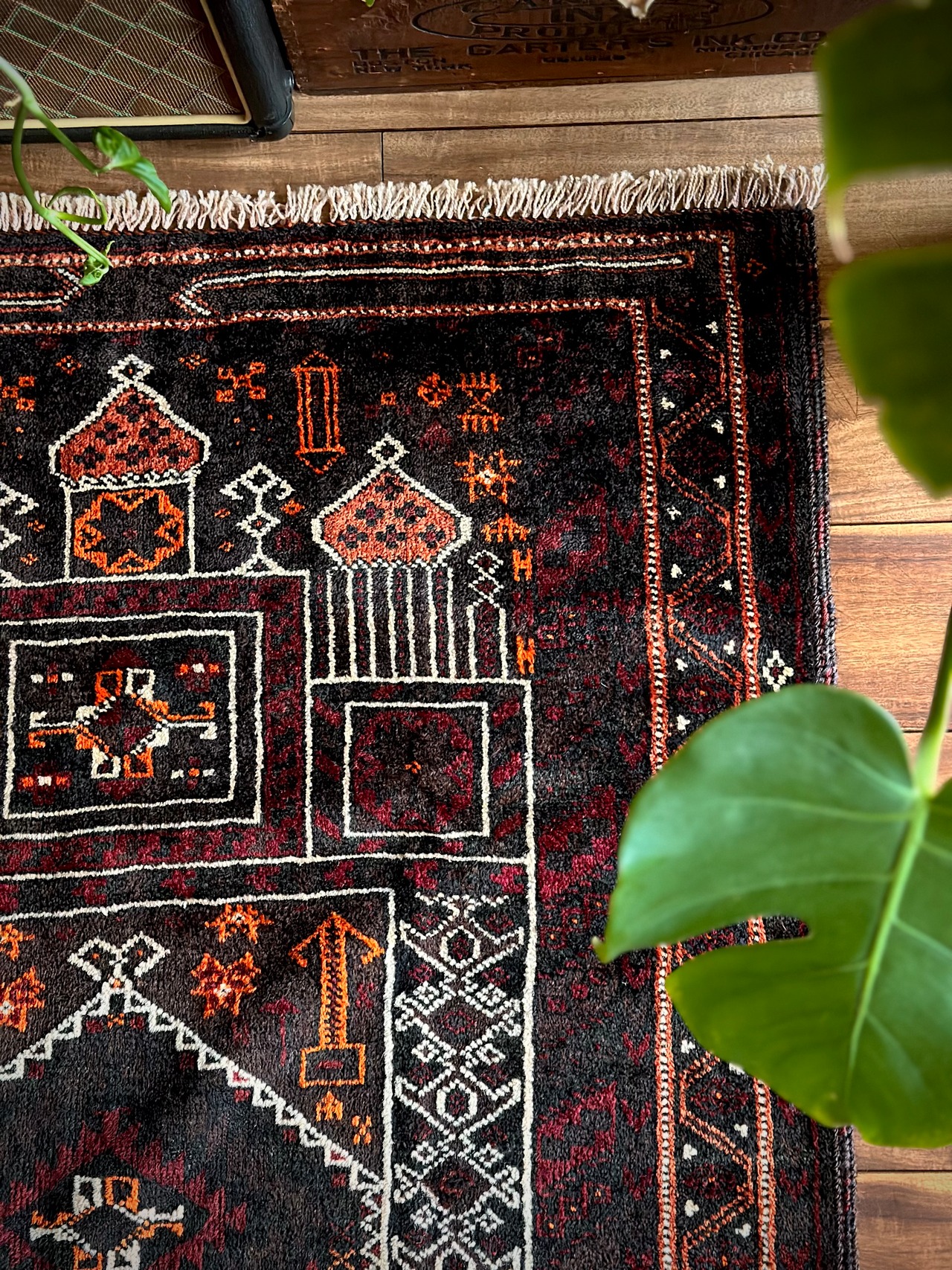 全体的なブラックベースに浮かび上がるオレンジとホワイトが神格さを表しているこちらは、アフガニスタンはヘラート州に居住するバルーチ族のトライバルラグで、モスクがあしらわれた祈祷用のプレイヤーラグになります。
