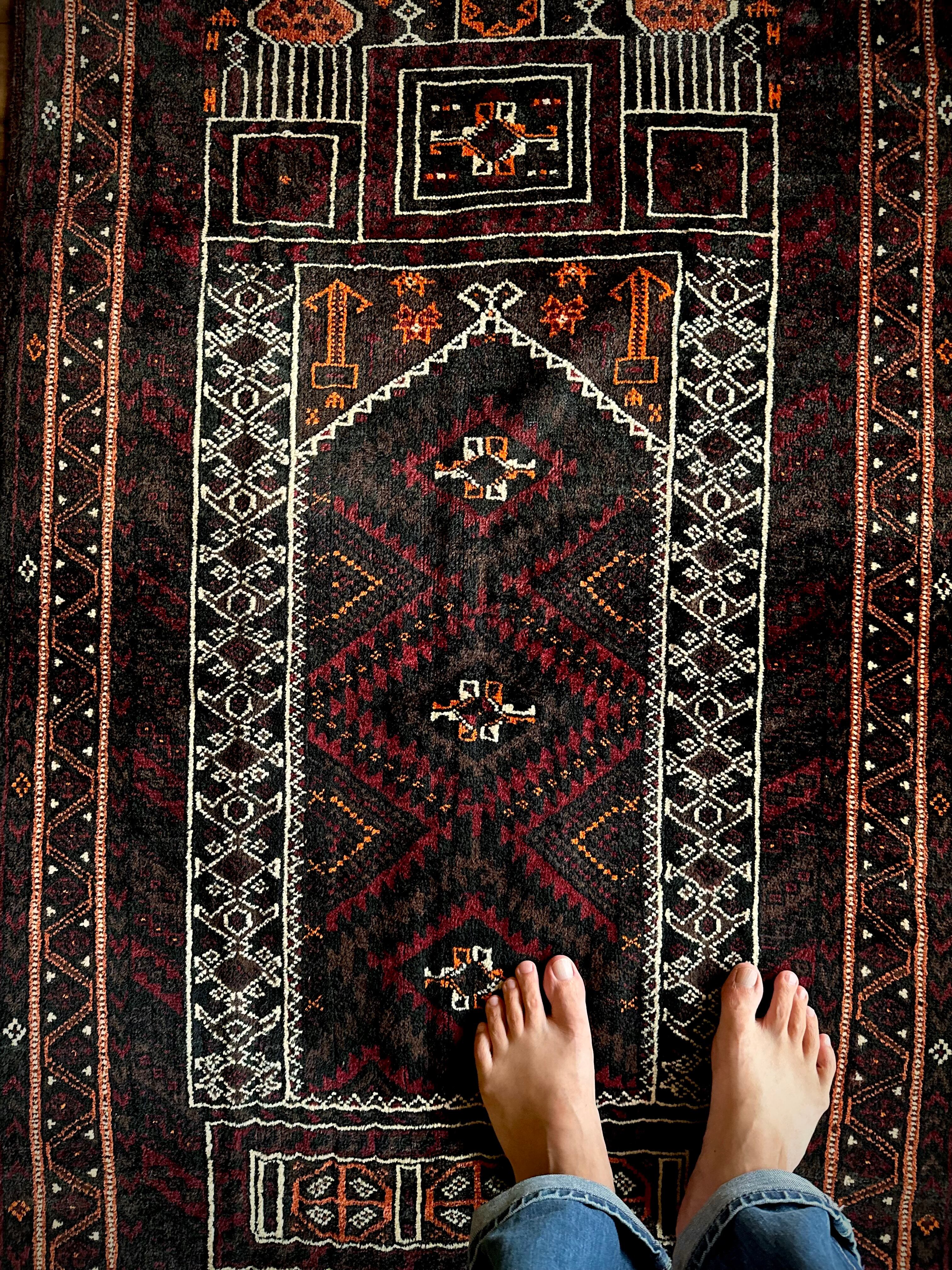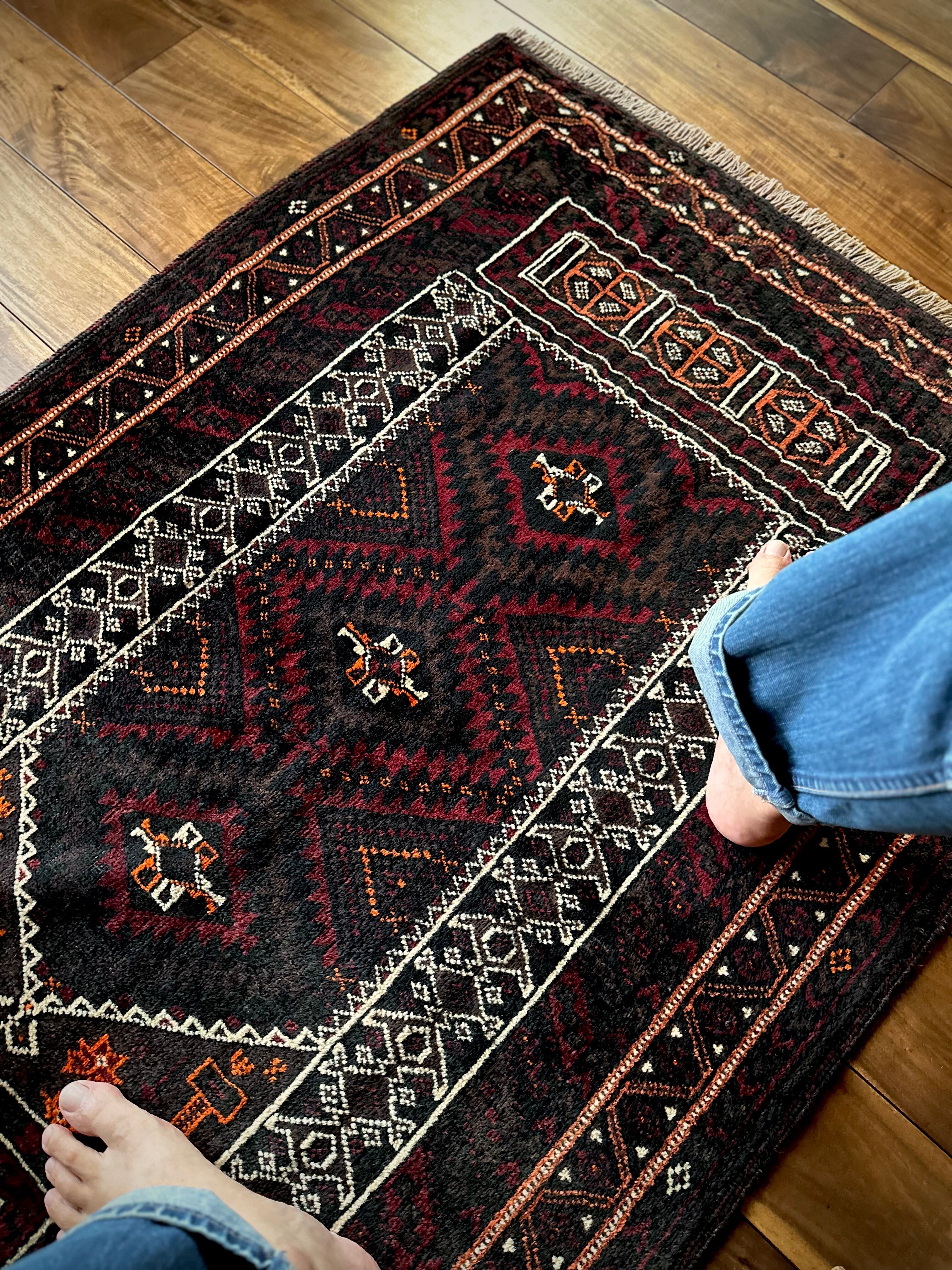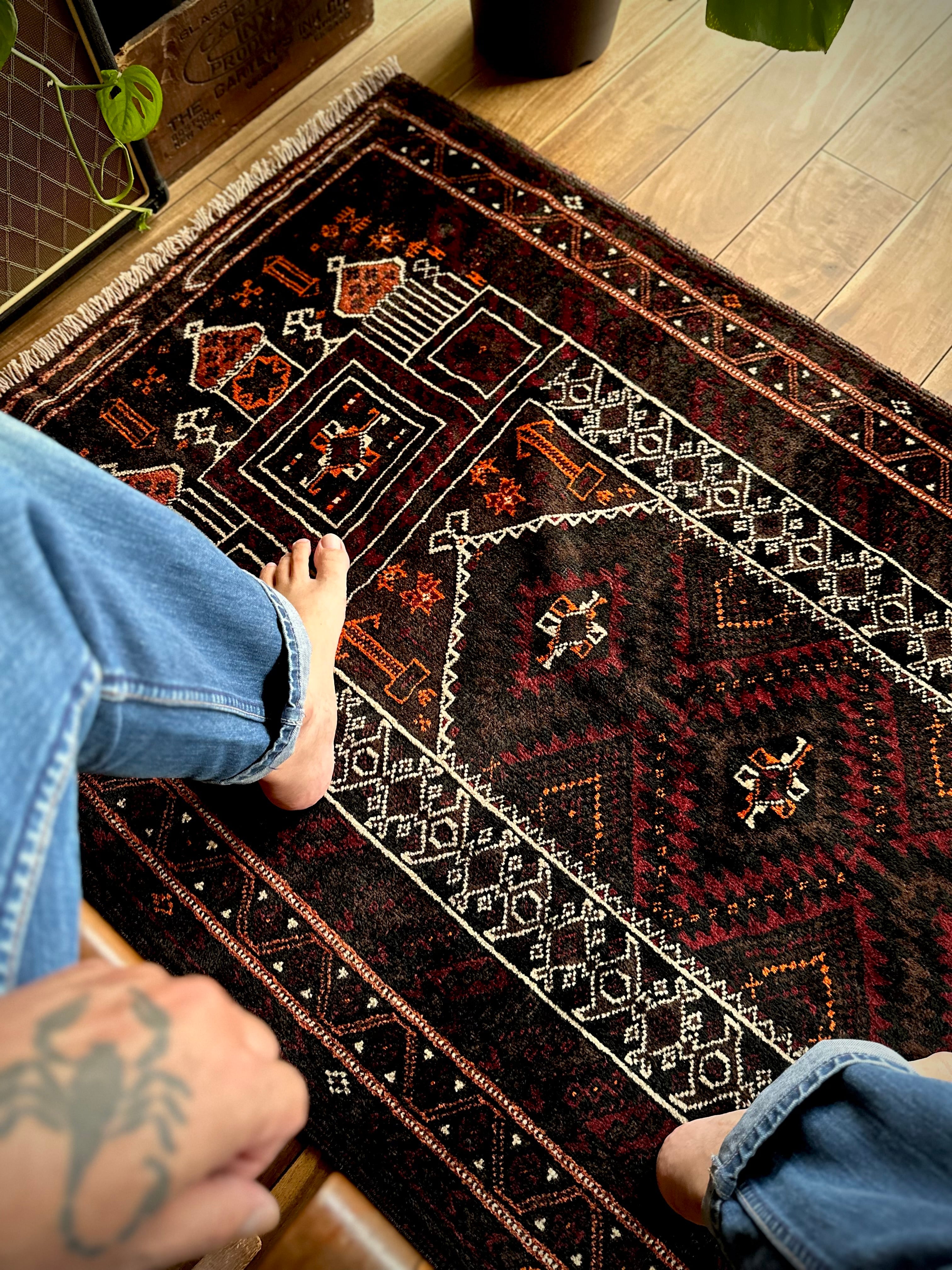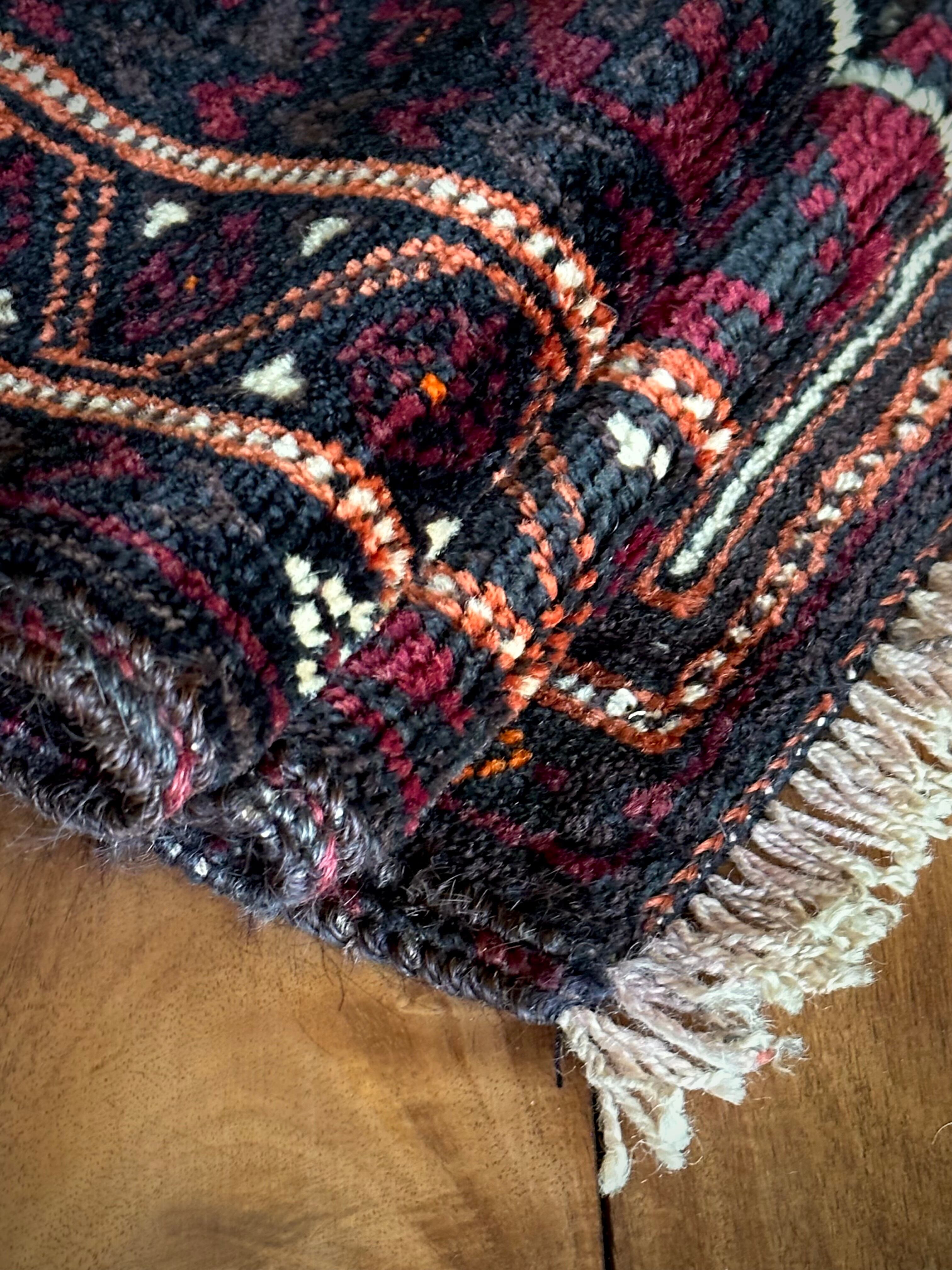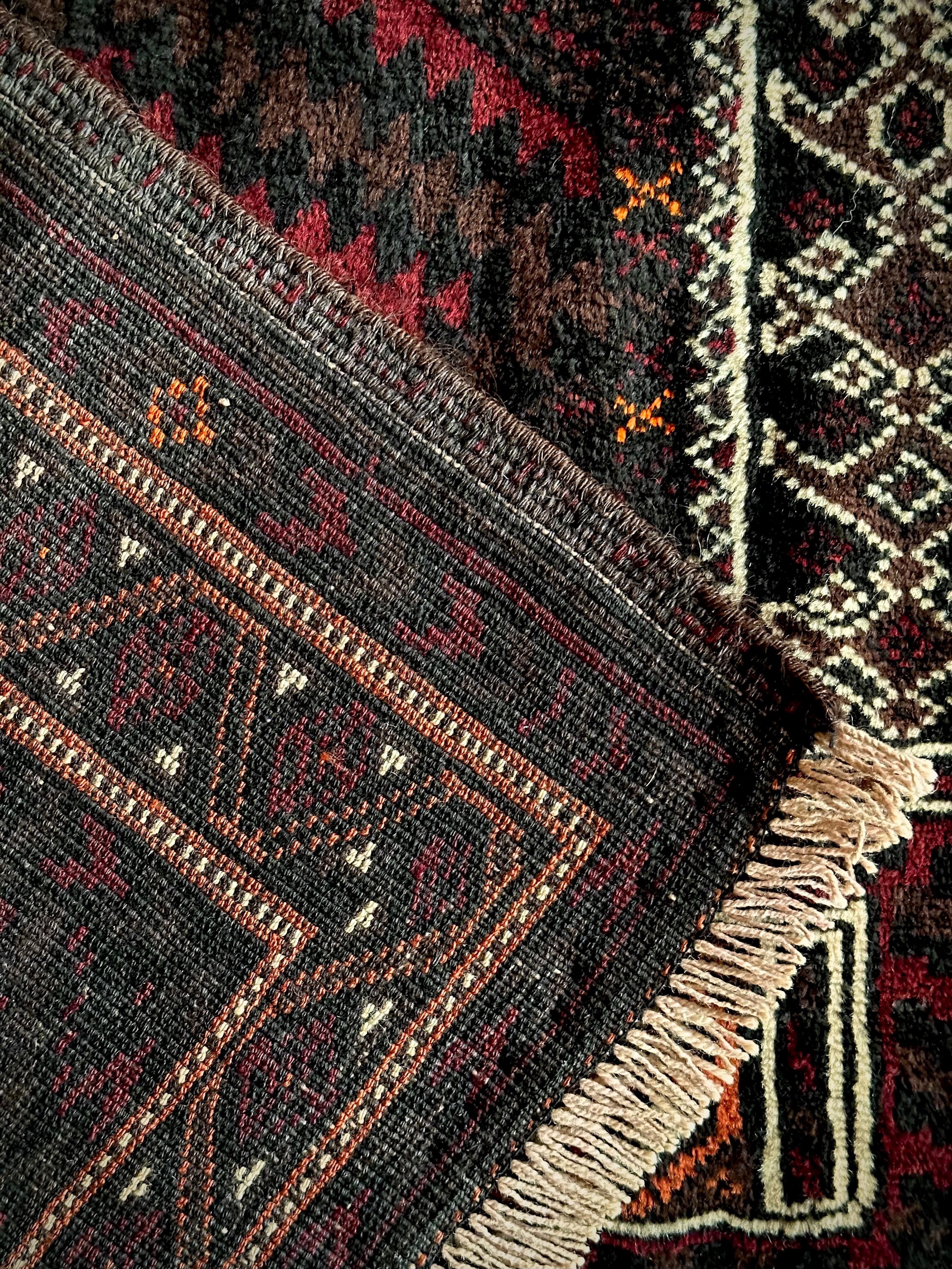 全体的なブラックベースに浮かび上がるオレンジとホワイトが神格さを表しているこちらは、アフガニスタンはヘラート州に居住するバルーチ族のトライバルラグで、モスクがあしらわれた祈祷用のプレイヤーラグになります。