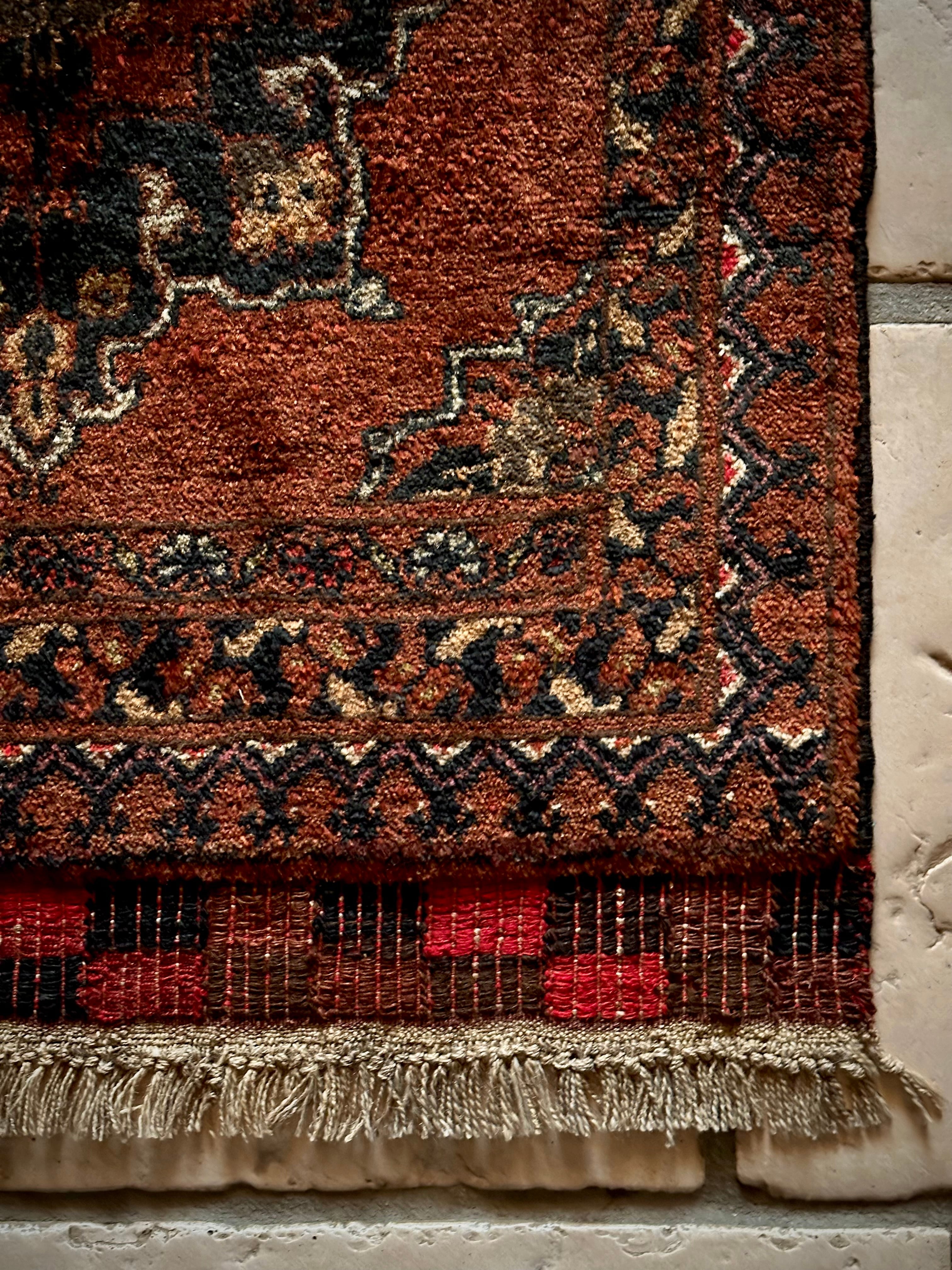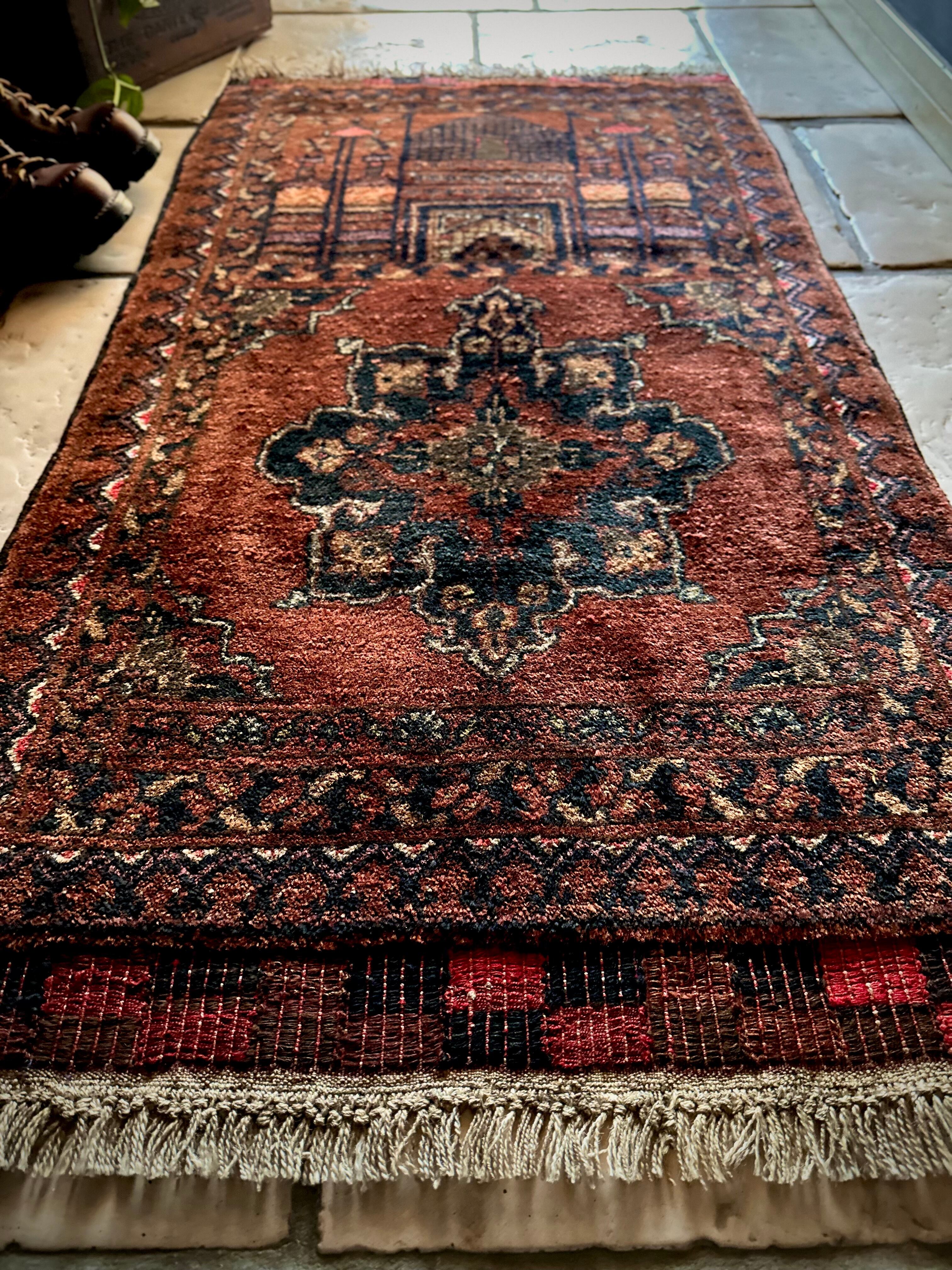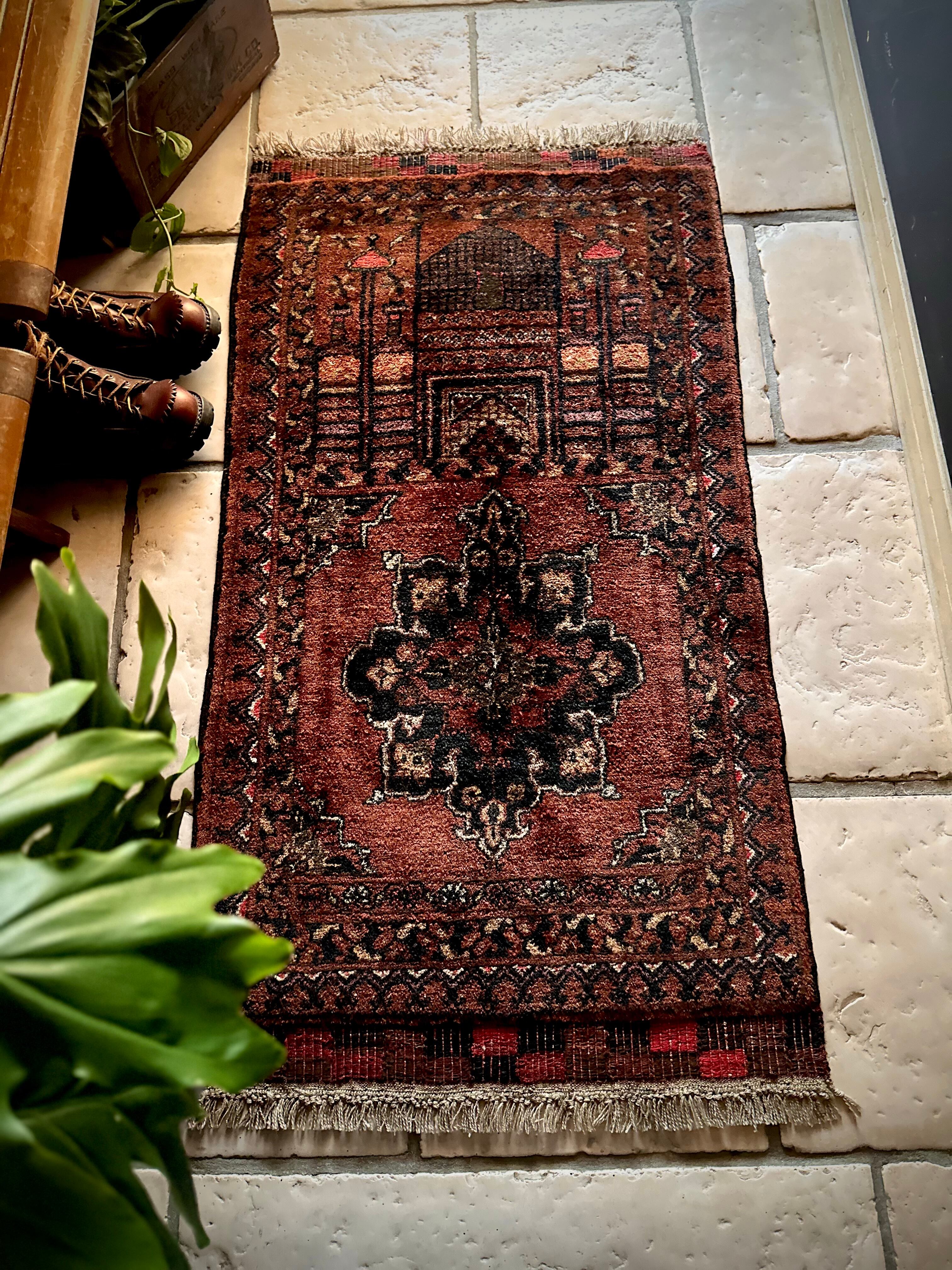 ブラウンのベースにモスクとメダリオンが描かれたどっしりとした雰囲気のこちらは、アフガニスタン北部に居住するトルクメン族のトライバルラグで、トルクメンにしては珍しい祈祷用のプレイヤーラグになります。