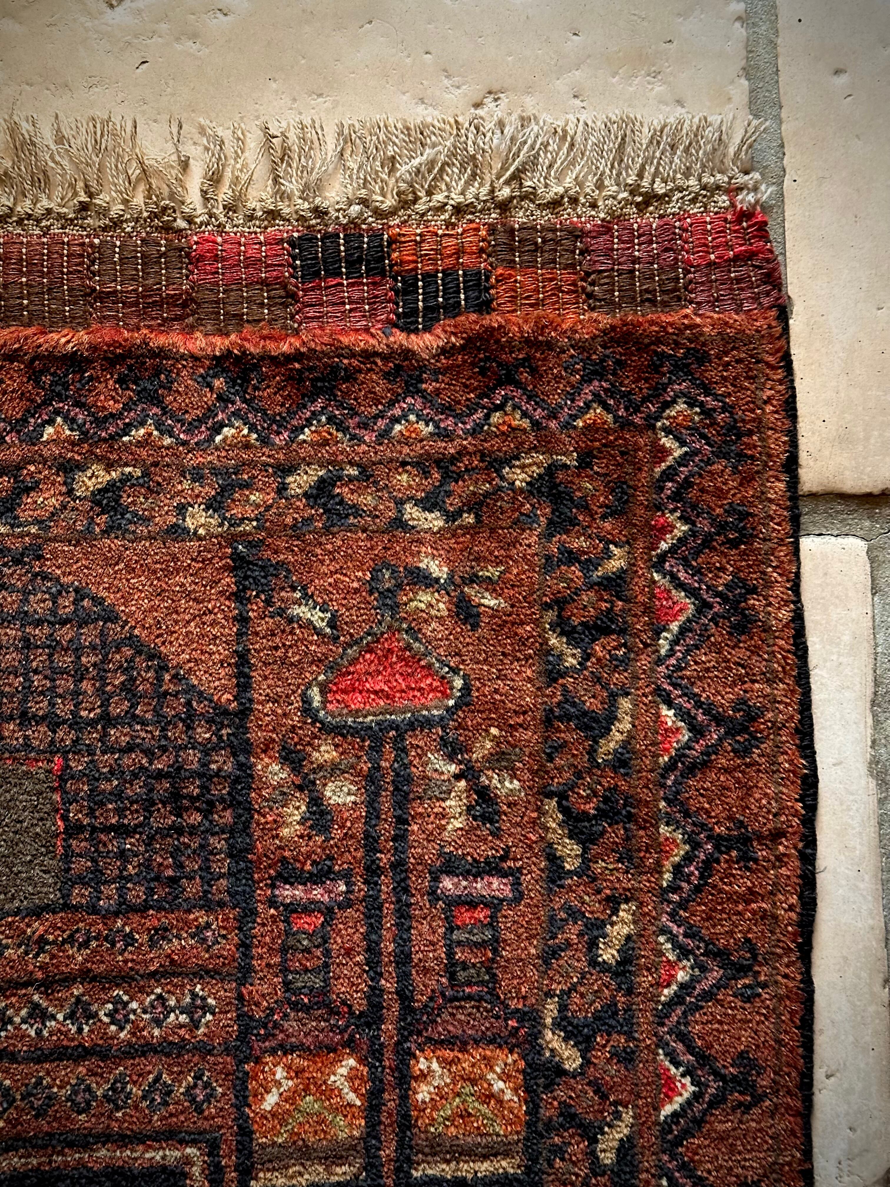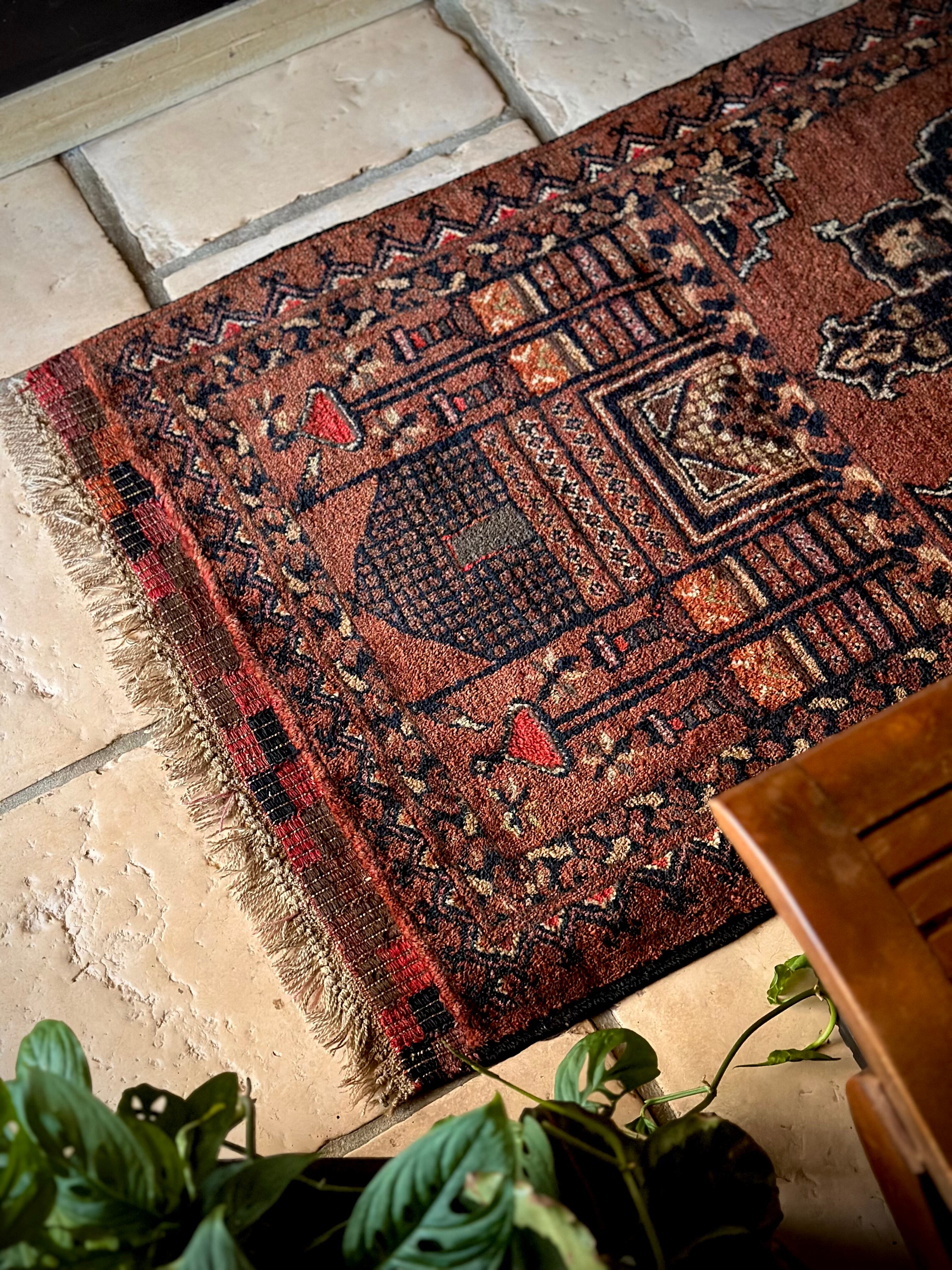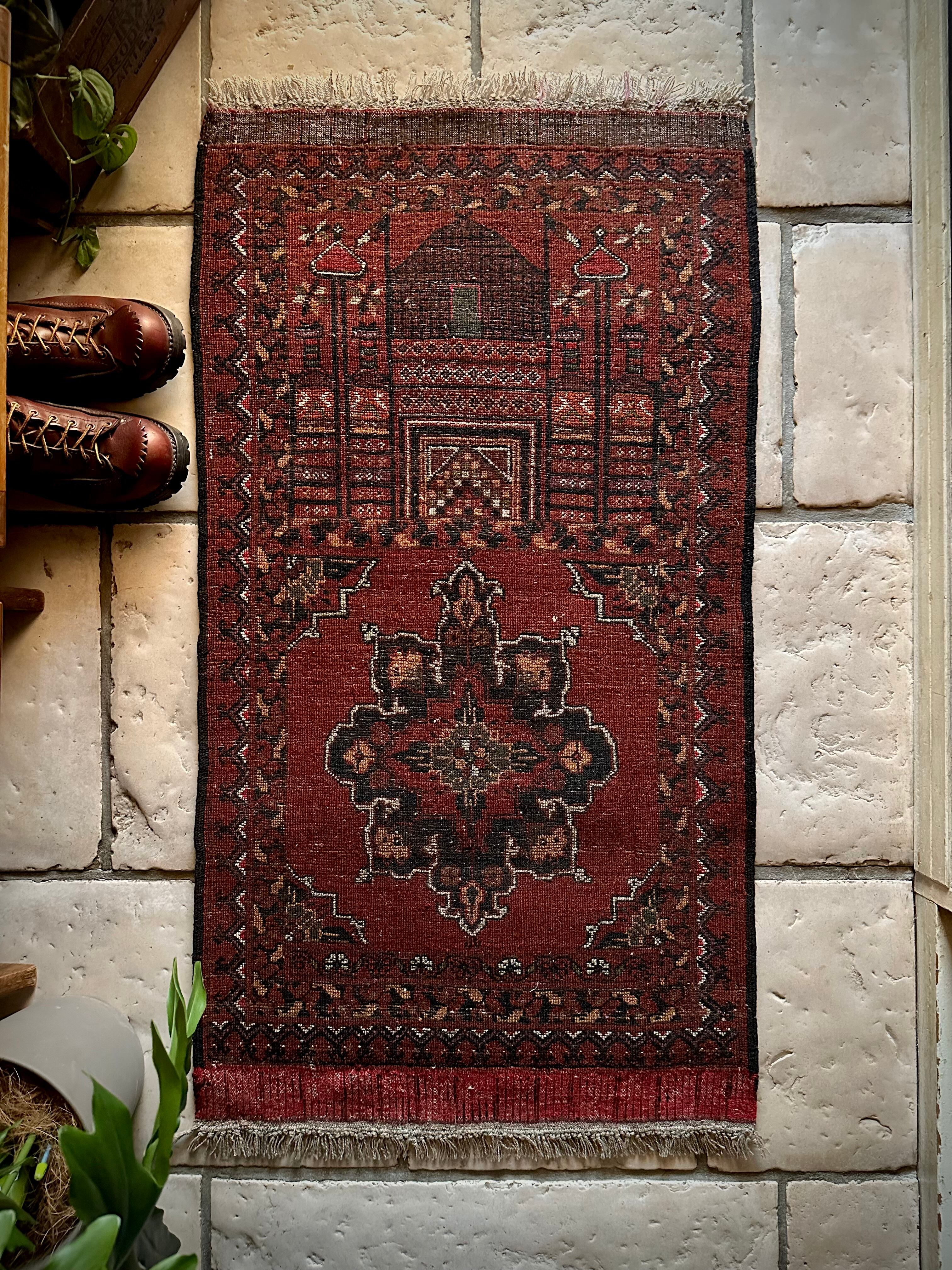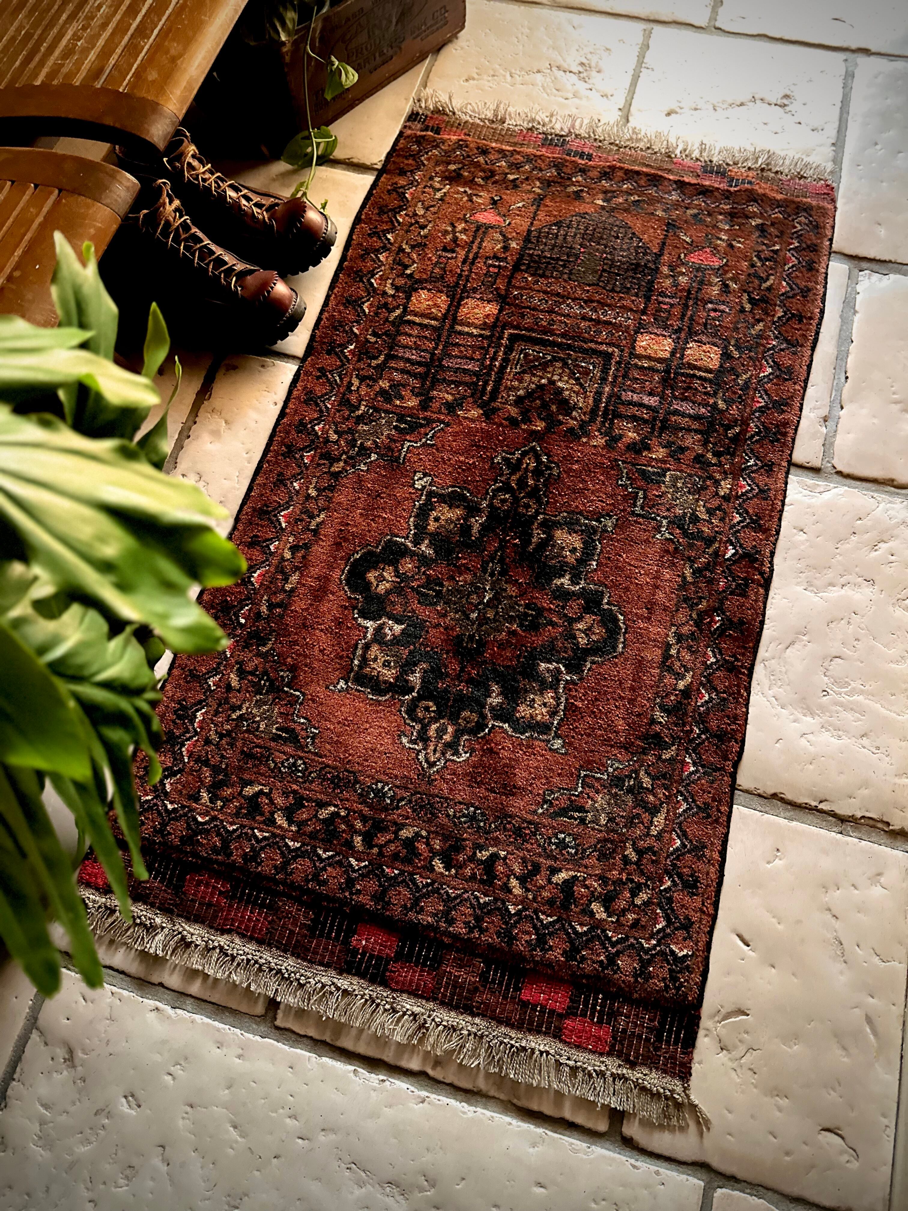 ブラウンのベースにモスクとメダリオンが描かれたどっしりとした雰囲気のこちらは、アフガニスタン北部に居住するトルクメン族のトライバルラグで、トルクメンにしては珍しい祈祷用のプレイヤーラグになります。