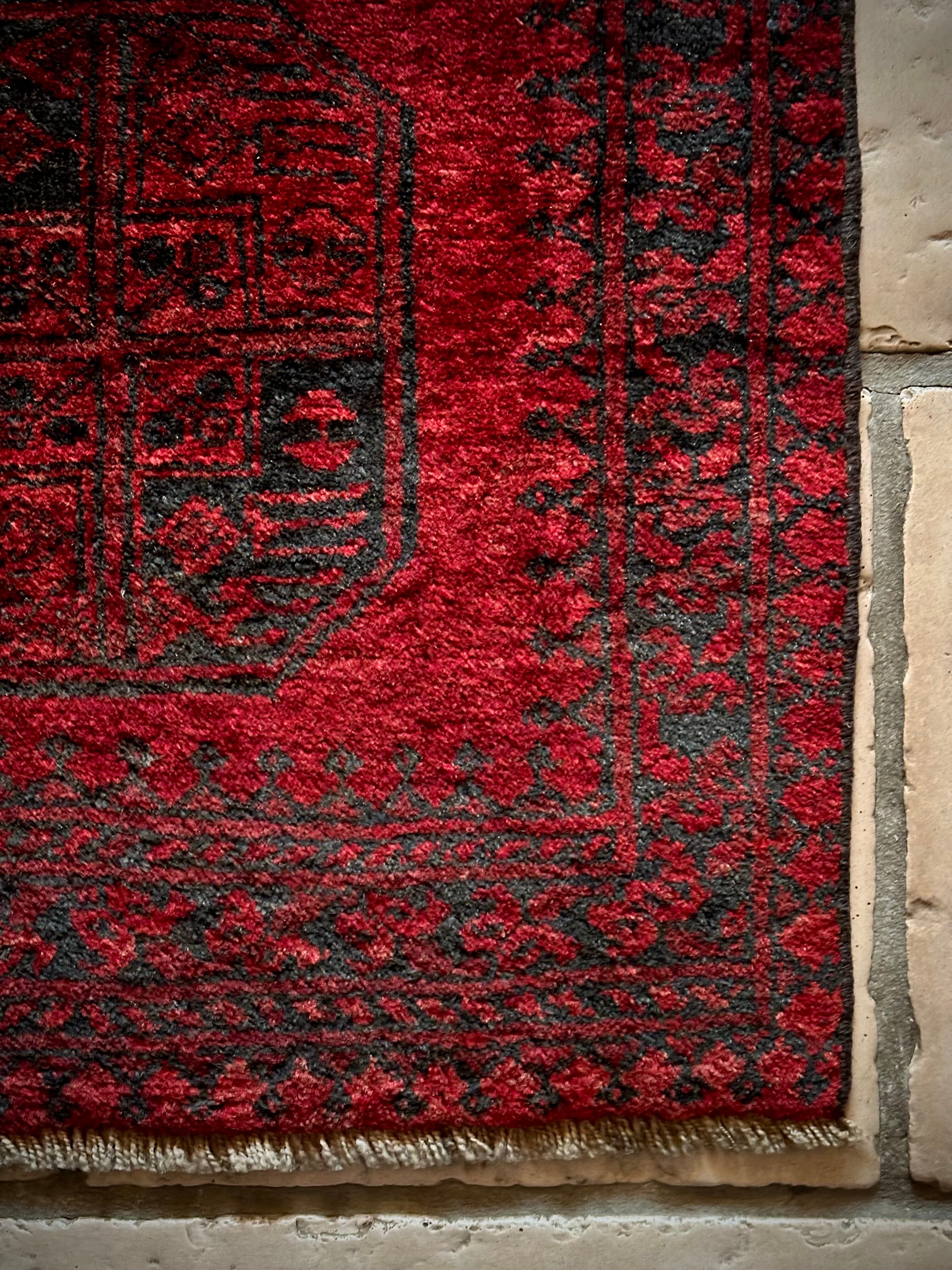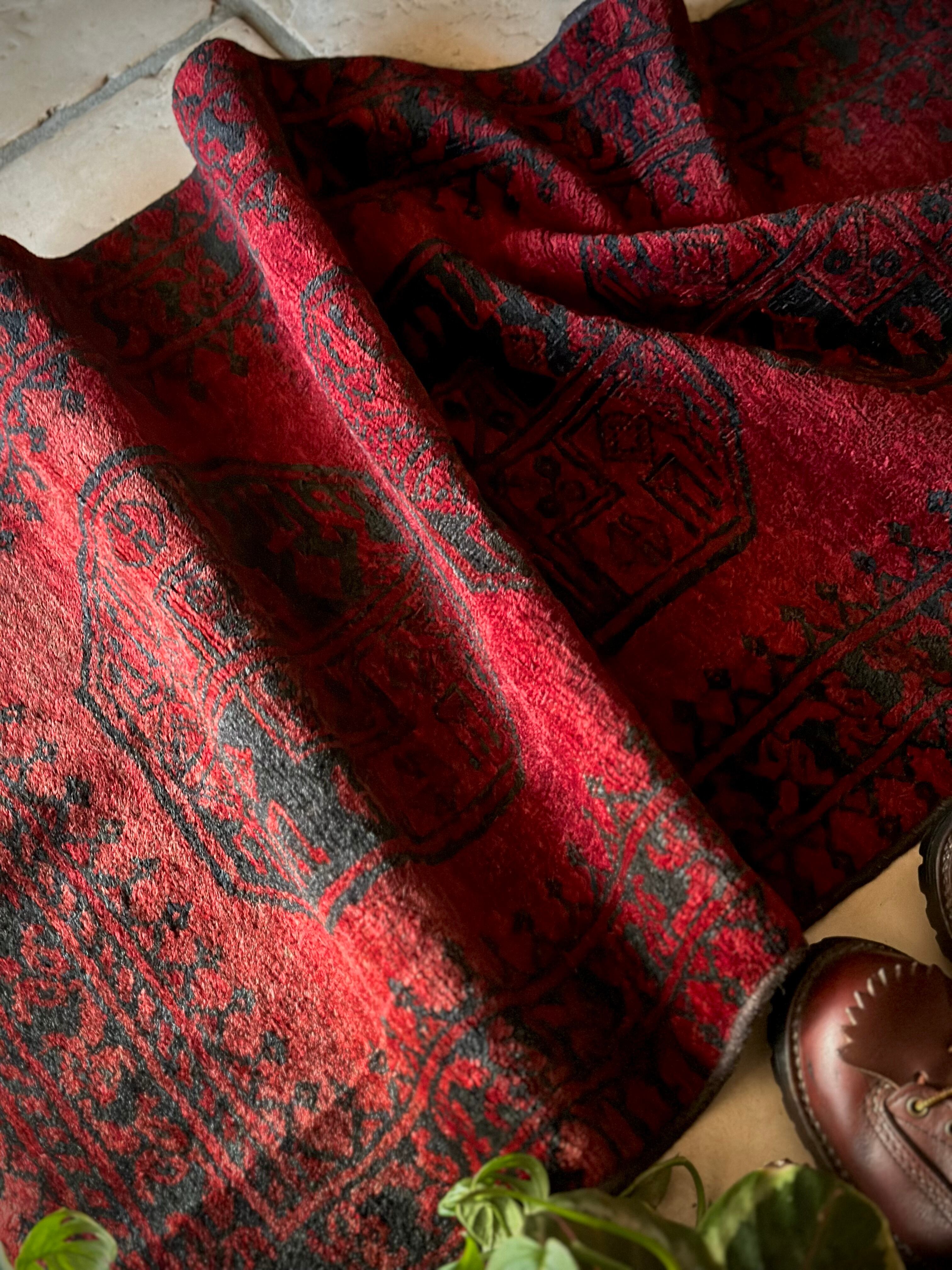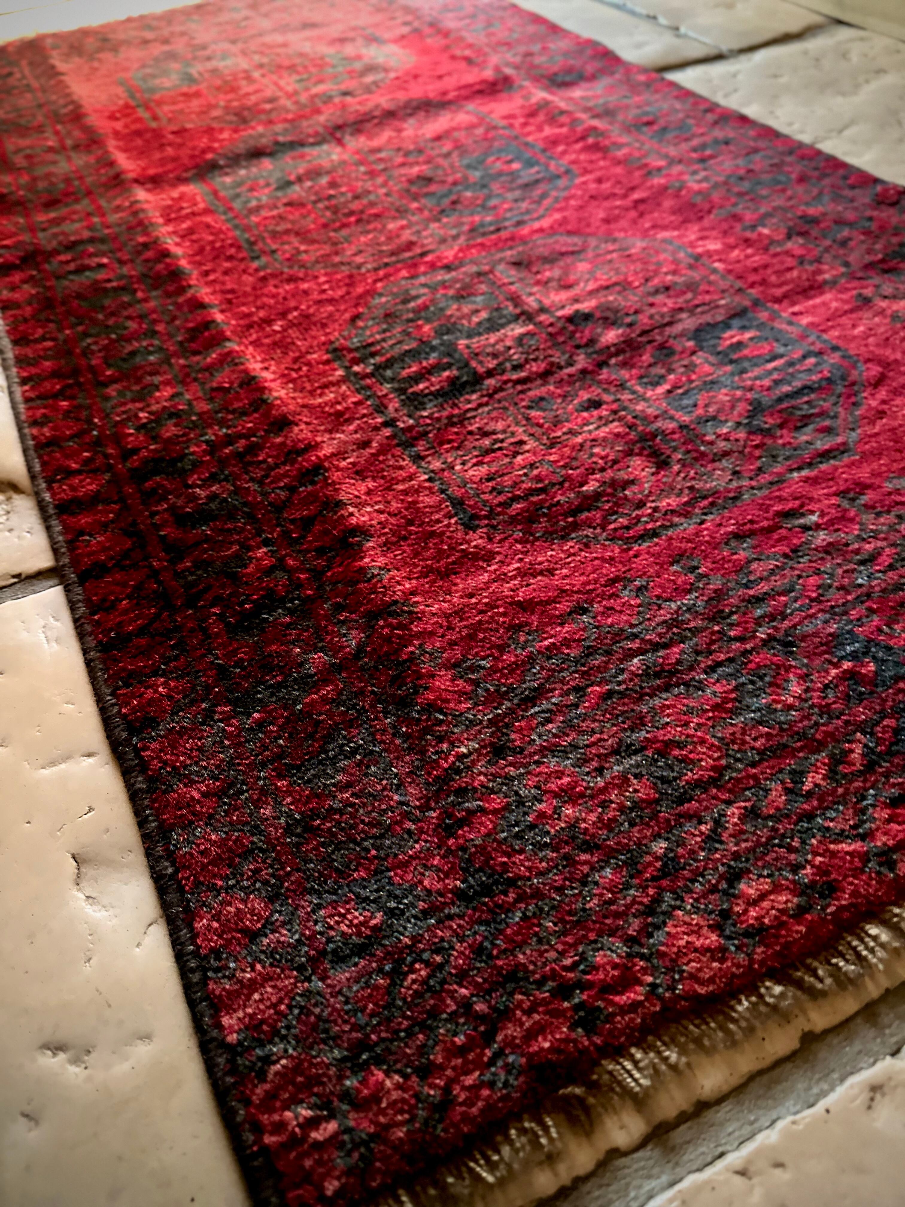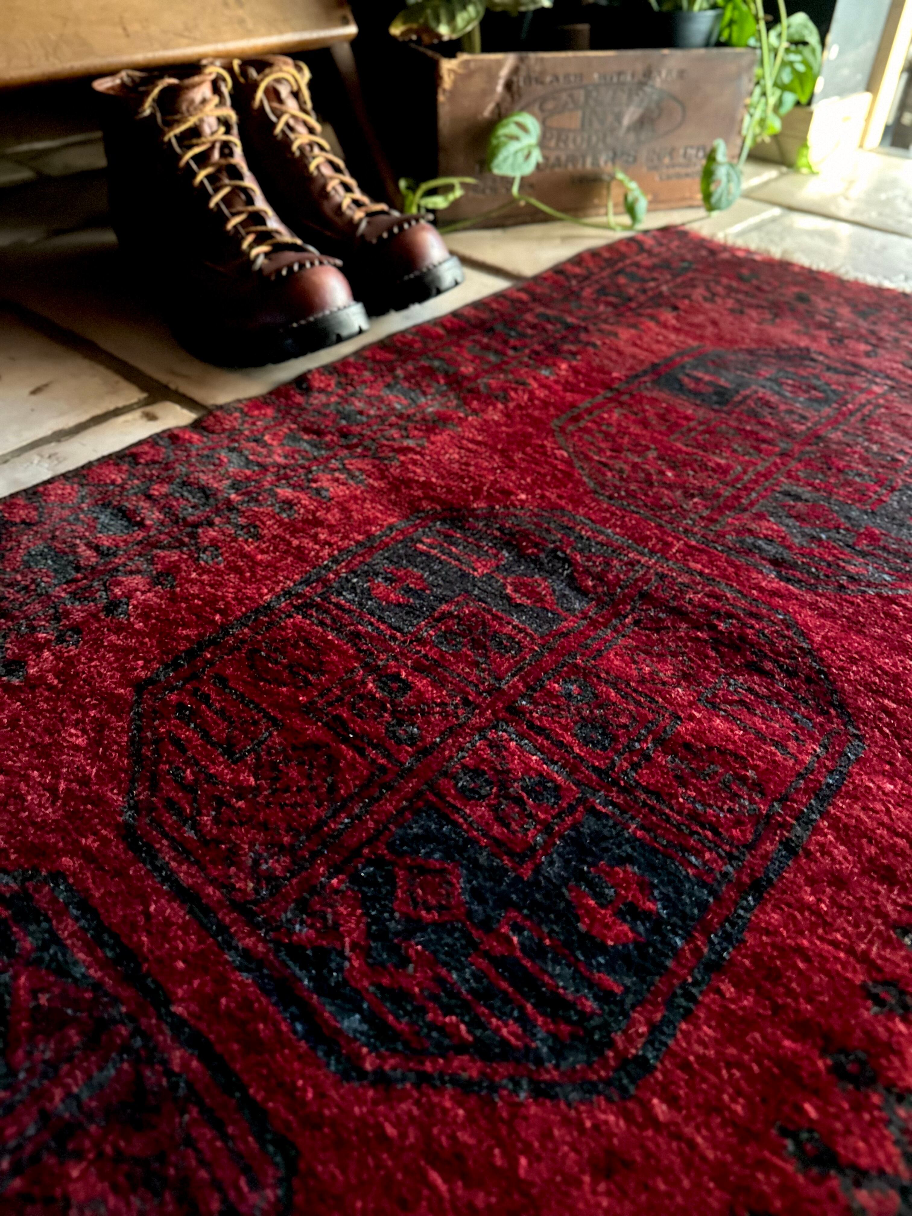 真紅のフィールドに3連のスレイマンギュルが鎮座する雰囲気満点なこちらは、アフガニスタン北部に居住するトルクメン族の支族で、フィルパイと呼ばれる象の足跡が象徴的なエルサリ族のトライバルラグになります。