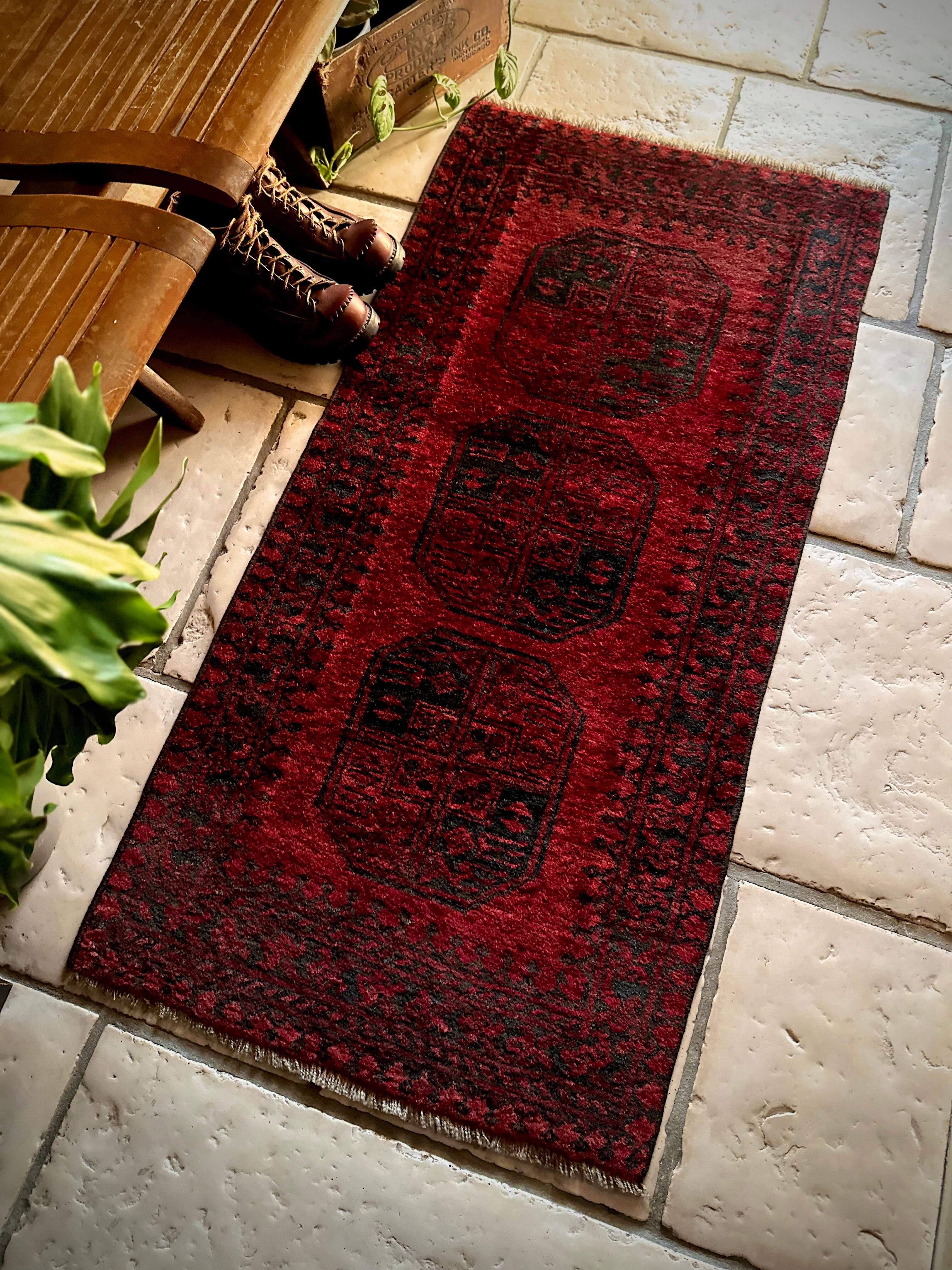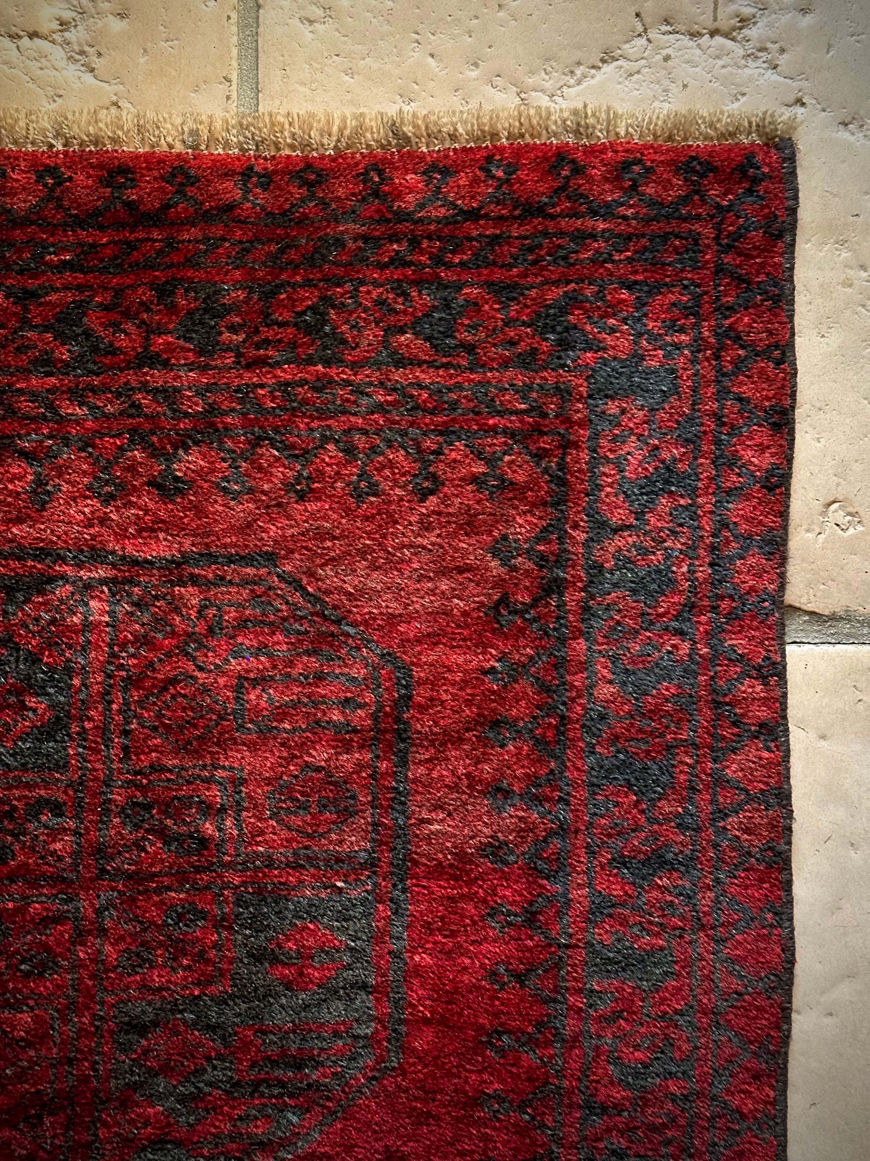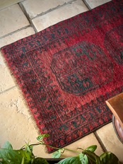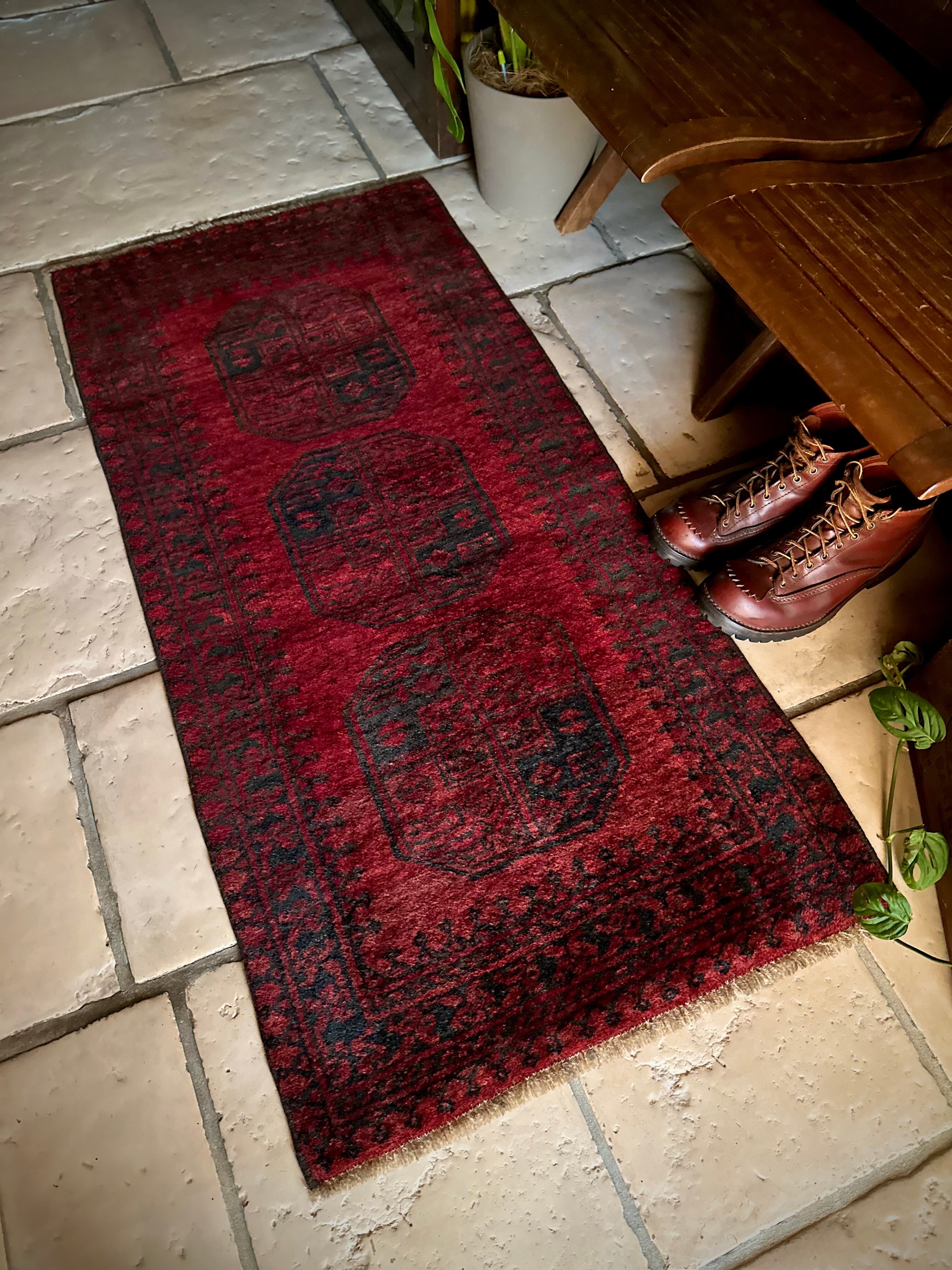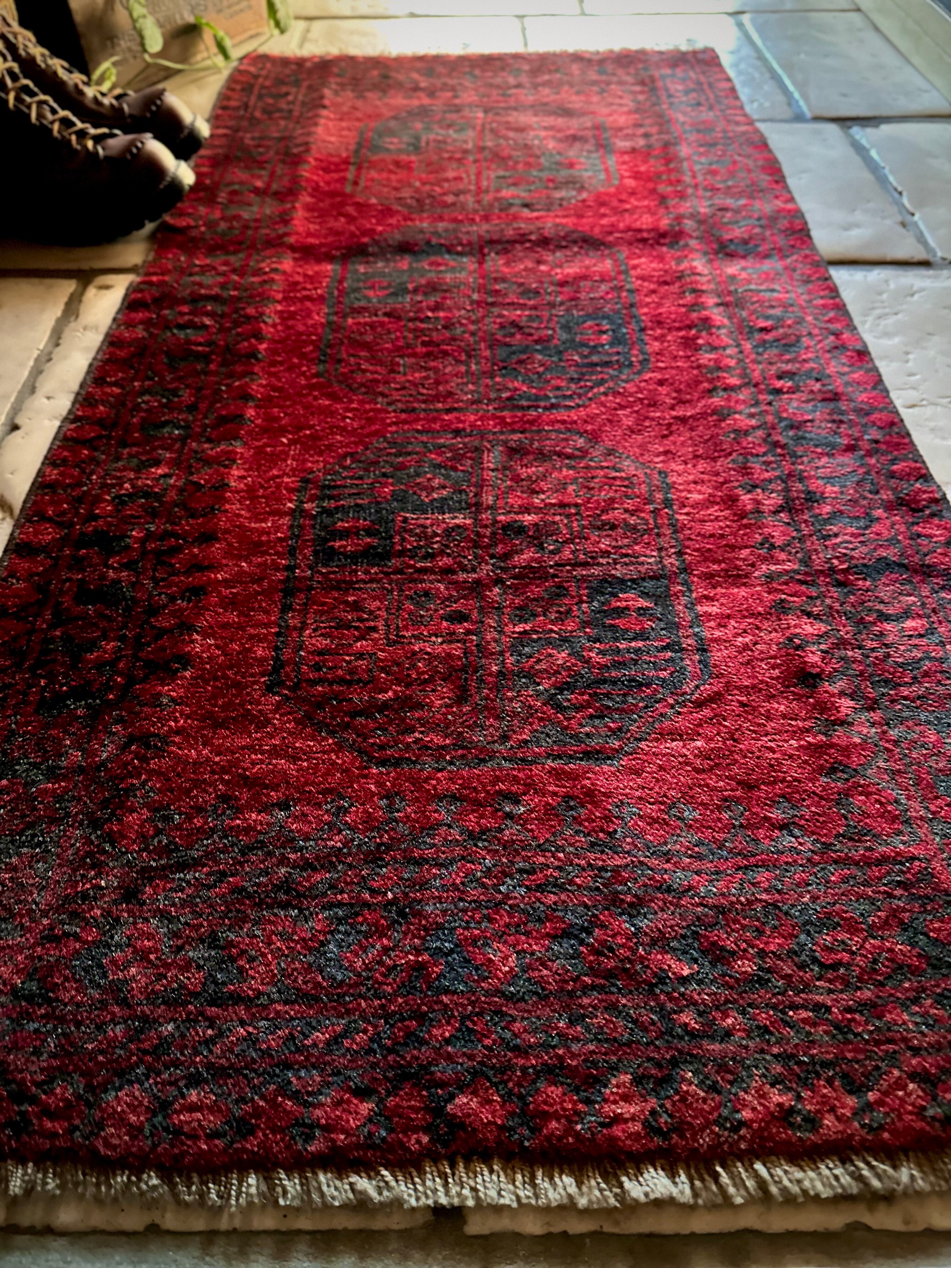 真紅のフィールドに3連のスレイマンギュルが鎮座する雰囲気満点なこちらは、アフガニスタン北部に居住するトルクメン族の支族で、フィルパイと呼ばれる象の足跡が象徴的なエルサリ族のトライバルラグになります。