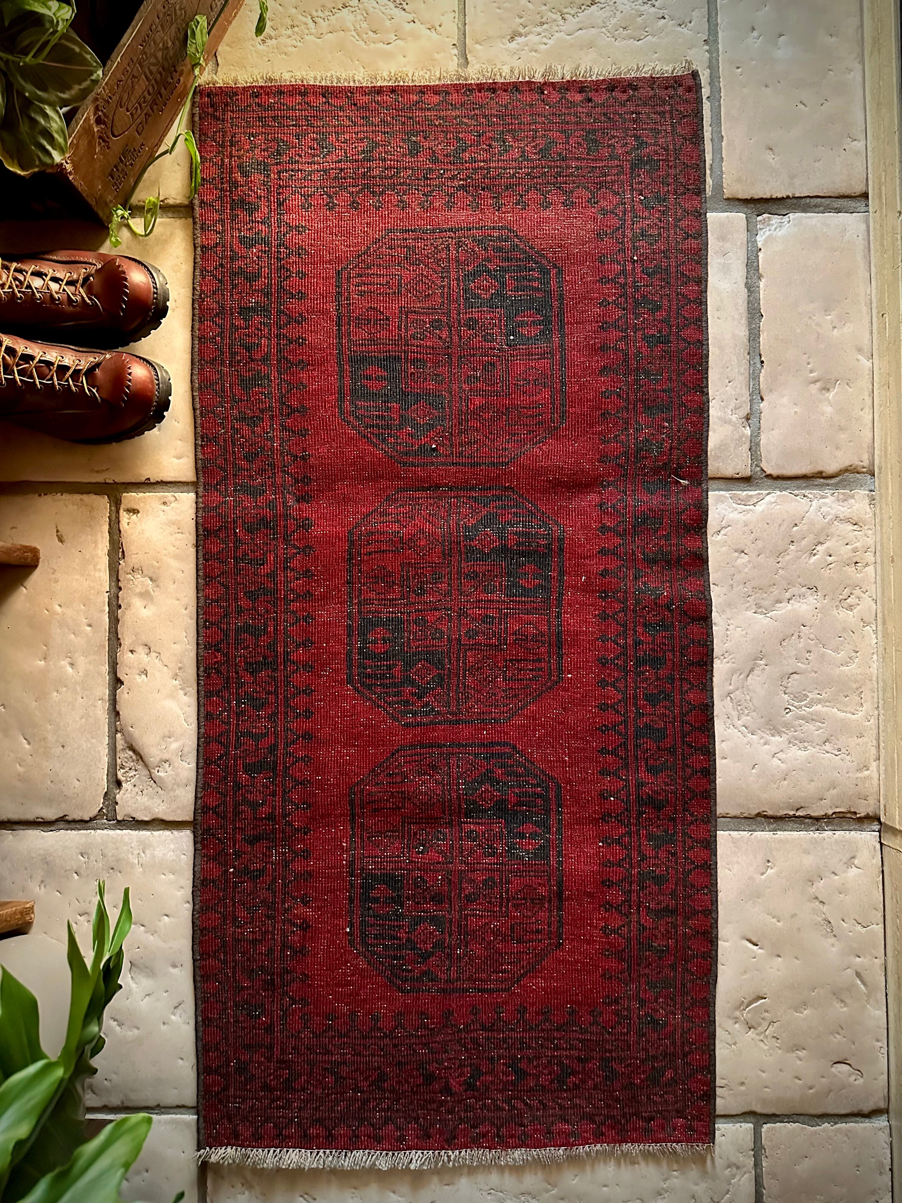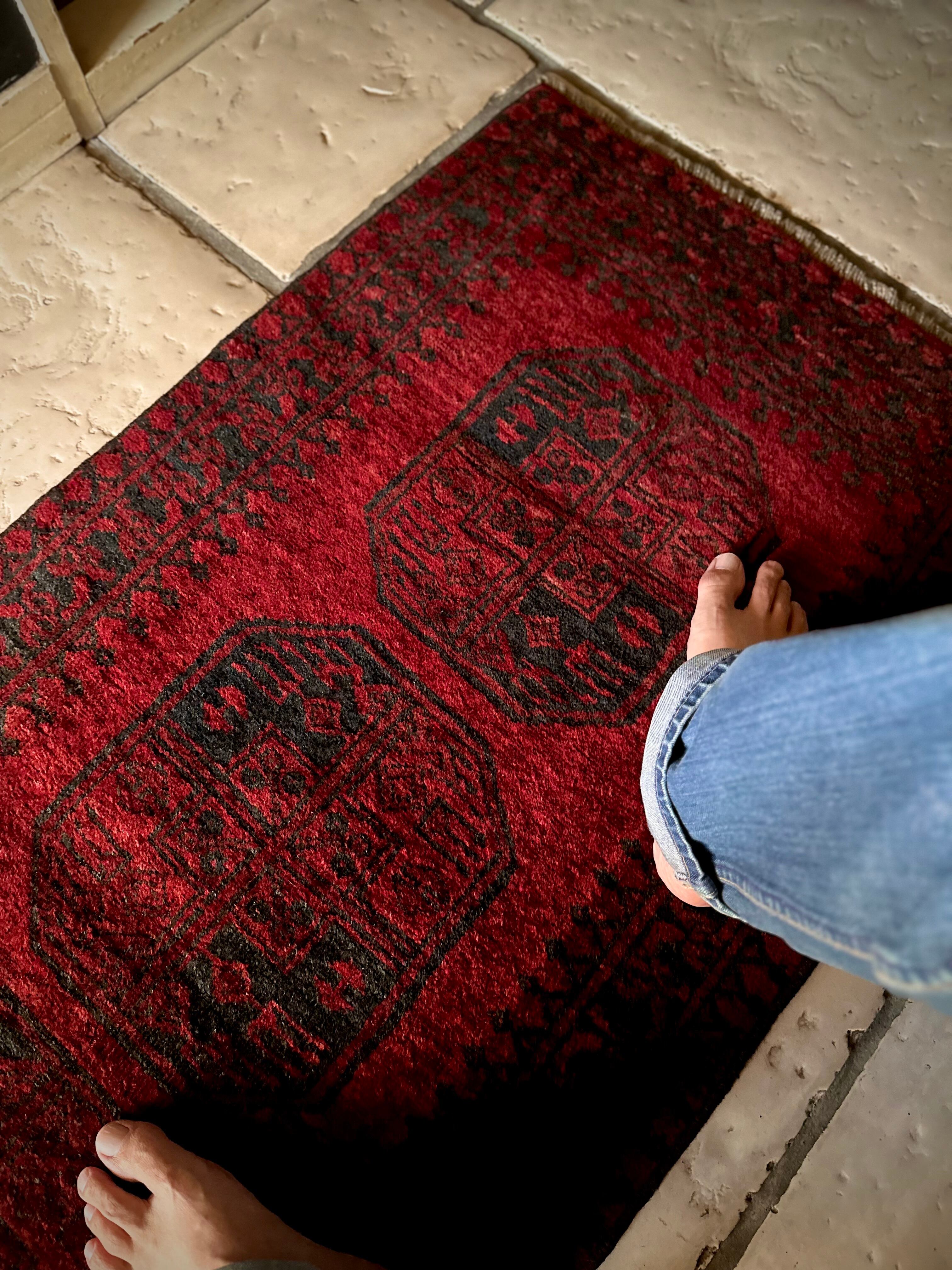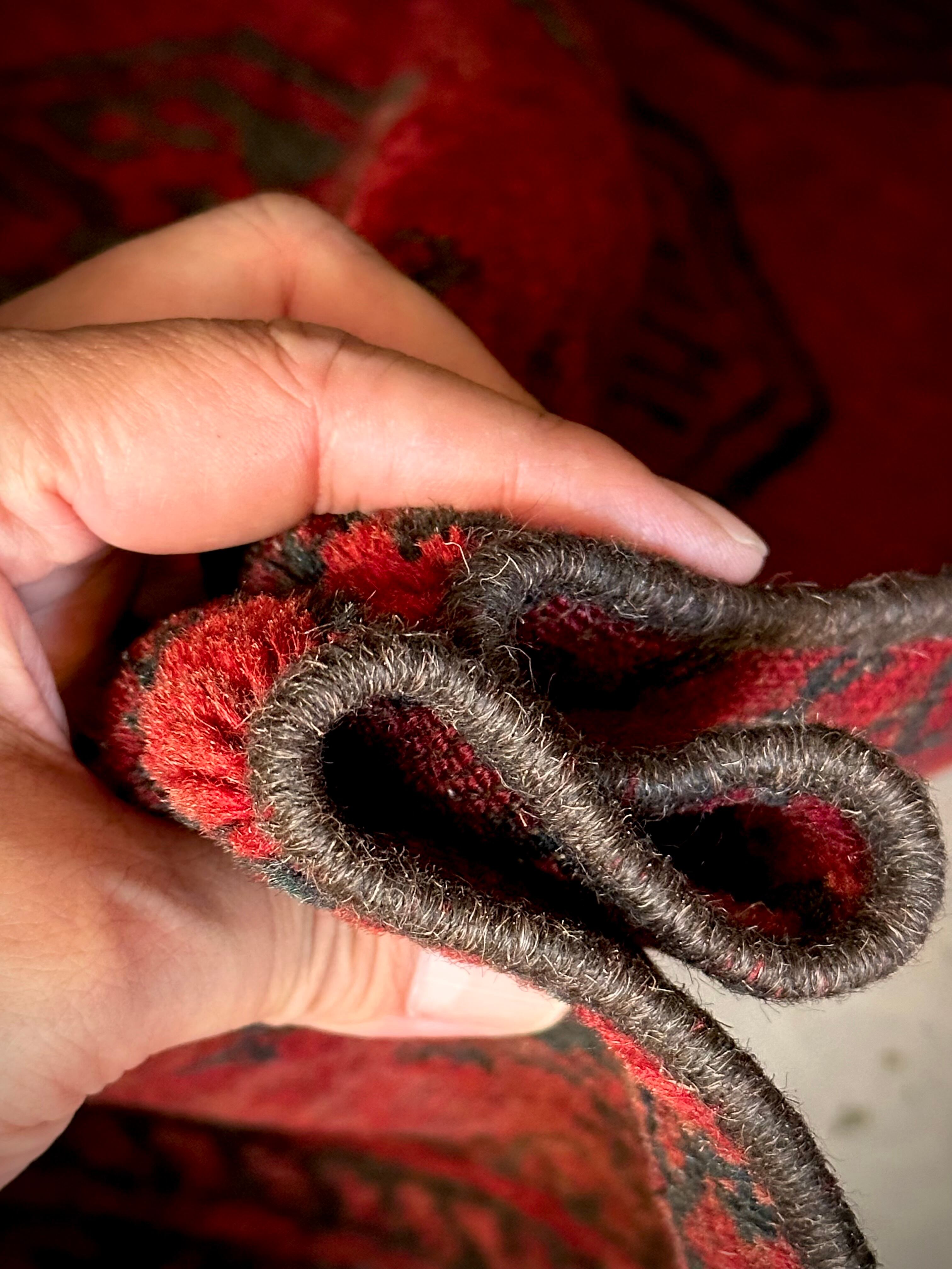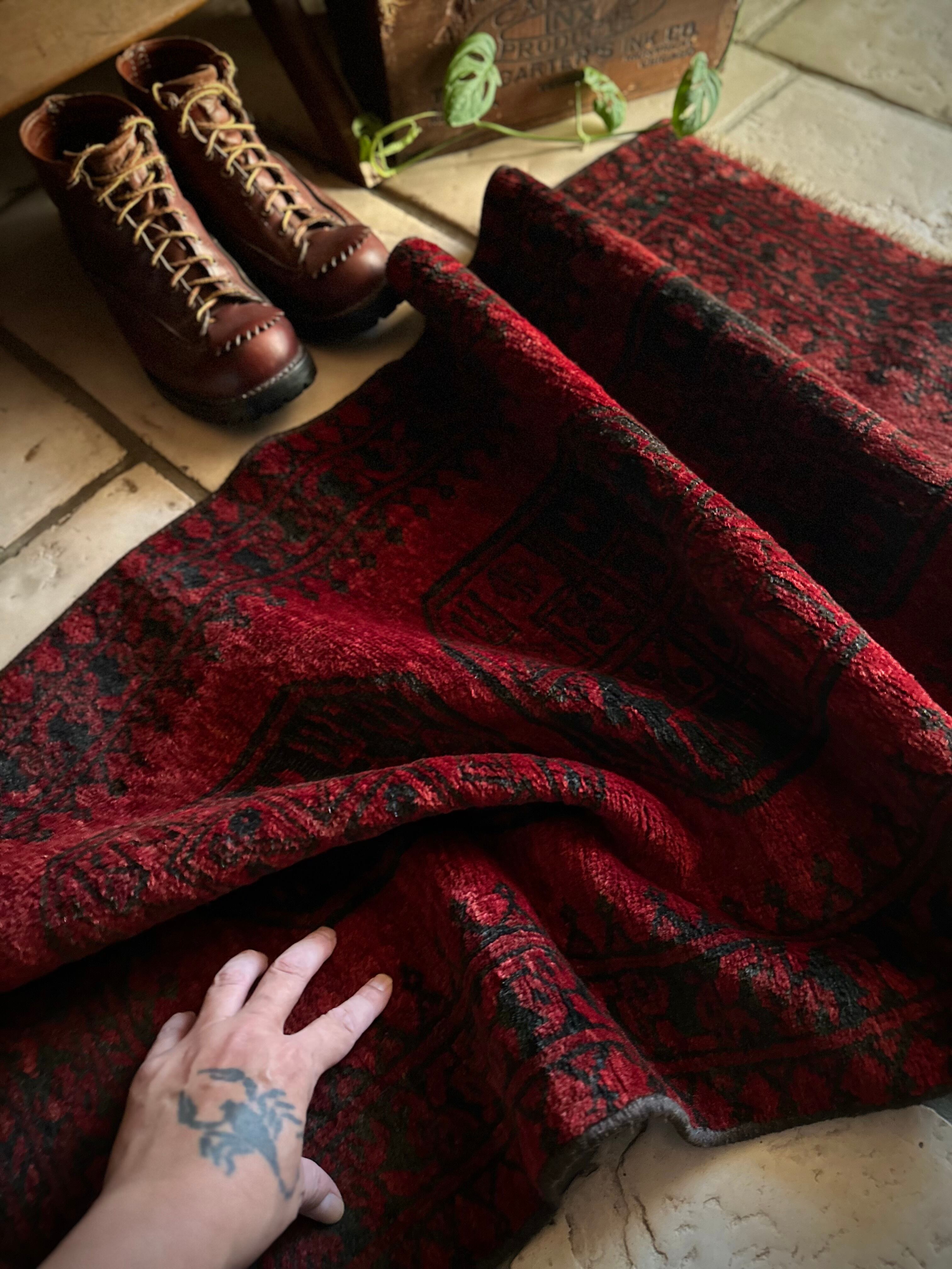 真紅のフィールドに3連のスレイマンギュルが鎮座する雰囲気満点なこちらは、アフガニスタン北部に居住するトルクメン族の支族で、フィルパイと呼ばれる象の足跡が象徴的なエルサリ族のトライバルラグになります。