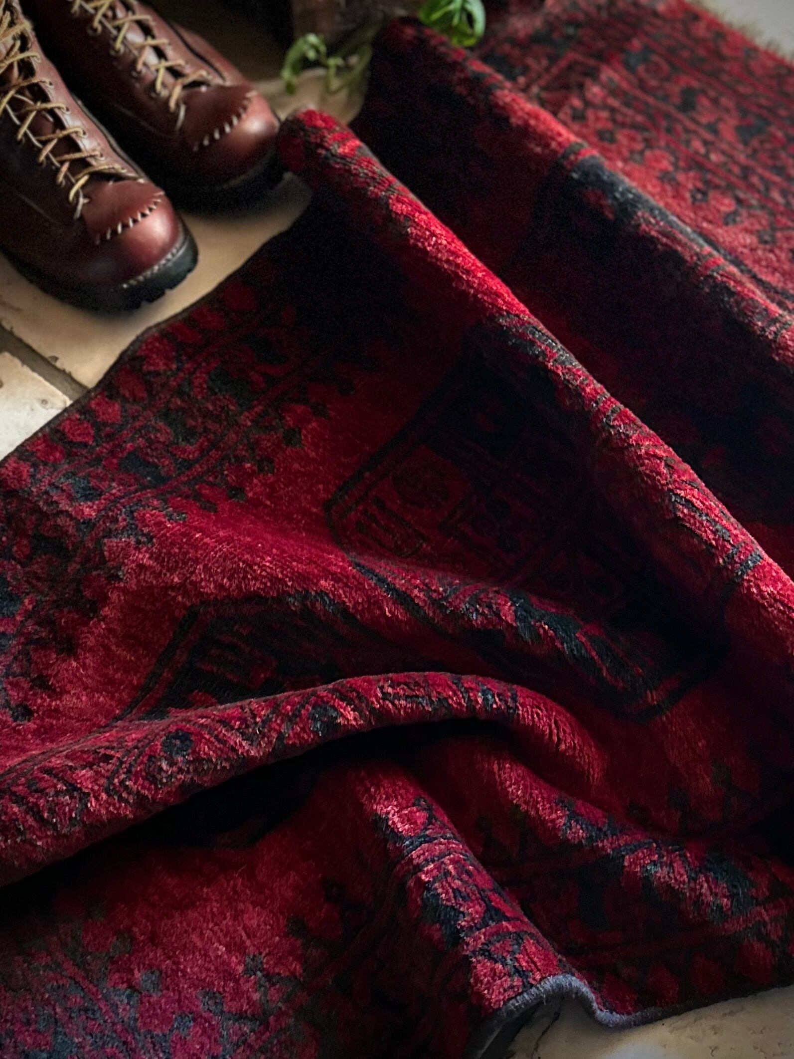 経年としては50年のヴィンテージラグになりますが、それほどの使用感はなく目立つ汚れやダメージにリペア箇所は見当たらないグッドなコンディションで、なんと言ってもこのパイルの艶に惹き寄せられてしまうアクセントラグになります。