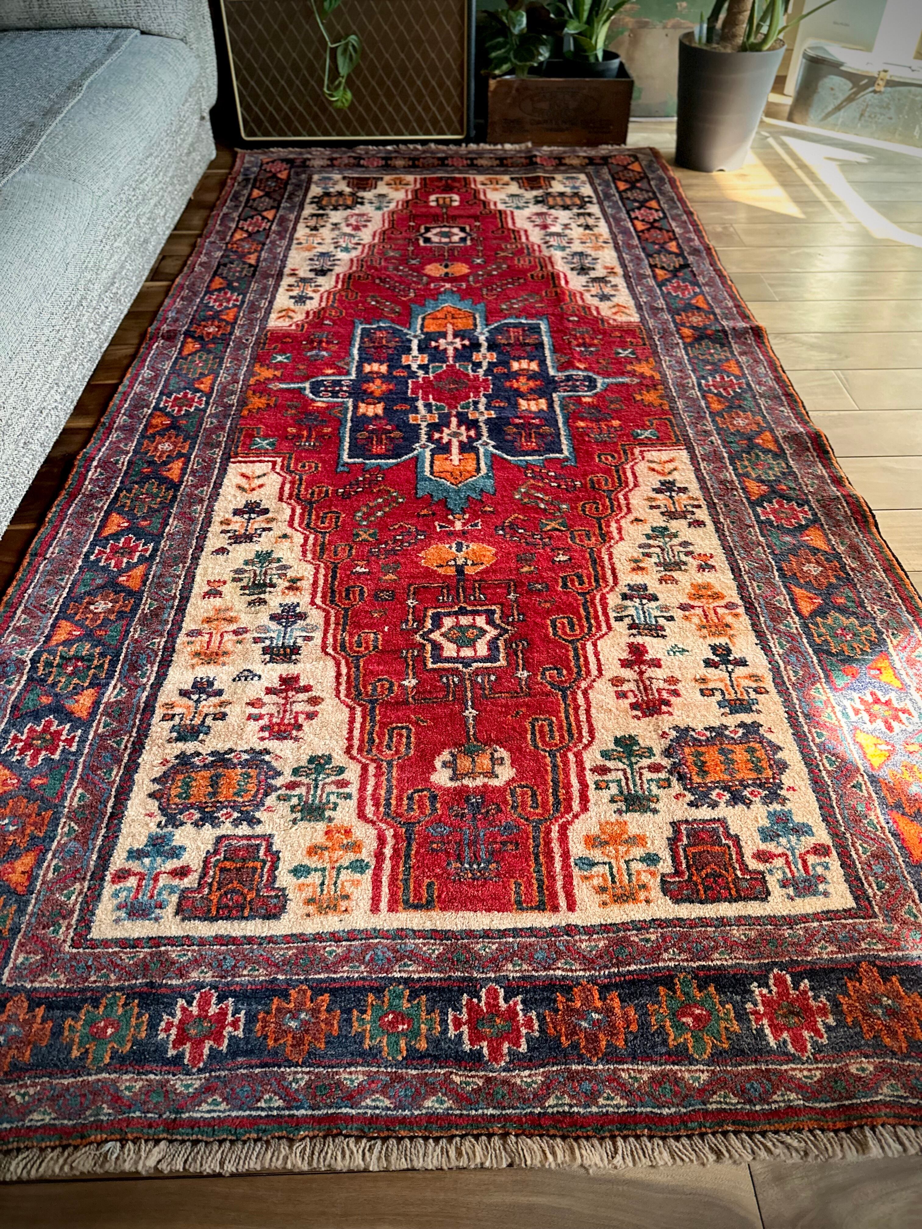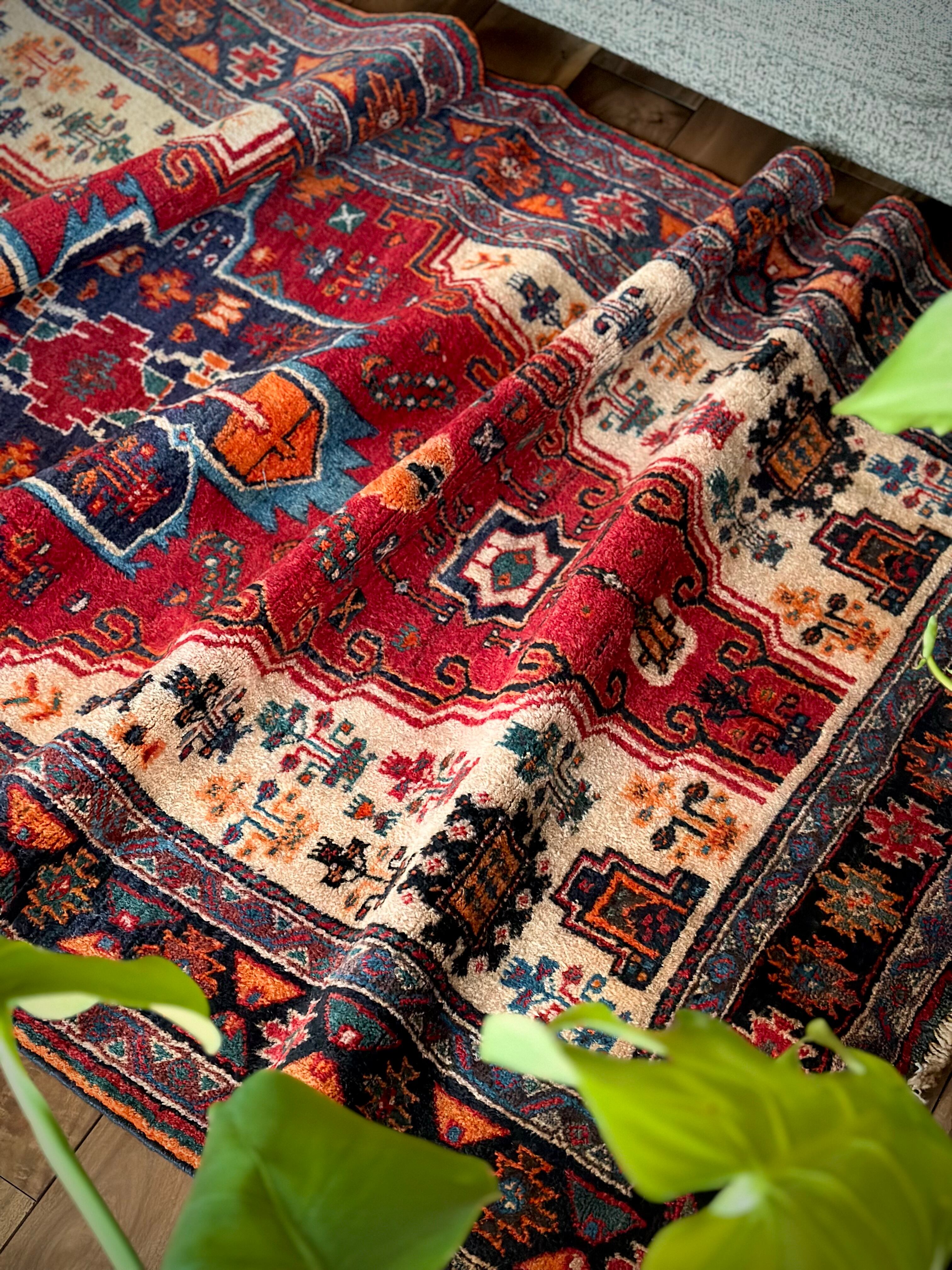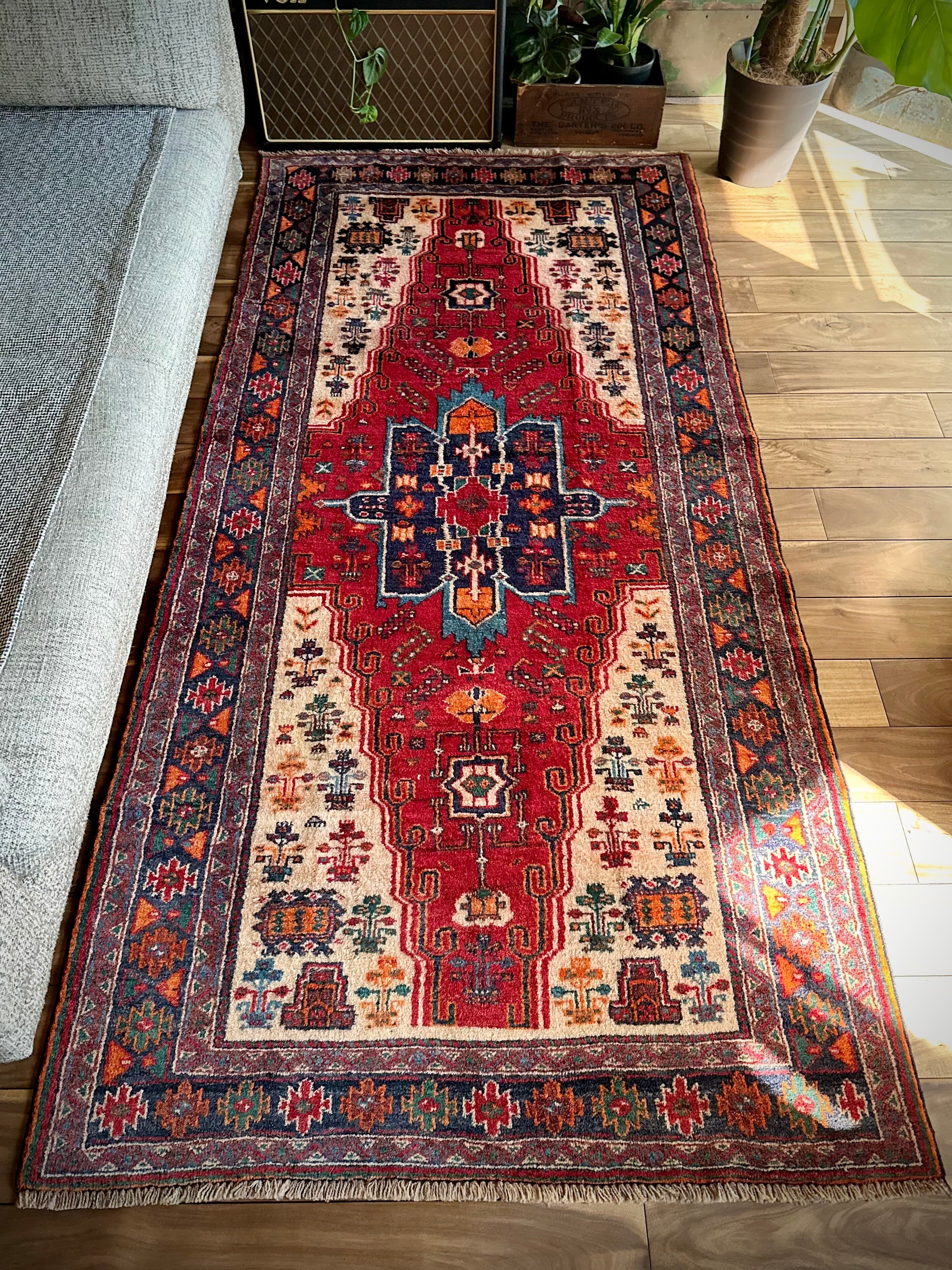最後にラグそのものに関しては羊毛特有の匂いがあり、採寸は中央付近で計測していますが、手織りならではの歪みによる誤差や水洗いクリーニングによる縮み、また草木染めによる経年劣化の色ムラなどがありますが、それもまたヴィンテージラグの魅力かとご理解ください。