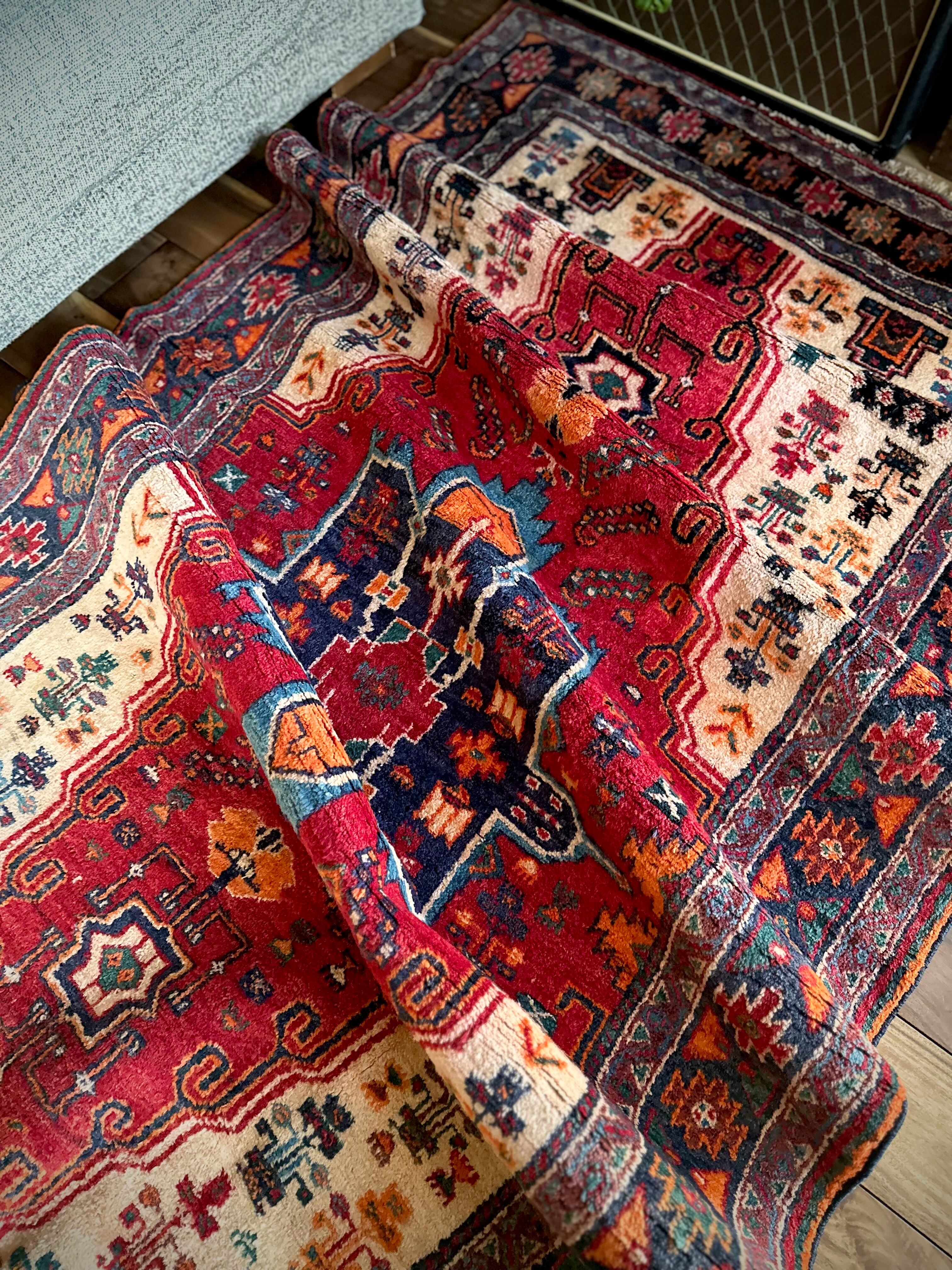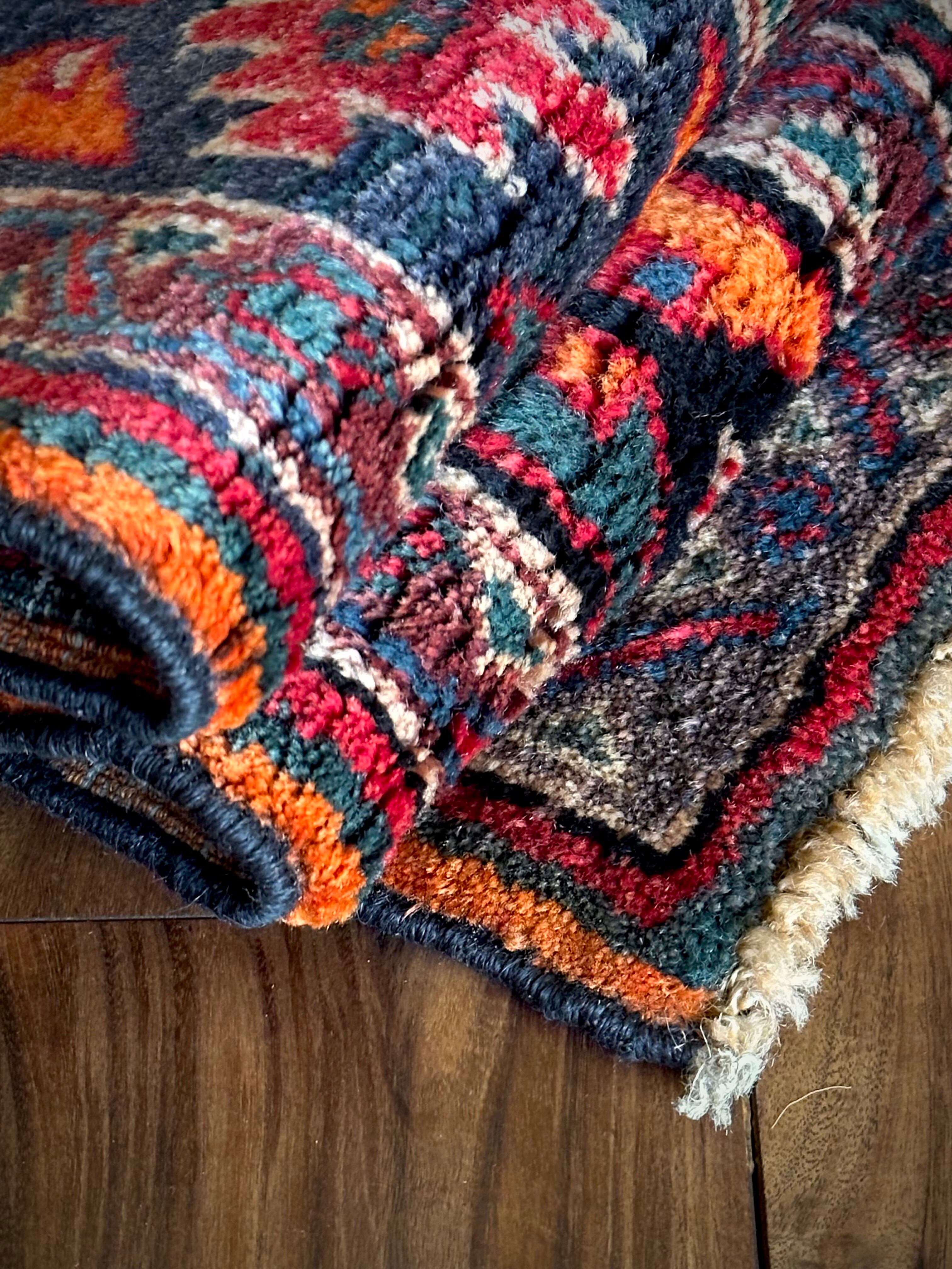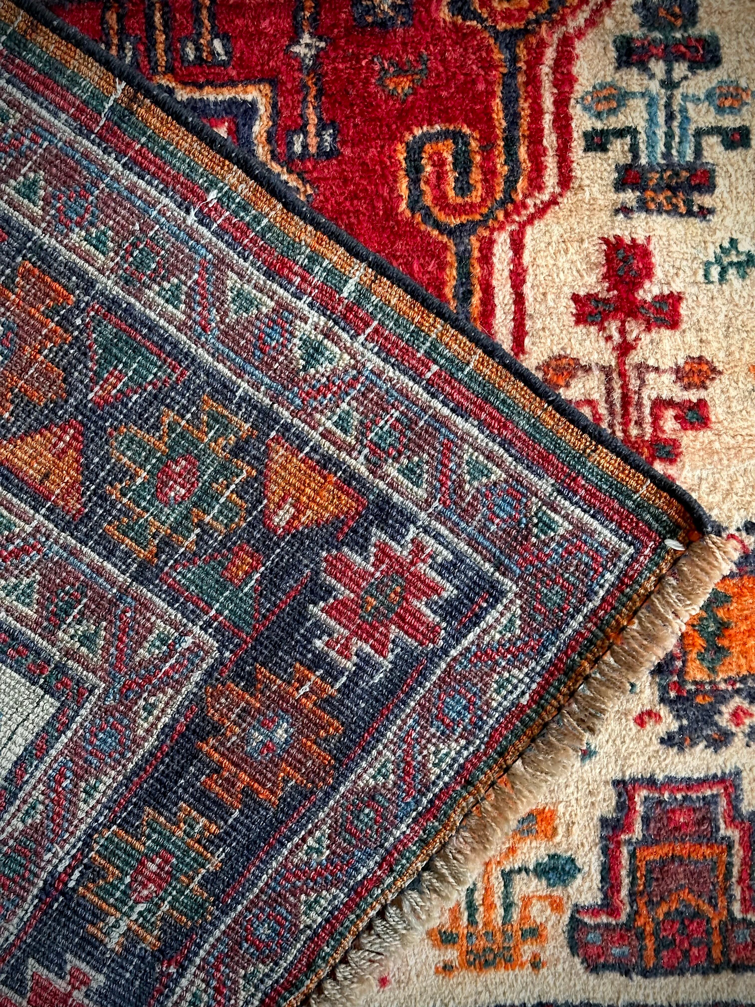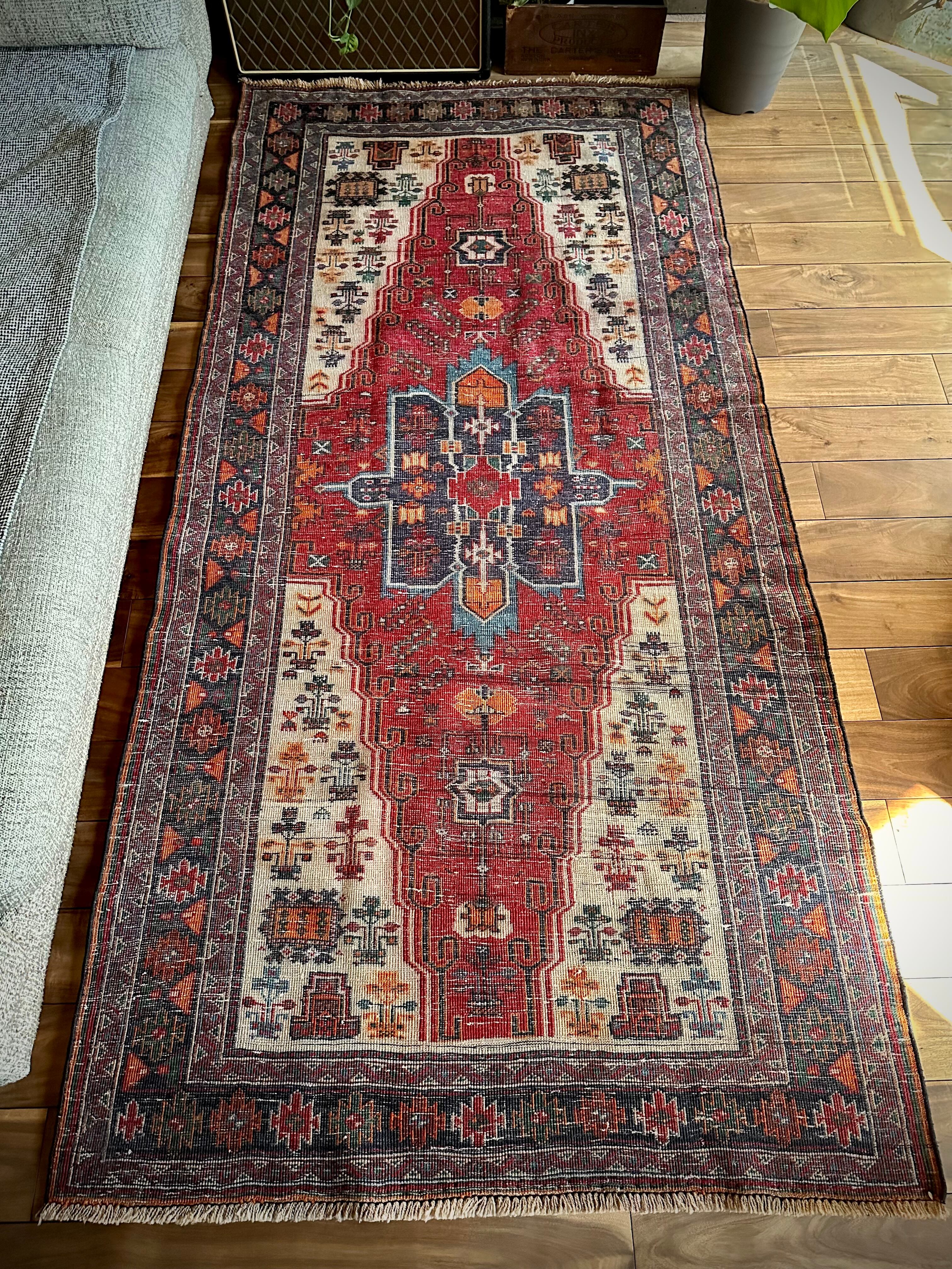 経年としては55年のヴィンテージラグらしくそれなり使用感はありますが、特に目立つ汚れやダメージにリペア箇所は見当たらないグッドなコンディションで、ひとつだけ幅の長さに4cmほどの歪みがありますが手織りならではの誤差なのでご理解ください。