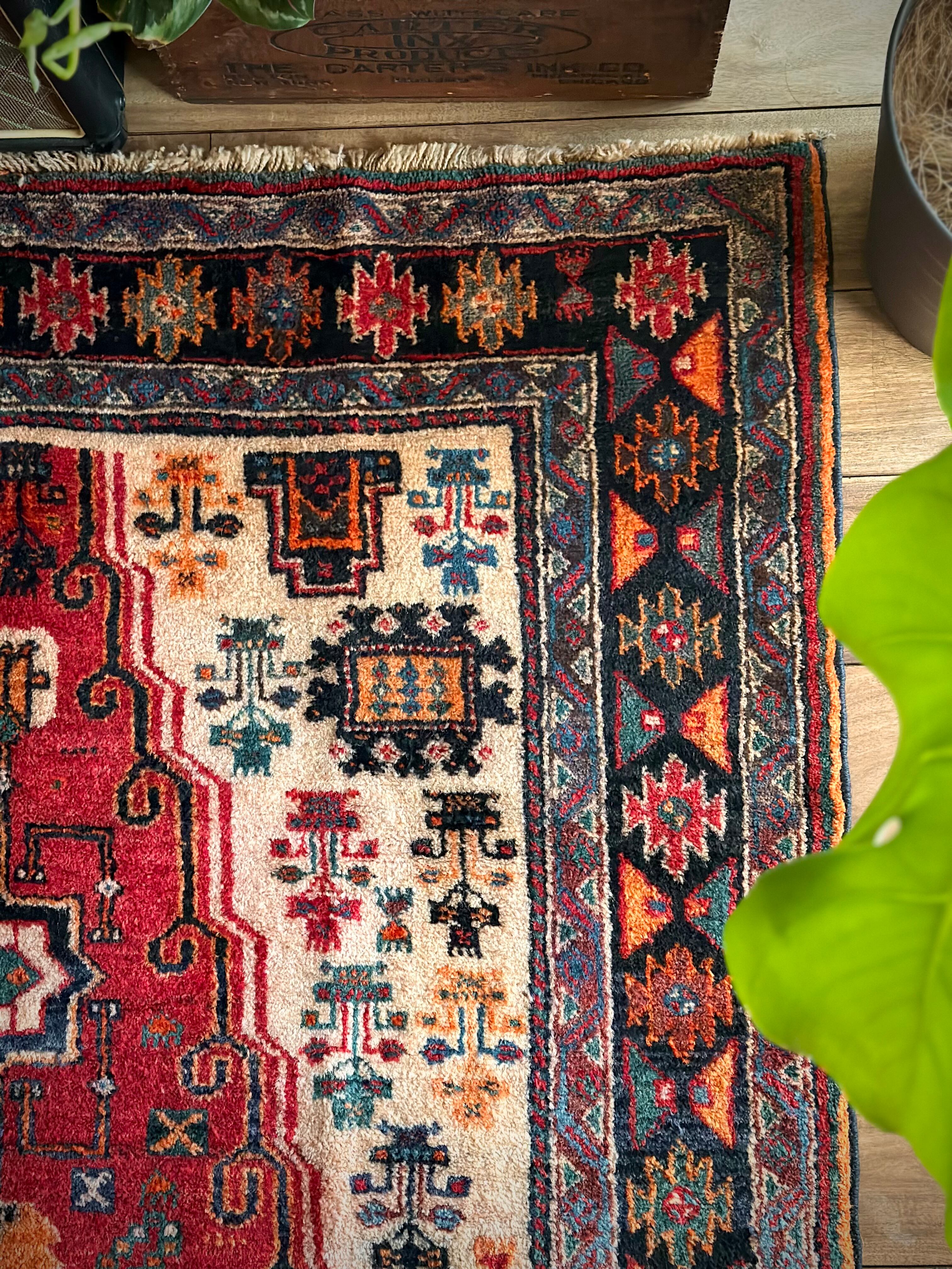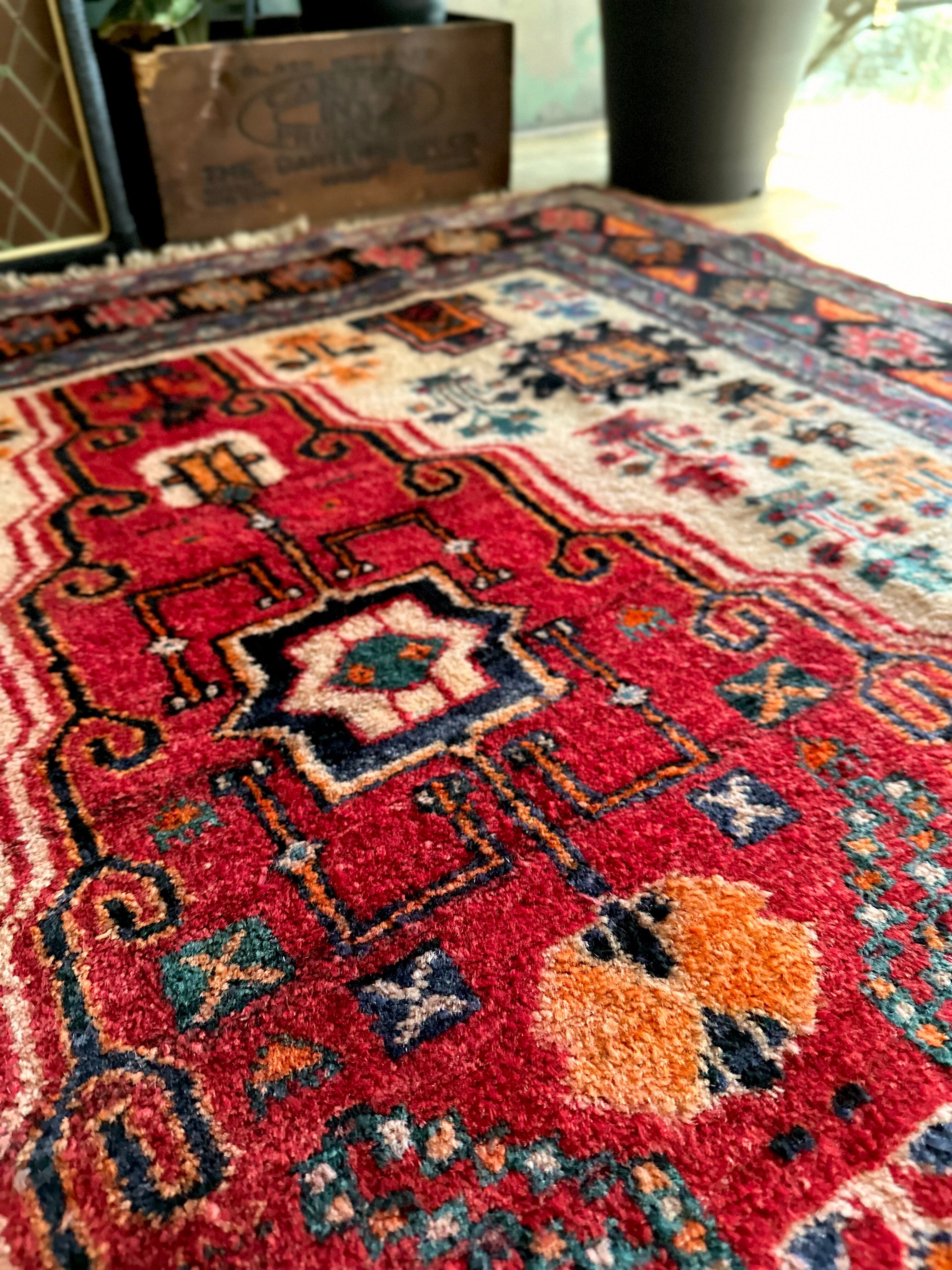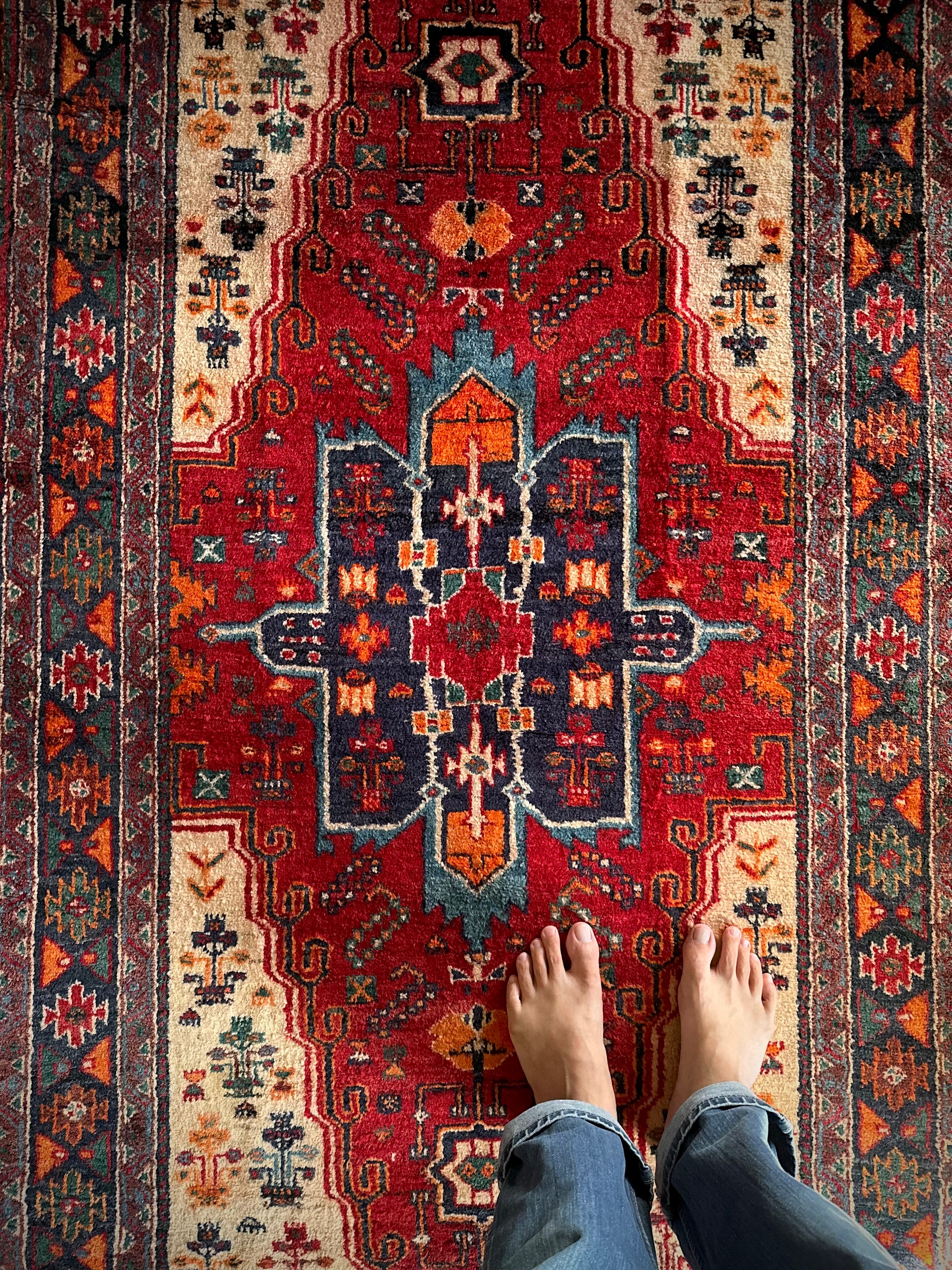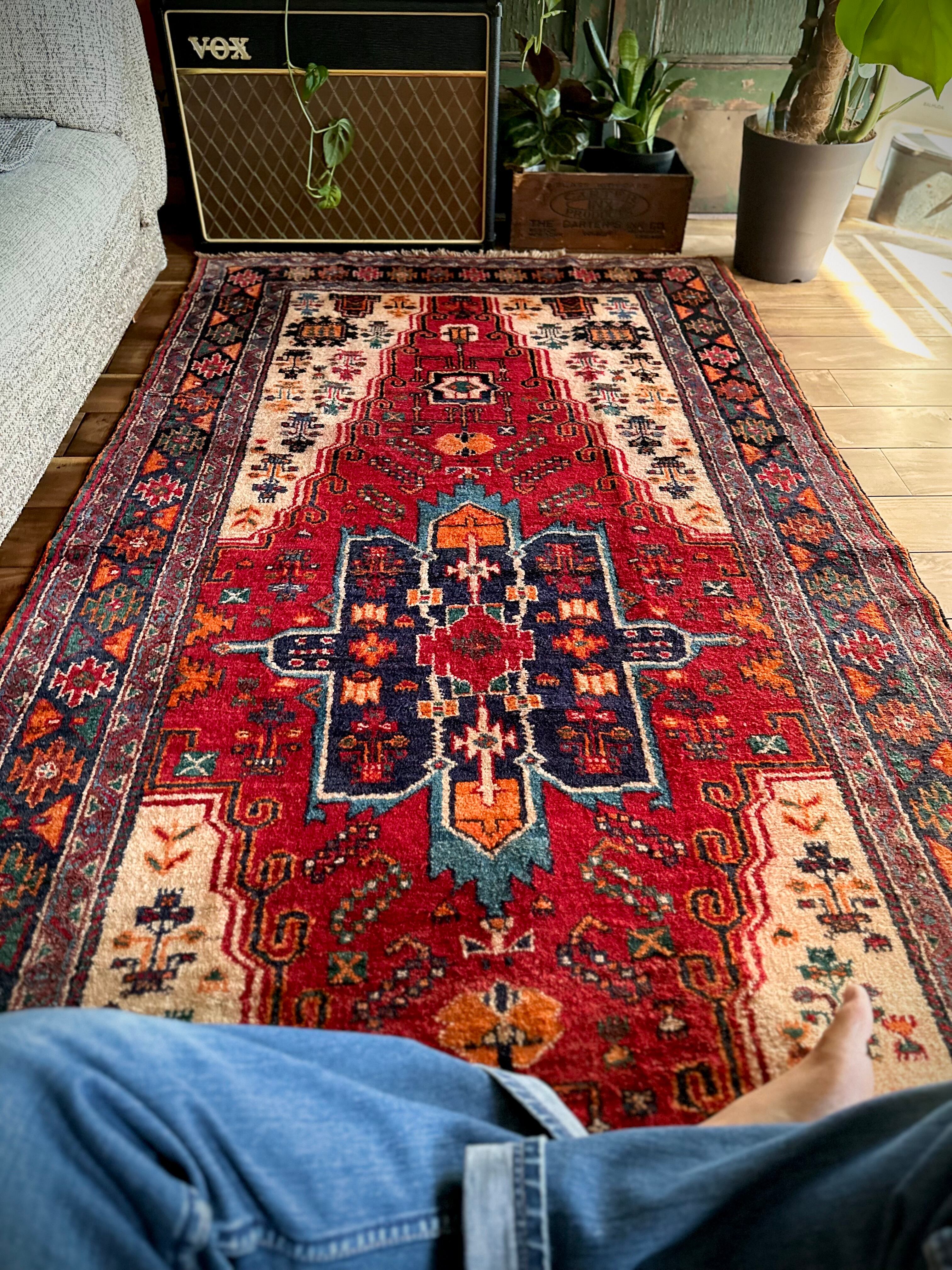 経年としては55年のヴィンテージラグらしくそれなり使用感はありますが、特に目立つ汚れやダメージにリペア箇所は見当たらないグッドなコンディションで、ひとつだけ幅の長さに4cmほどの歪みがありますが手織りならではの誤差なのでご理解ください。
