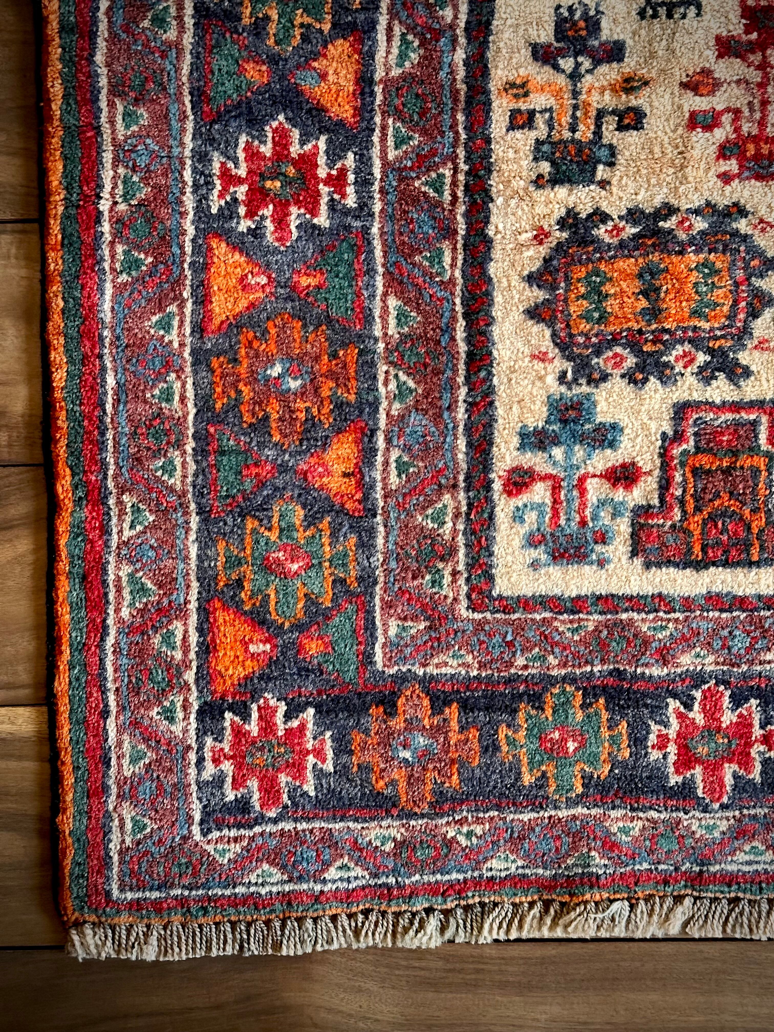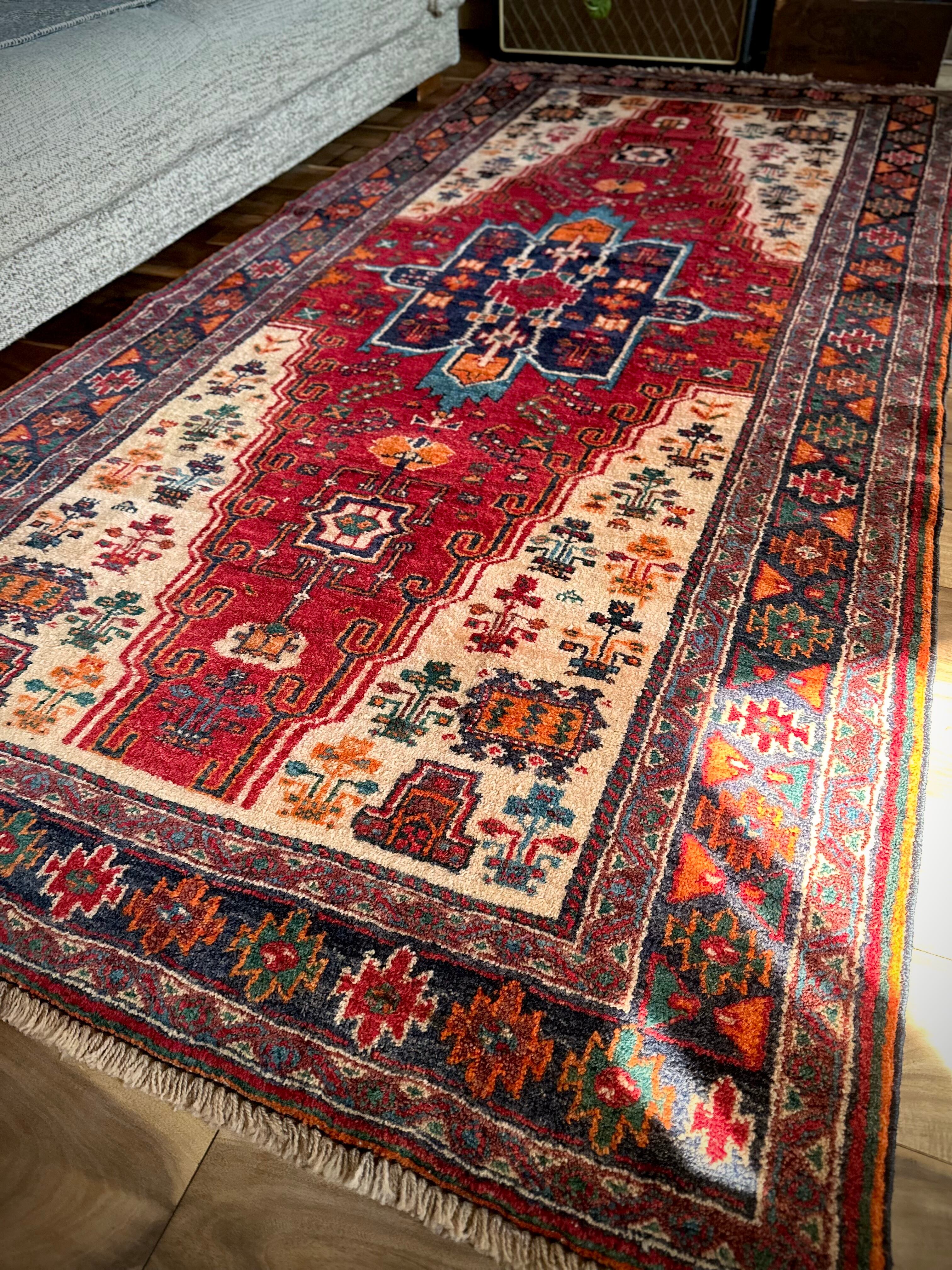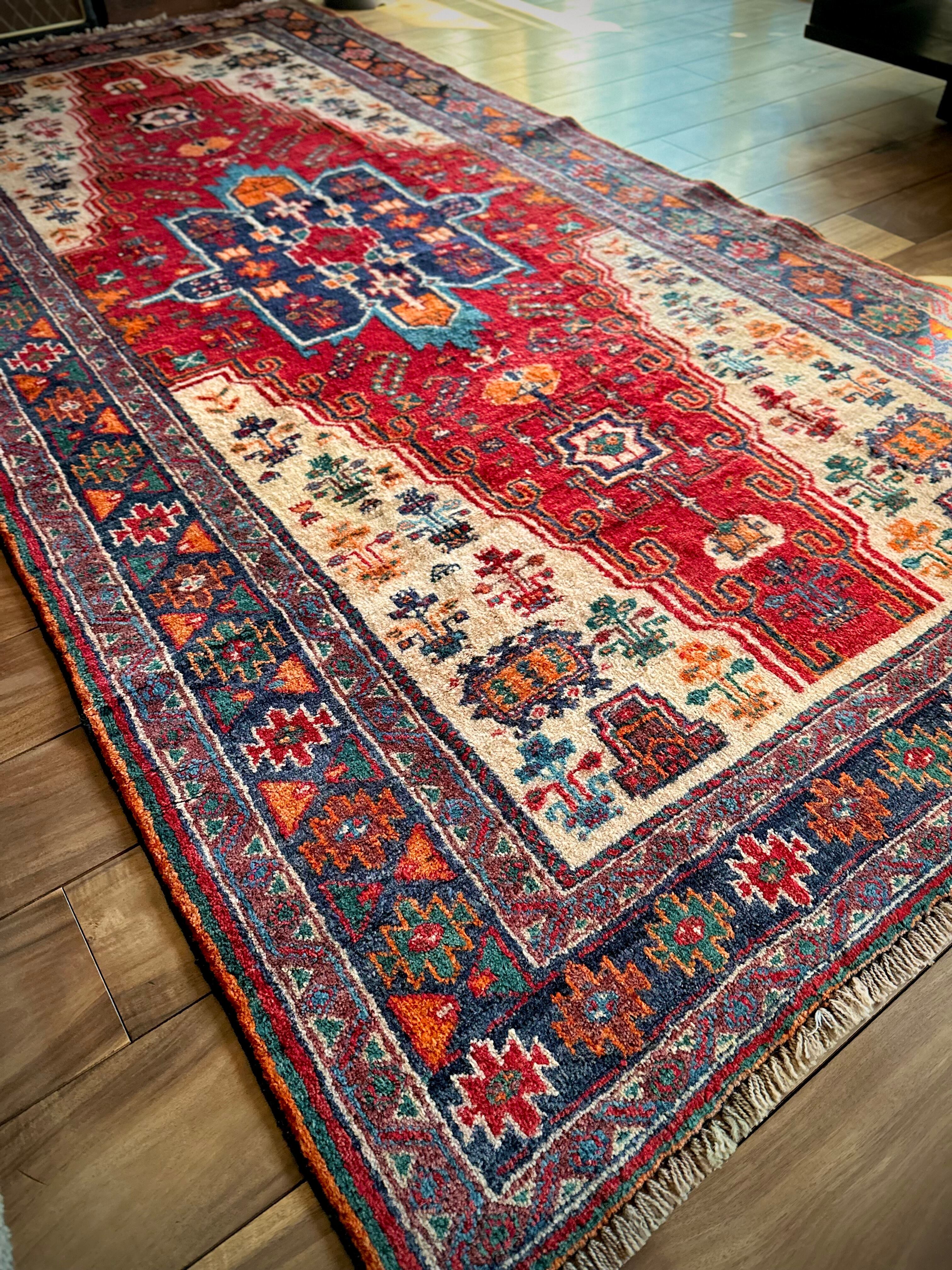真っ赤なフィールドのメダリオンにベージュからカラフルなボーダーに移り変わる様がなんとも素晴らしいこちらは、アフガニスタンはヘラート州にて半遊牧生活を送るマルダリ・バルーチ族のトライバルで、リビングに最適な大判サイズの1枚になります。