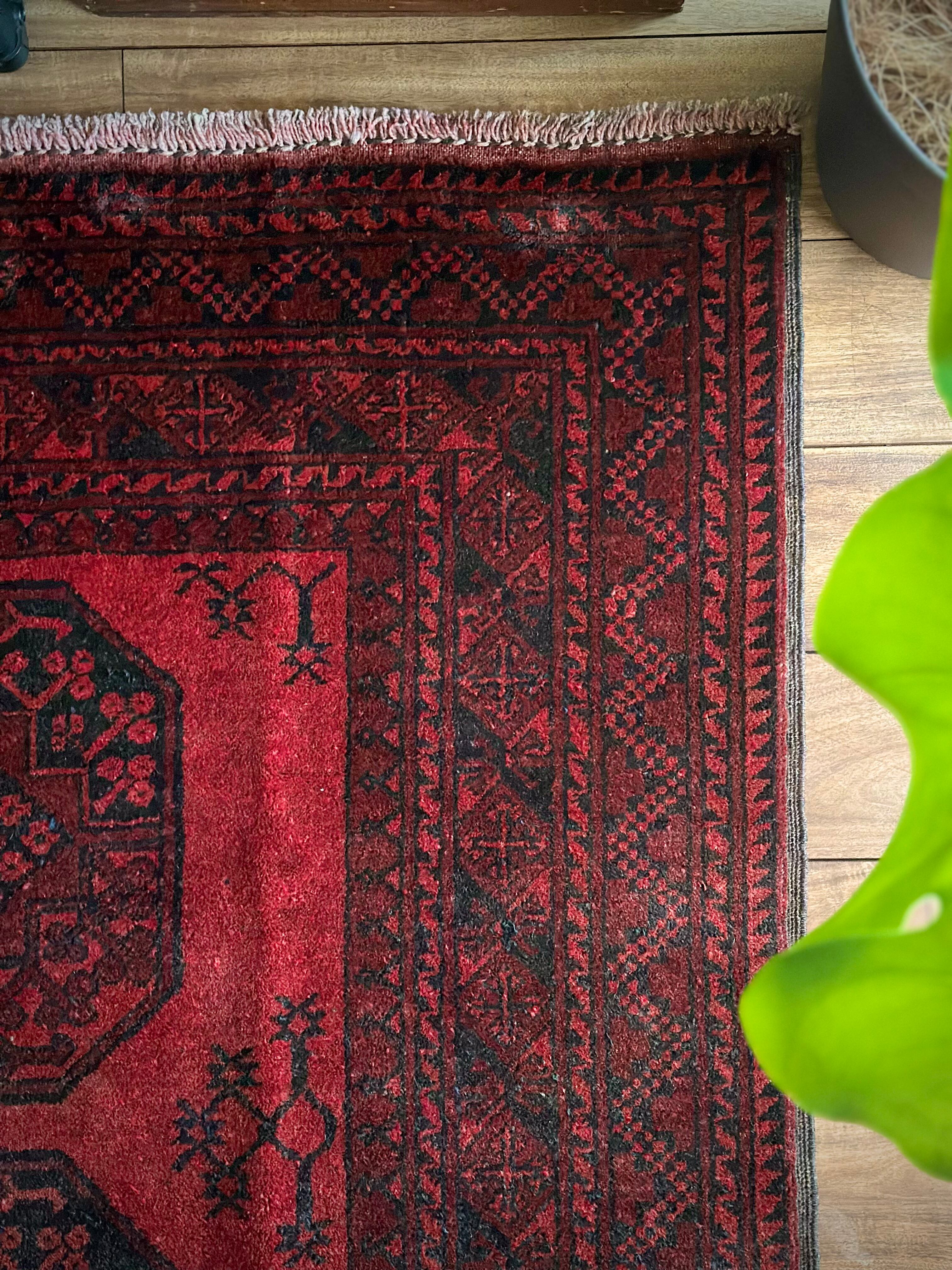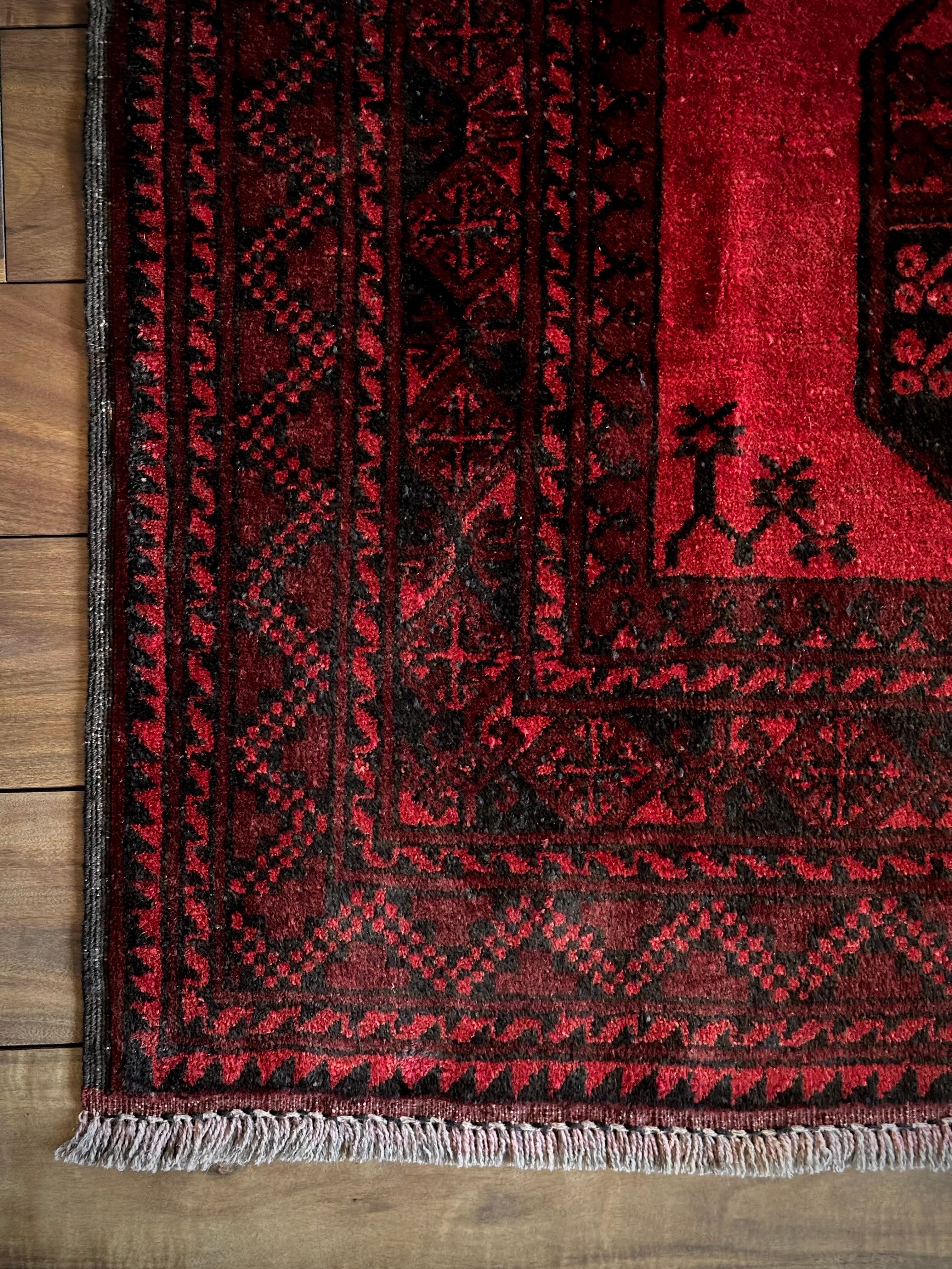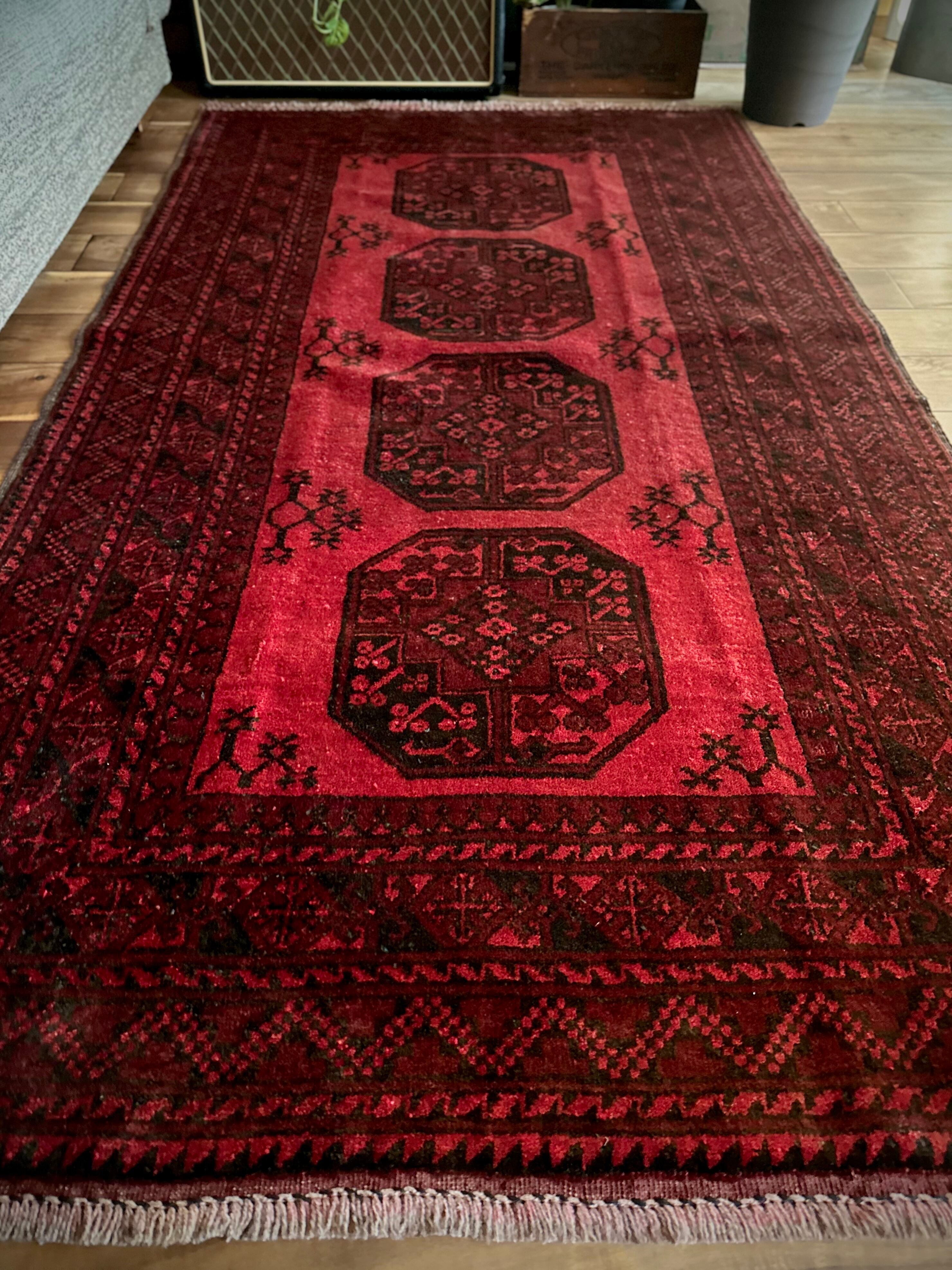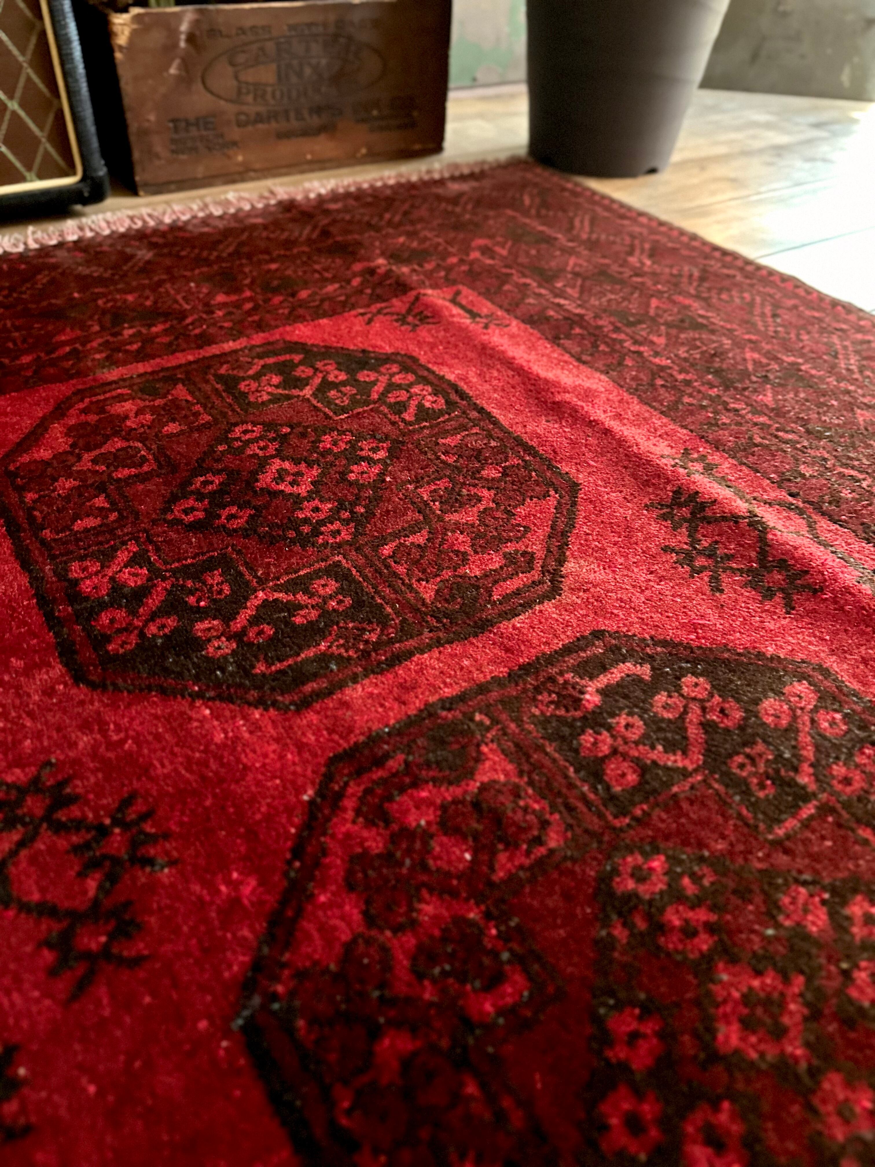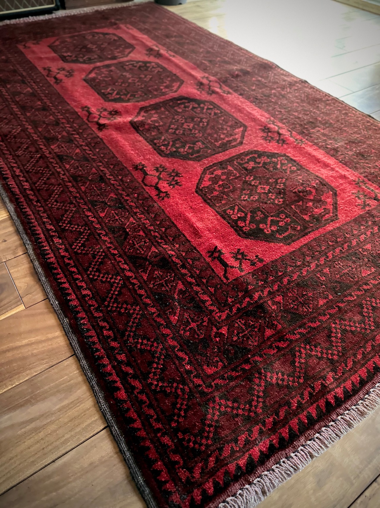 目を惹く真っ赤なフィールドに4連のスレイマンギュルがかっこいいこちらは、アフガニスタン北部に居住するトルクメンの支族で、フィルパイと呼ばれる象の足跡に似た紋様が特徴的なエルサリ族のトライバルラグになります。