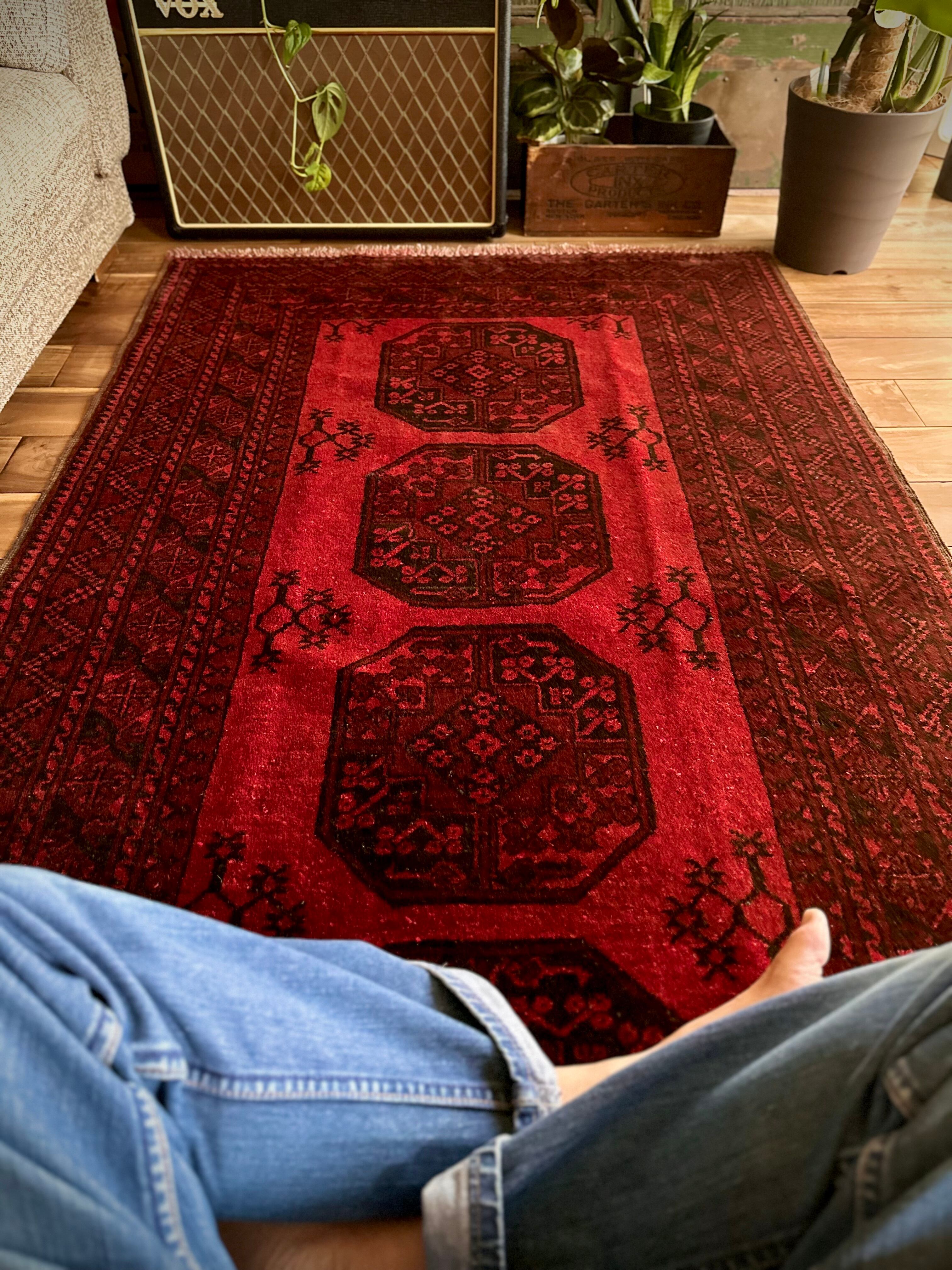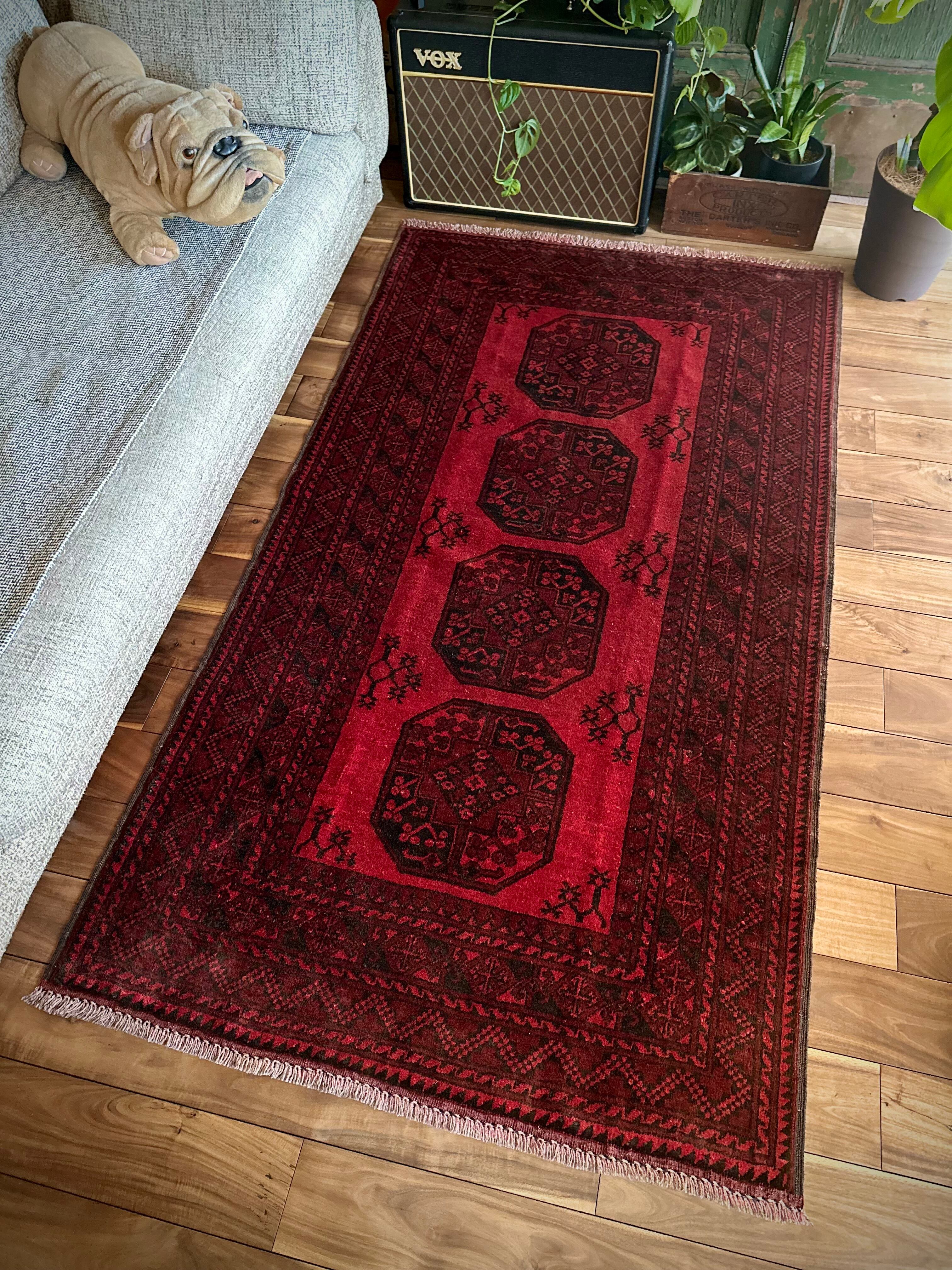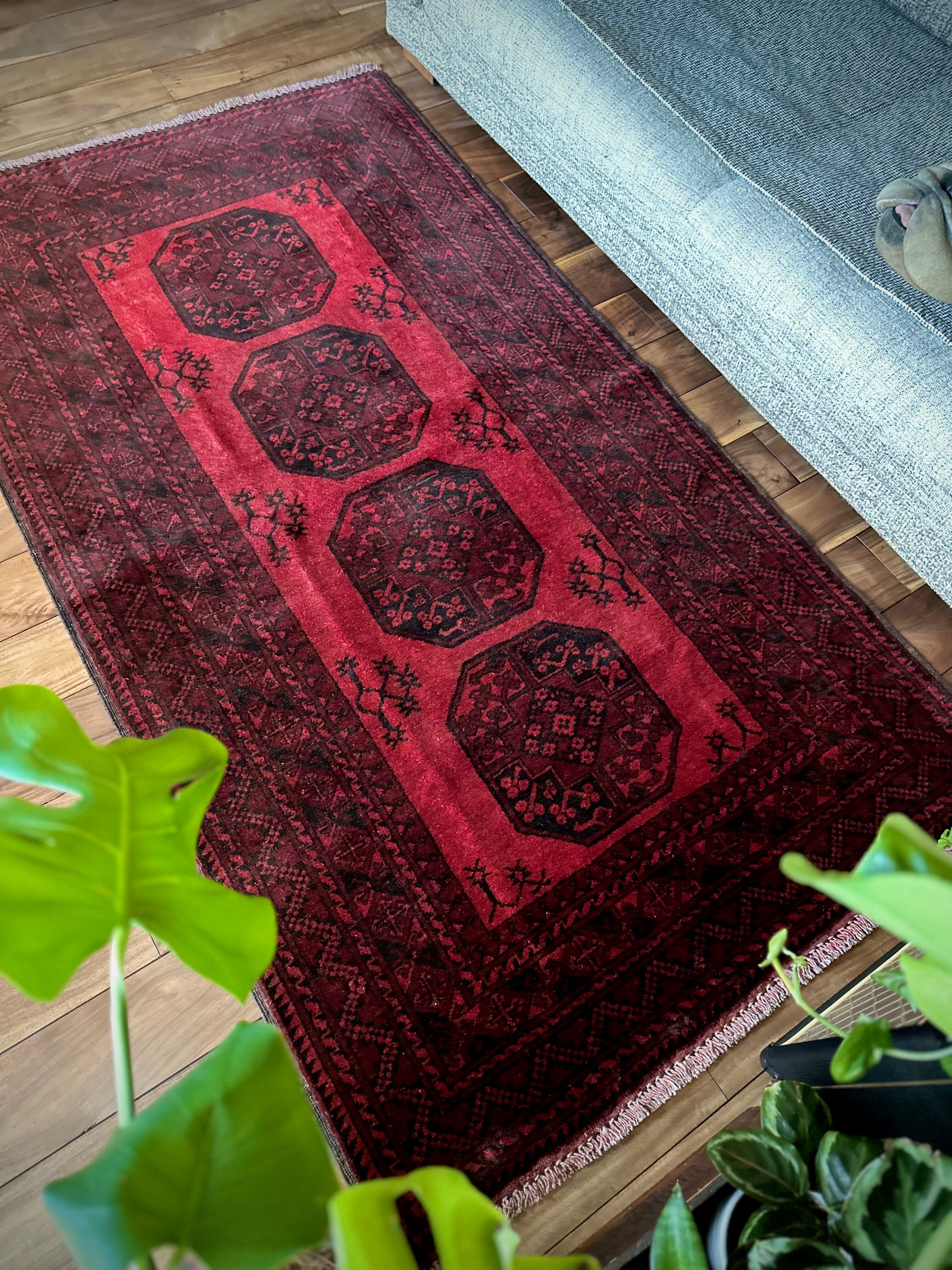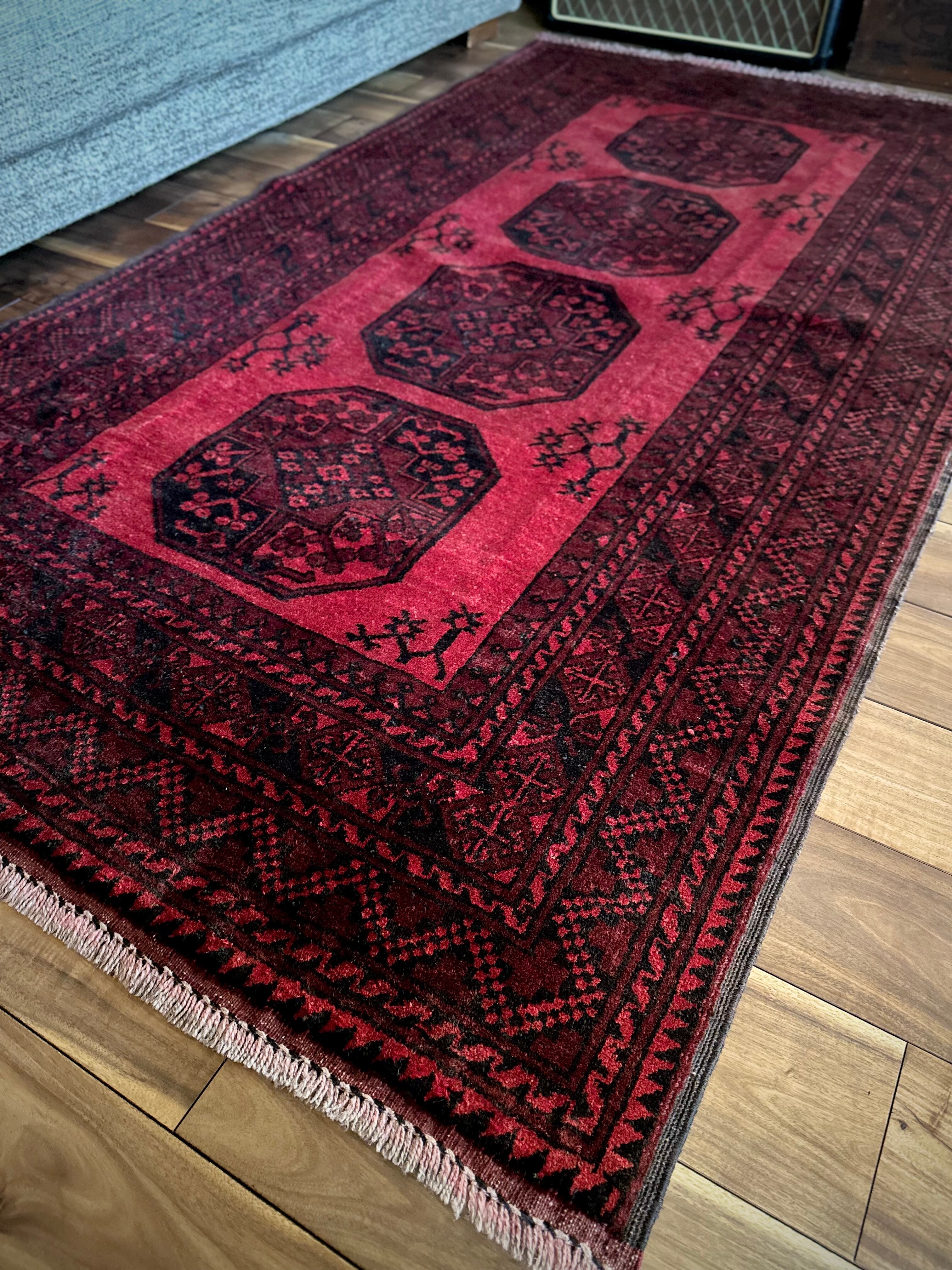 目を惹く真っ赤なフィールドに4連のスレイマンギュルがかっこいいこちらは、アフガニスタン北部に居住するトルクメンの支族で、フィルパイと呼ばれる象の足跡に似た紋様が特徴的なエルサリ族のトライバルラグになります。