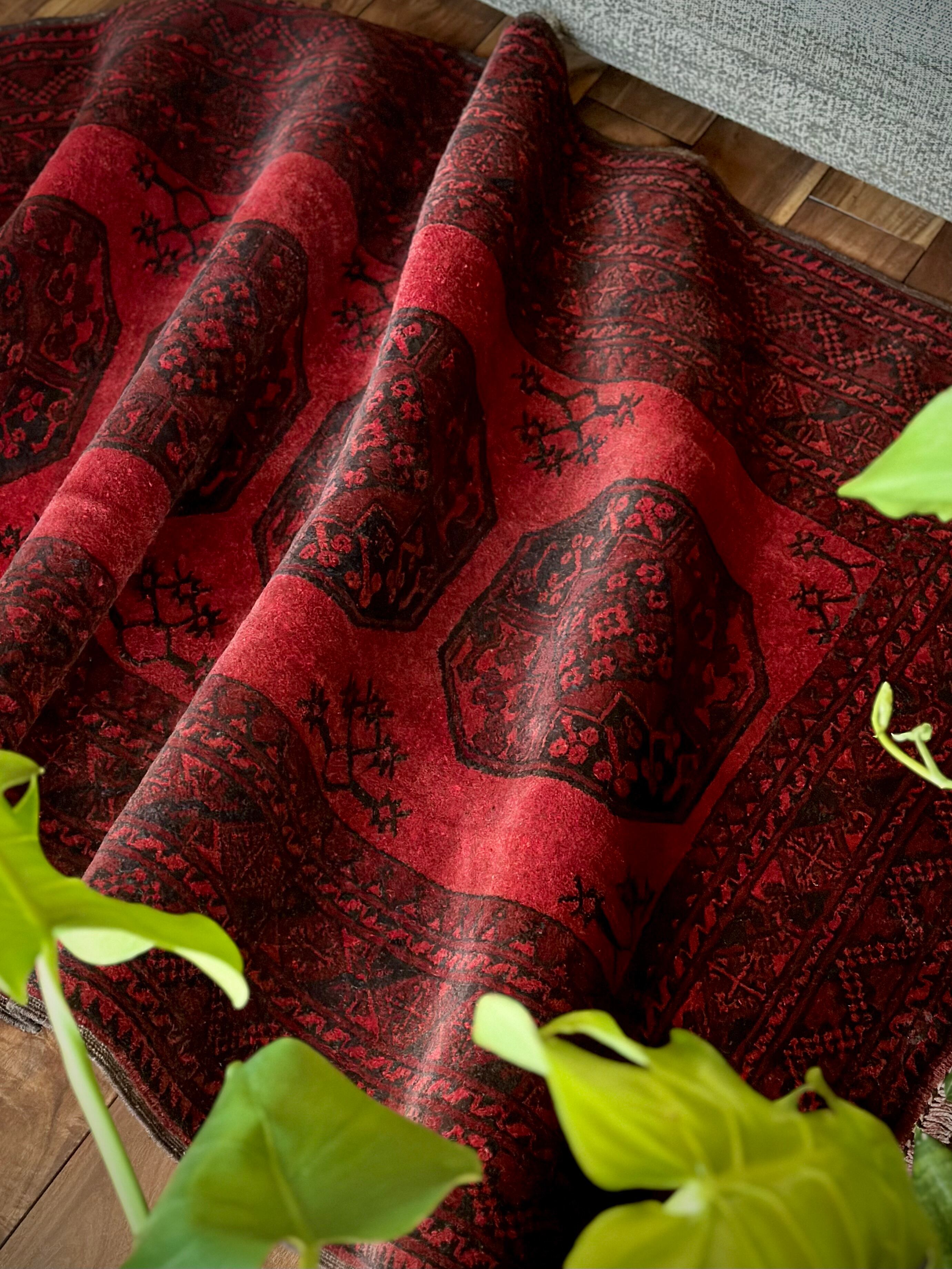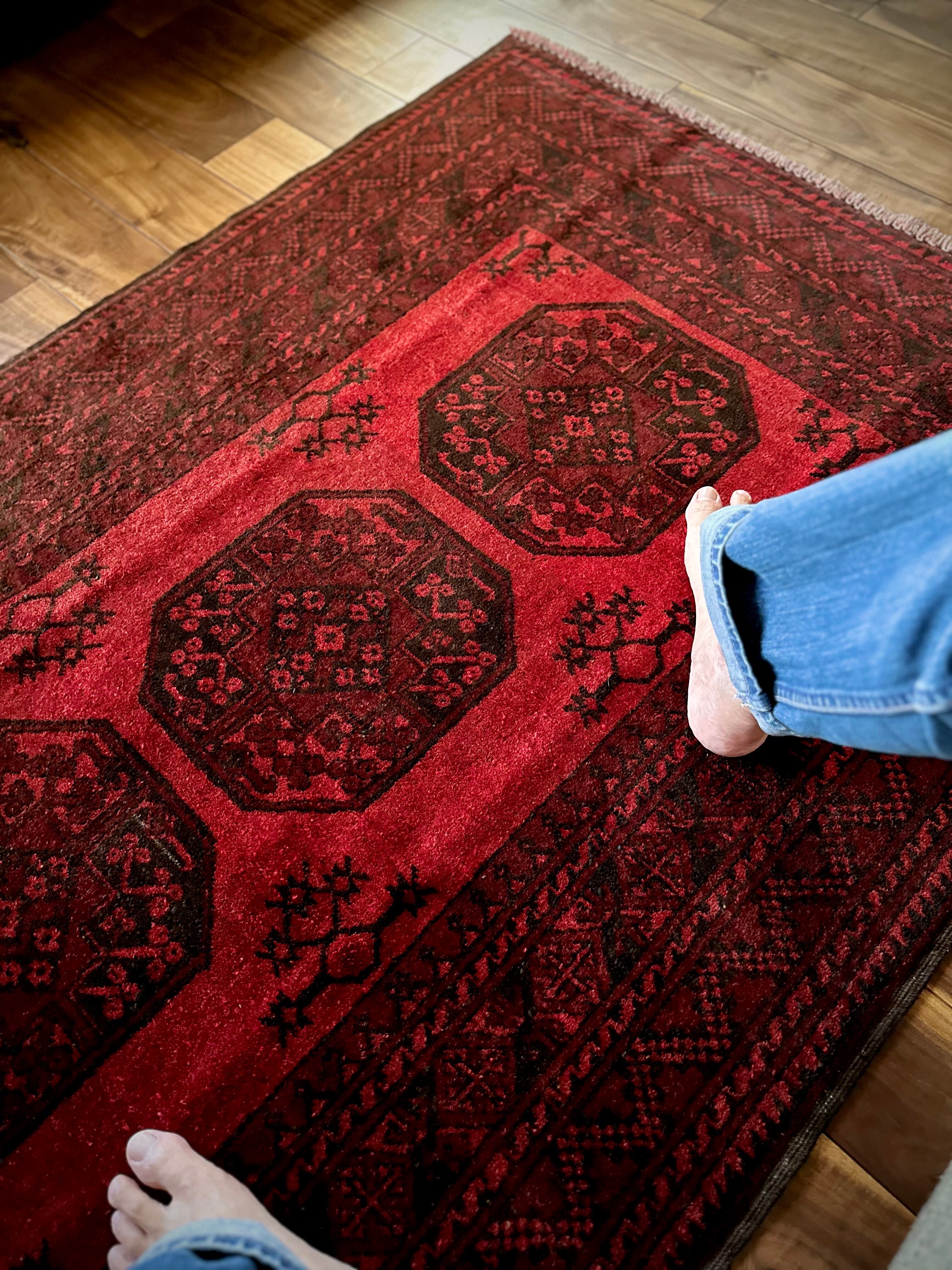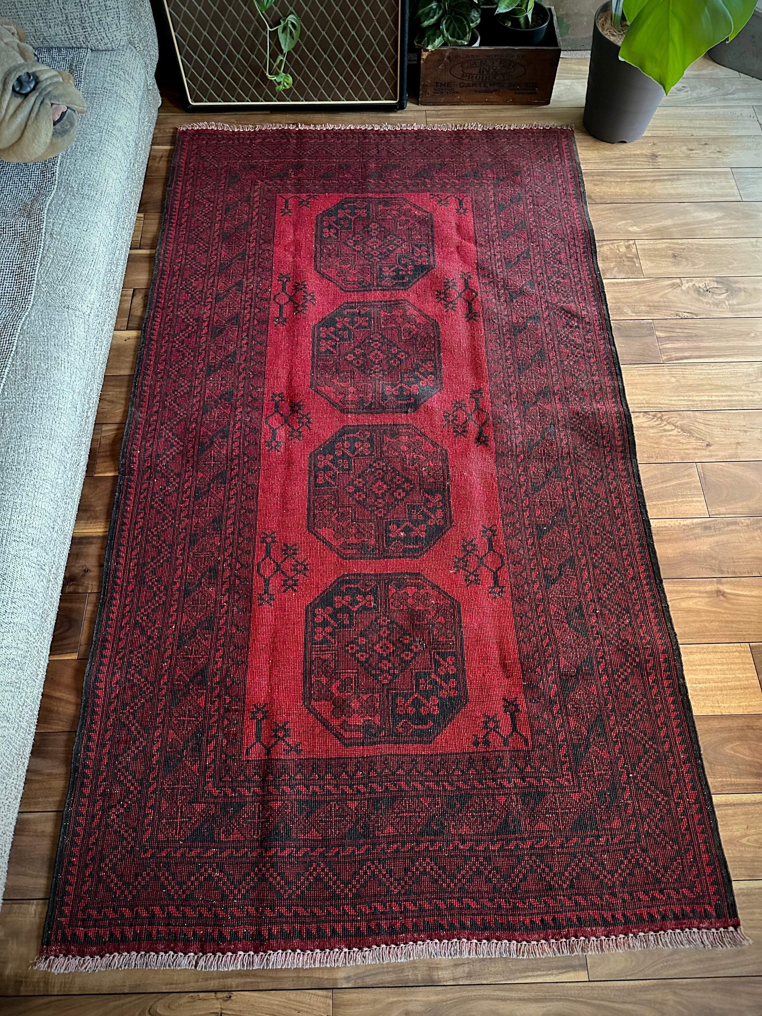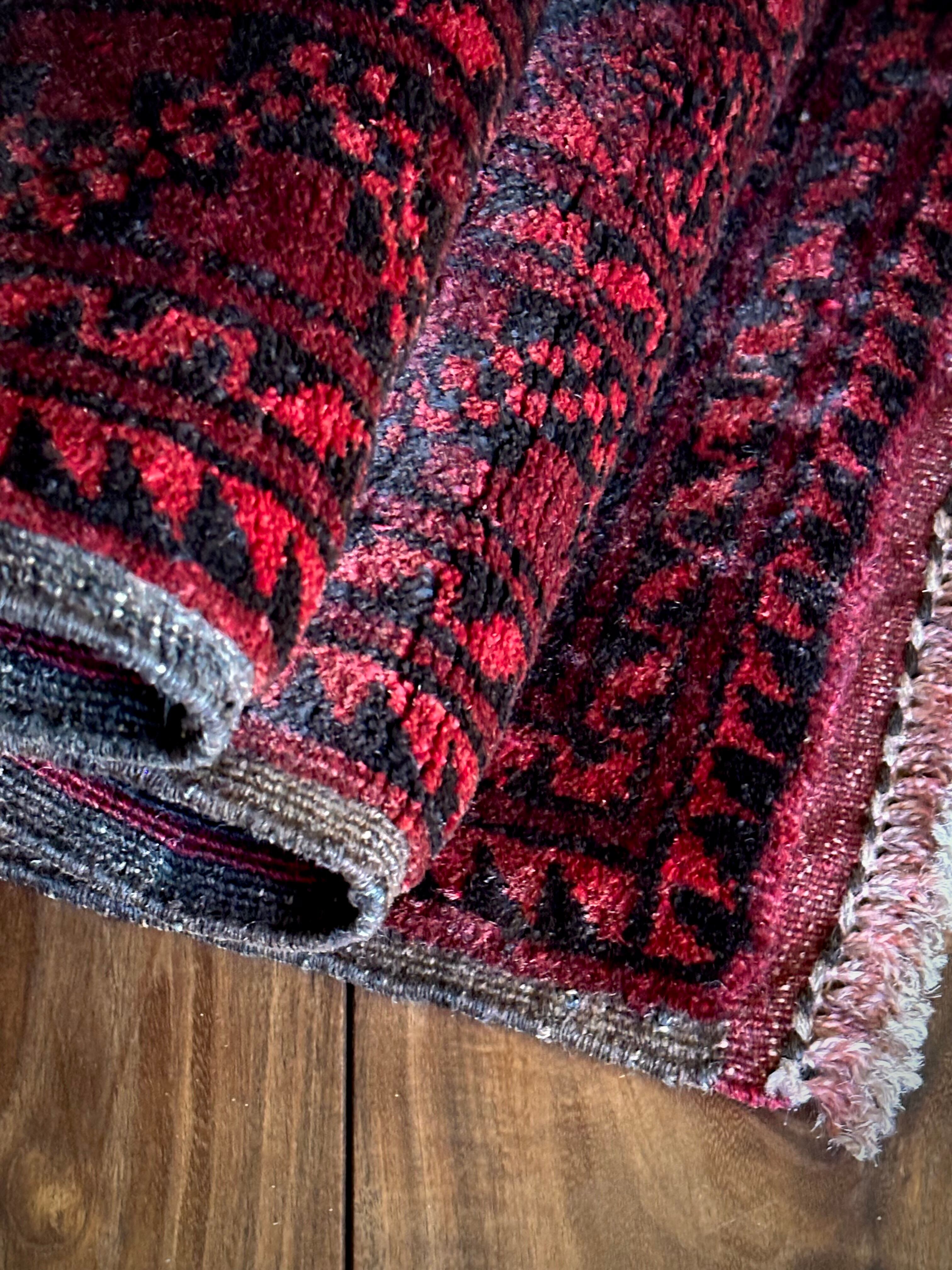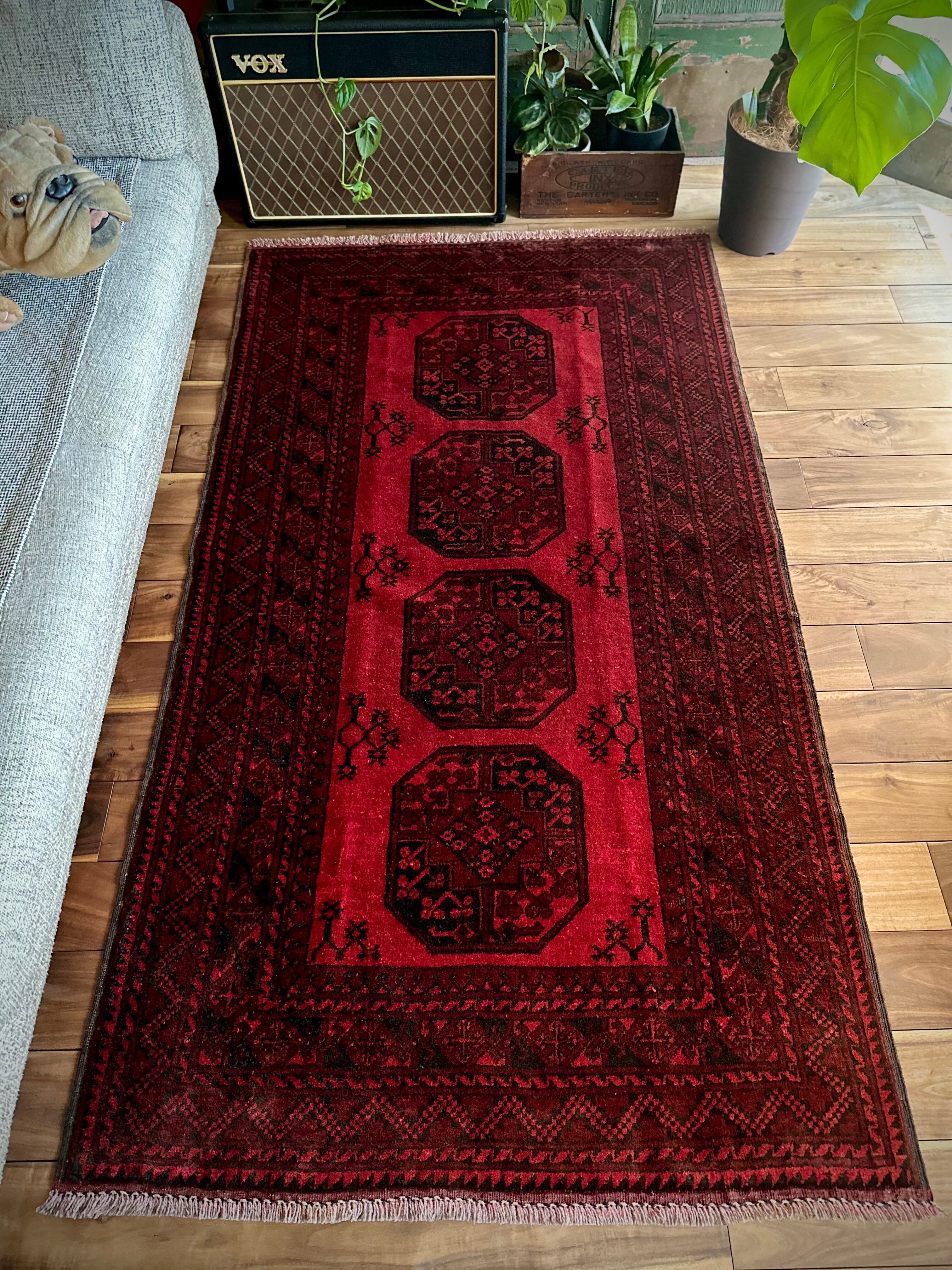 目を惹く真っ赤なフィールドに4連のスレイマンギュルがかっこいいこちらは、アフガニスタン北部に居住するトルクメンの支族で、フィルパイと呼ばれる象の足跡に似た紋様が特徴的なエルサリ族のトライバルラグになります。