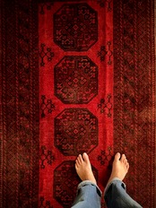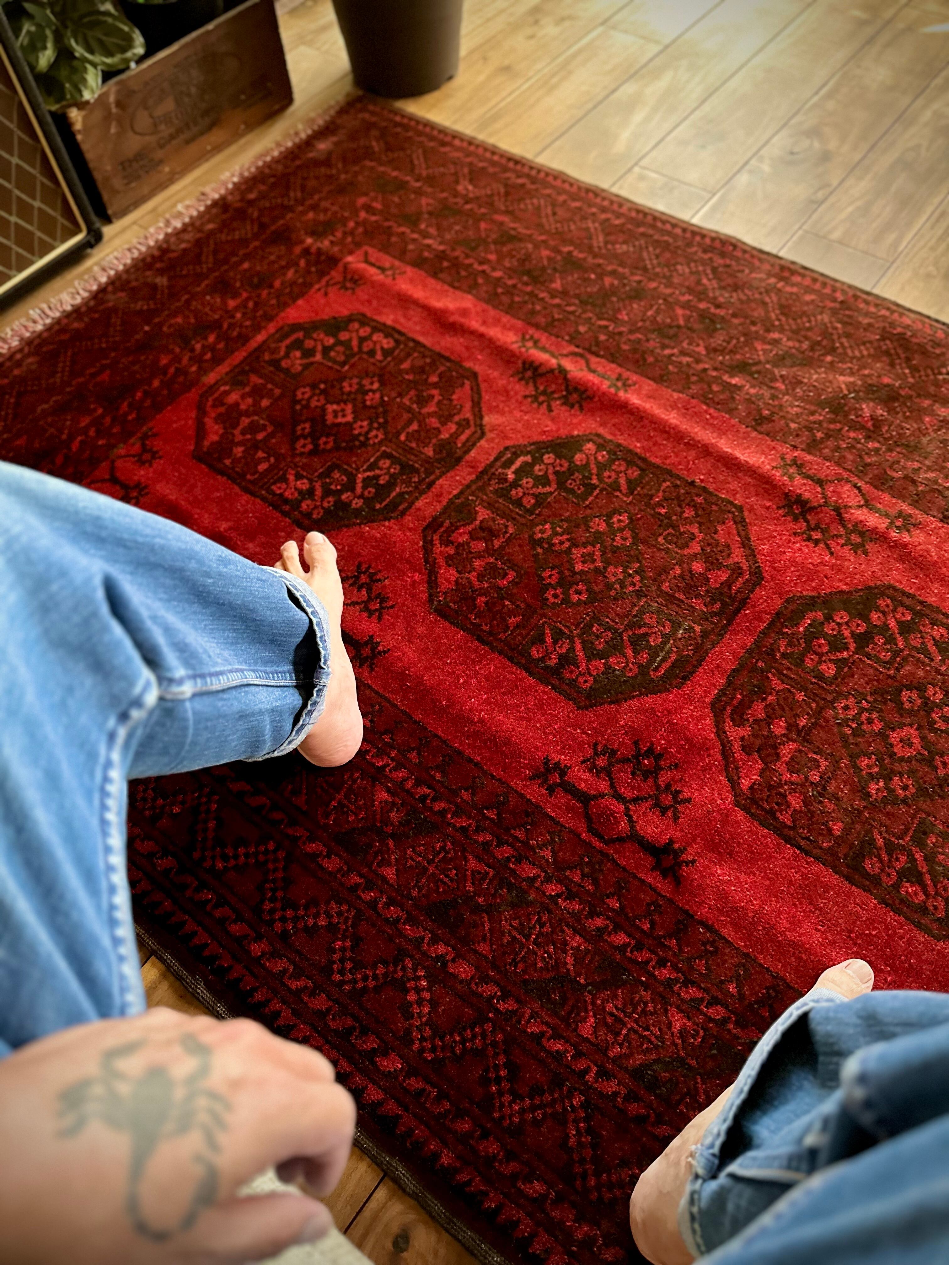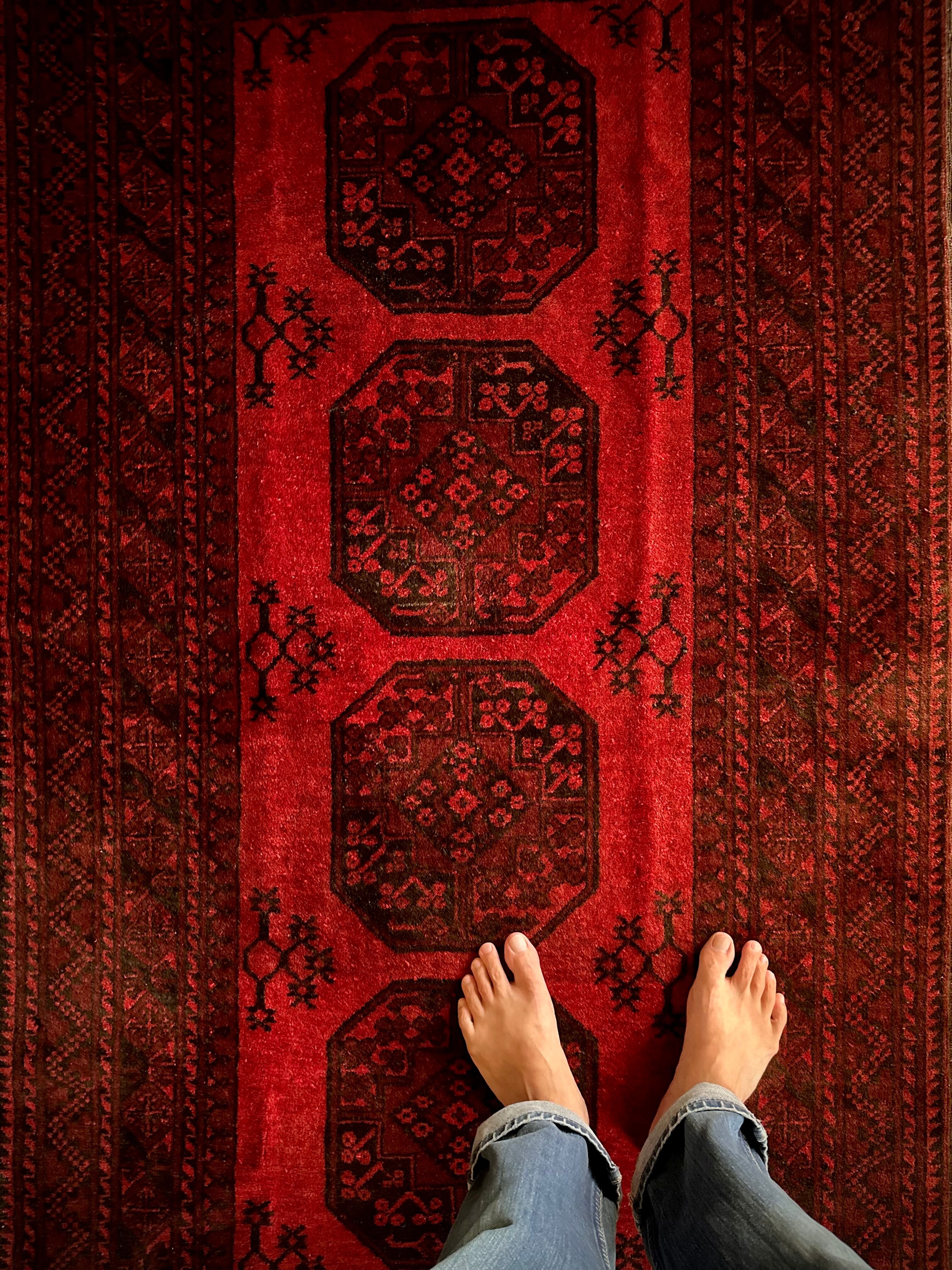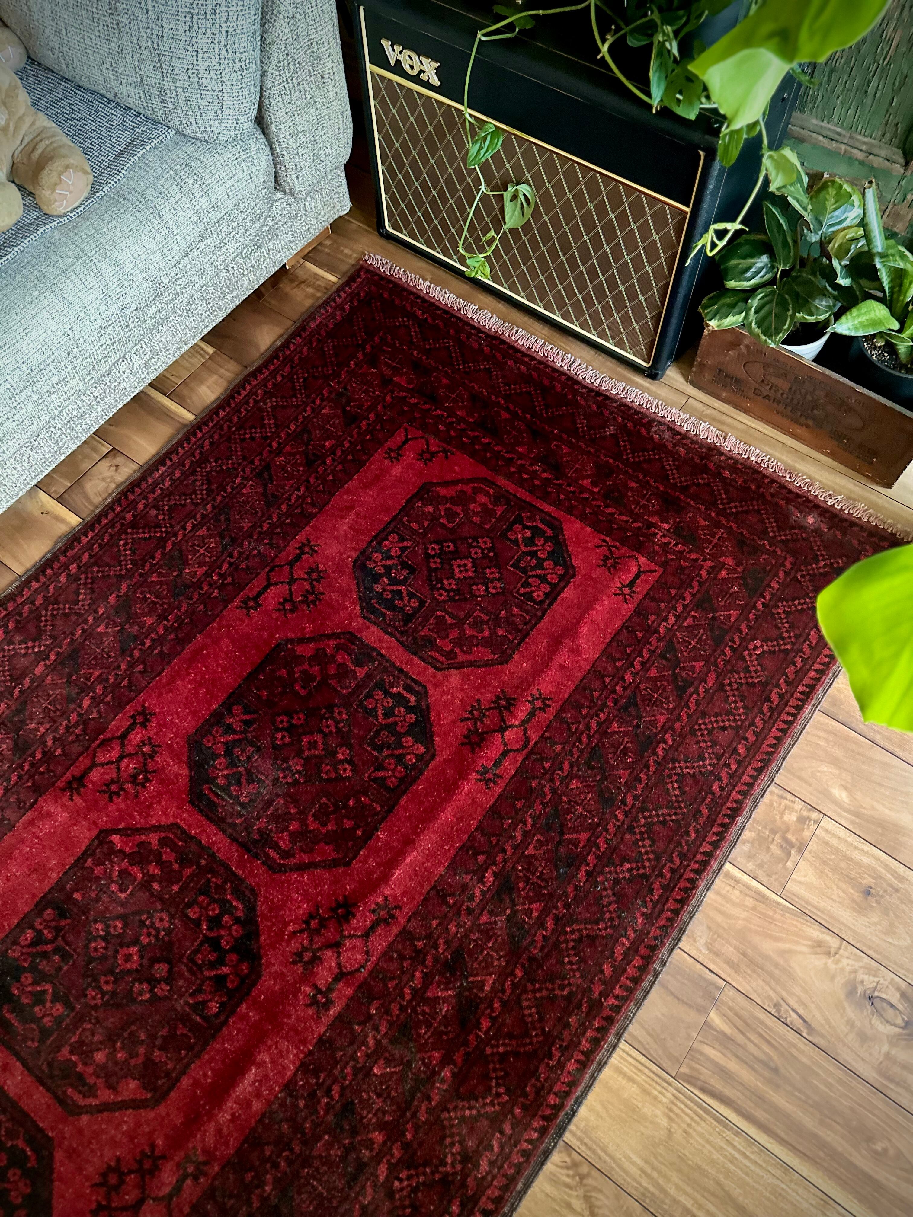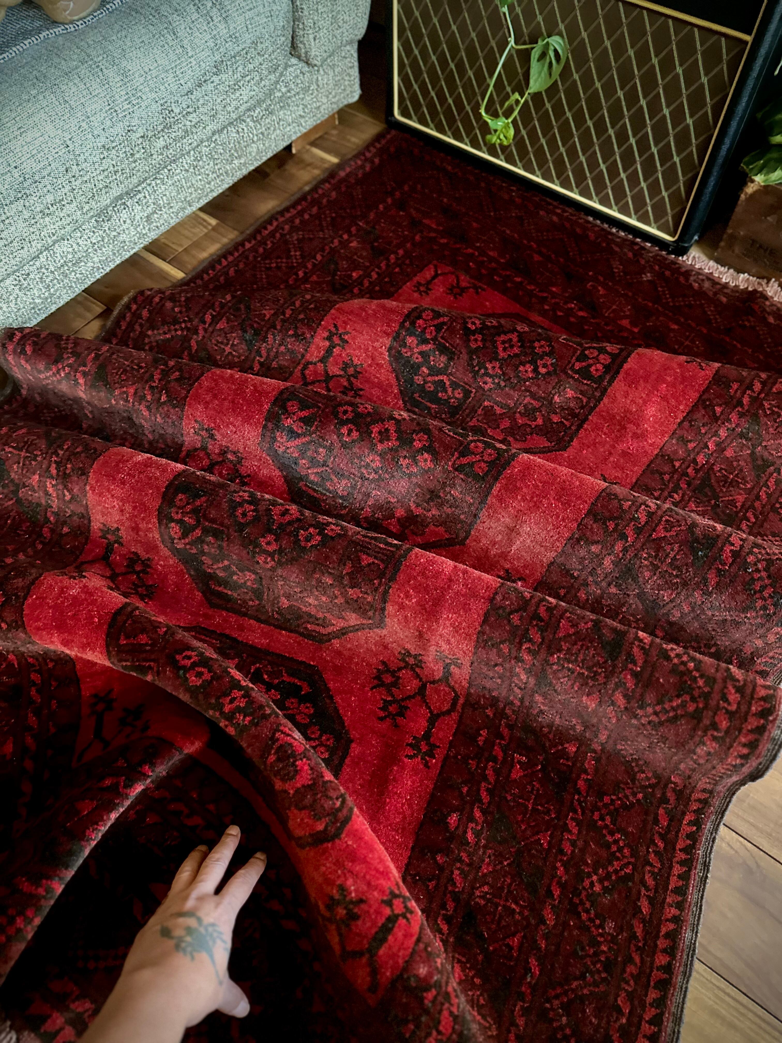 目を惹く真っ赤なフィールドに4連のスレイマンギュルがかっこいいこちらは、アフガニスタン北部に居住するトルクメンの支族で、フィルパイと呼ばれる象の足跡に似た紋様が特徴的なエルサリ族のトライバルラグになります。