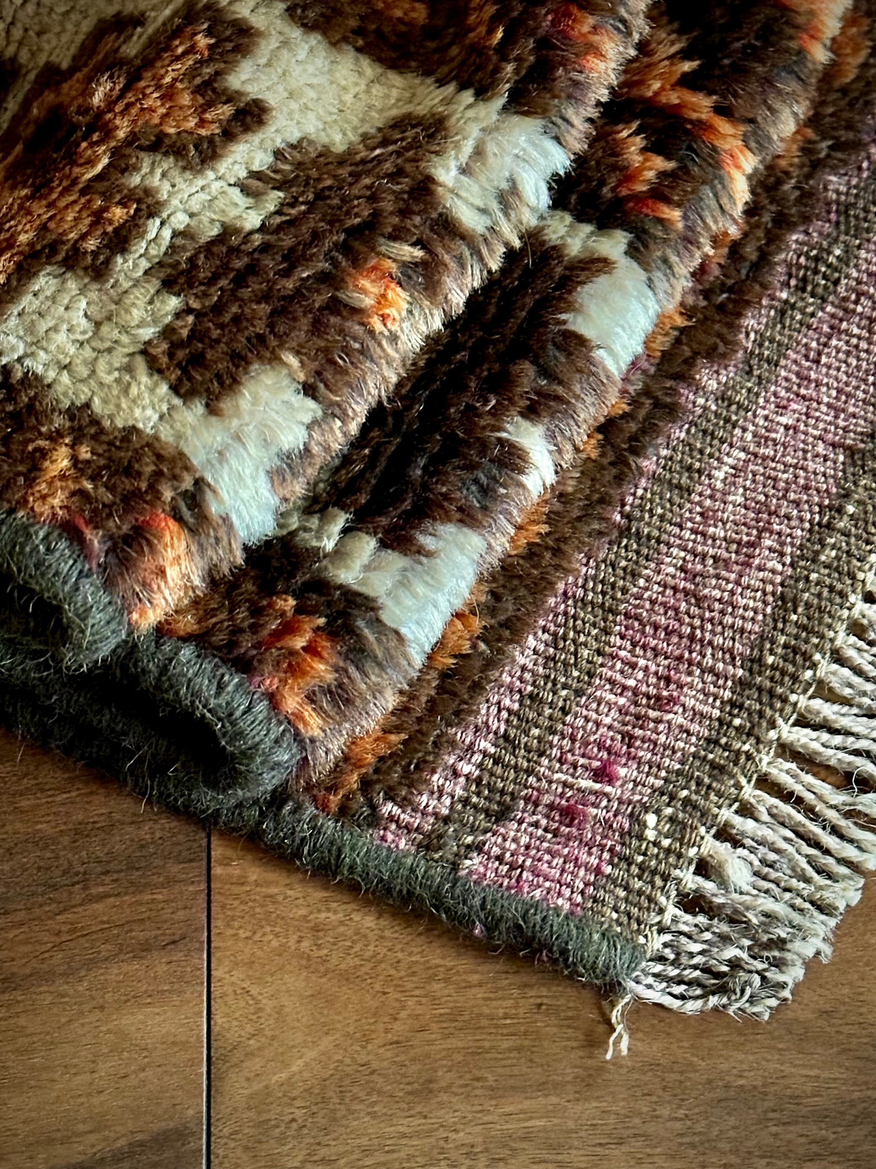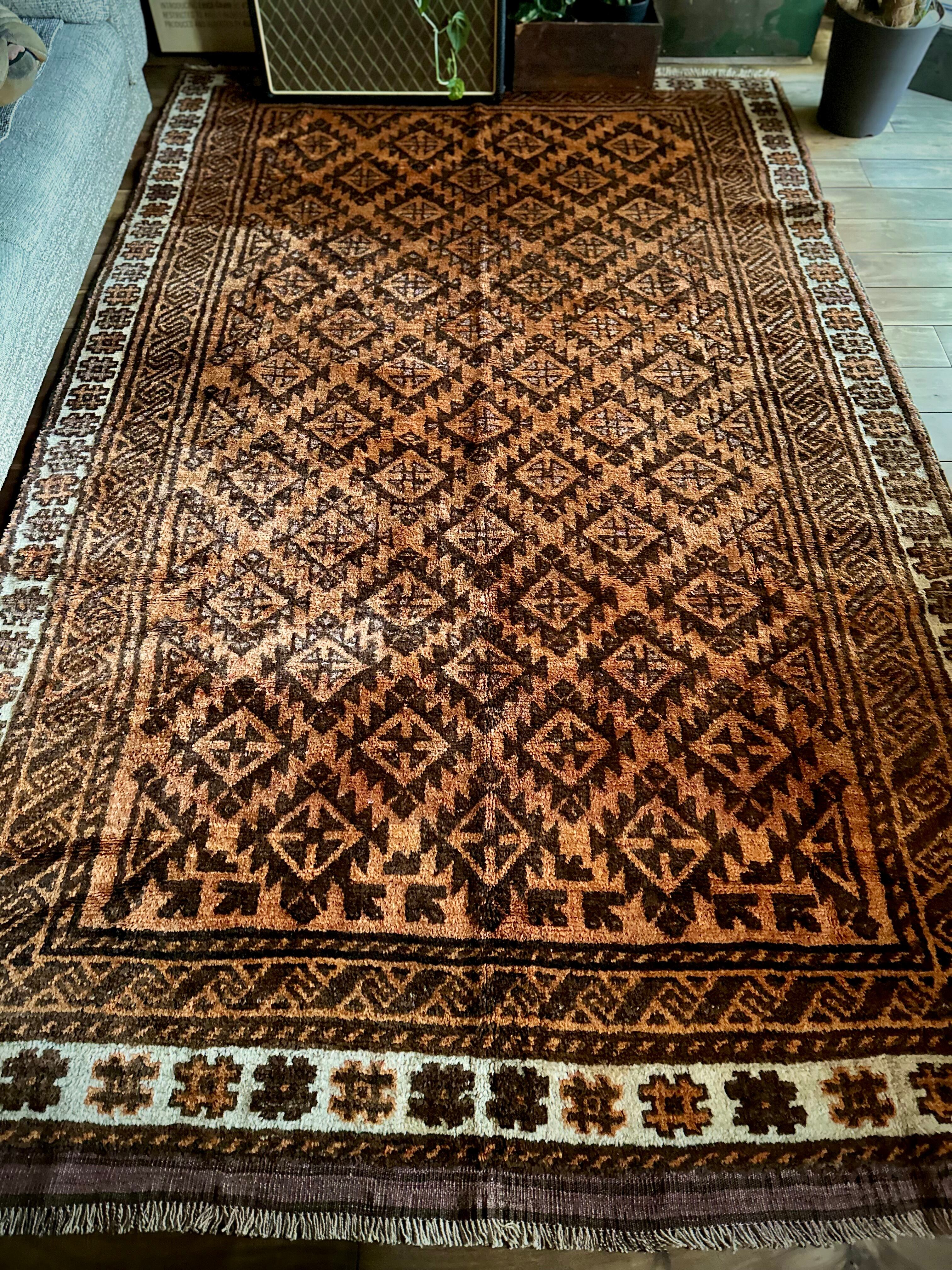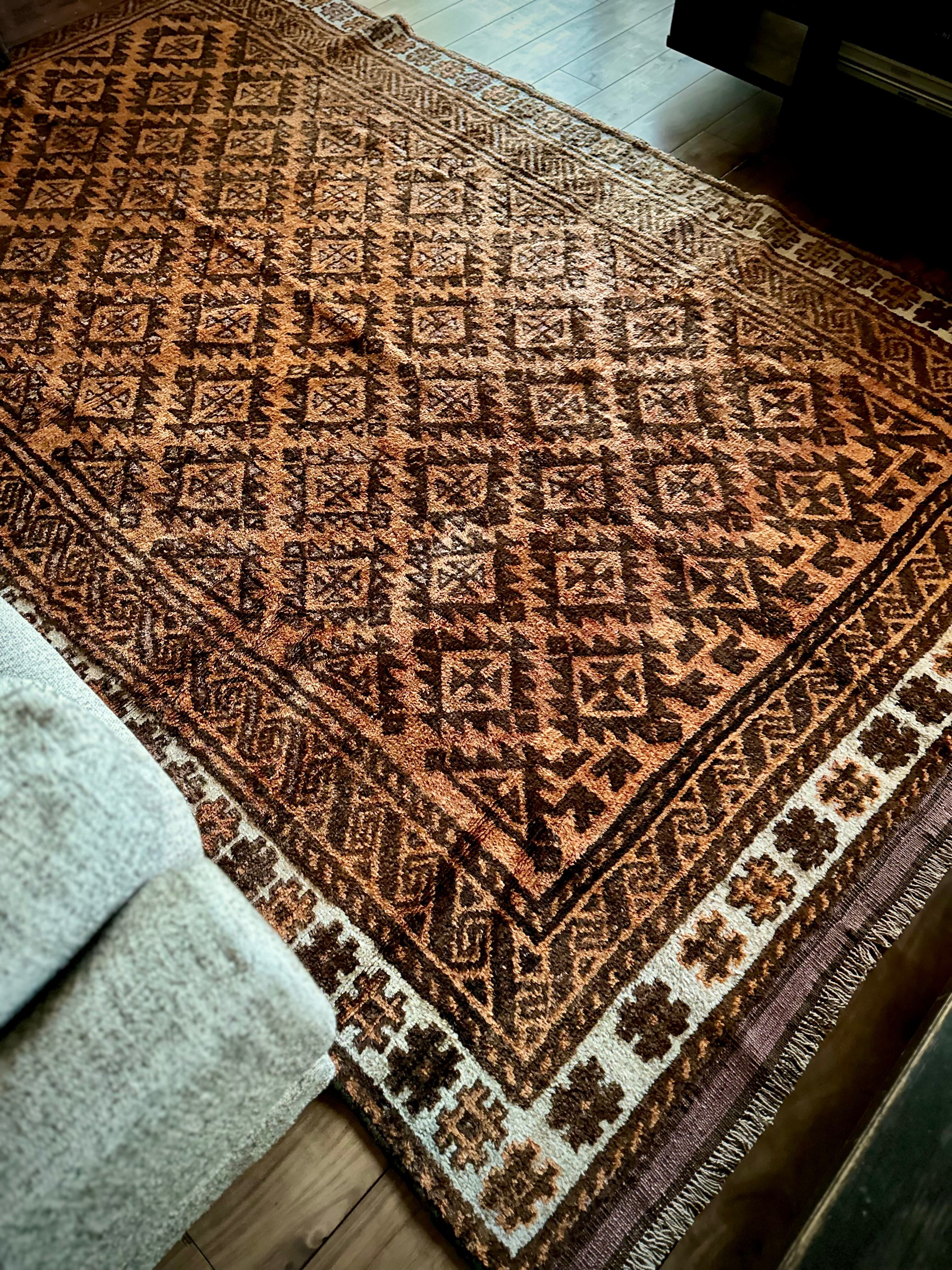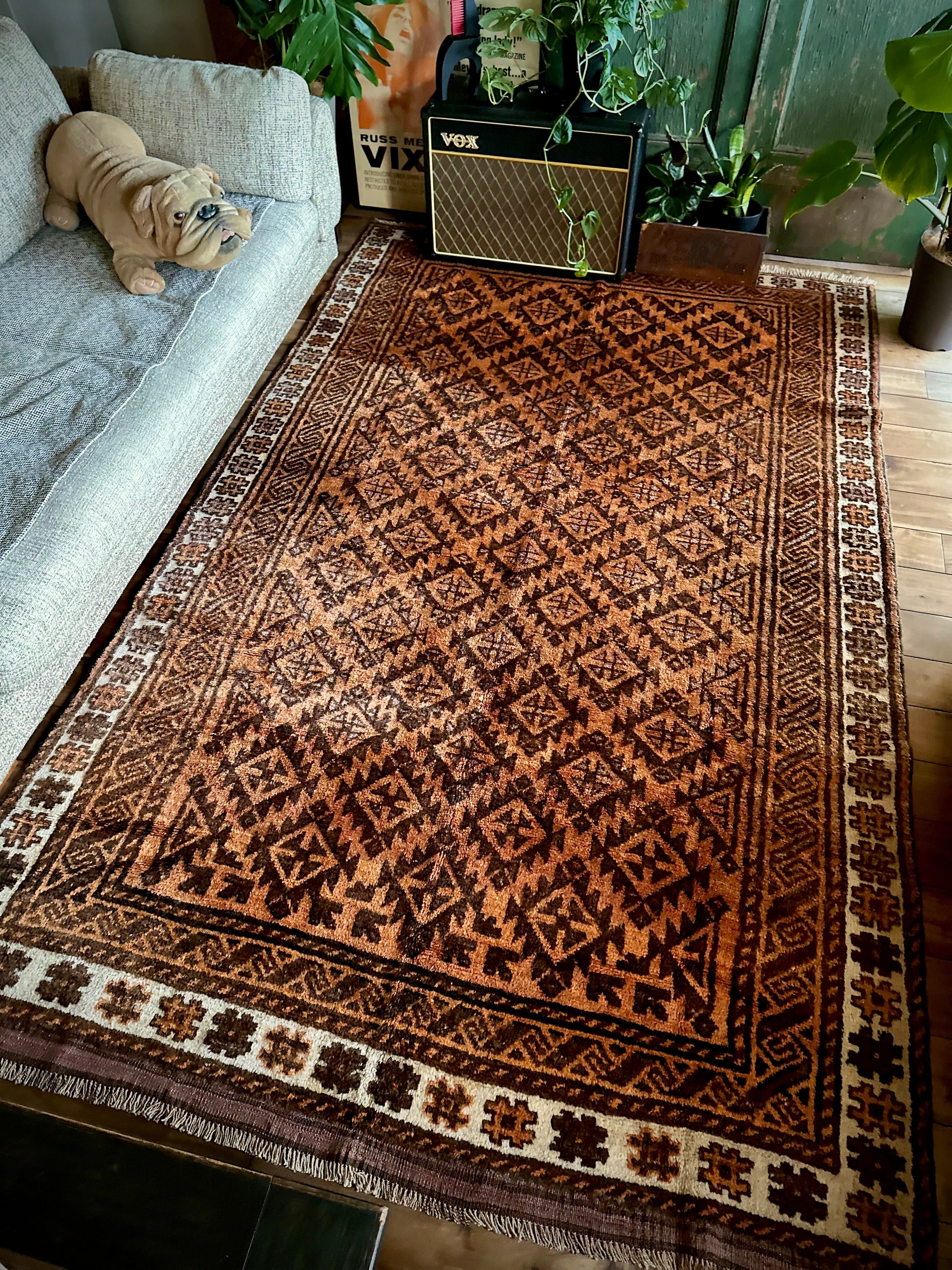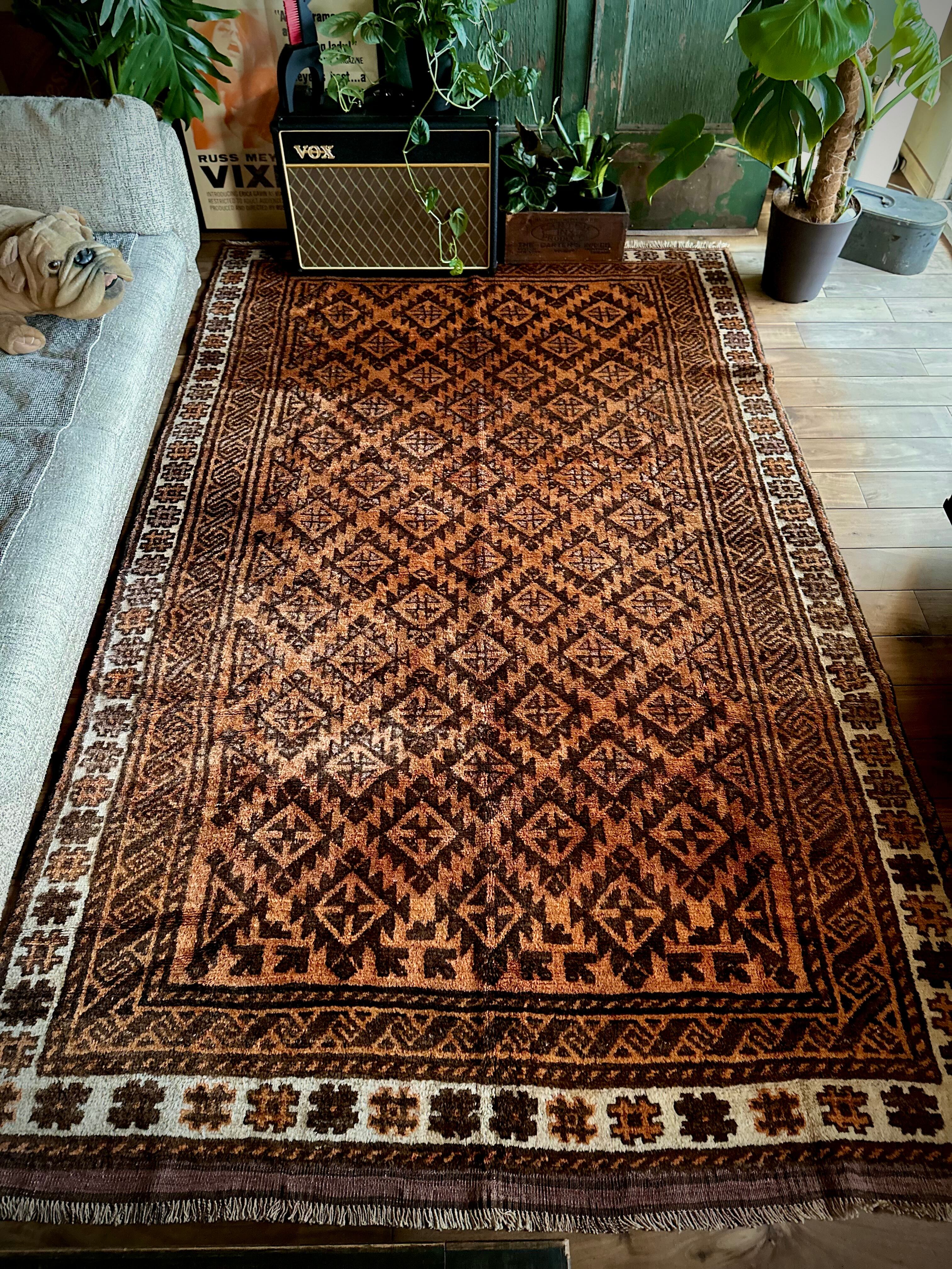 最後にラグそのものに関しては羊毛特有の匂いがあり、採寸は中央付近で計測していますが、手織りならではの歪みによる誤差や水洗いクリーニングによる縮み、また草木染めによる経年劣化の色ムラなどがありますが、それもまたヴィンテージラグの魅力かとご理解ください。