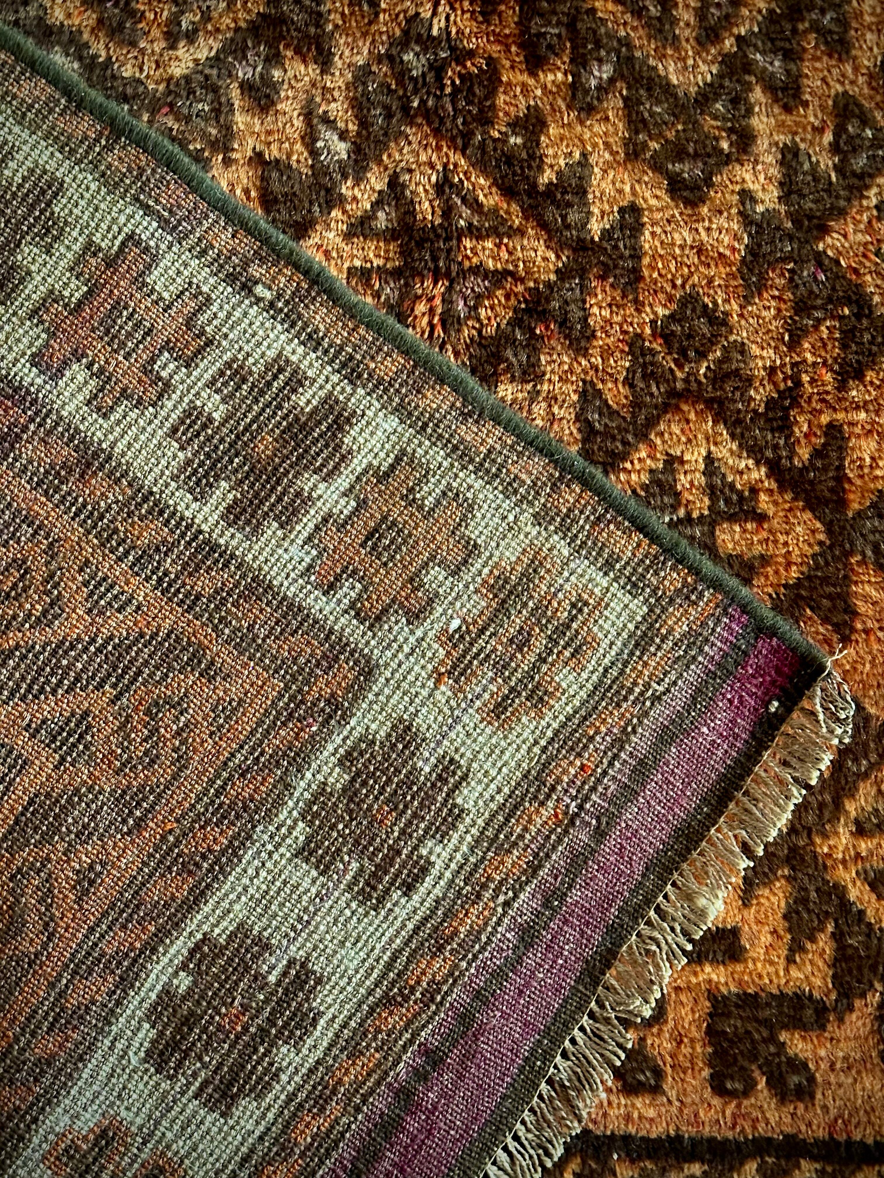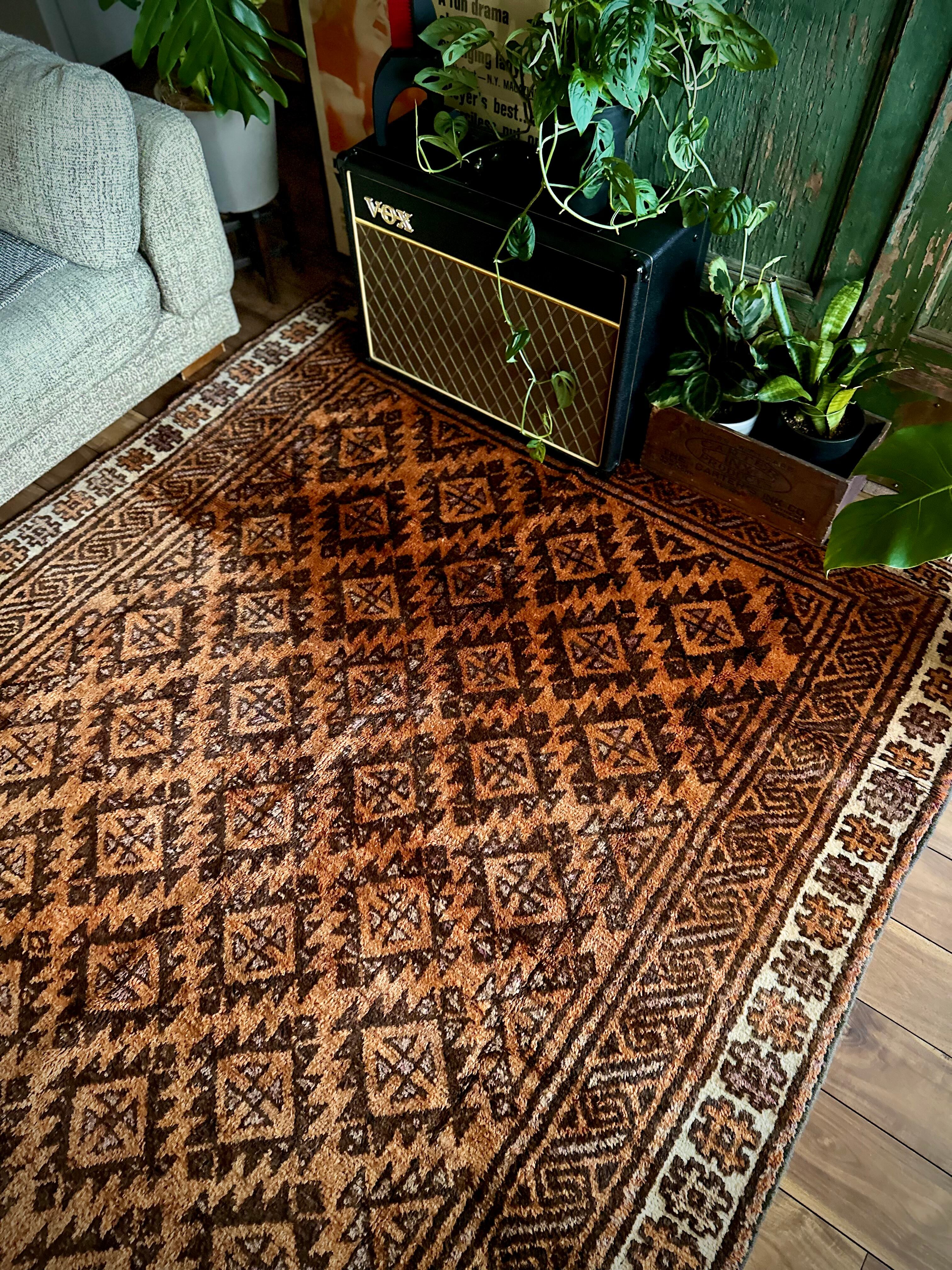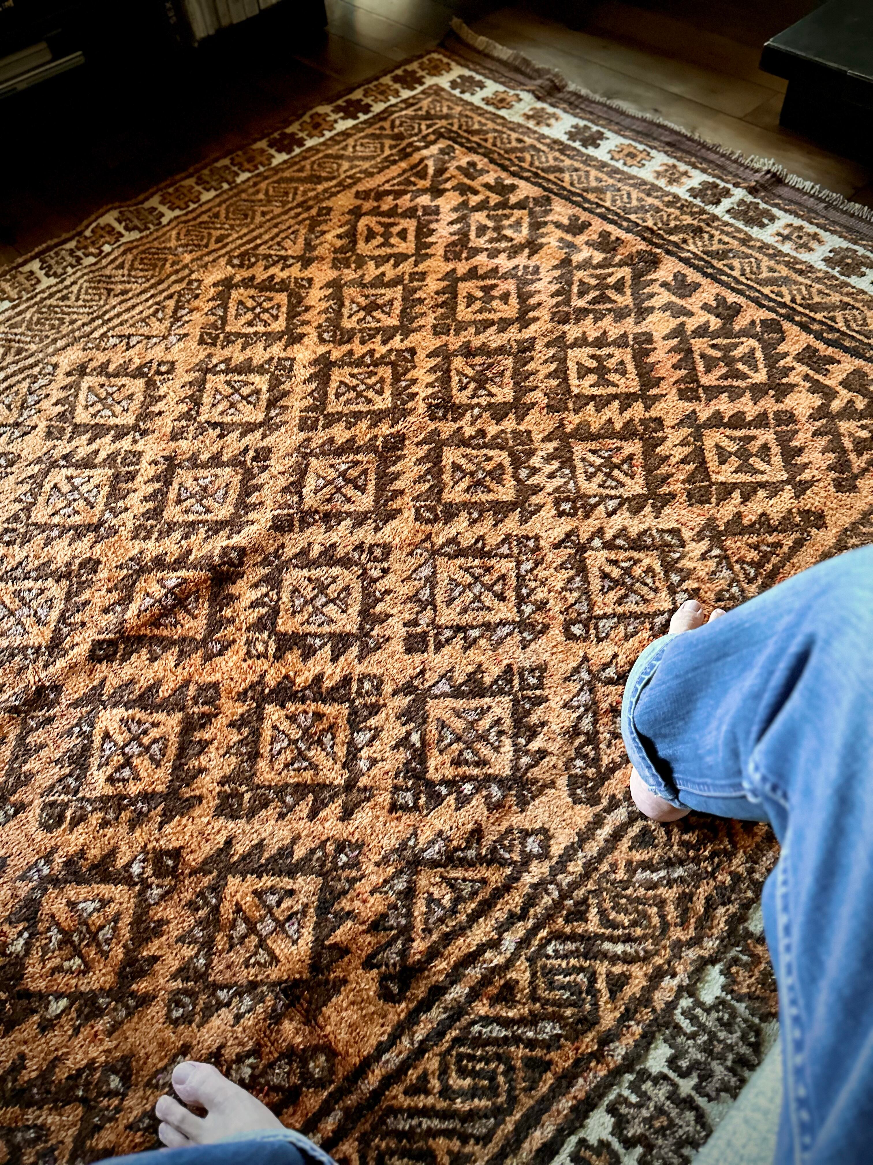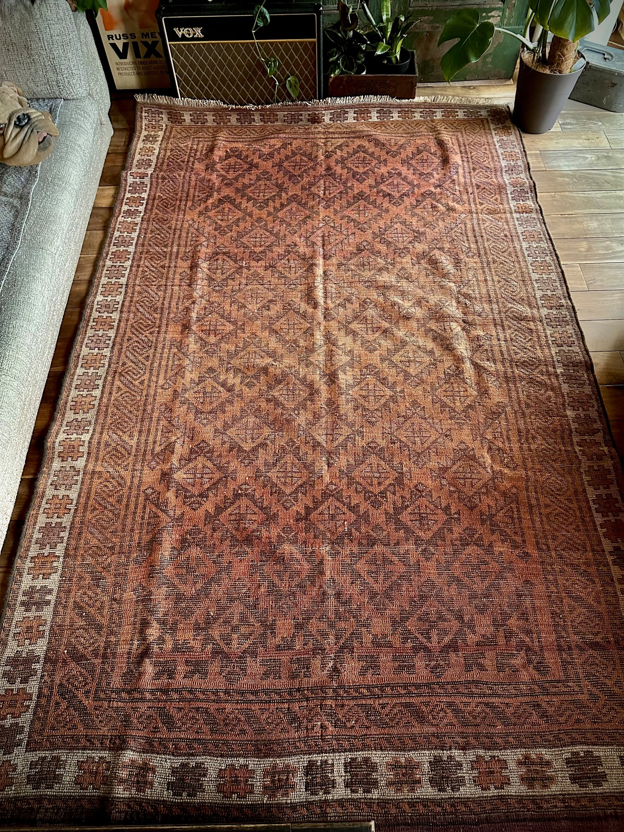 最後にラグそのものに関しては羊毛特有の匂いがあり、採寸は中央付近で計測していますが、手織りならではの歪みによる誤差や水洗いクリーニングによる縮み、また草木染めによる経年劣化の色ムラなどがありますが、それもまたヴィンテージラグの魅力かとご理解ください。