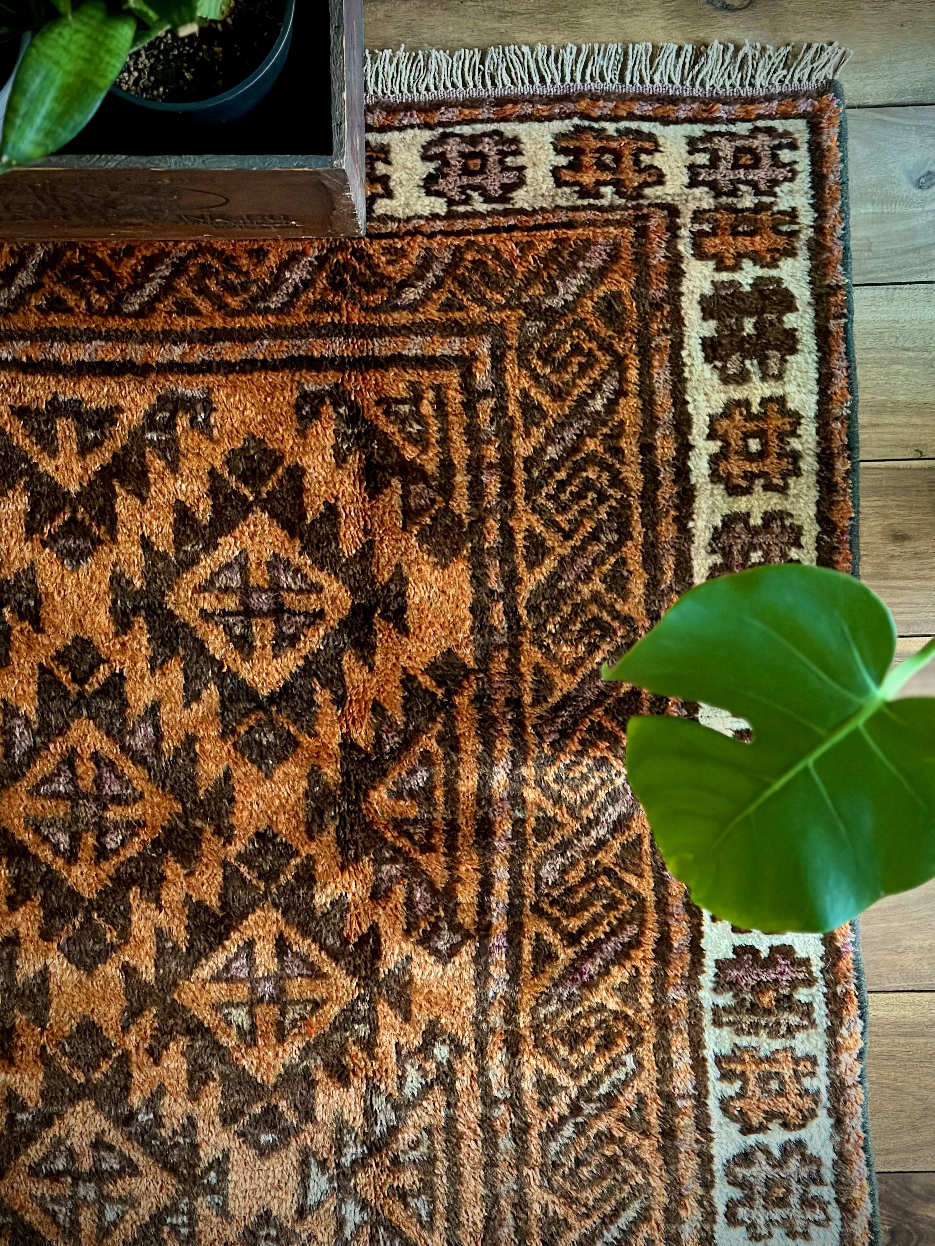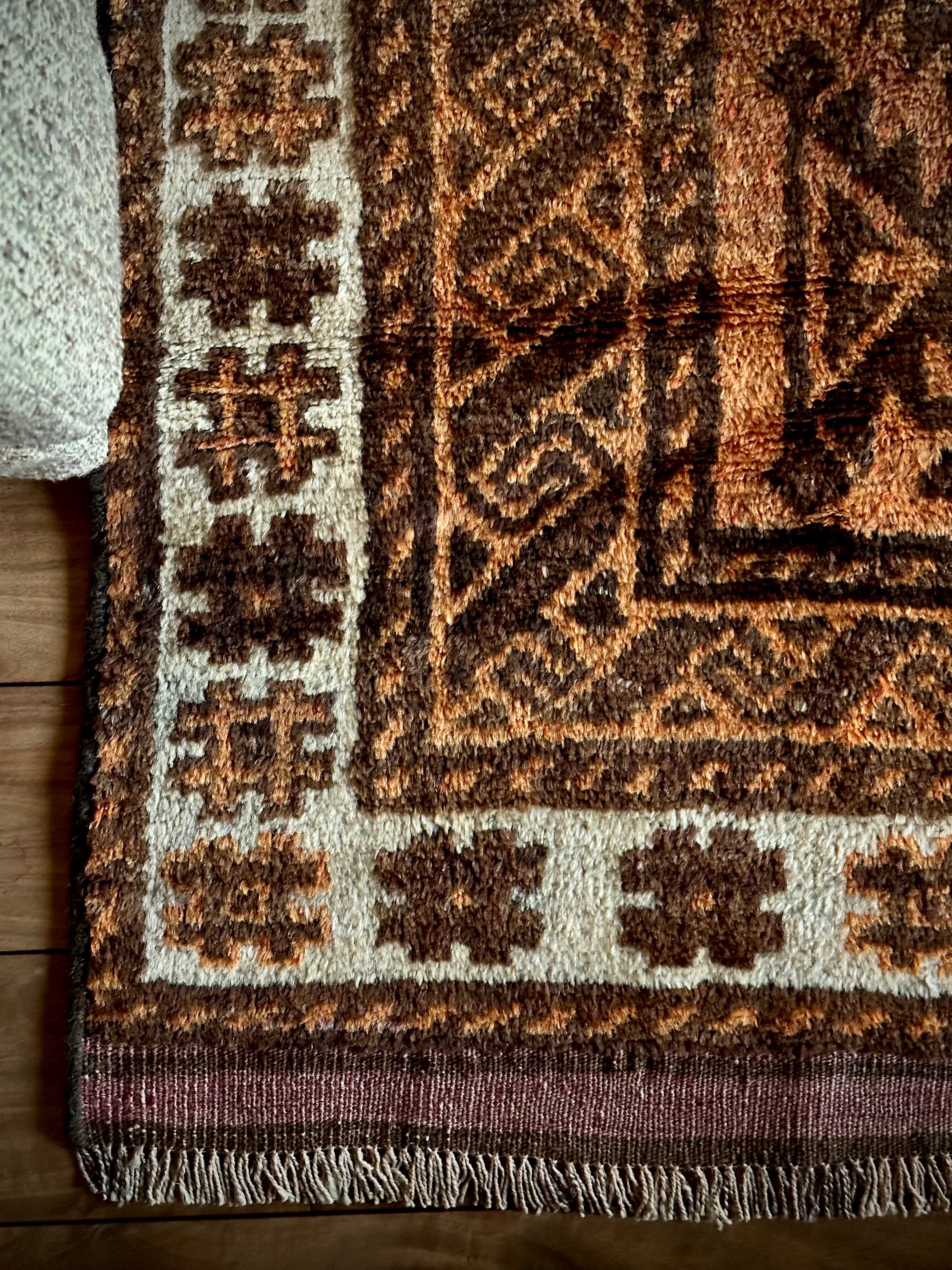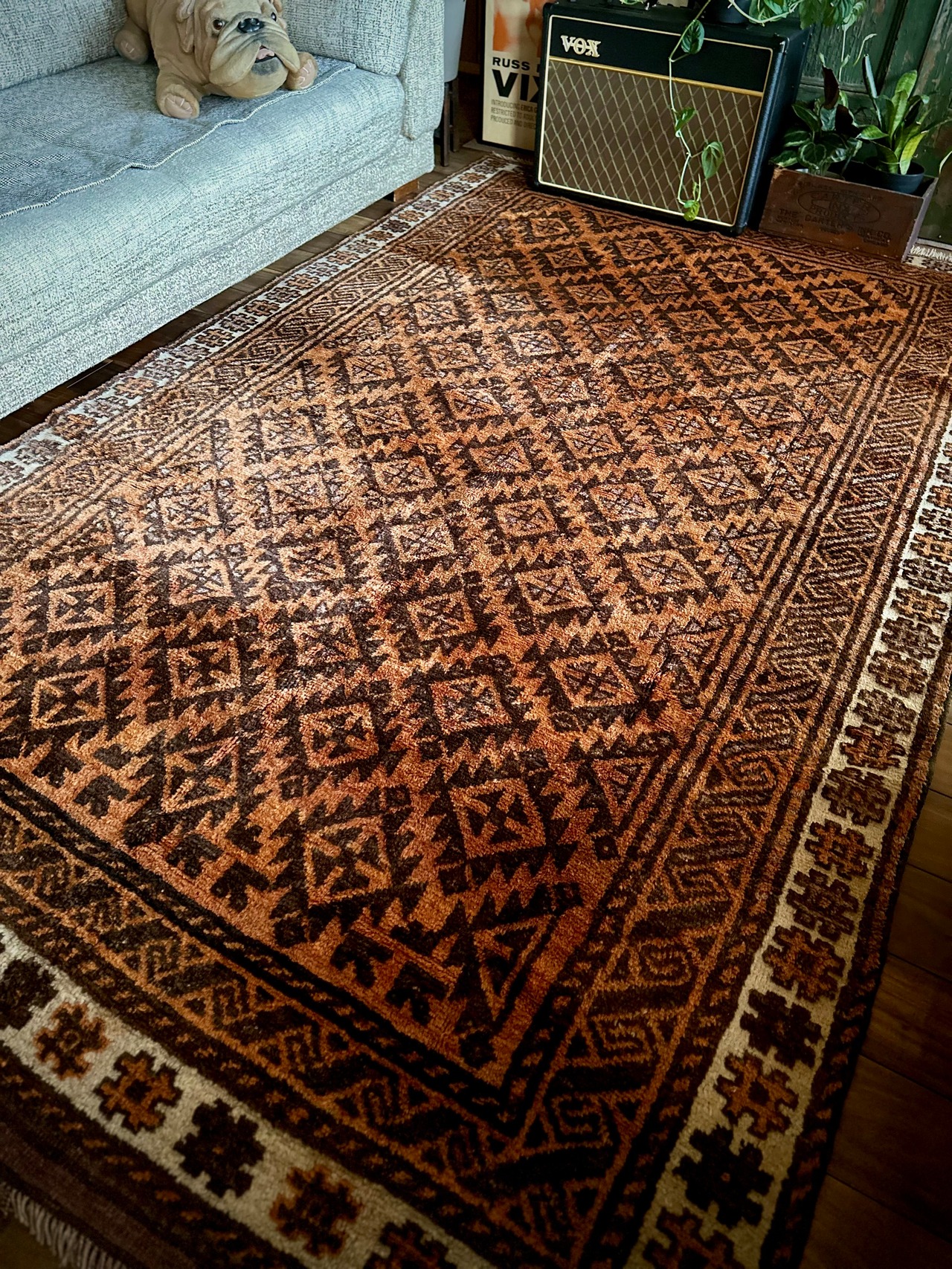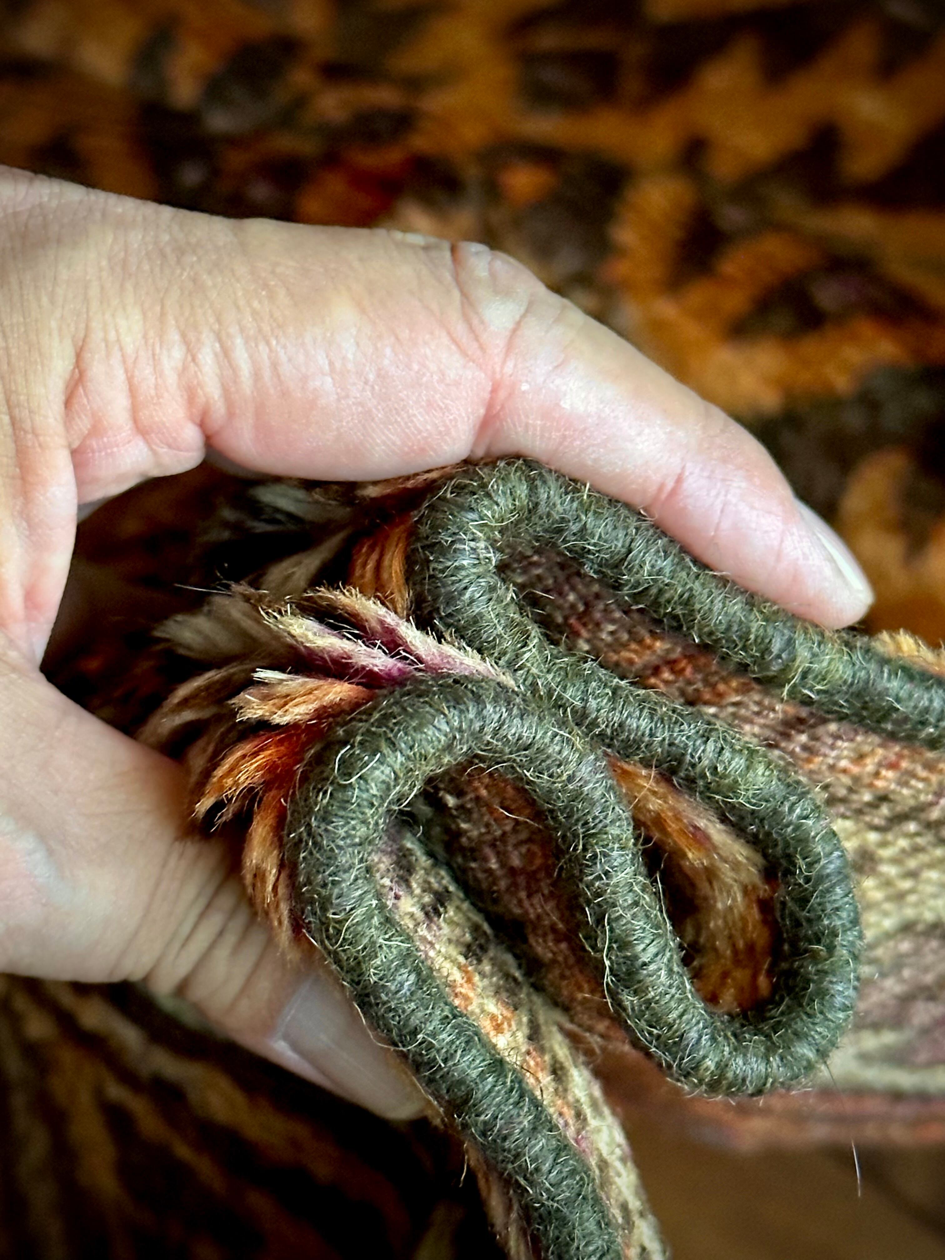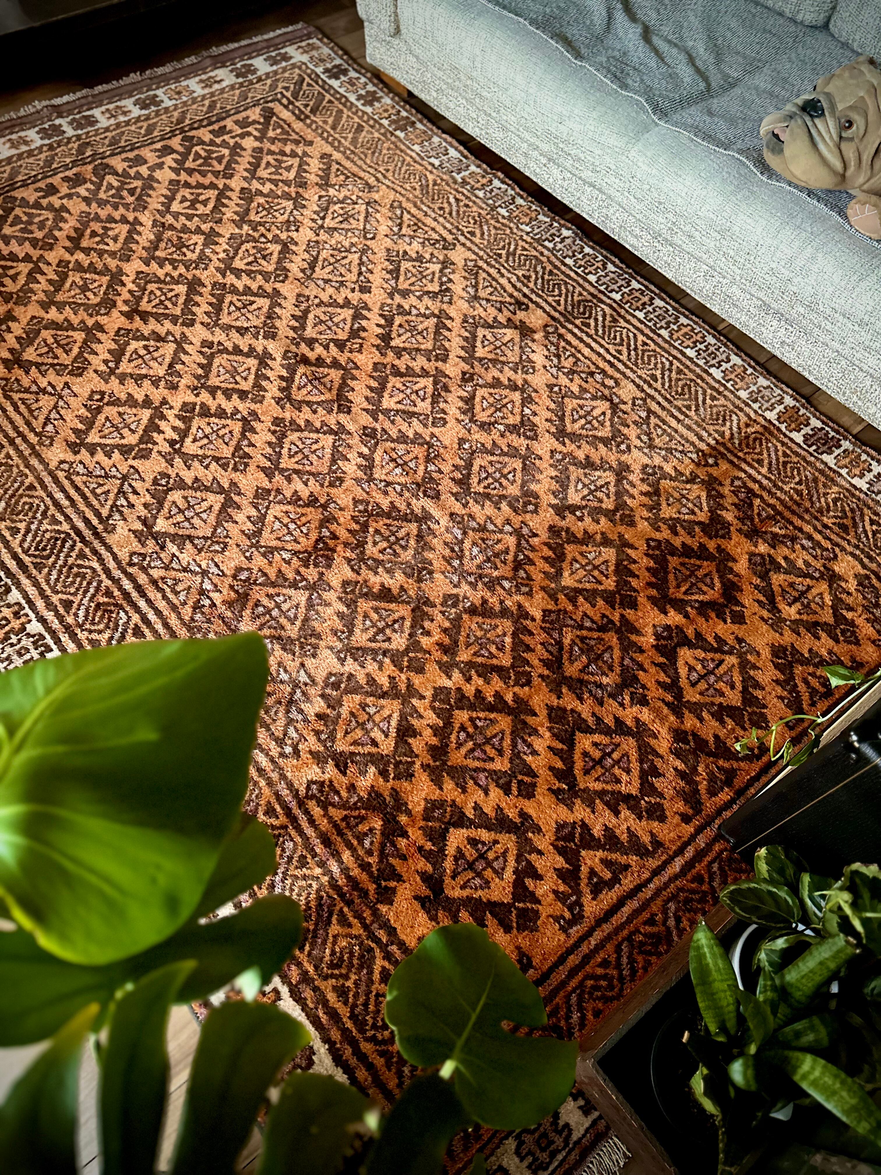 最後にラグそのものに関しては羊毛特有の匂いがあり、採寸は中央付近で計測していますが、手織りならではの歪みによる誤差や水洗いクリーニングによる縮み、また草木染めによる経年劣化の色ムラなどがありますが、それもまたヴィンテージラグの魅力かとご理解ください。