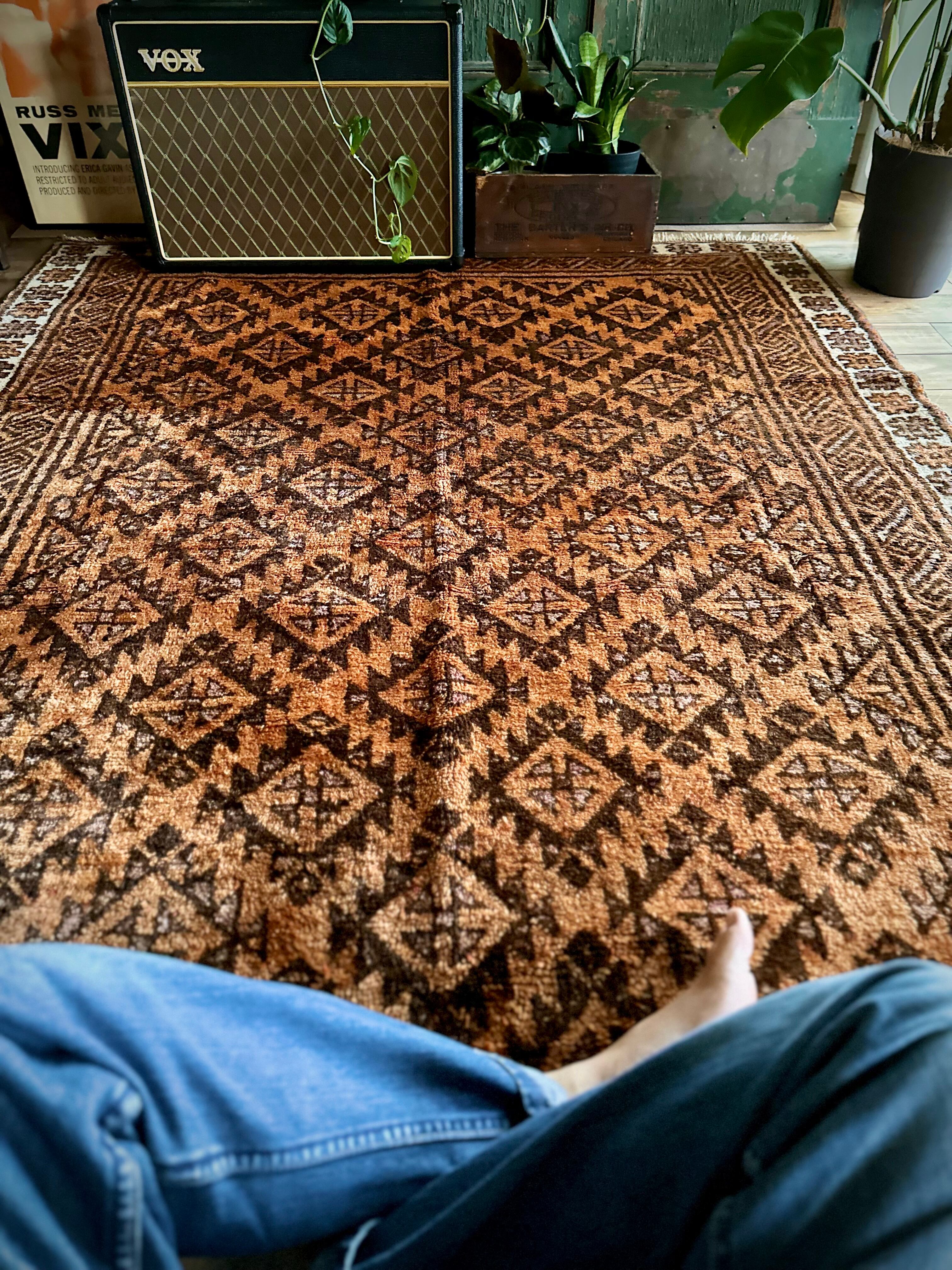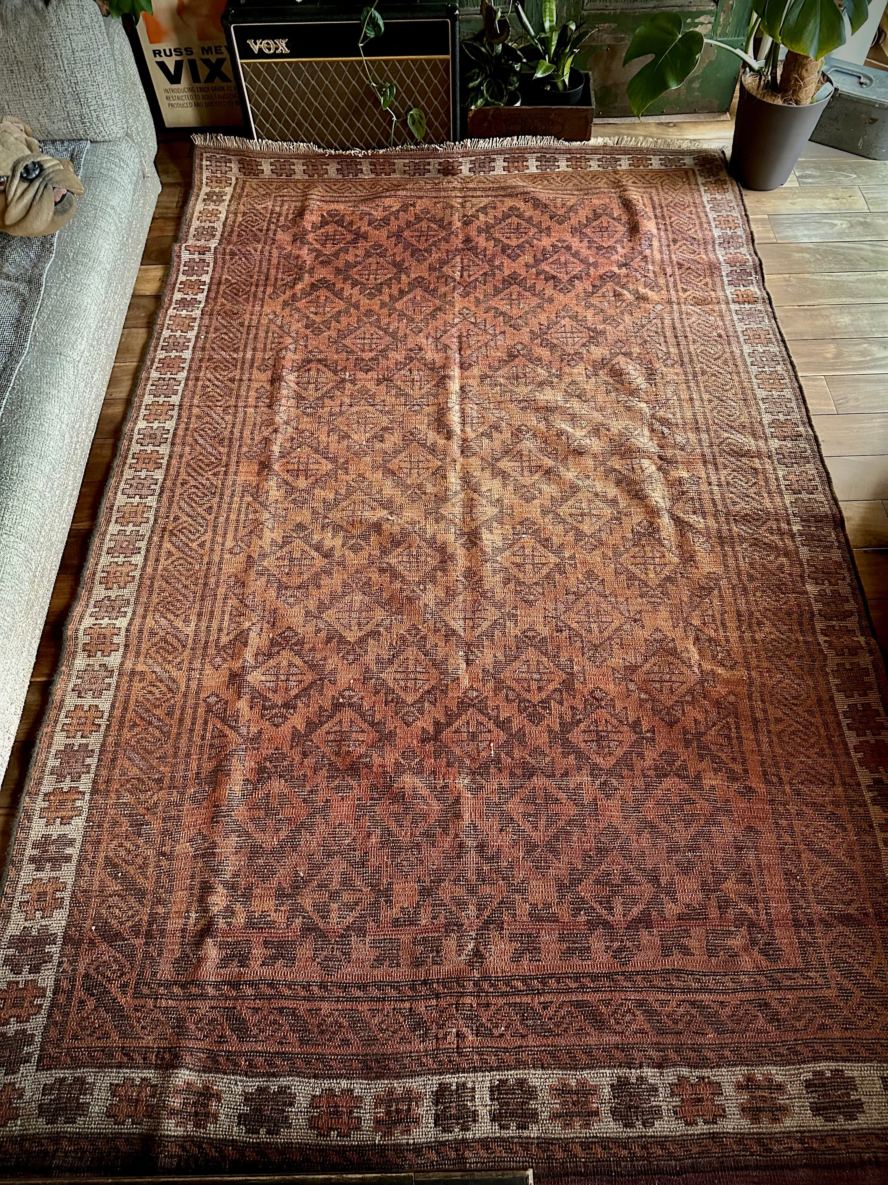 経年としてはかなり古い70年のヴィンテージラグになりますが、褪せた感じやヤレた見た目はタイマニラグ独特の雰囲気であり、特に目立つ汚れやダメージにリペア箇所は見当たらないグッドなコンディションとなりますのでその心地良さをご堪能ください。