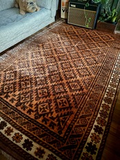 リビングを覆い尽くすオレンジゴールドに輝くプリミティブな雰囲気のこちらは、アフガニスタンはヘラート州に居住するタイマニ族からのトライバルラグで、見た目にもお分かりなように誰もが一度は憧れるゆったりとした特大サイズの1枚になります。